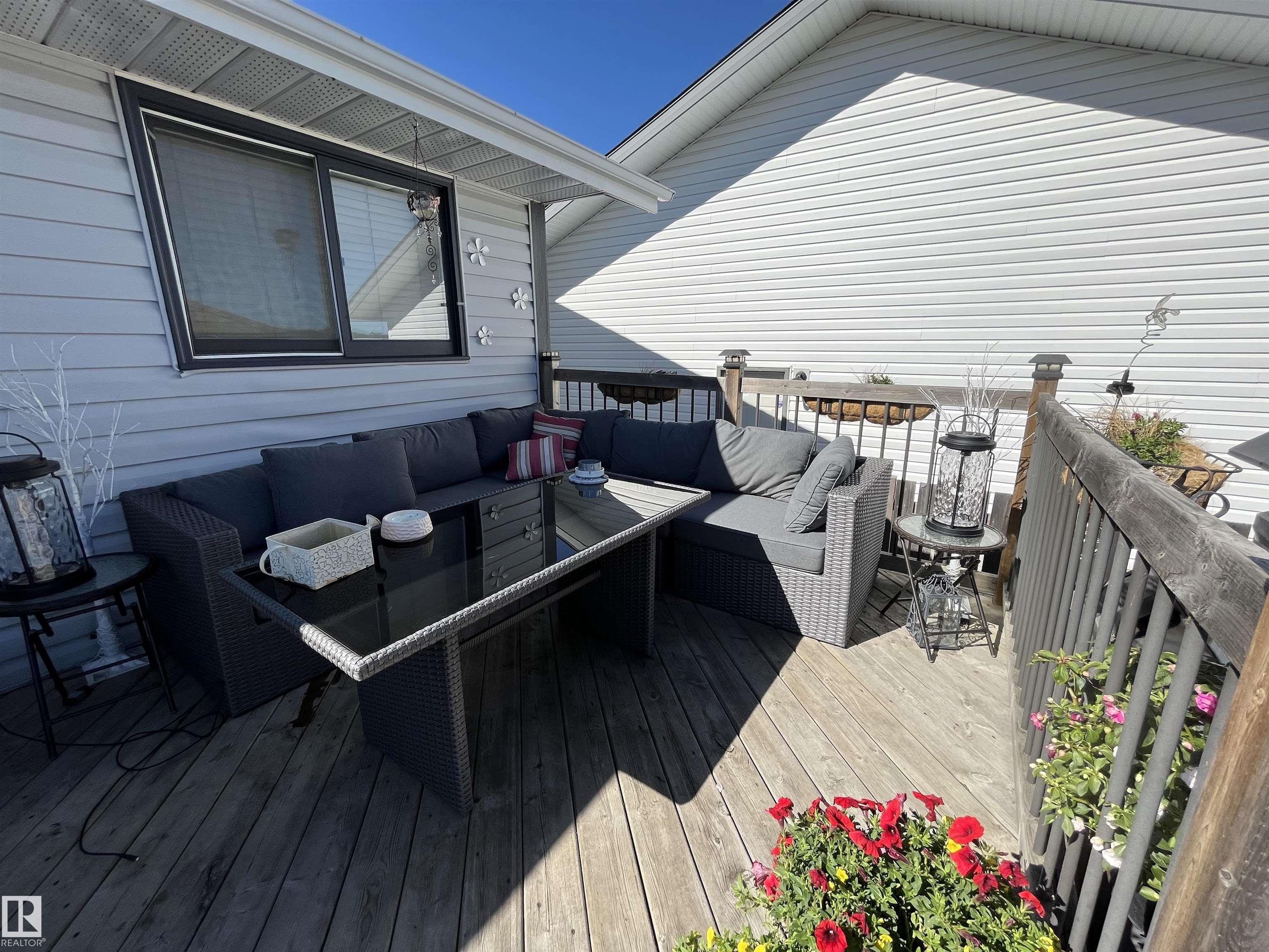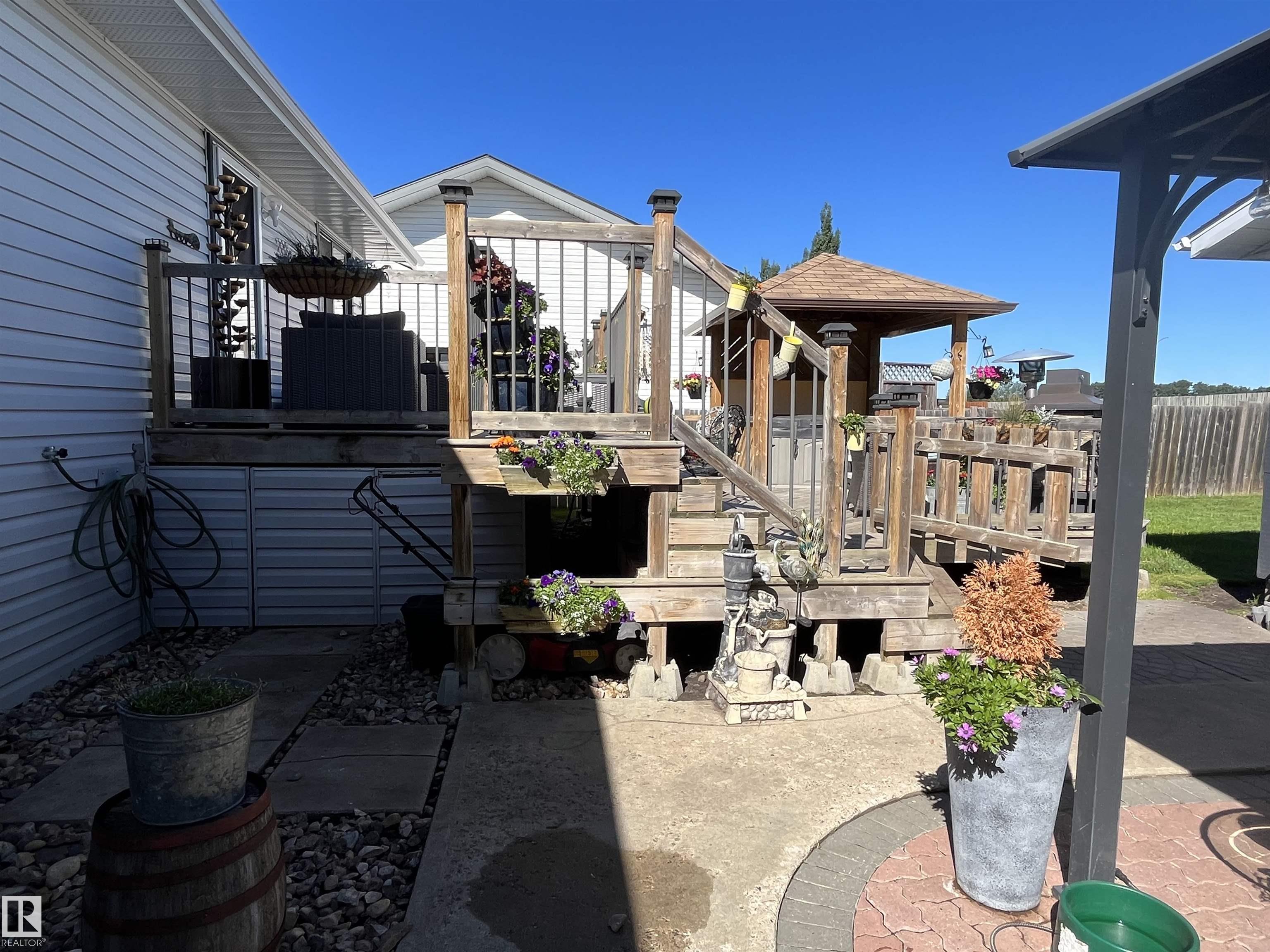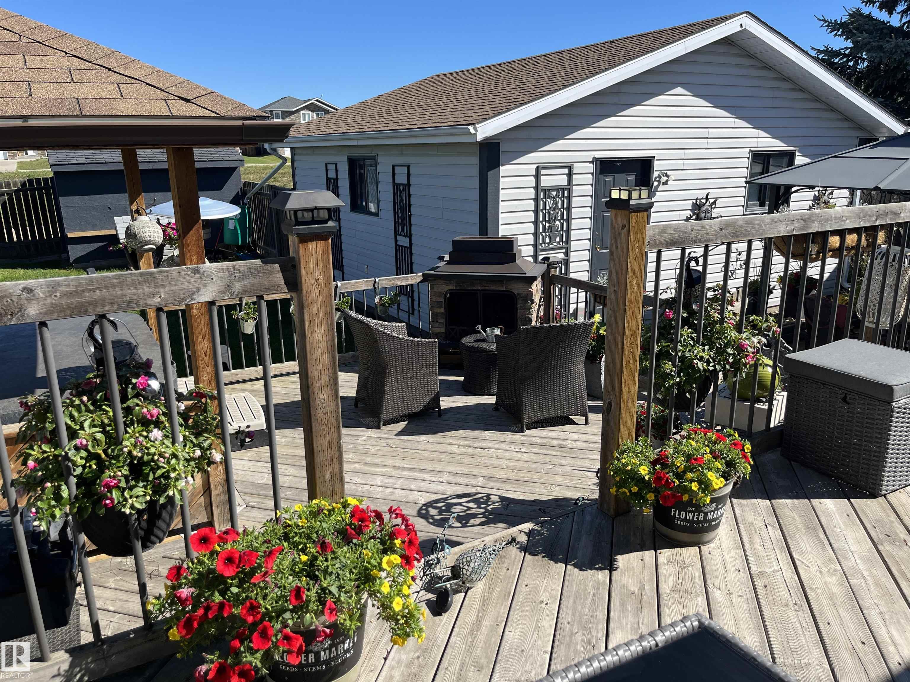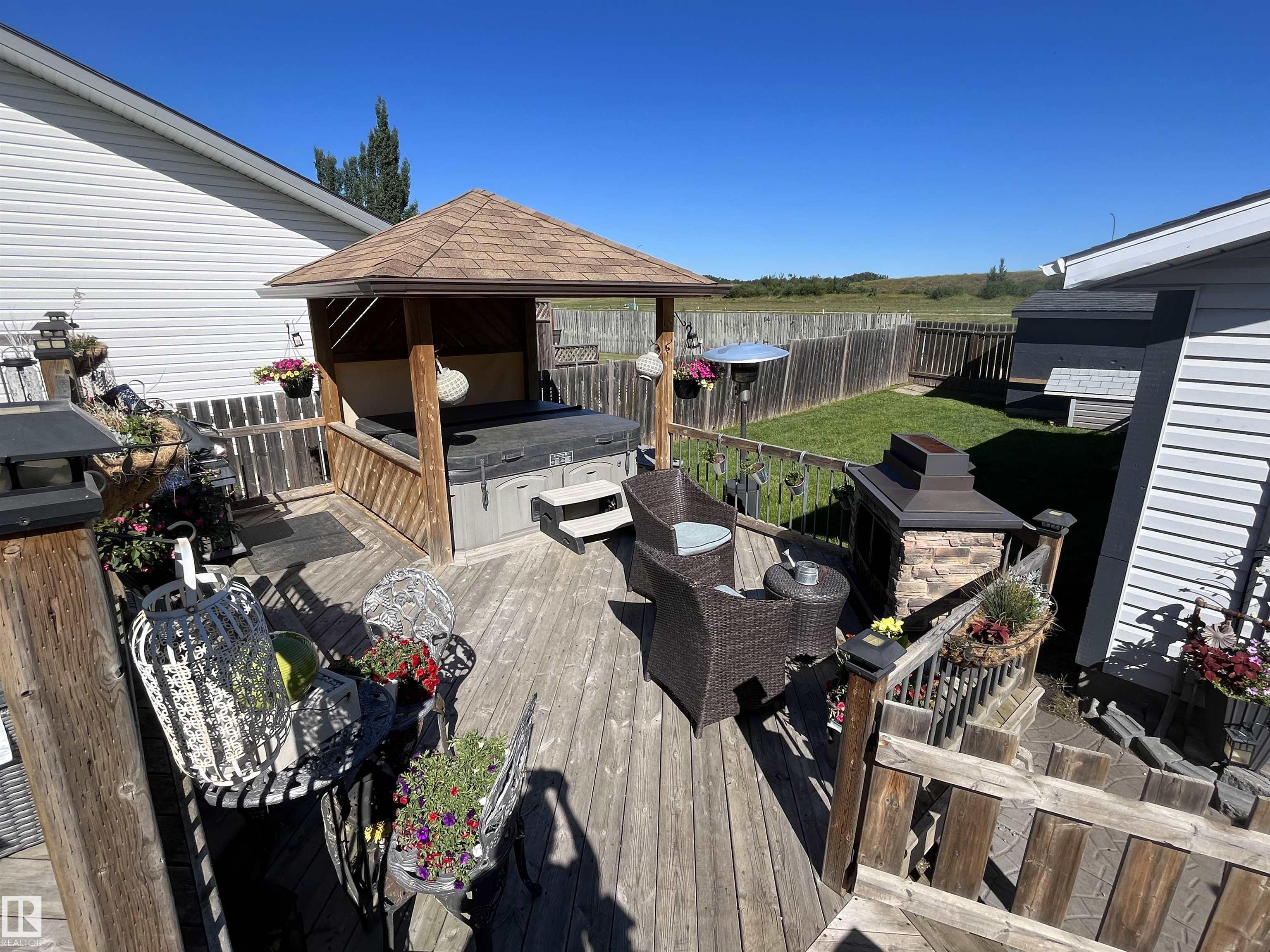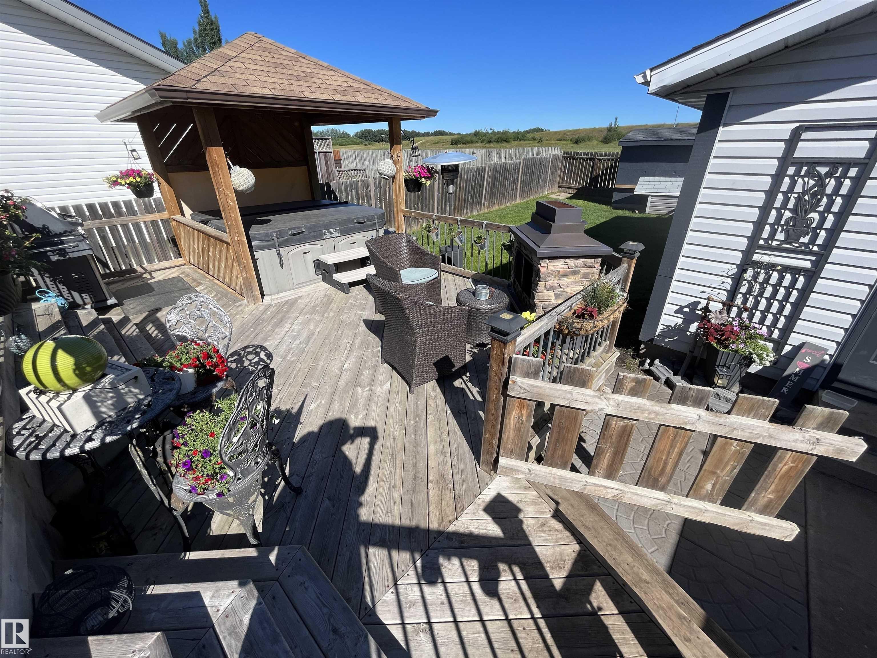 Four bedroom home located in Elk Point. The home features a large kitchen/dining room with a south facing sunken living room. Much of the main floor has new hardwood flooring. The bedrooms are all very spacious and the master bedroom features a walk in closet and access to the main bathroom. The basement features another bedroom, a large family room with a pellet stove, a den and a unique area that could become a playroom or a reading room. There is a large two level deck with a hot tub off the dining room. The deck leads to a double detached heated garage. All this is situated on a quiet street in Elk Point. The hot tub is not in working order.