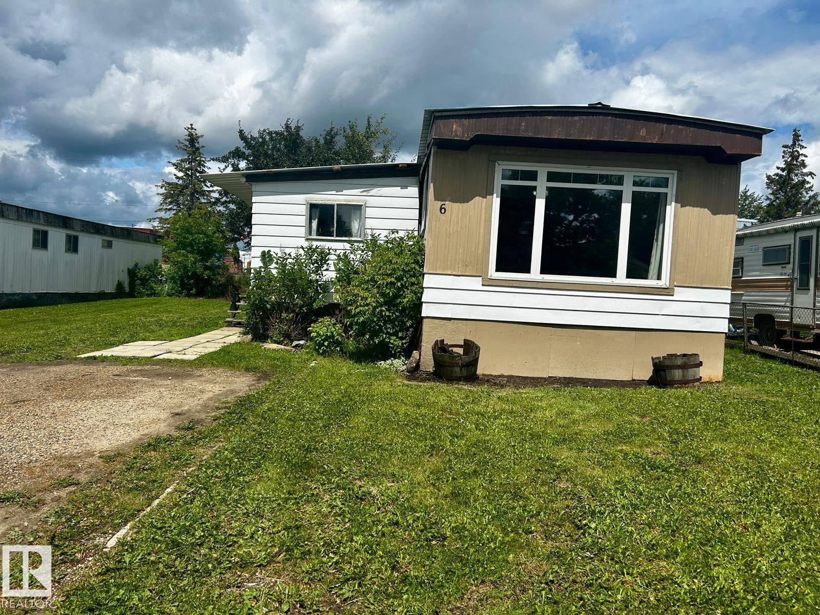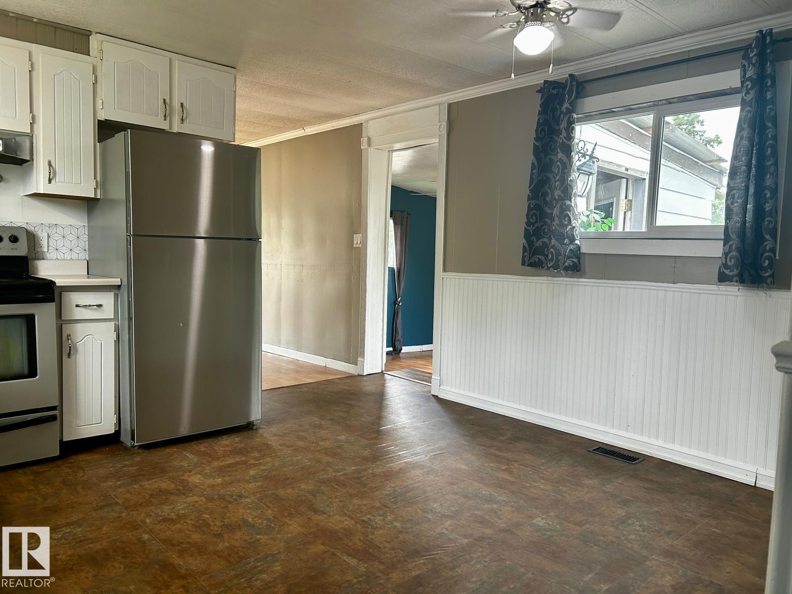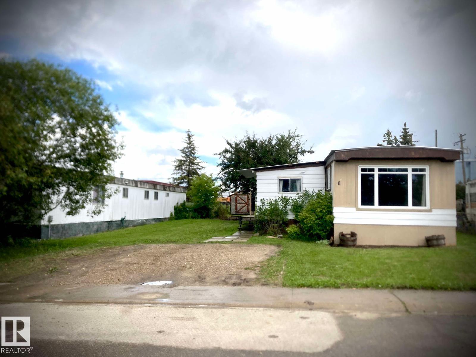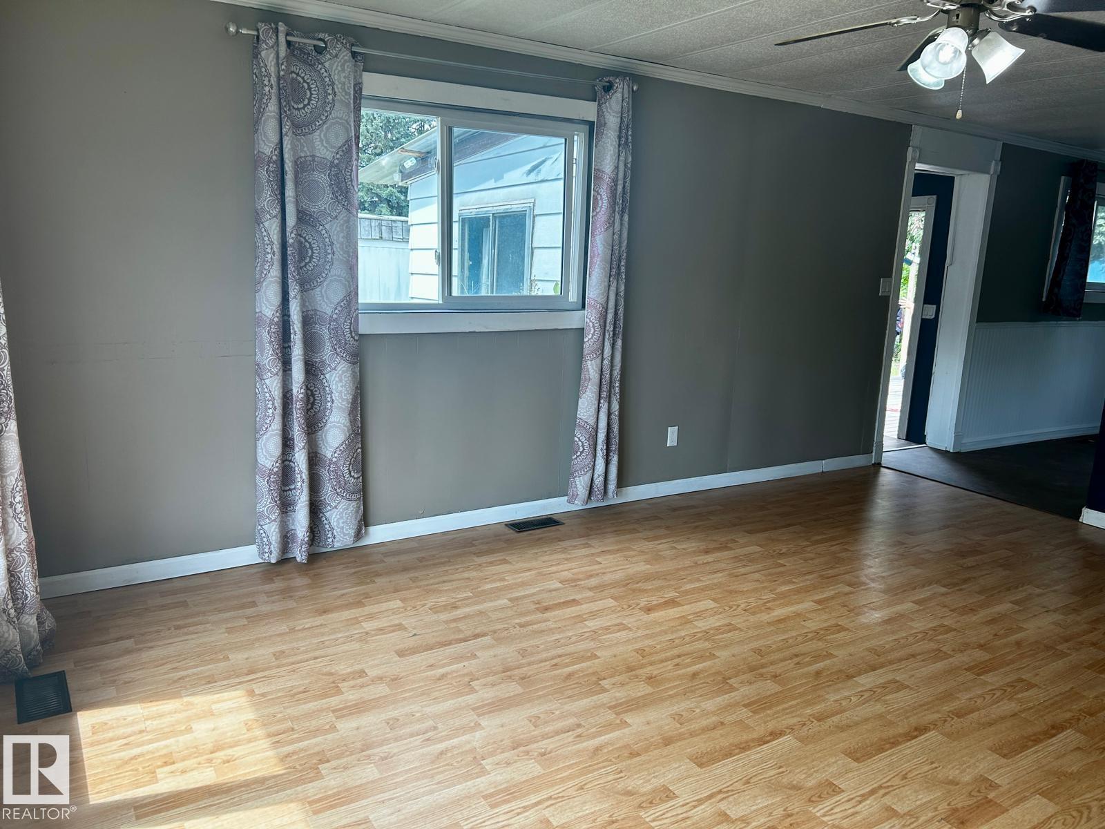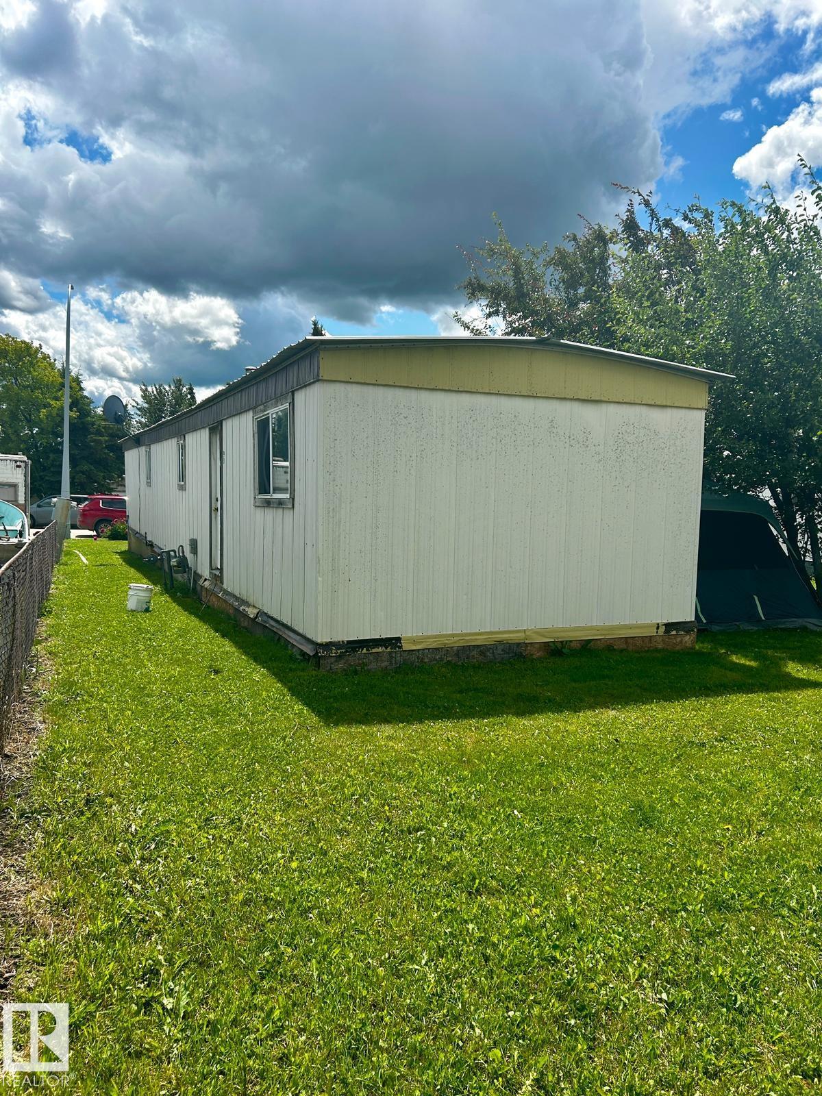 Move in and make it your own! This affordable 3 bedroom 1 bathroom mobile is located on a leased lot so close to walking trails to the Omniplex, pool, and newer playground! All while still situated close to all other amenities. There have been many upgrades such as windows, hwt, furnace, toilet, peaked tin roof and some new flooring. The South facing living room window lets in loads of light and the eat in kitchen is bright, welcoming and boasts newer appliances. The bathroom/laundry room has a high window allowing nice natural light in. The primary bedroom closet takes up an entire wall, excellent storage! Two more bedrooms finish everything off. A large mud room addition adds plentiful space and has power as well! Outside you have off street parking, a storage shed and a large deck next to two beautiful apple trees! Lot is also for sale separately see: E4447420