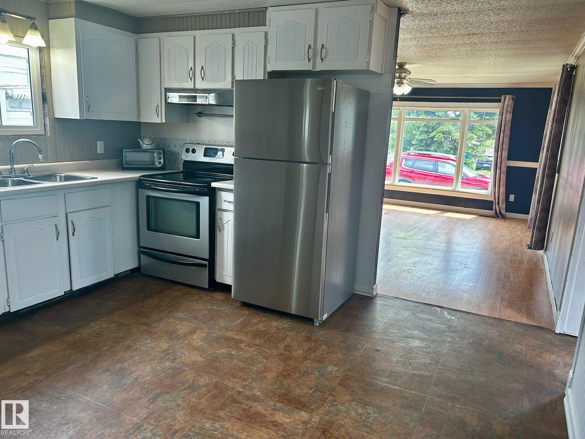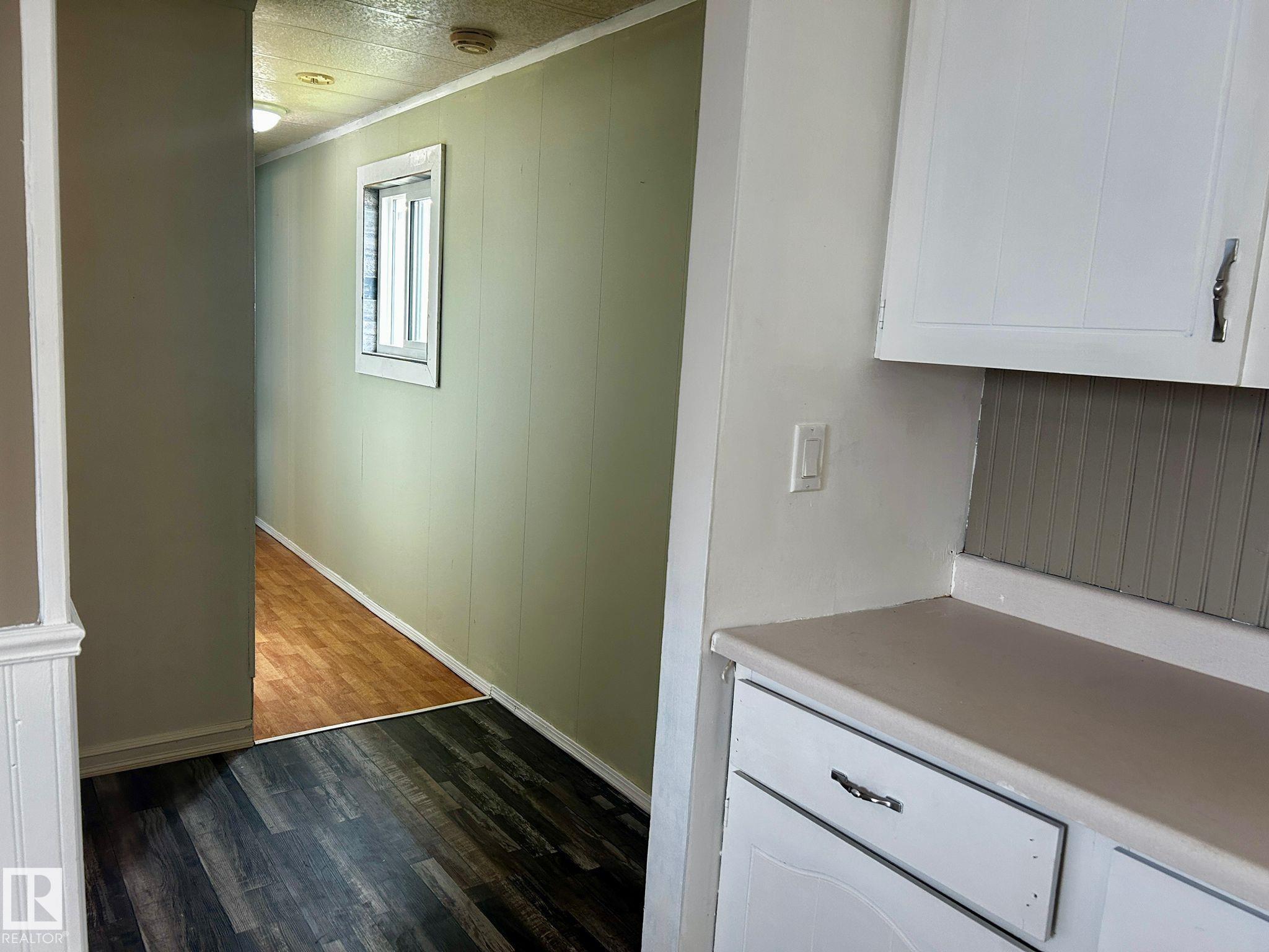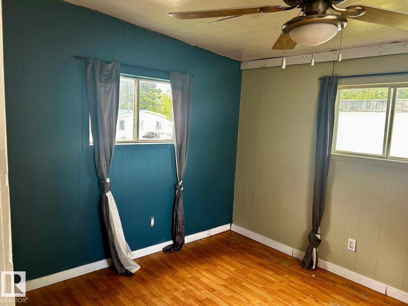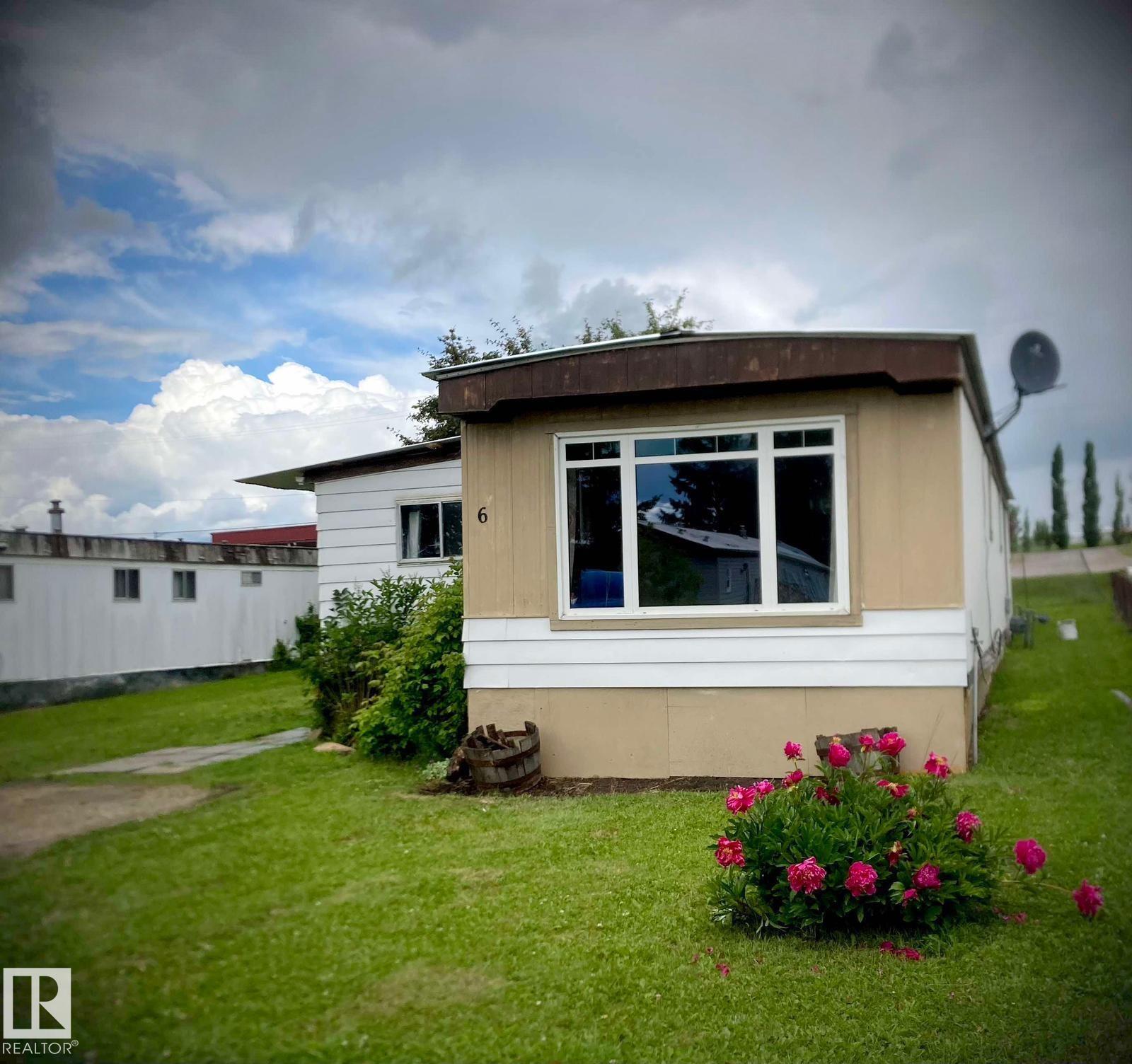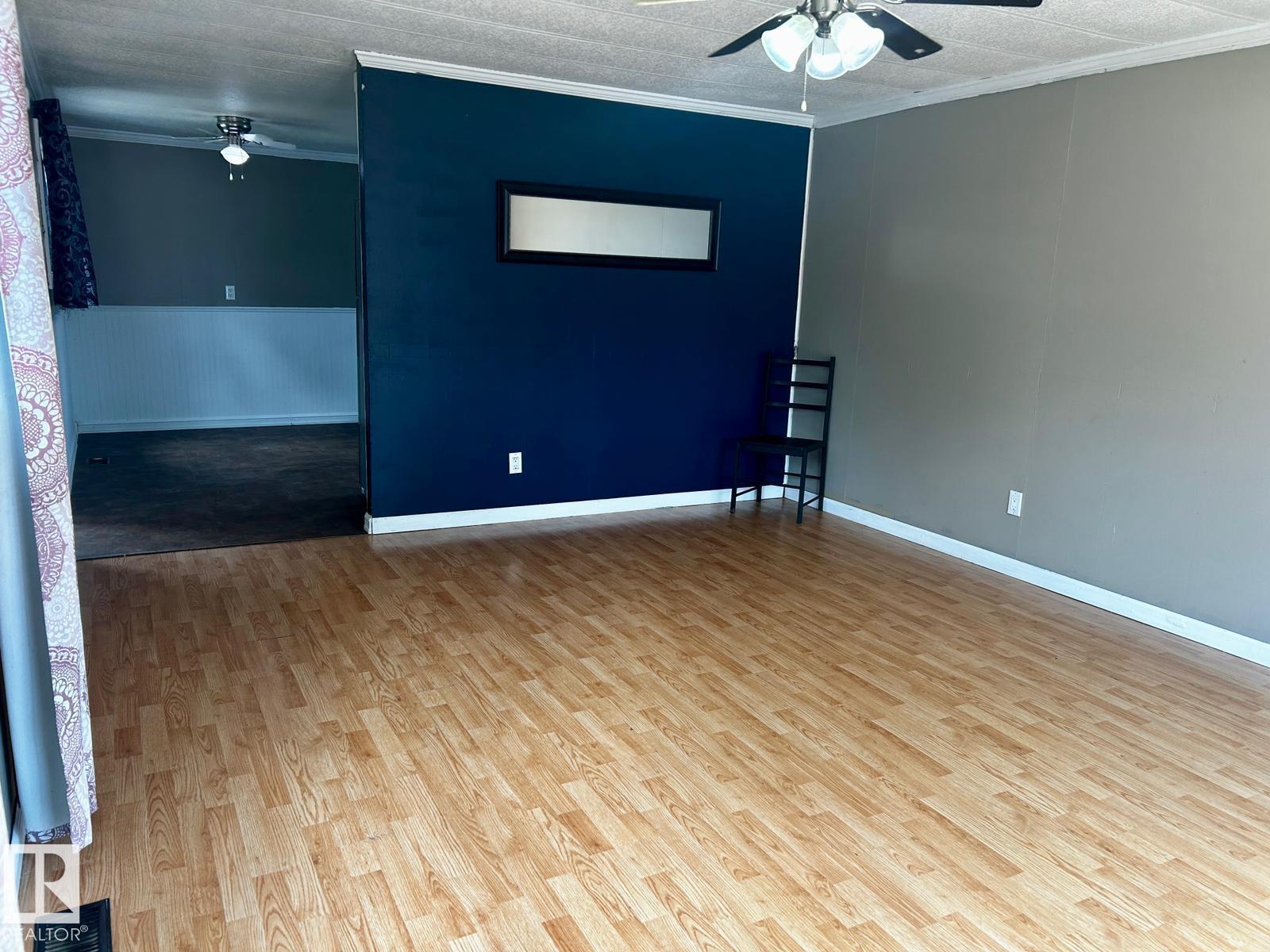 Move in and make it your own! This affordable 3 bedroom 1 bathroom mobile is located on a leased lot so close to walking trails to the Omniplex, pool, and newer playground! All while still situated close to all other amenities. There have been many upgrades such as windows, hwt, furnace, toilet, peaked tin roof and some new flooring. The South facing living room window lets in loads of light and the eat in kitchen is bright, welcoming and boasts newer appliances. The bathroom/laundry room has a high window allowing nice natural light in. The primary bedroom closet takes up an entire wall, excellent storage! Two more bedrooms finish everything off. A large mud room addition adds plentiful space and has power as well! Outside you have off street parking, a storage shed and a large deck next to two beautiful apple trees! Lot is also for sale separately see: E4447420