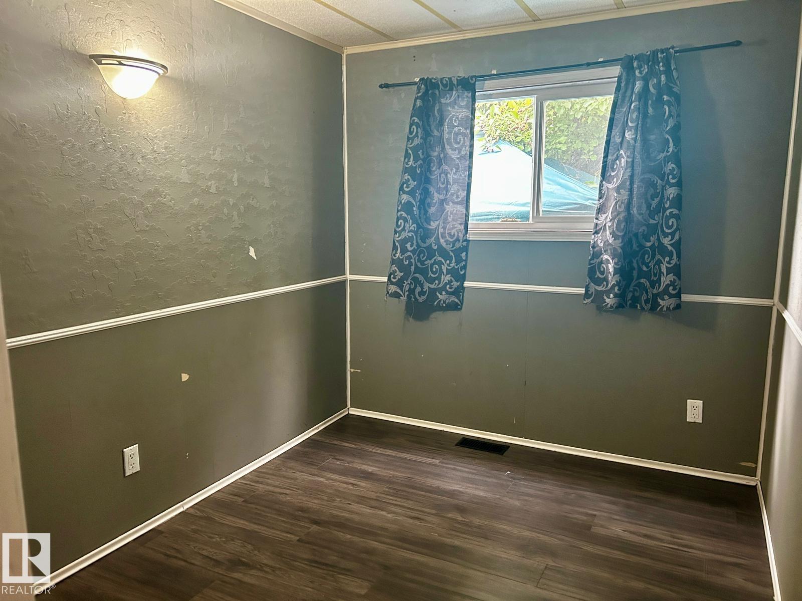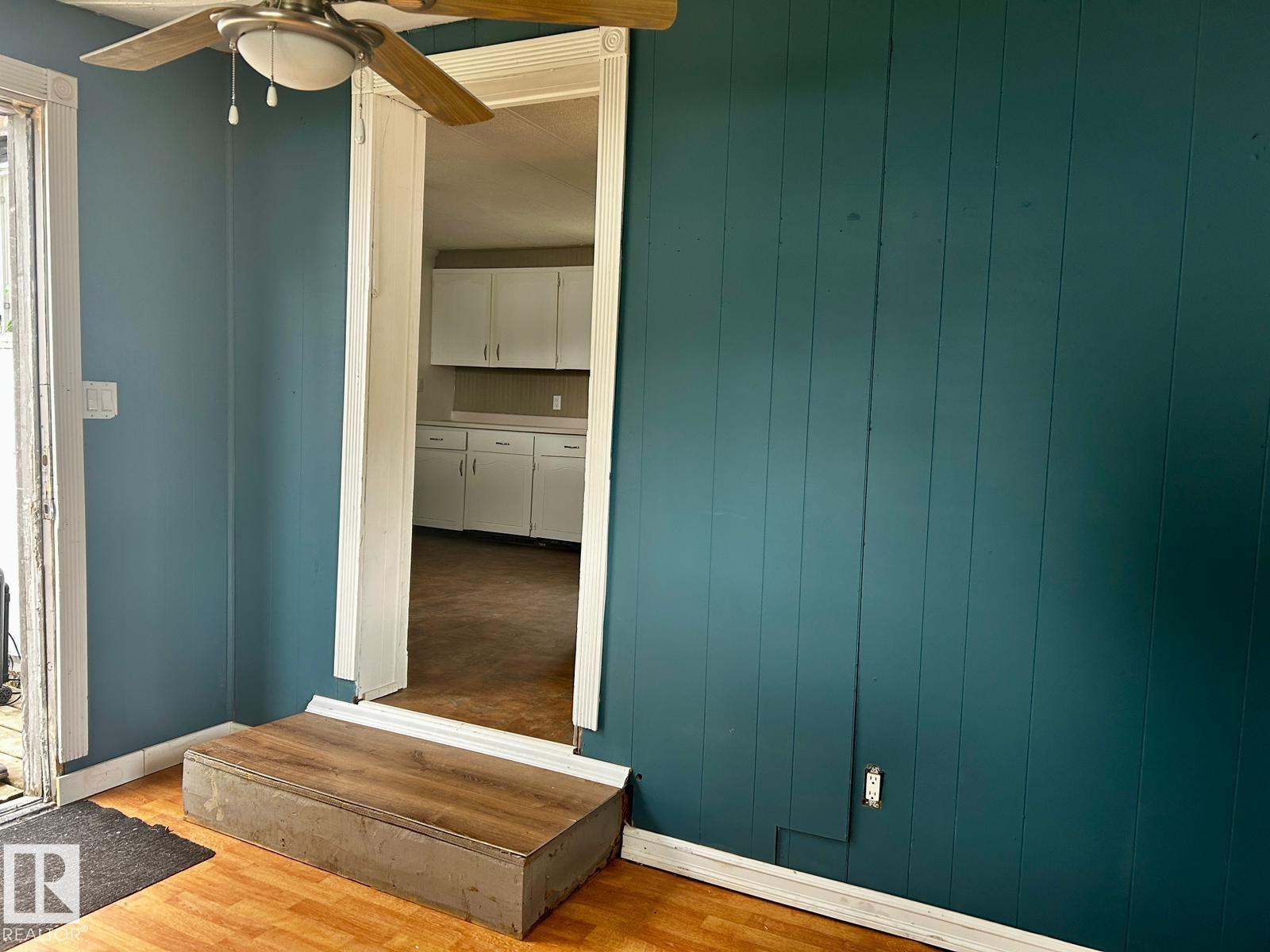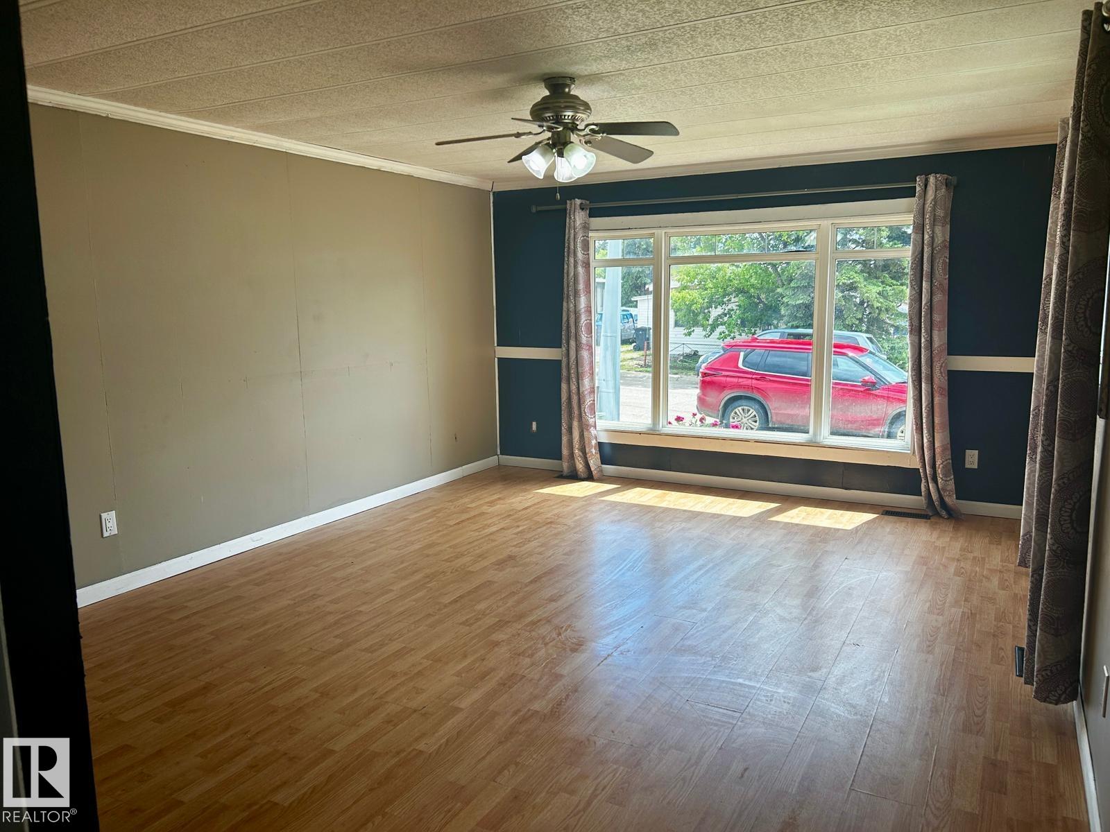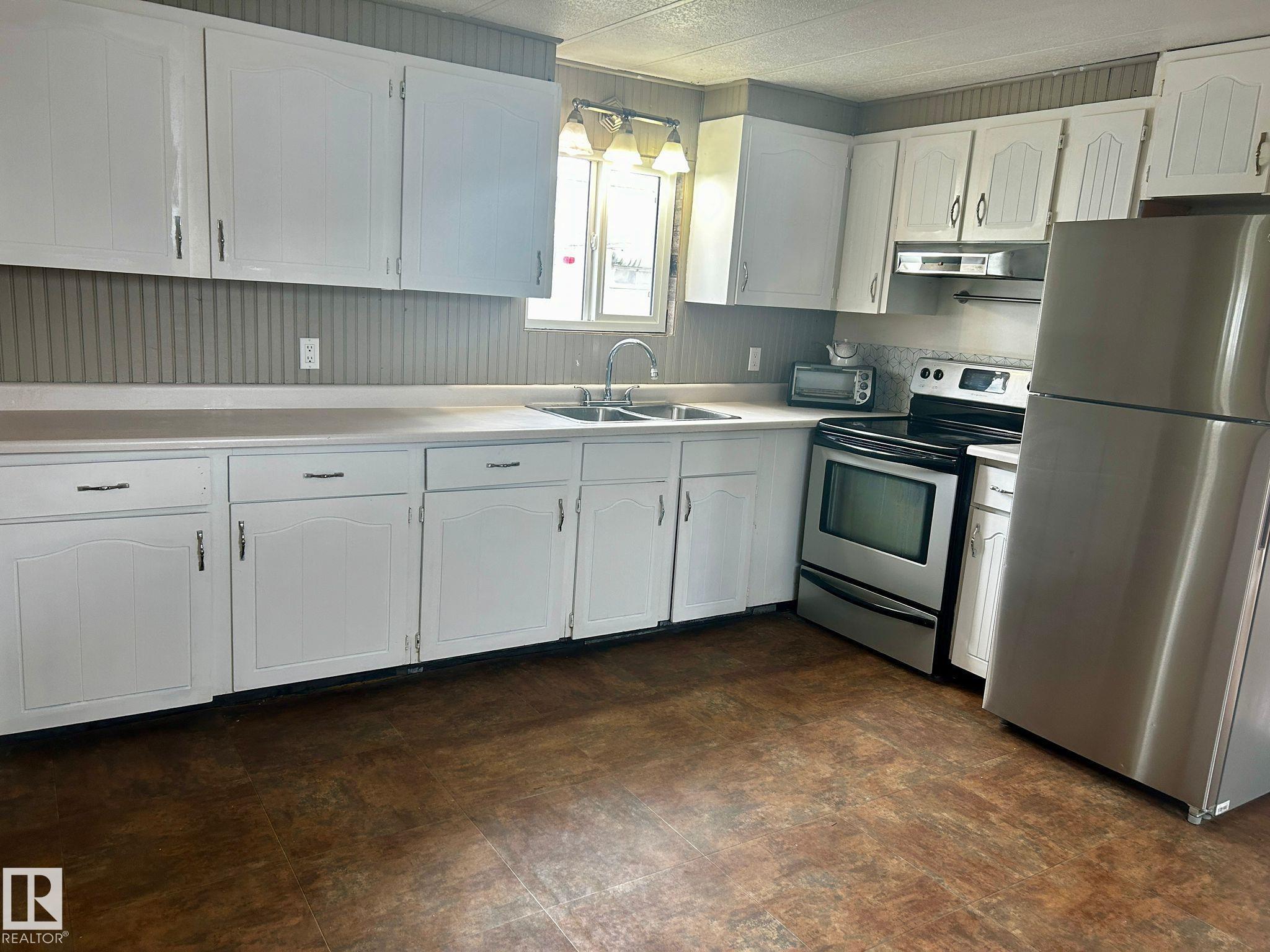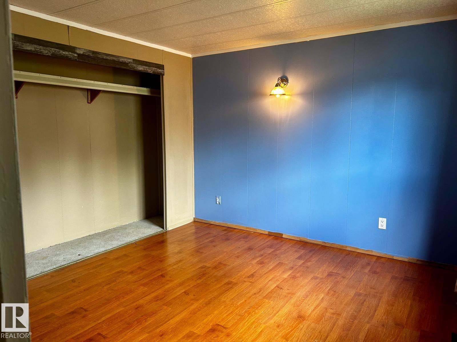 Move in and make it your own! This affordable 3 bedroom 1 bathroom mobile is located on a leased lot so close to walking trails to the Omniplex, pool, and newer playground! All while still situated close to all other amenities. There have been many upgrades such as windows, hwt, furnace, toilet, peaked tin roof and some new flooring. The South facing living room window lets in loads of light and the eat in kitchen is bright, welcoming and boasts newer appliances. The bathroom/laundry room has a high window allowing nice natural light in. The primary bedroom closet takes up an entire wall, excellent storage! Two more bedrooms finish everything off. A large mud room addition adds plentiful space and has power as well! Outside you have off street parking, a storage shed and a large deck next to two beautiful apple trees! Lot is also for sale separately see: E4447420