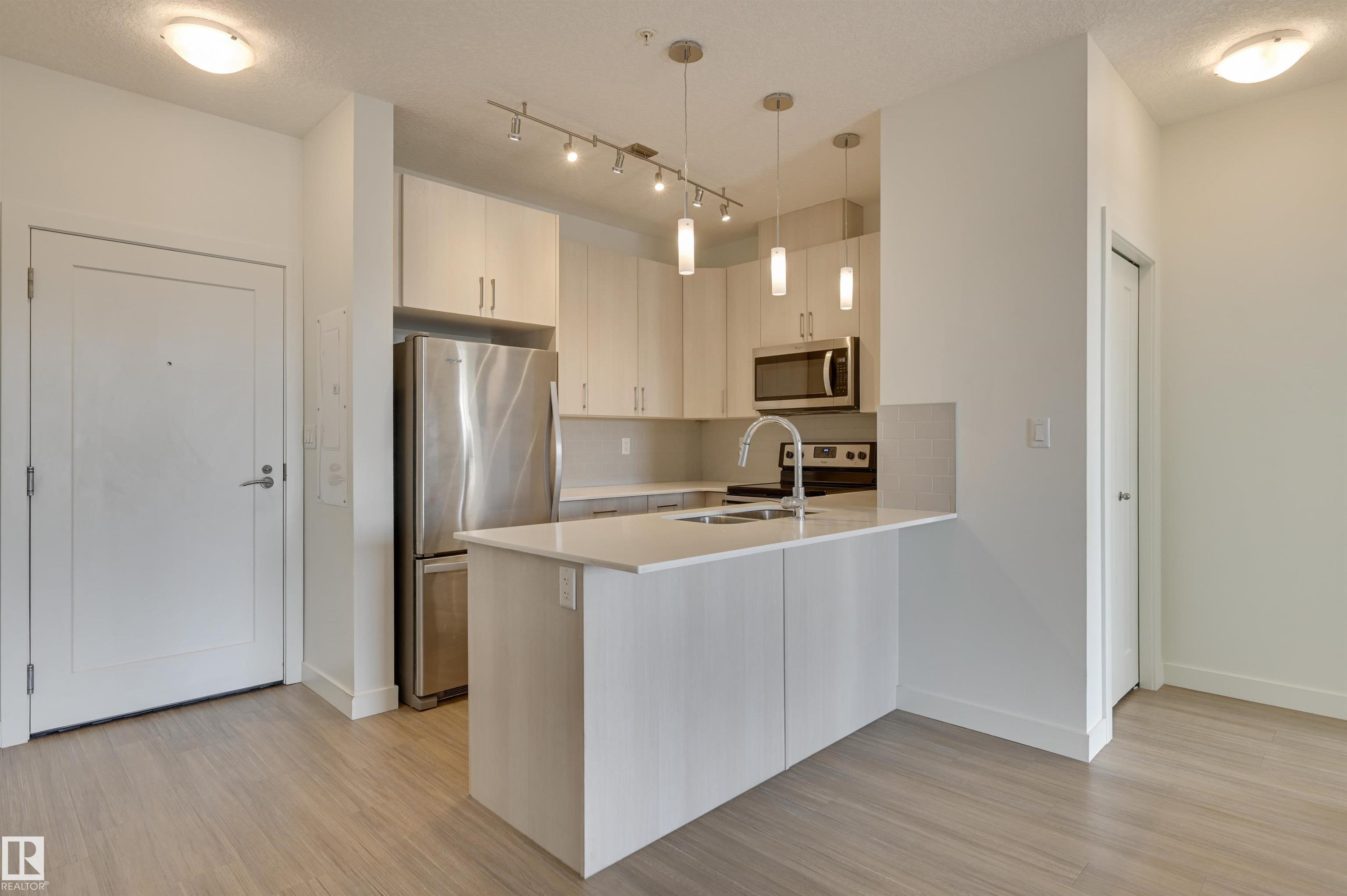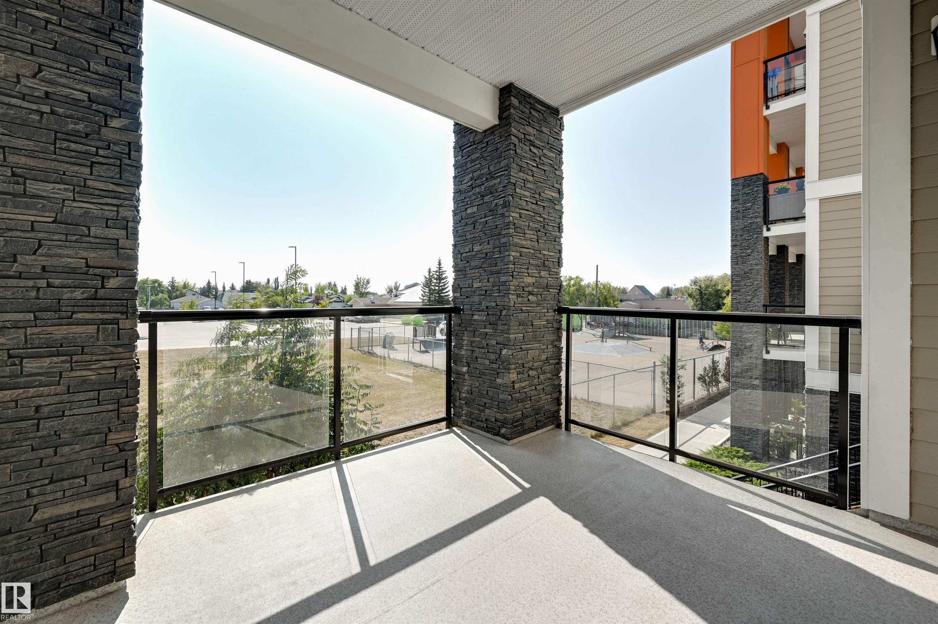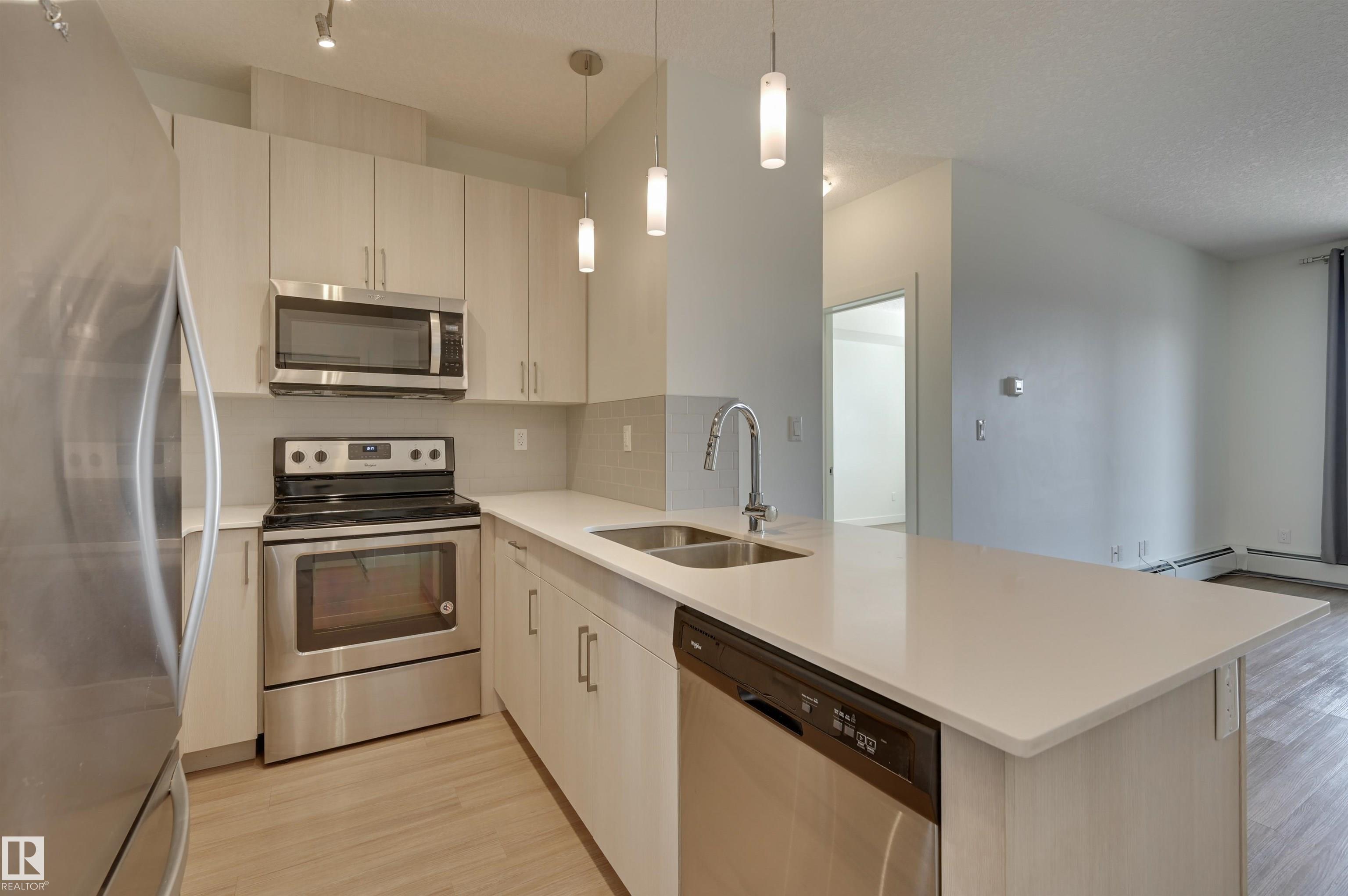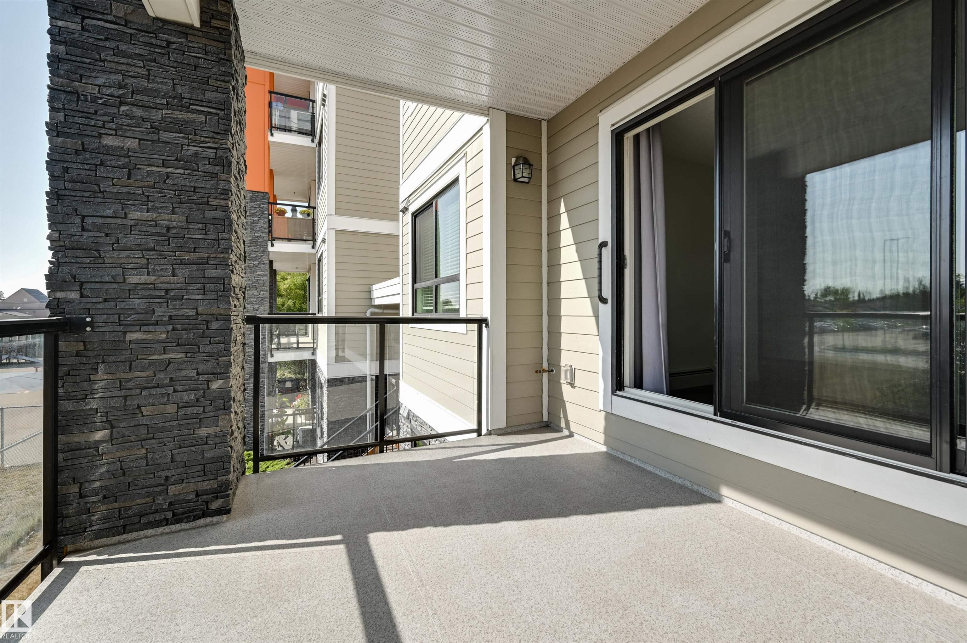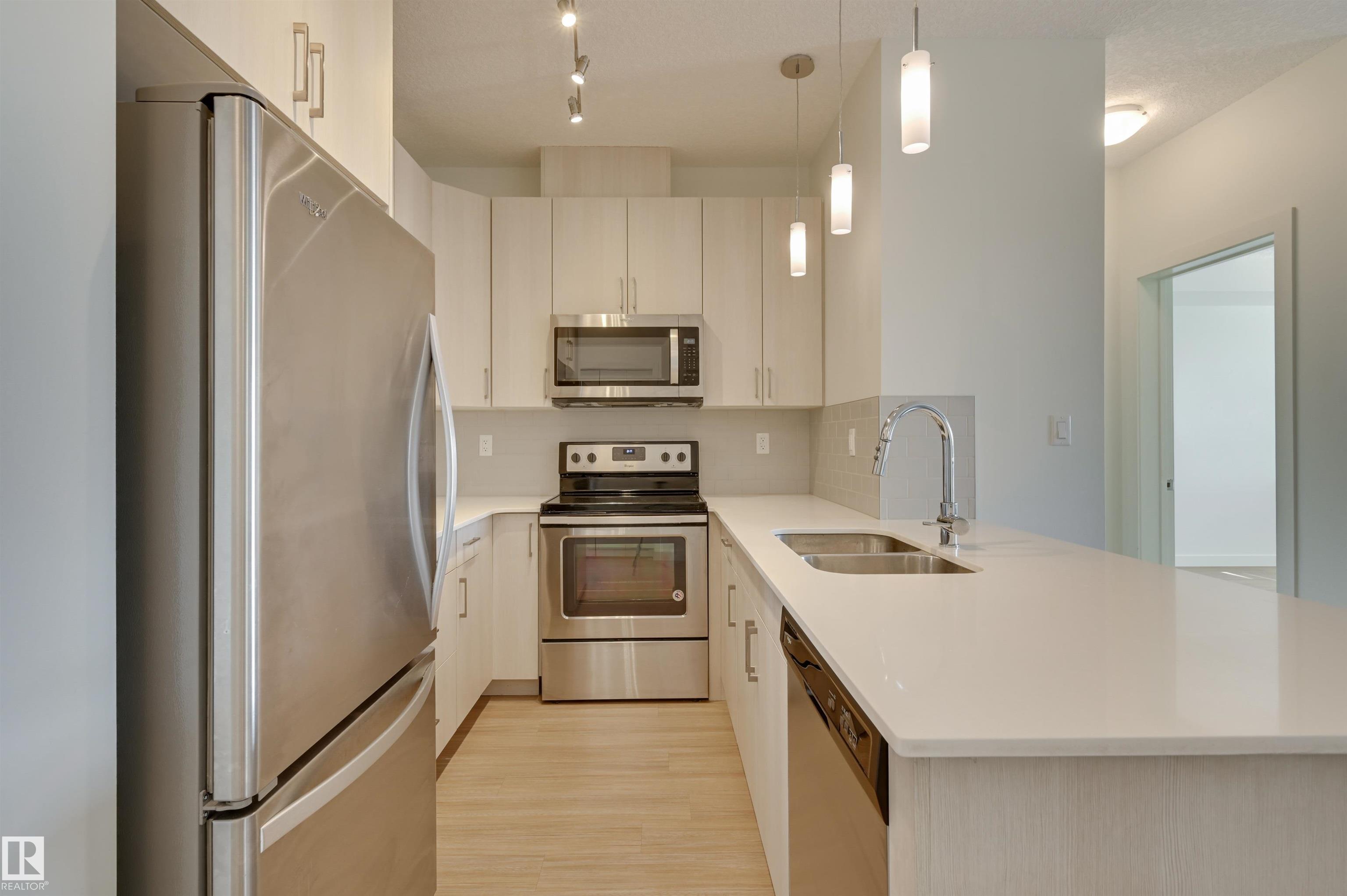 Welcome home to this sunny, spacious 2 bedroom 2 bathroom condo in THE RIDGE located in the heart of DEVON within walking distance to schools, parks, groceries, restaurants, outdoor pool, arena and river valley walking/biking trails. This open modern concept floor plan offers premium finishing throughout with 9' ceilings and the bedrooms at the opposite ends of the living room. The gourmet kitchen has quartz countertops, light color cabinetry with soft close cupboards and drawers with stainless steel appliances. South facing deck with a gas BBQ outlet. Vinyl plank flooring throughout except for tile in the bathrooms. Roughed in for A/C. Included is the fridge, glass top stove, built-in microwave, dishwasher, INSUITE WASHER AND DRYER and TITLED UNDERGROUND PARKING #52 with a storage cage. A great place to call home!