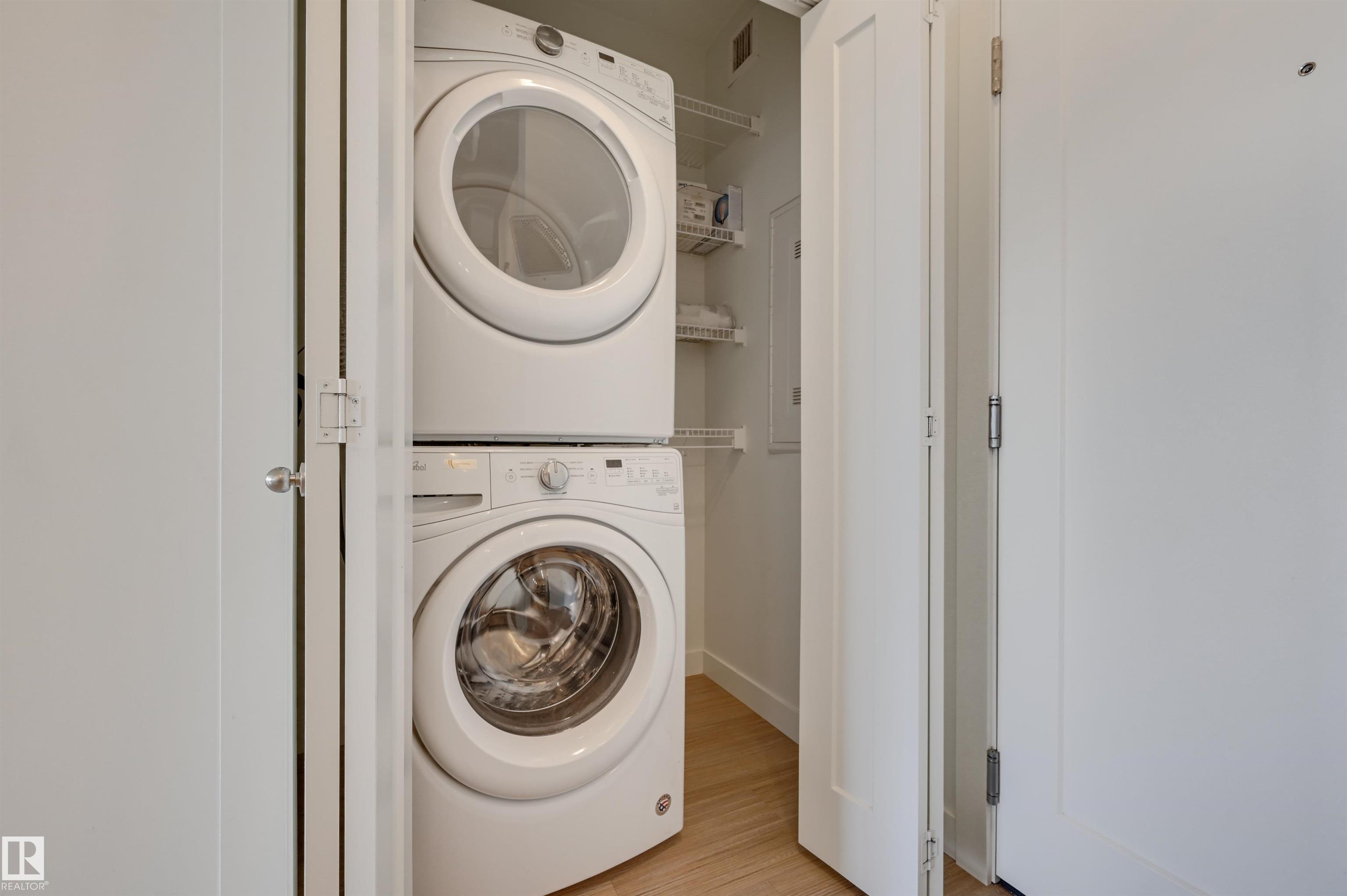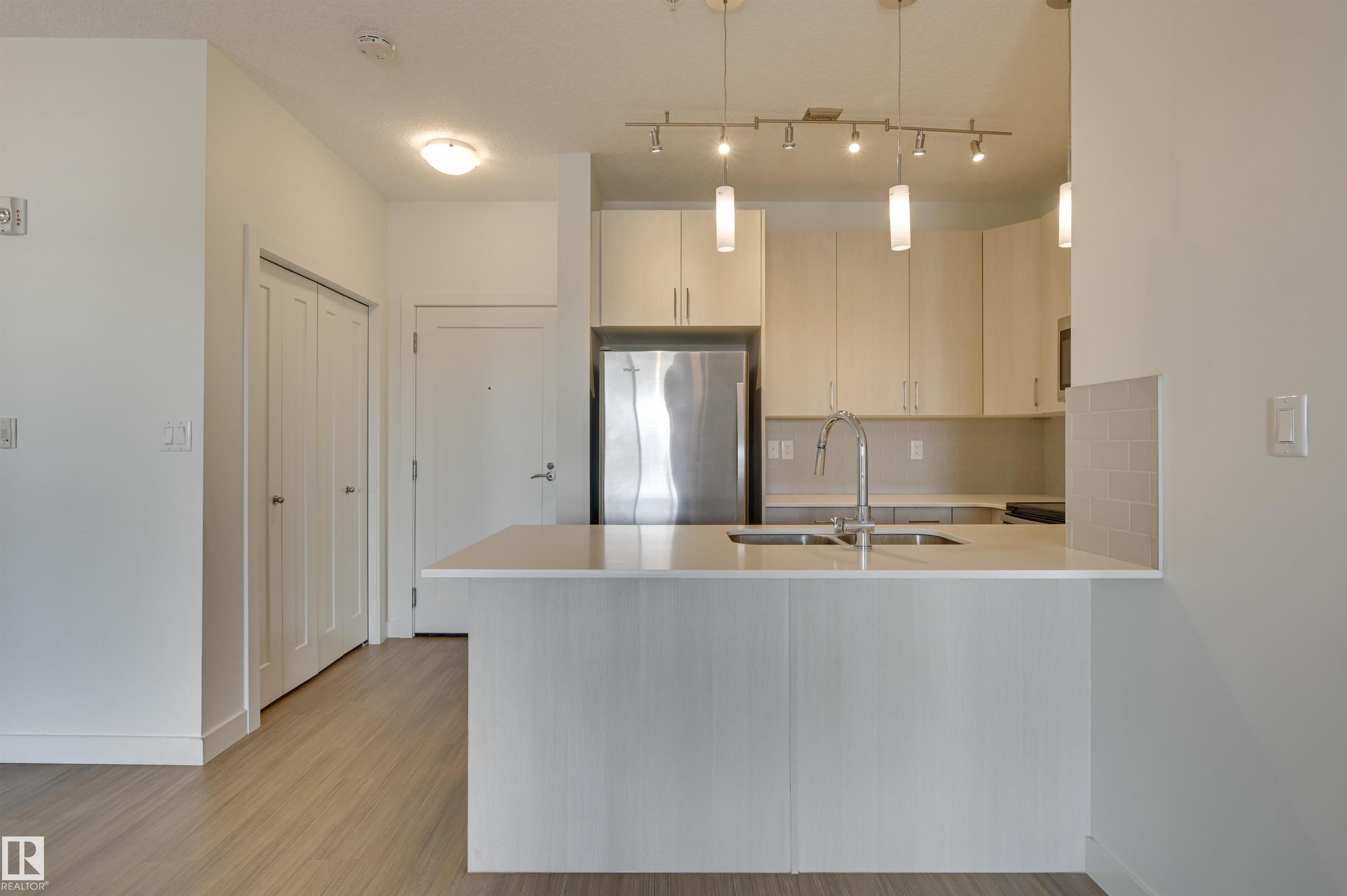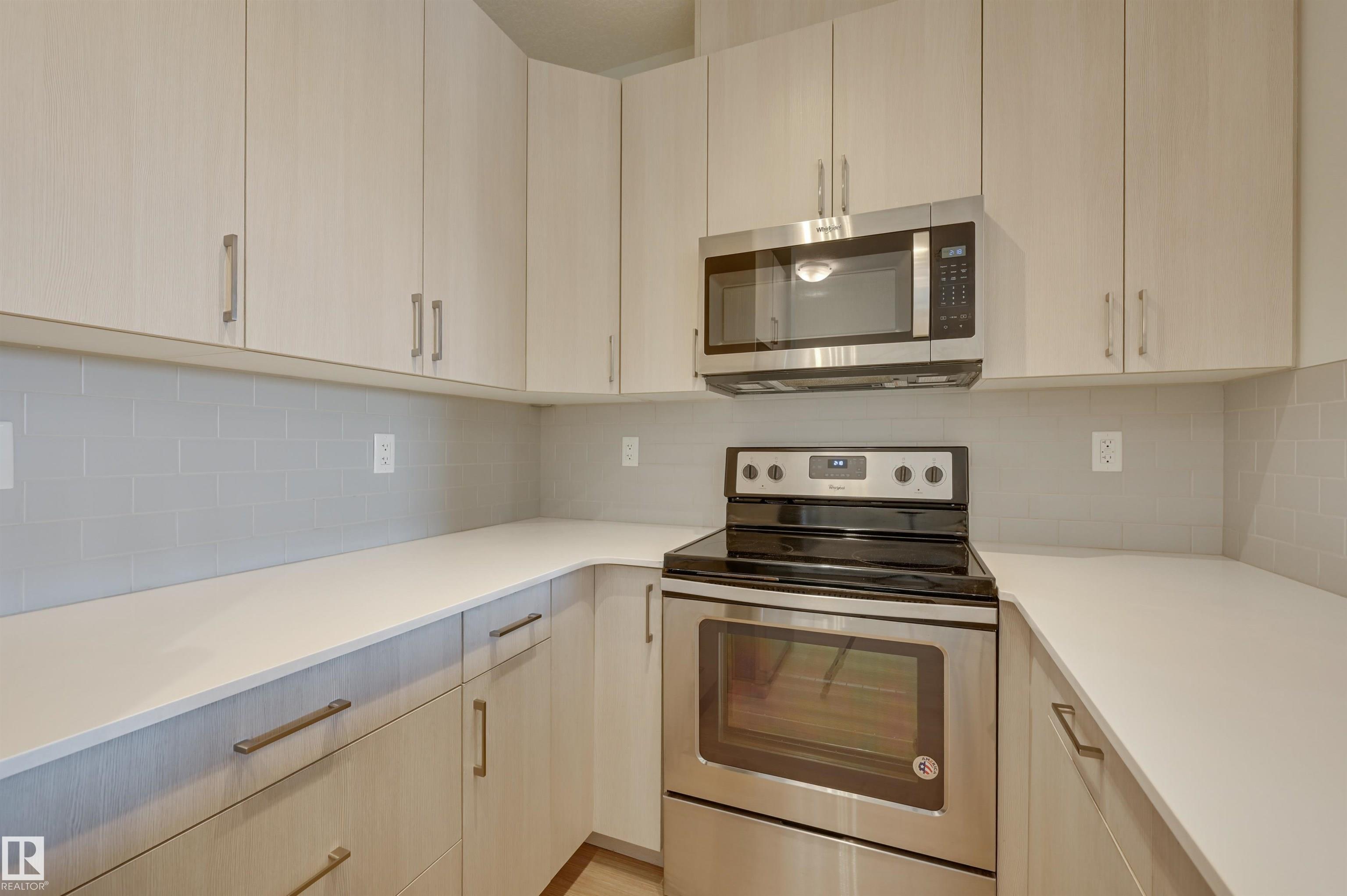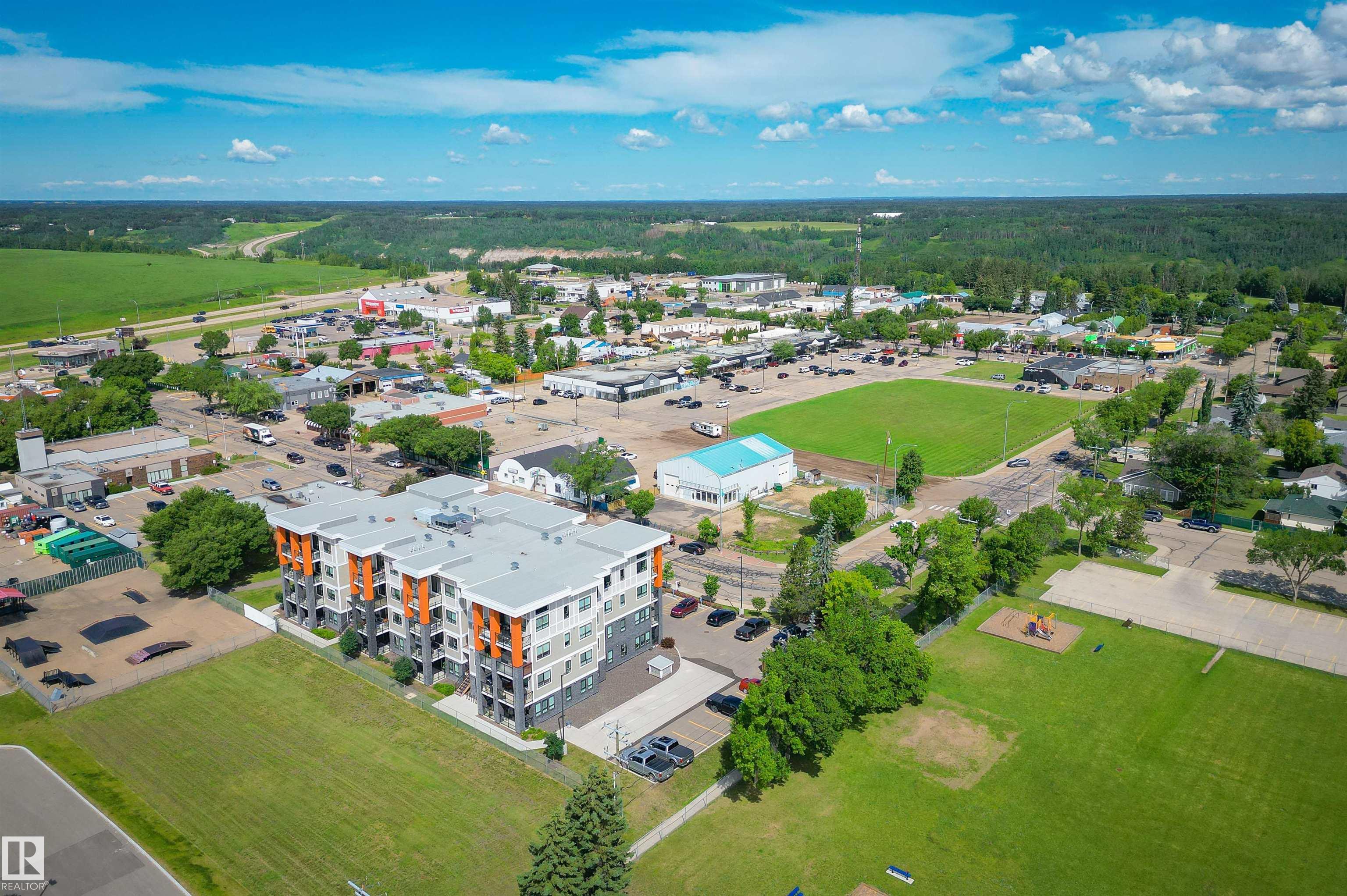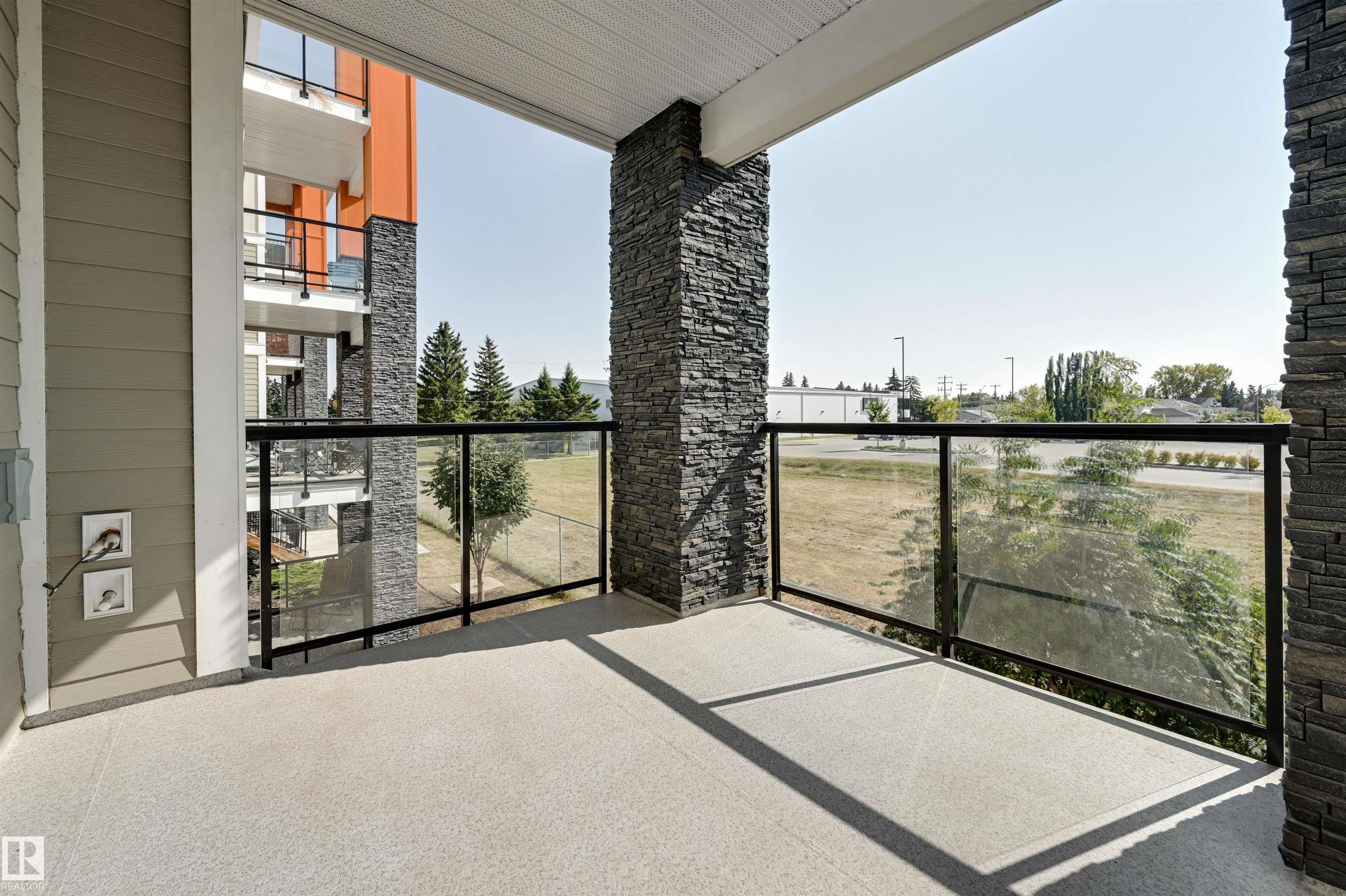 Welcome home to this sunny, spacious 2 bedroom 2 bathroom condo in THE RIDGE located in the heart of DEVON within walking distance to schools, parks, groceries, restaurants, outdoor pool, arena and river valley walking/biking trails. This open modern concept floor plan offers premium finishing throughout with 9' ceilings and the bedrooms at the opposite ends of the living room. The gourmet kitchen has quartz countertops, light color cabinetry with soft close cupboards and drawers with stainless steel appliances. South facing deck with a gas BBQ outlet. Vinyl plank flooring throughout except for tile in the bathrooms. Roughed in for A/C. Included is the fridge, glass top stove, built-in microwave, dishwasher, INSUITE WASHER AND DRYER and TITLED UNDERGROUND PARKING #52 with a storage cage. A great place to call home!