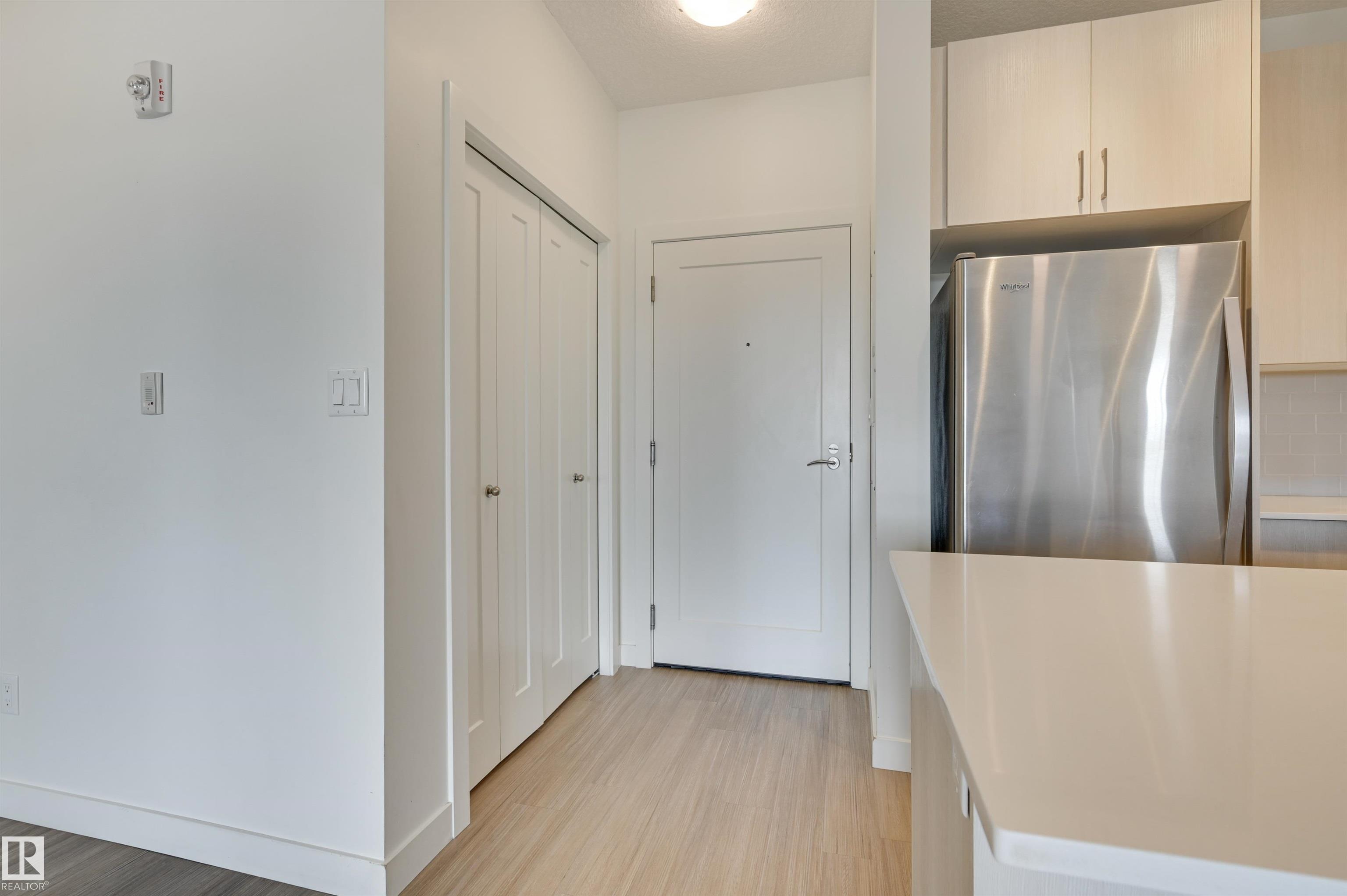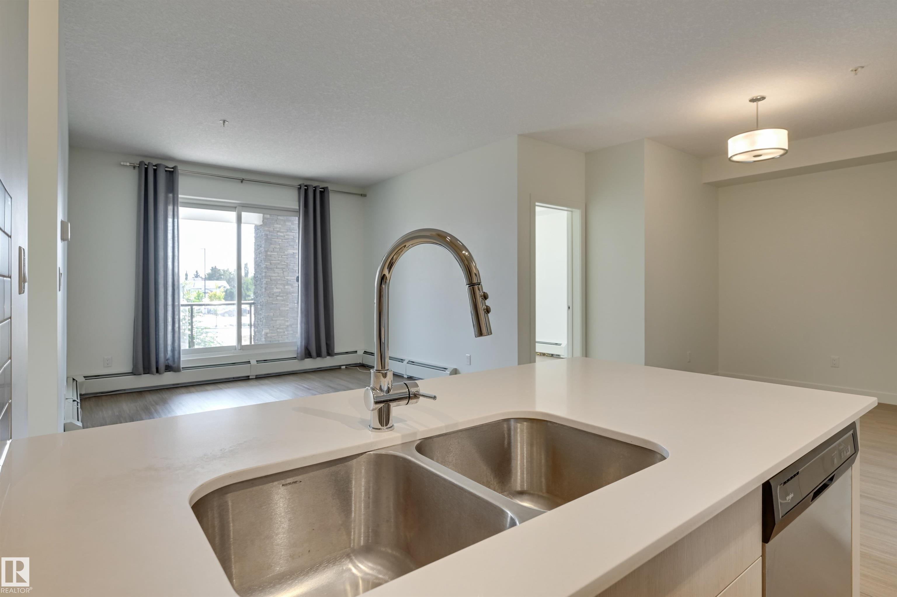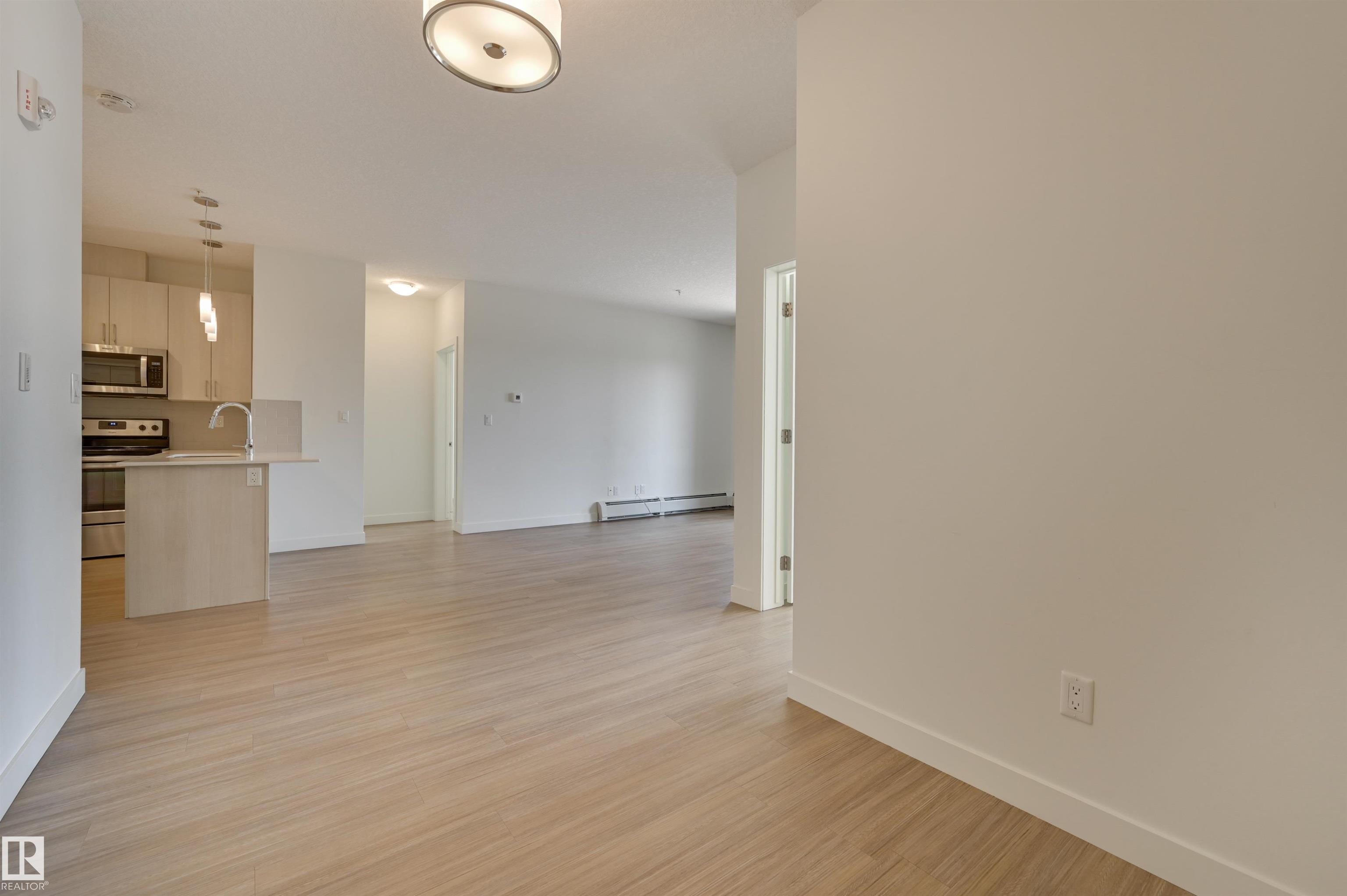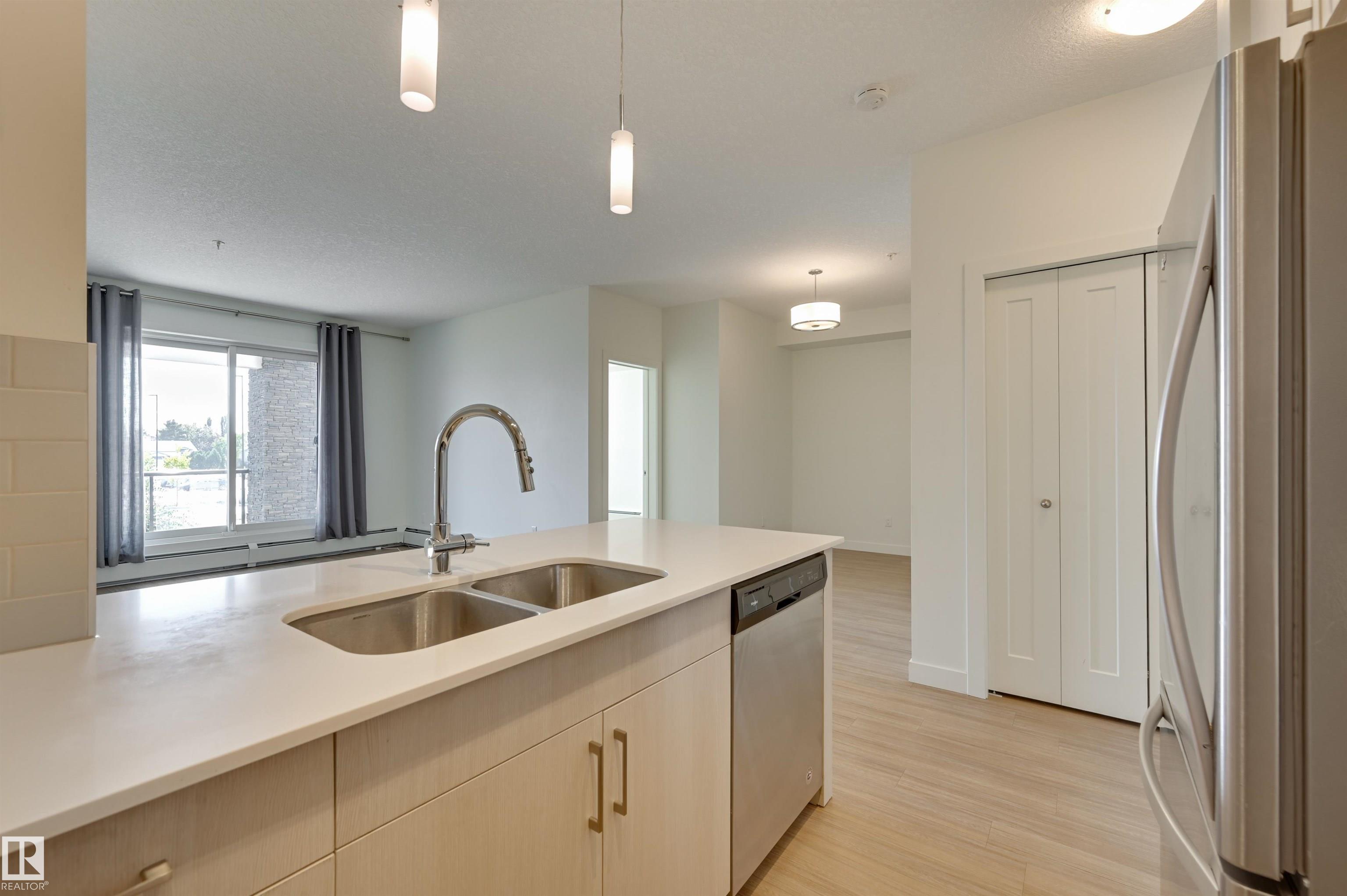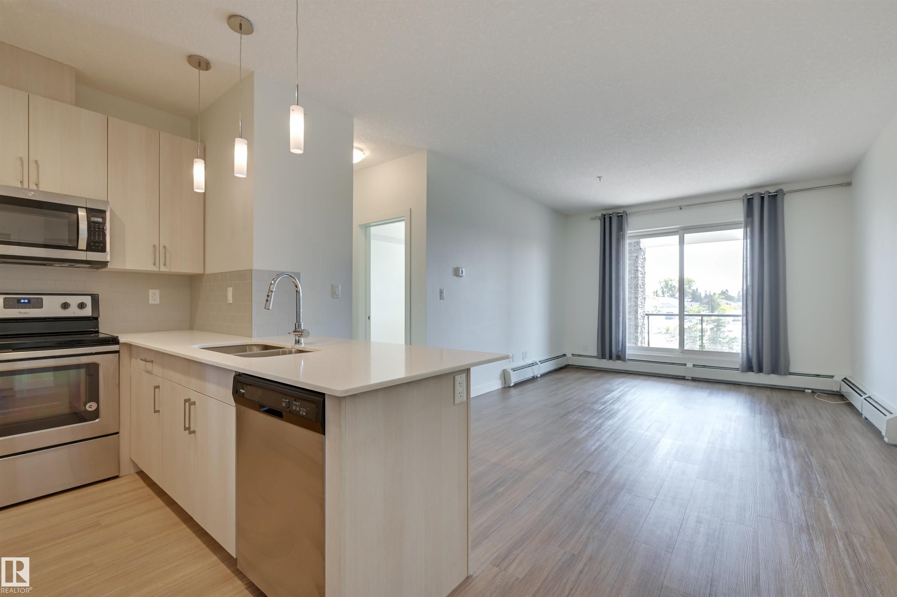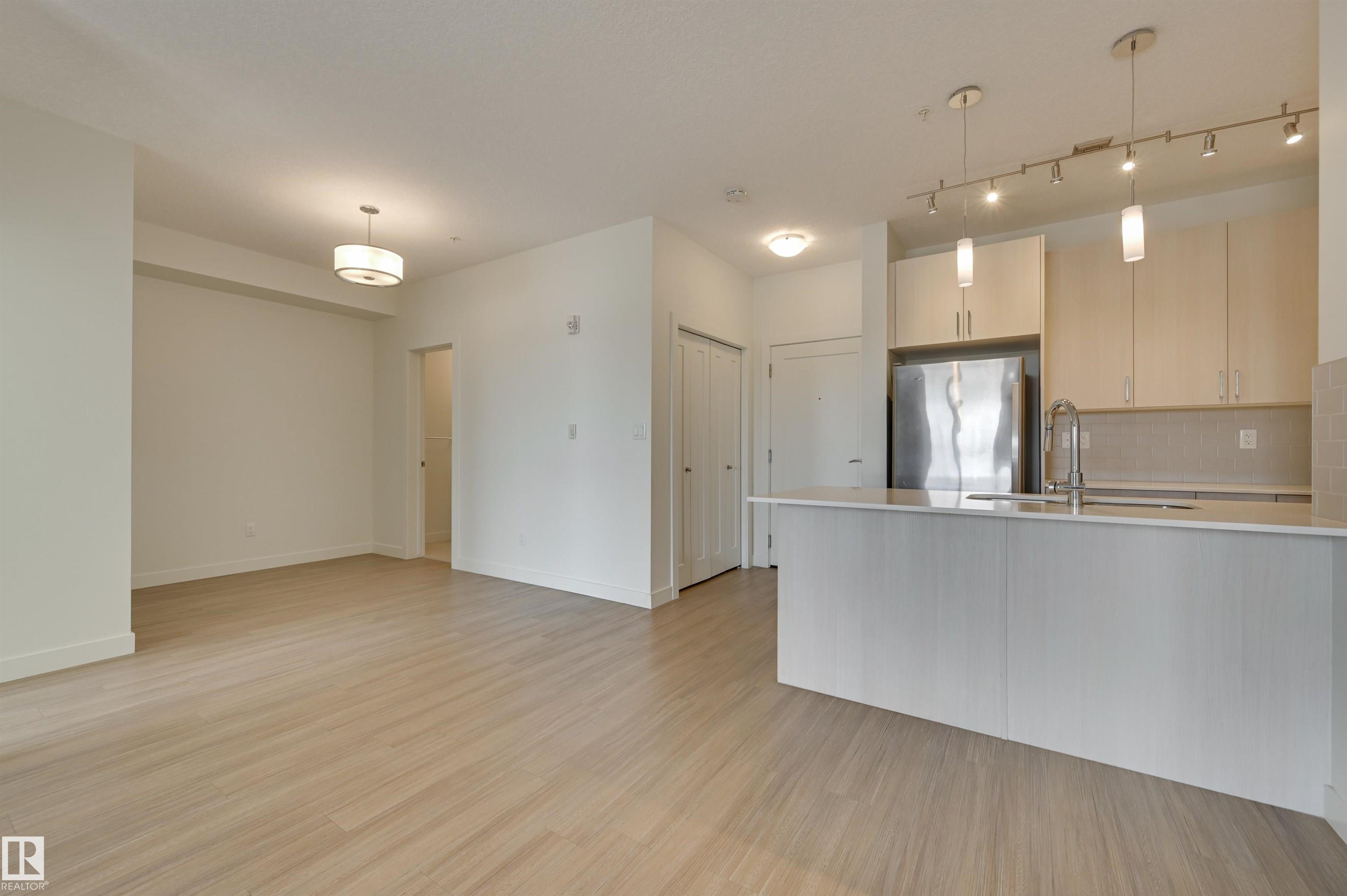 Welcome home to this sunny, spacious 2 bedroom 2 bathroom condo in THE RIDGE located in the heart of DEVON within walking distance to schools, parks, groceries, restaurants, outdoor pool, arena and river valley walking/biking trails. This open modern concept floor plan offers premium finishing throughout with 9' ceilings and the bedrooms at the opposite ends of the living room. The gourmet kitchen has quartz countertops, light color cabinetry with soft close cupboards and drawers with stainless steel appliances. South facing deck with a gas BBQ outlet. Vinyl plank flooring throughout except for tile in the bathrooms. Roughed in for A/C. Included is the fridge, glass top stove, built-in microwave, dishwasher, INSUITE WASHER AND DRYER and TITLED UNDERGROUND PARKING #52 with a storage cage. A great place to call home!
