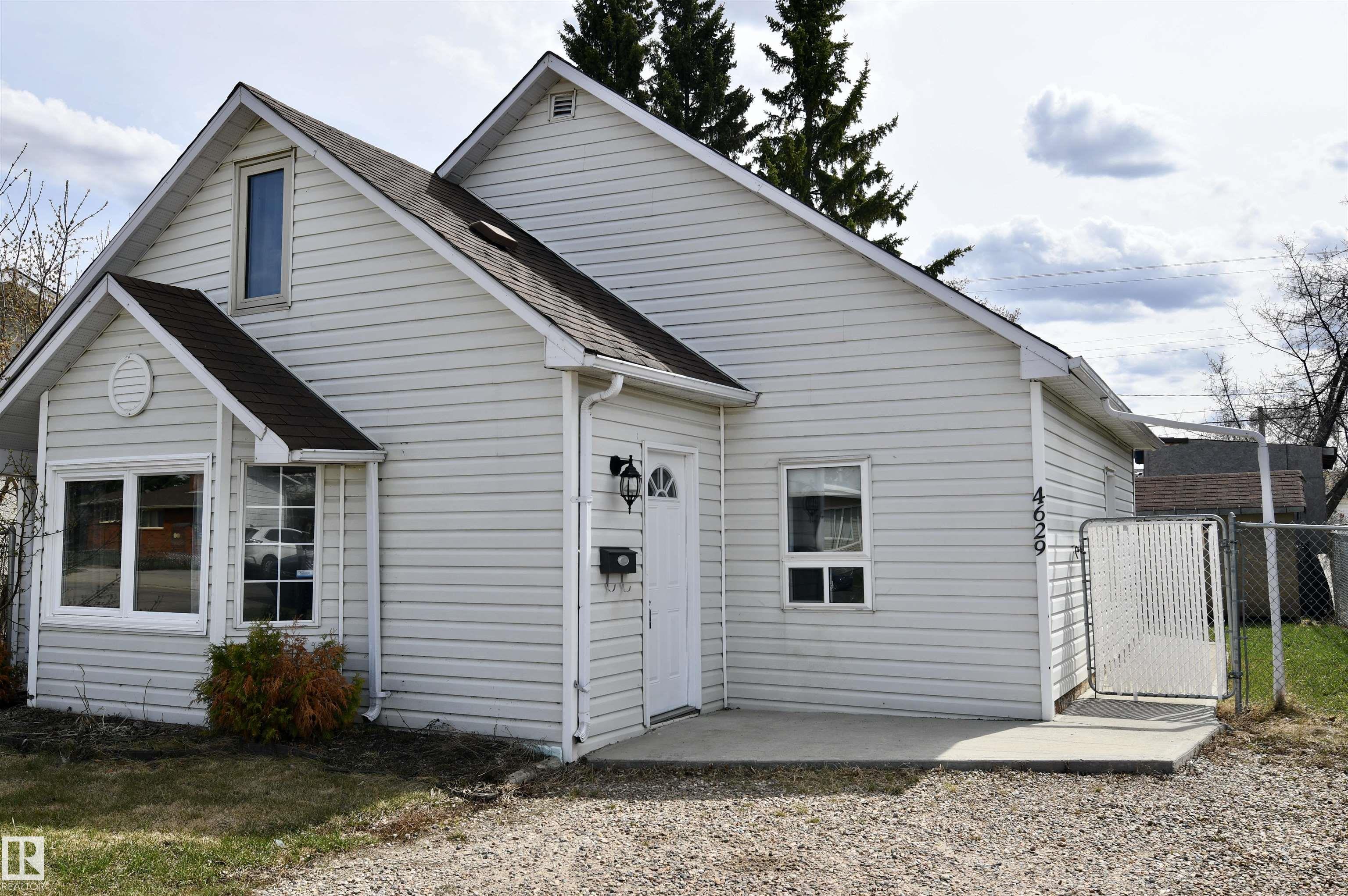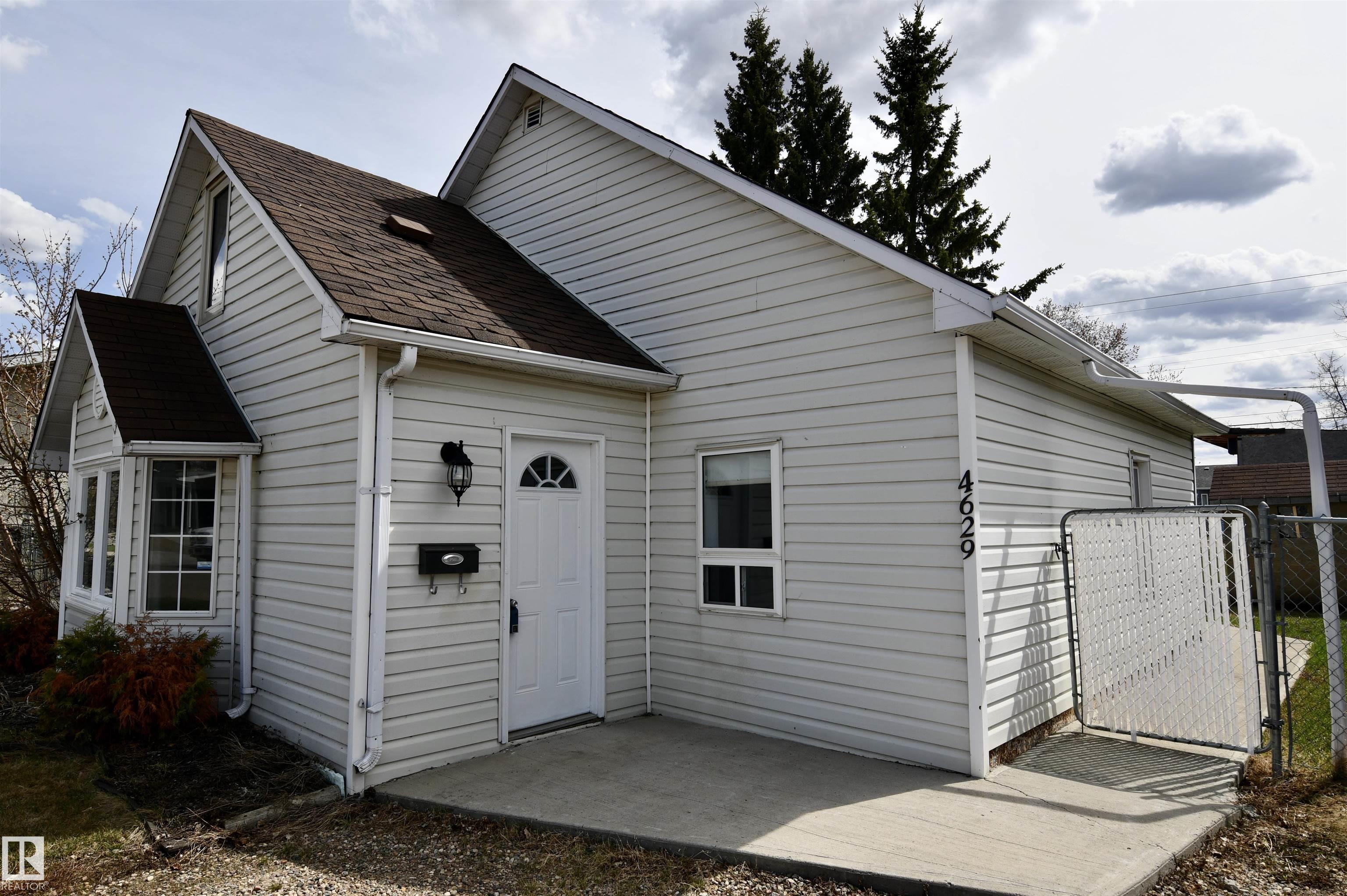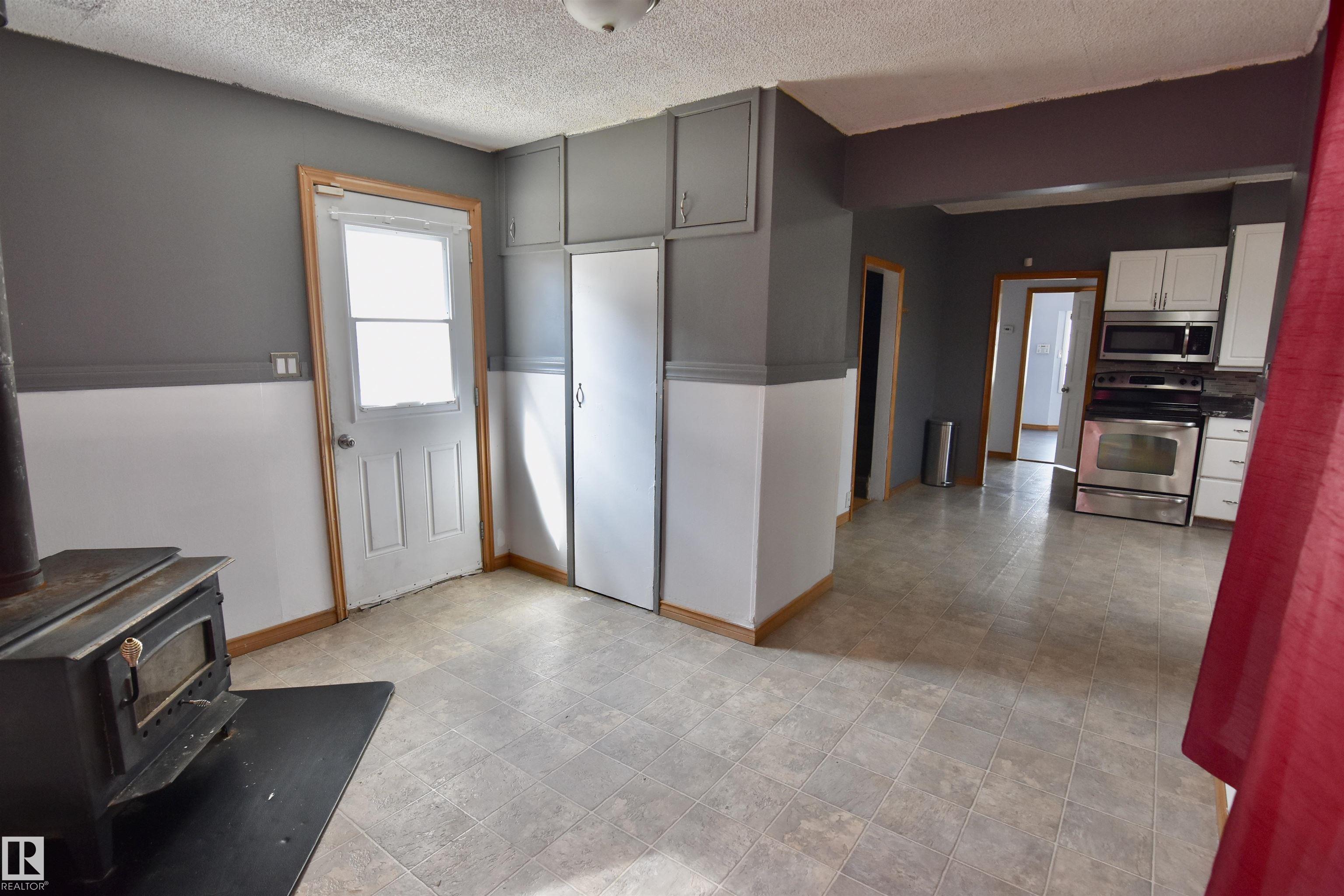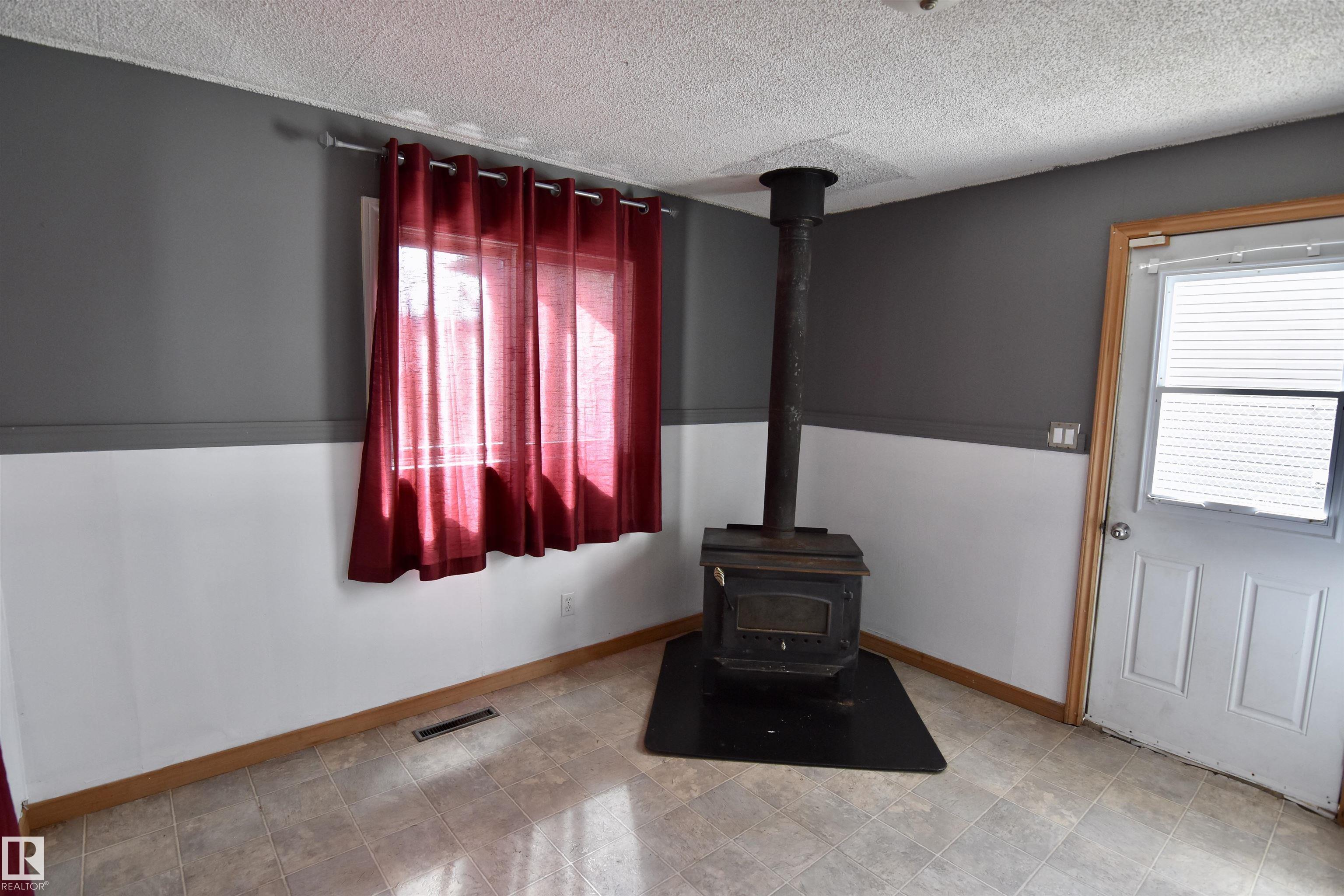 Unique character home close to schools! Tired of cookie-cutter homes? This 1940, 3 bedroom home is apt to catch your attention. The front living room boasts vinyl plank flooring, a bright bay window and a traditional tray ceiling. The eat-in kitchen has seen some updates and features white cabinetry, modern back splash & stainless steel appliances. The back entrance is is cozy with its wood stove and seating area. You'll find 2 bedrooms on the main floor, one featuring the laundry facilities. Upstairs is one more charming bedroom and flex space that's ideal for a play area, reading area or extra storage. Outside is fully fenced with 2 storage sheds and a small patio area. With a bit of your own elbow grease and imagination, this could be your ideal first home or possibly a rental for some additional income.