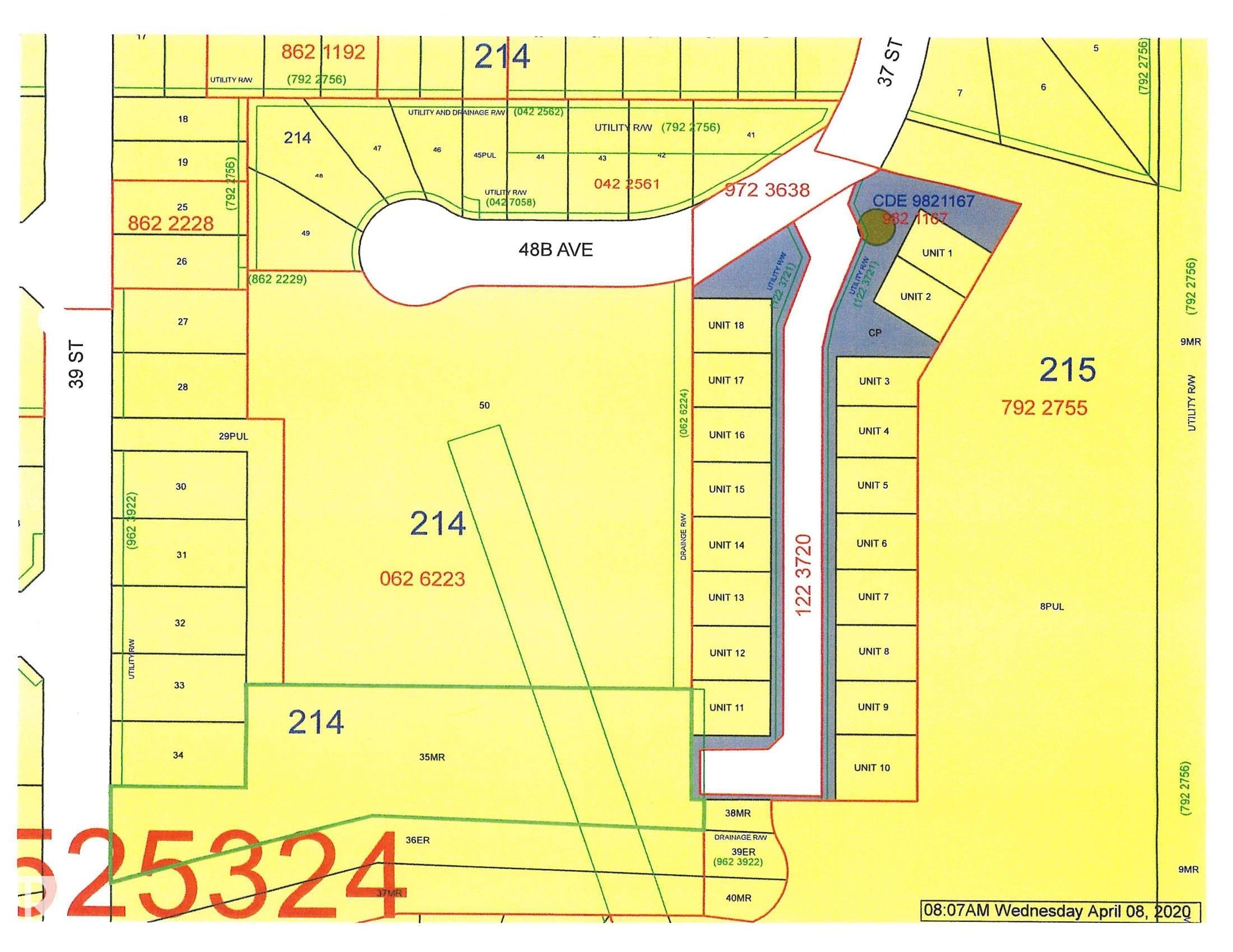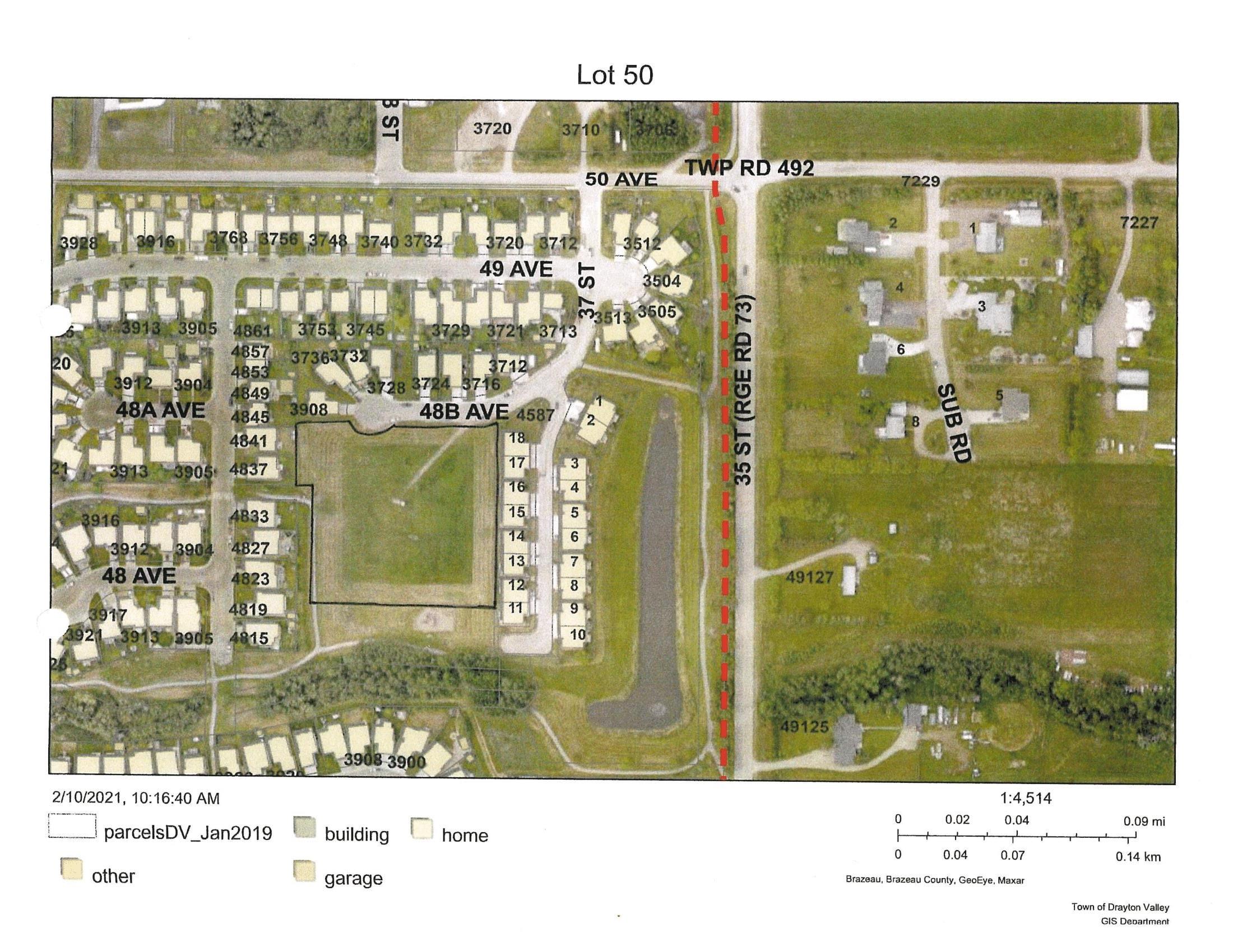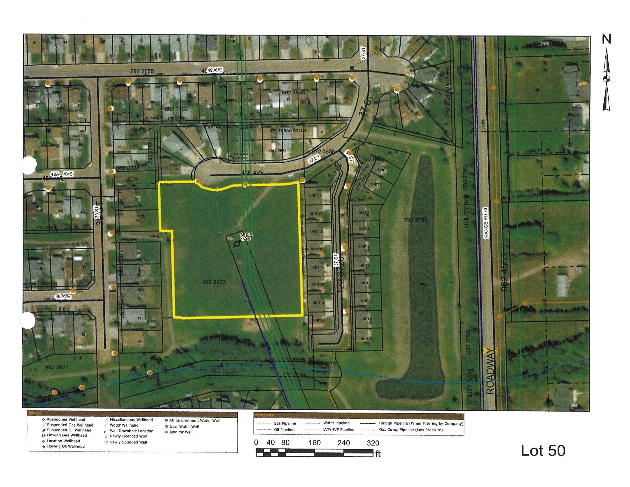 Investors, THIS IS FOR YOU!!! FIRSTLY - $14,250.00 per year lease revenue from the abandoned water injection site with Ricochet. It has been abandoned for some time but they keep paying; secondly if it does get reclaimed after you made this much per year for who knows how long, you would still have a beautiful 3.19 -acre parcel in an awesome location to develop homes or sell to a developer. There is a playground at one end, walking trails thru the trees to the pond and waterfall, and further trails. The land is maintained by Ricochet every year , so no mowing of grass. This property is zoned as Urban Reserve. A great spot to add to the existing adult condos on the pond or options to build single family homes. There is an approach in place off of 48B Ave. Services are stubbed into property off of 48B Ave. The property off of 50 Ave. turning south on 37 St. Turn west on 48B Ave. at the entrance of Aspenview on Pond. GREAT INVESTMENTand GREAT LOCATION.!