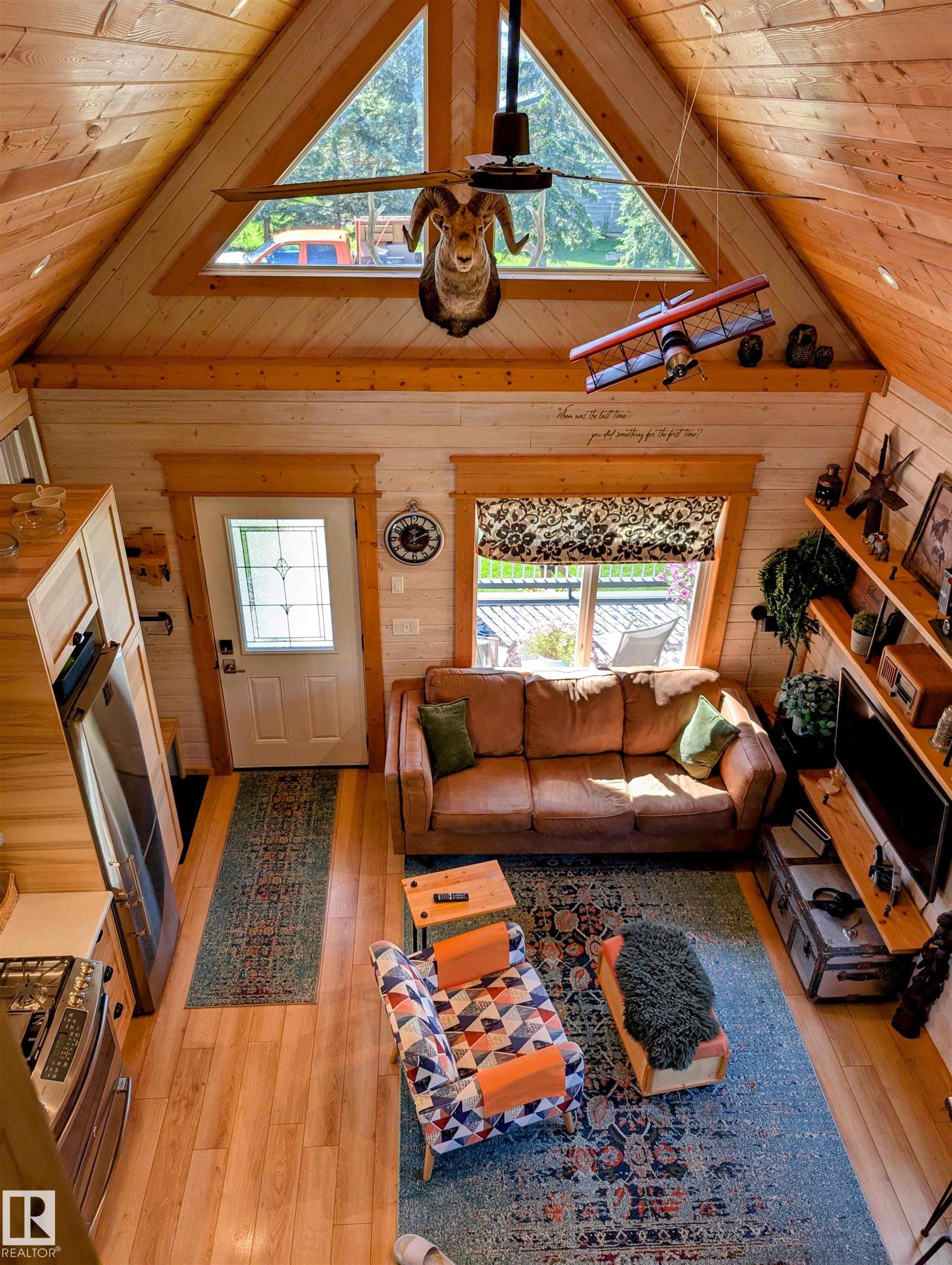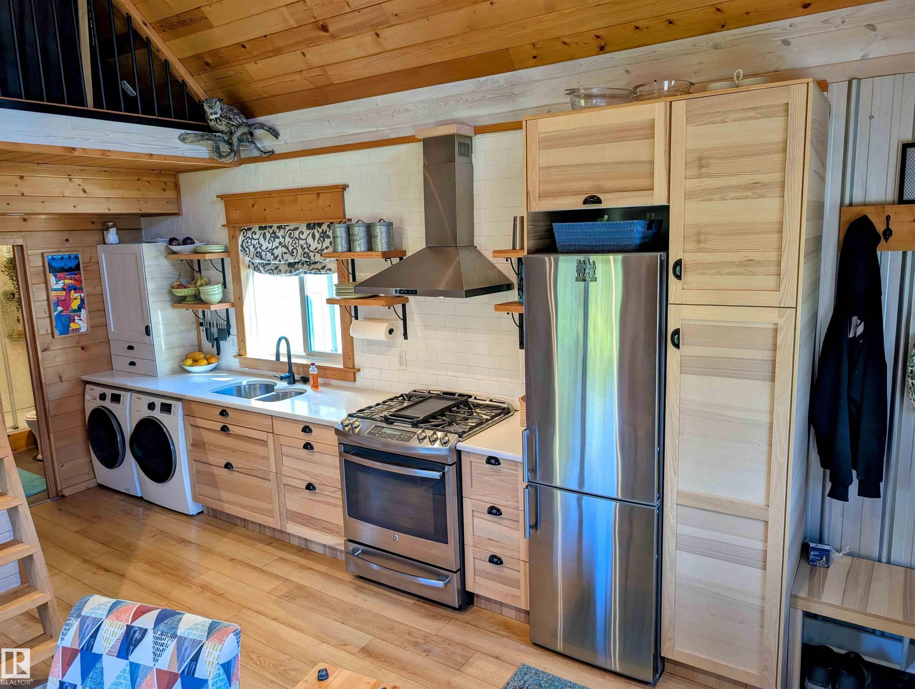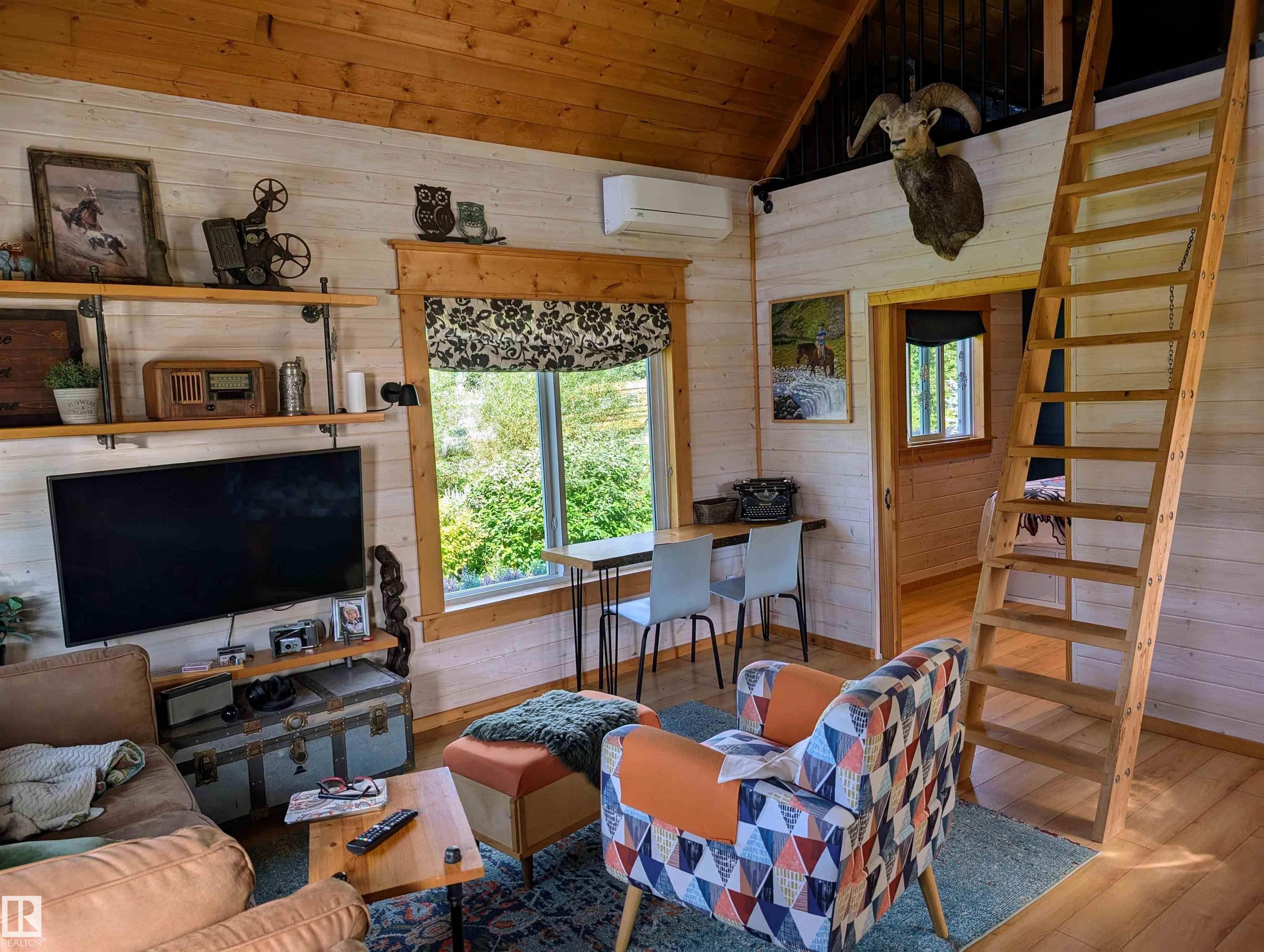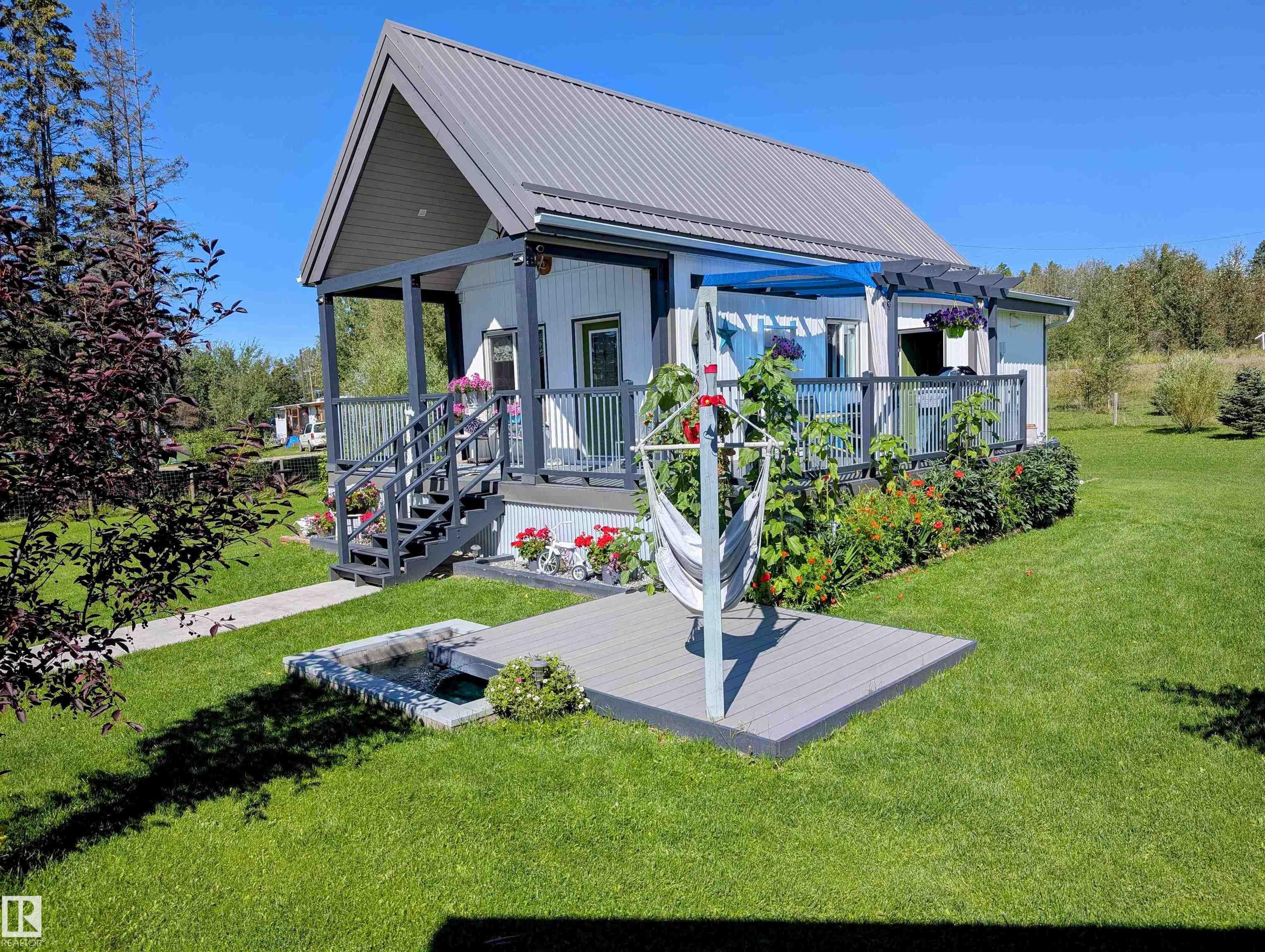 IT DOESN'T GET ANY CUTER THAN THIS! This immaculate property with meticulous attention to detail boasts a Knotty Pine cabin with the primary bedroom, a three piece bath, a cozy living space and a mechanical room with its own separate entrance on the main floor. The loft offers additional living space, perfect for guests or a quiet retreat. The home, built on a sturdy helical pile foundation, boasts high-end features including, in-floor heat, air conditioning, a HRV system, stainless steel appliances, quartz countertops, on demand hot water, and a security system with 4 cameras. Step outside onto the wraparound, maintenance-free, composite deck and enjoy your fully fenced yard-beautifully landscaped with many trees, perennials, raised garden beds, and a water feature. The yard also features a 8' x 12' garden shed and a 16' x 28' garage with 12' wide carport, offering plenty of storage and parking. Located in the charming hamlet of Winfield, this unique property is a must-see to be fully appreciated.