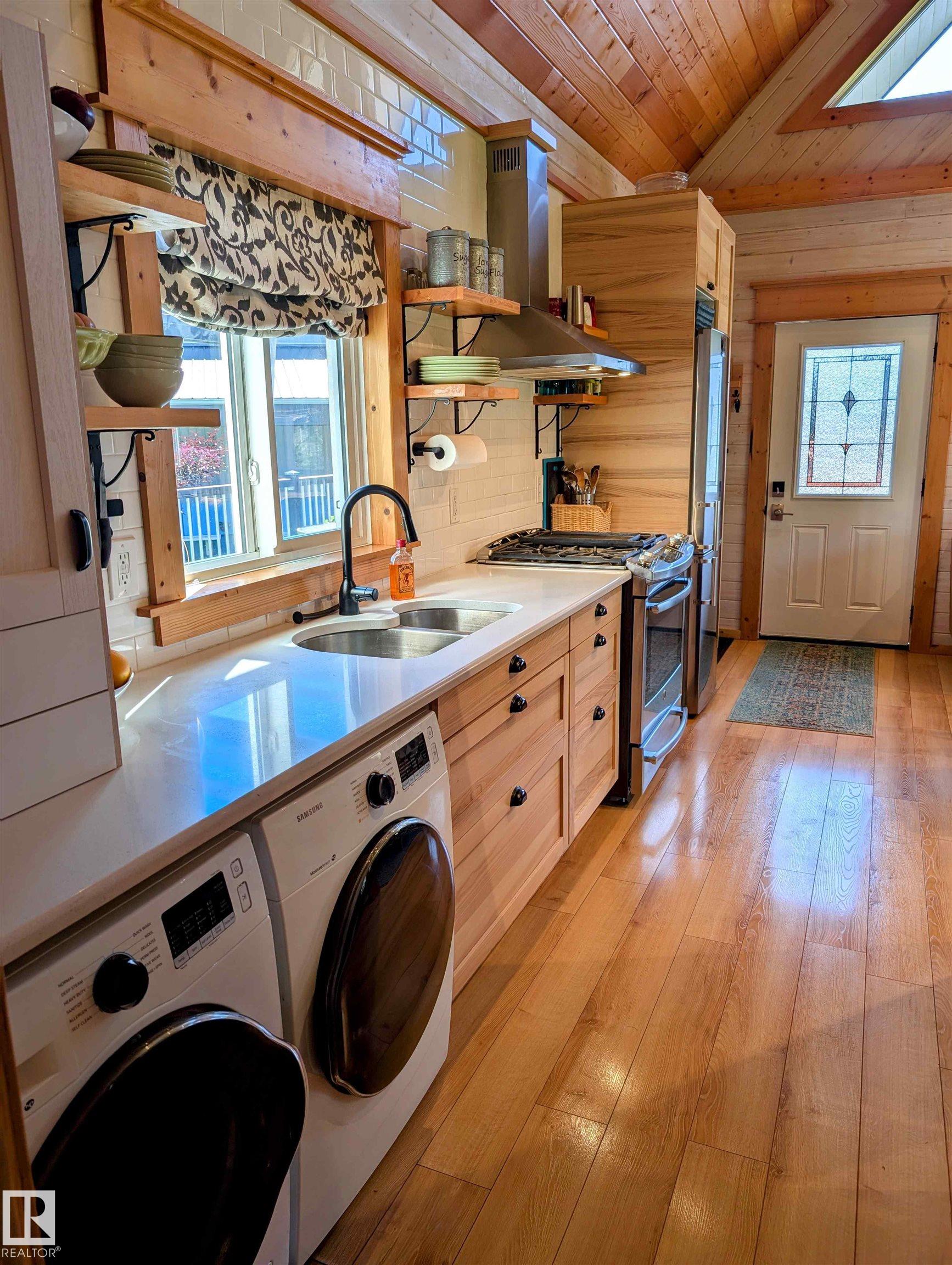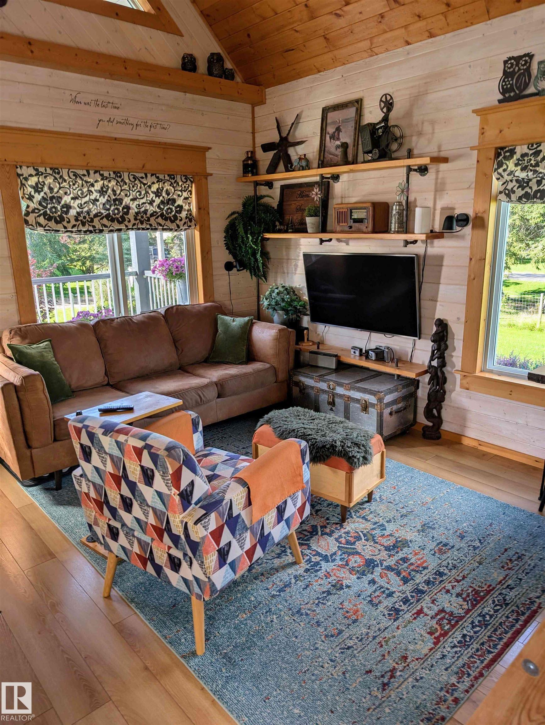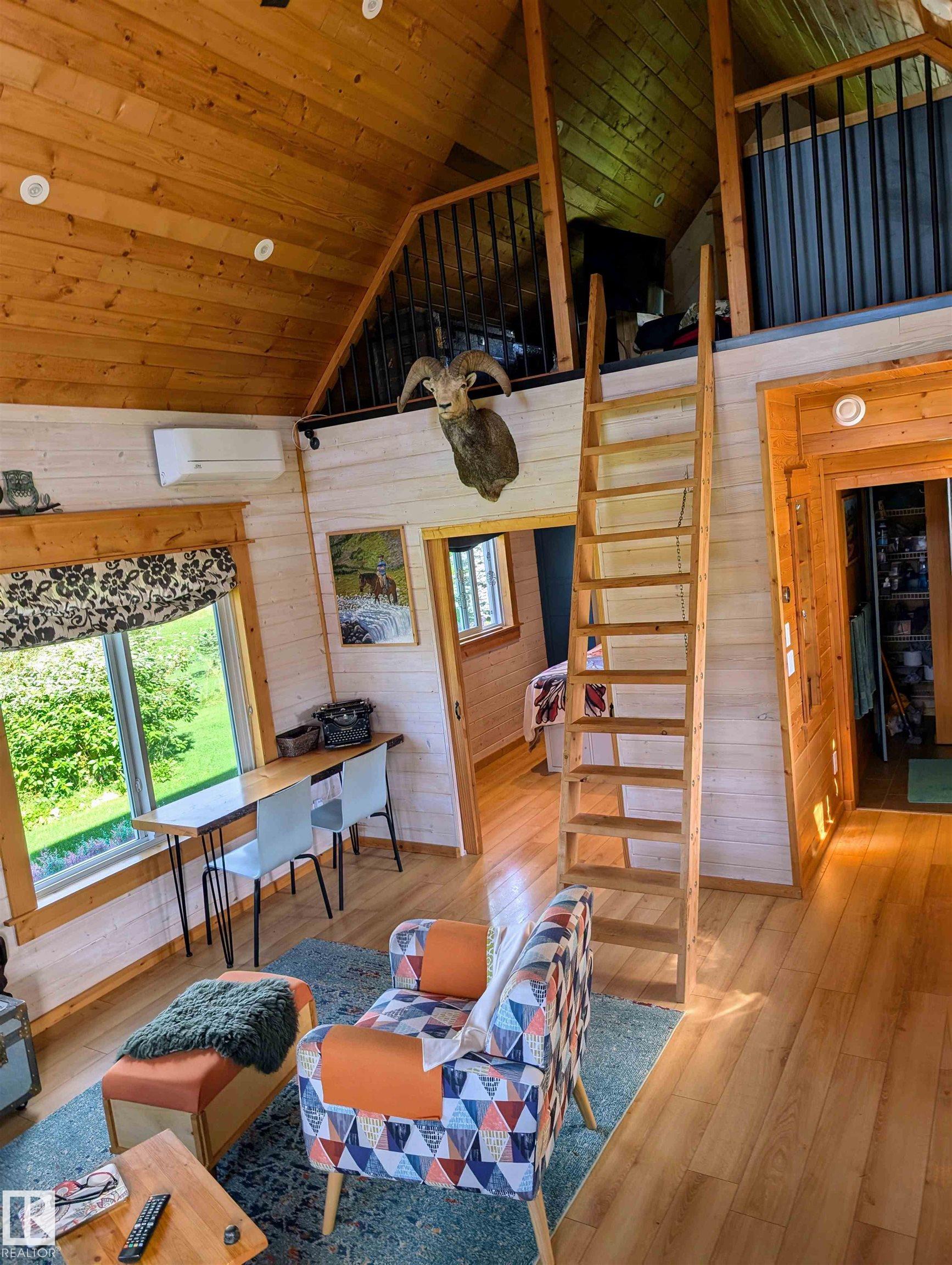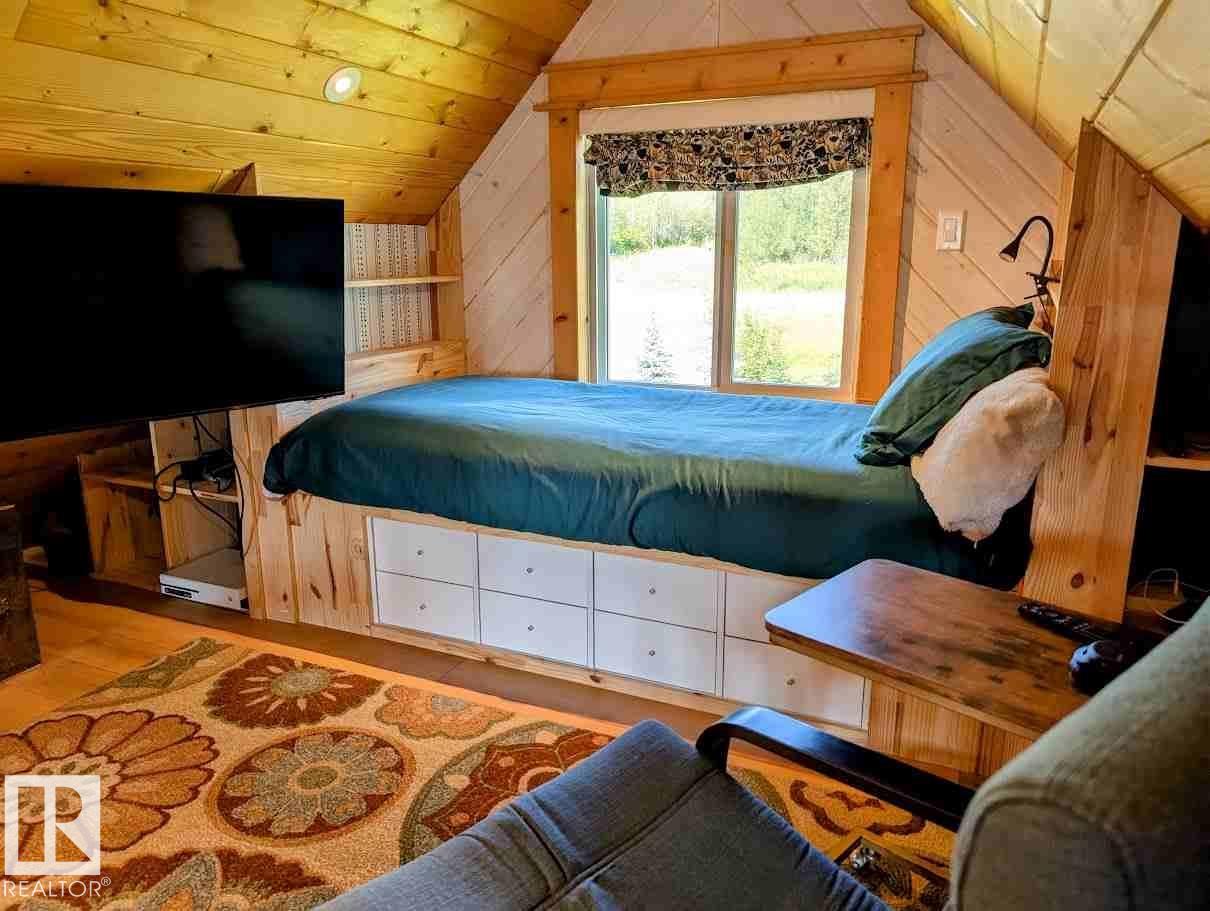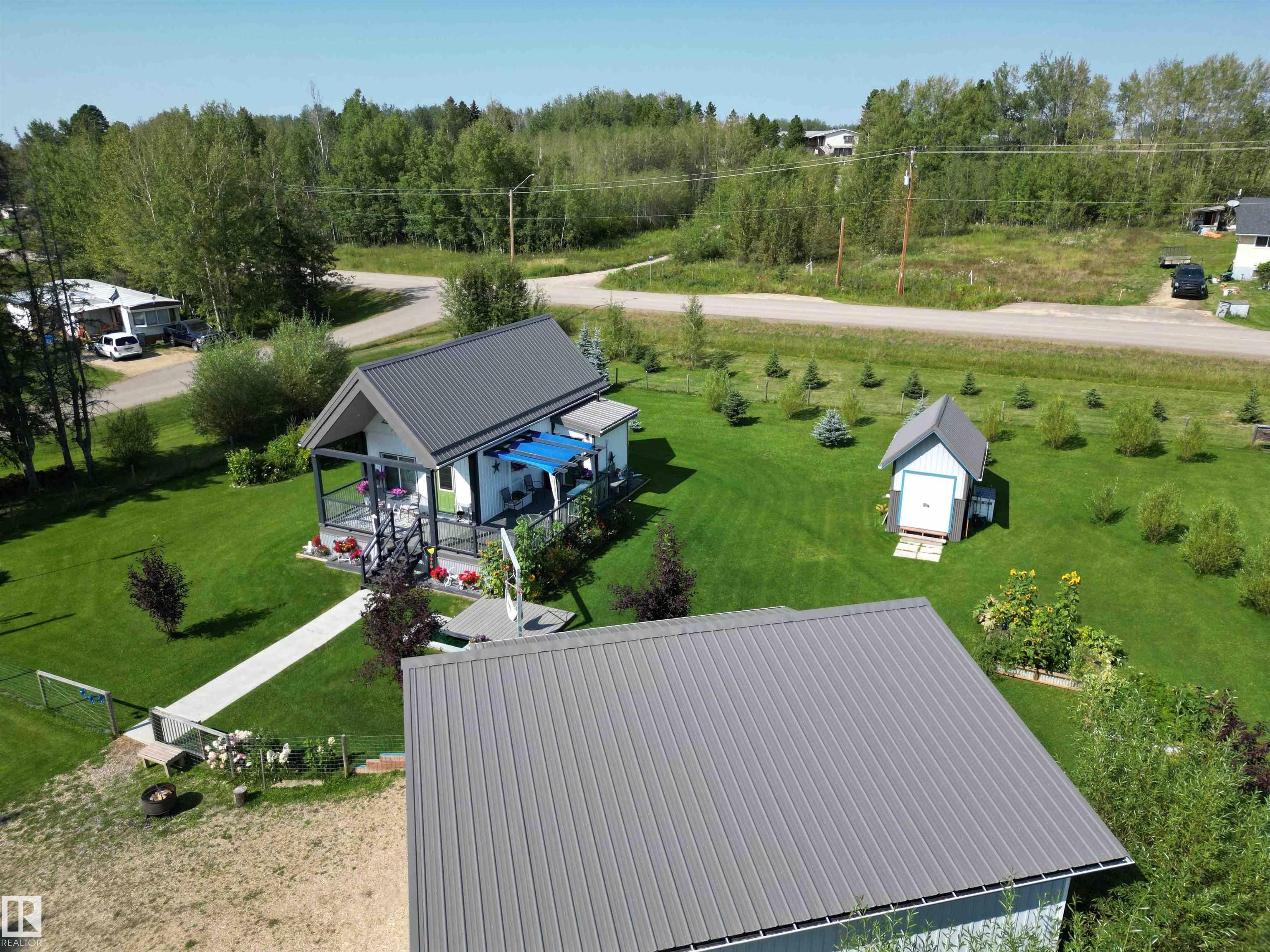 IT DOESN'T GET ANY CUTER THAN THIS! This immaculate property with meticulous attention to detail boasts a Knotty Pine cabin with the primary bedroom, a three piece bath, a cozy living space and a mechanical room with its own separate entrance on the main floor. The loft offers additional living space, perfect for guests or a quiet retreat. The home, built on a sturdy helical pile foundation, boasts high-end features including, in-floor heat, air conditioning, a HRV system, stainless steel appliances, quartz countertops, on demand hot water, and a security system with 4 cameras. Step outside onto the wraparound, maintenance-free, composite deck and enjoy your fully fenced yard-beautifully landscaped with many trees, perennials, raised garden beds, and a water feature. The yard also features a 8' x 12' garden shed and a 16' x 28' garage with 12' wide carport, offering plenty of storage and parking. Located in the charming hamlet of Winfield, this unique property is a must-see to be fully appreciated.