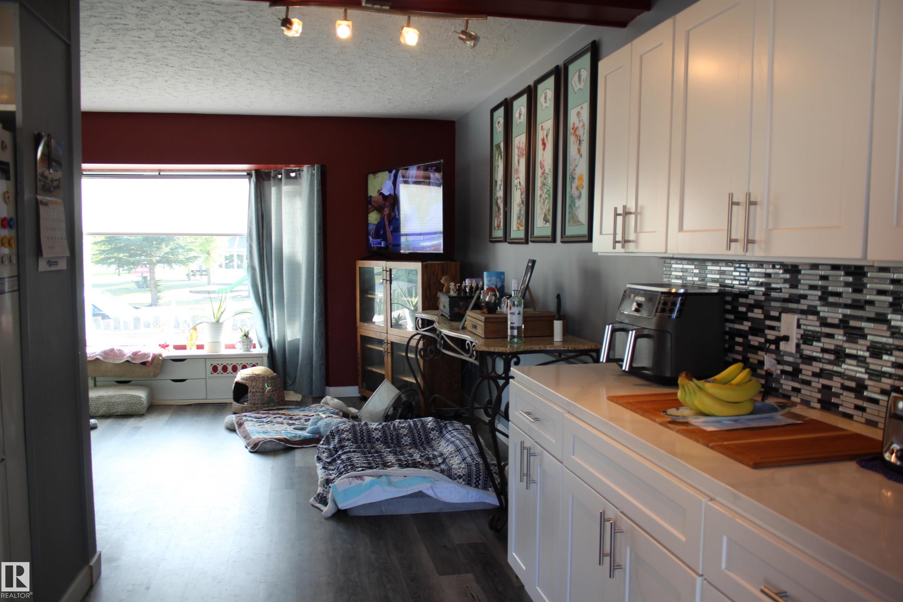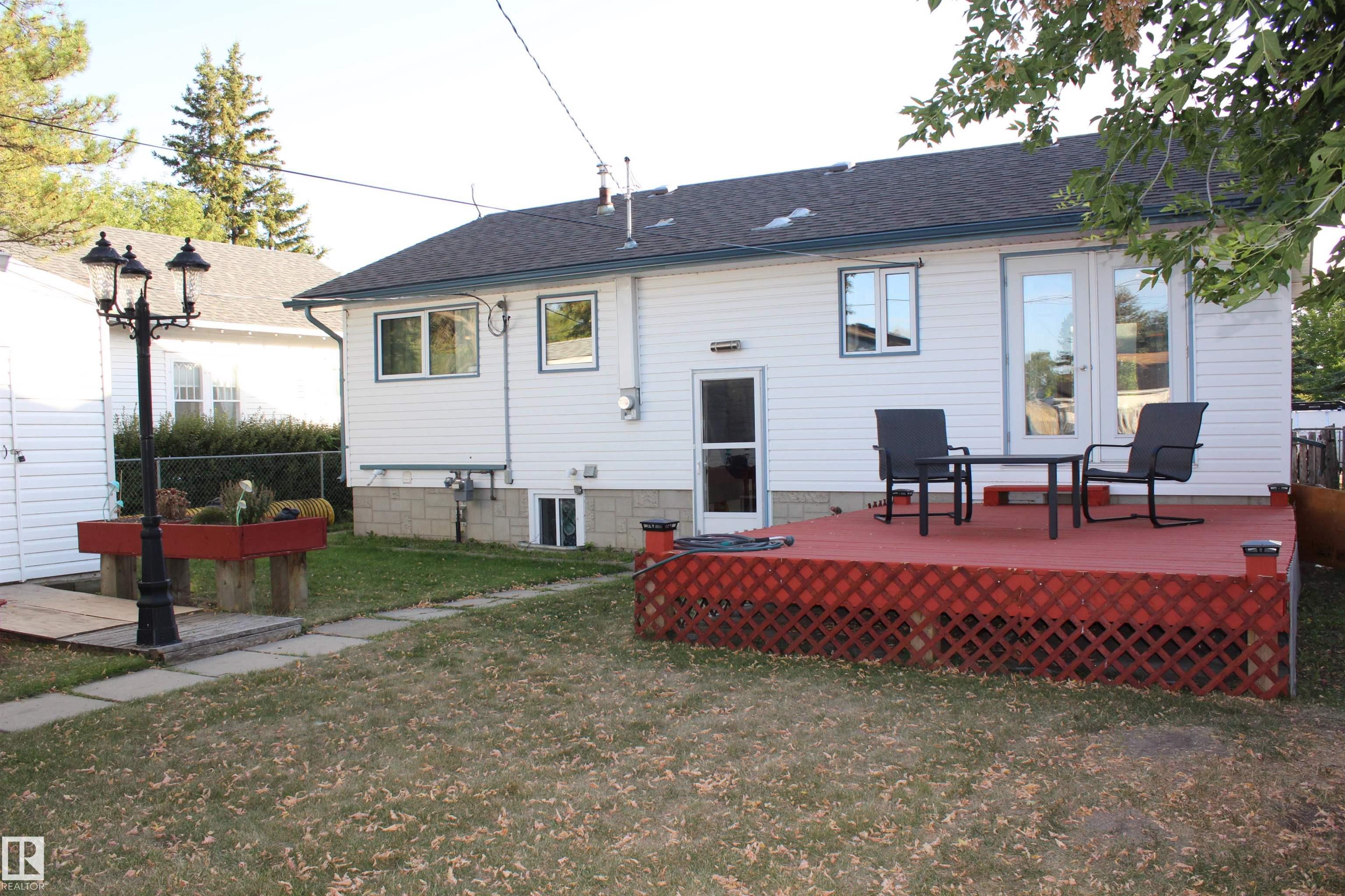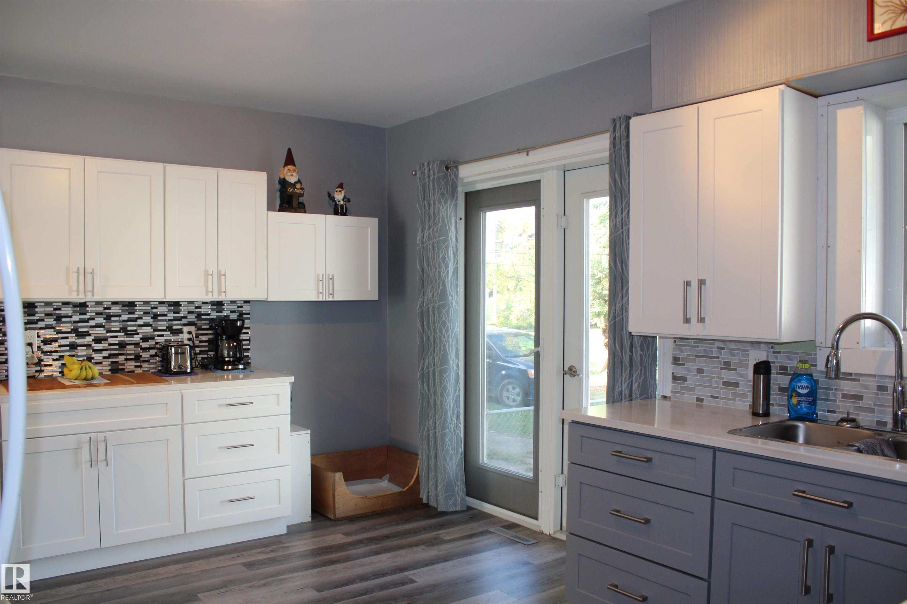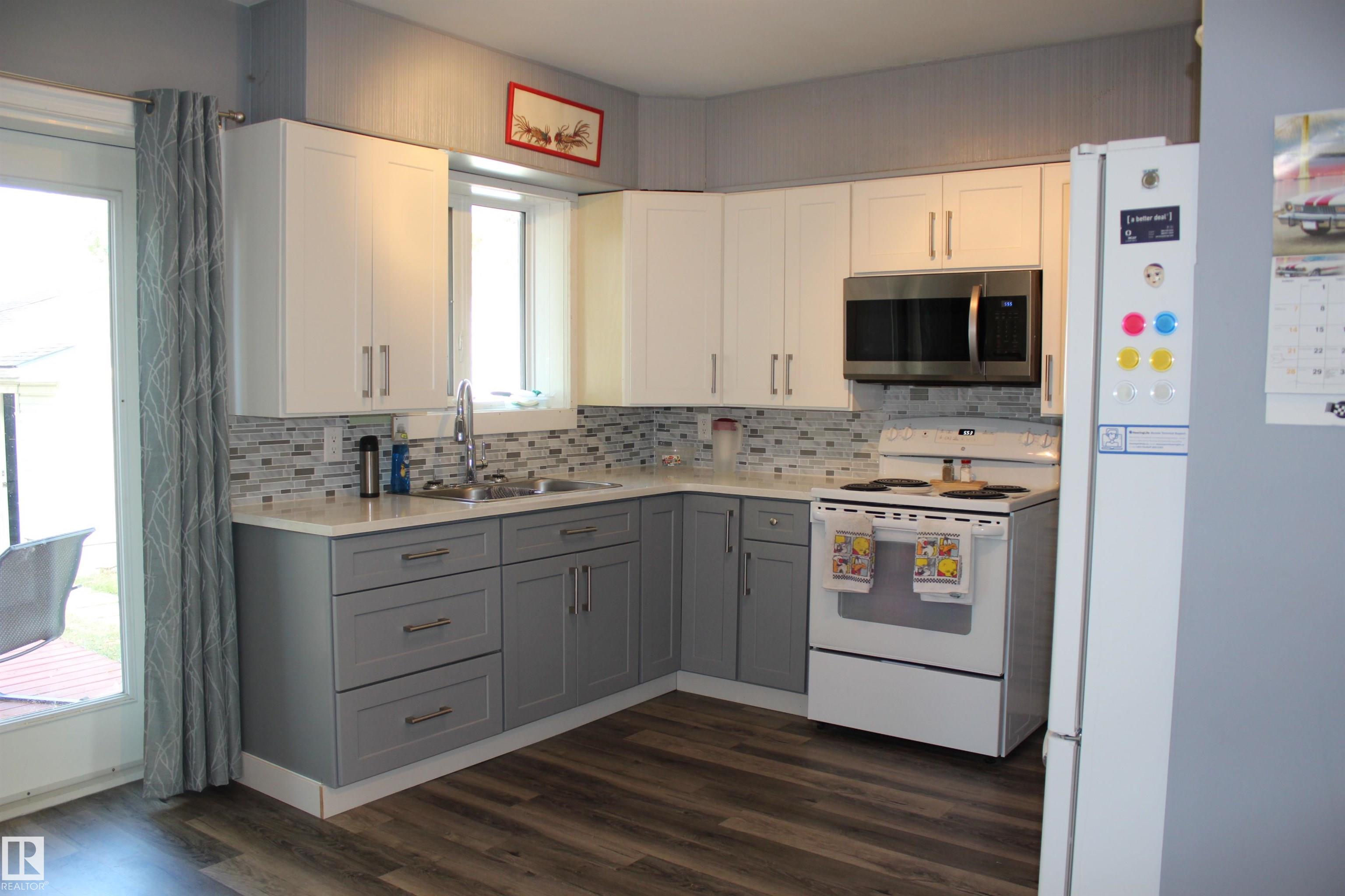 Enjoy life in a small town in this 3 bedroom bungalow home complete with a heated double garage! With a brand new kitchen and updated flooring, this home is so welcoming and ready to move into! With 2 bedrooms on the main floor plus another large bedroom in the basement, there is plenty of room for guests, kids or grandkids! The spacious kithen enjoys and abundance of brand new cabinets and countertops with garden doors leading to the large deck and fenced yard. Fully finished basement with a hobby/sitting area, family room, third bedroom, 2 piece bath and laundry room. You will love the double garage, fully finished and heated with brand new epoxy floors, nice and clean! The yard is fully fenced front and back, great for kids or pets. Across the street from the splash park , skatepark and pickle ball courts, super convenient for the kiddos or grandkids.