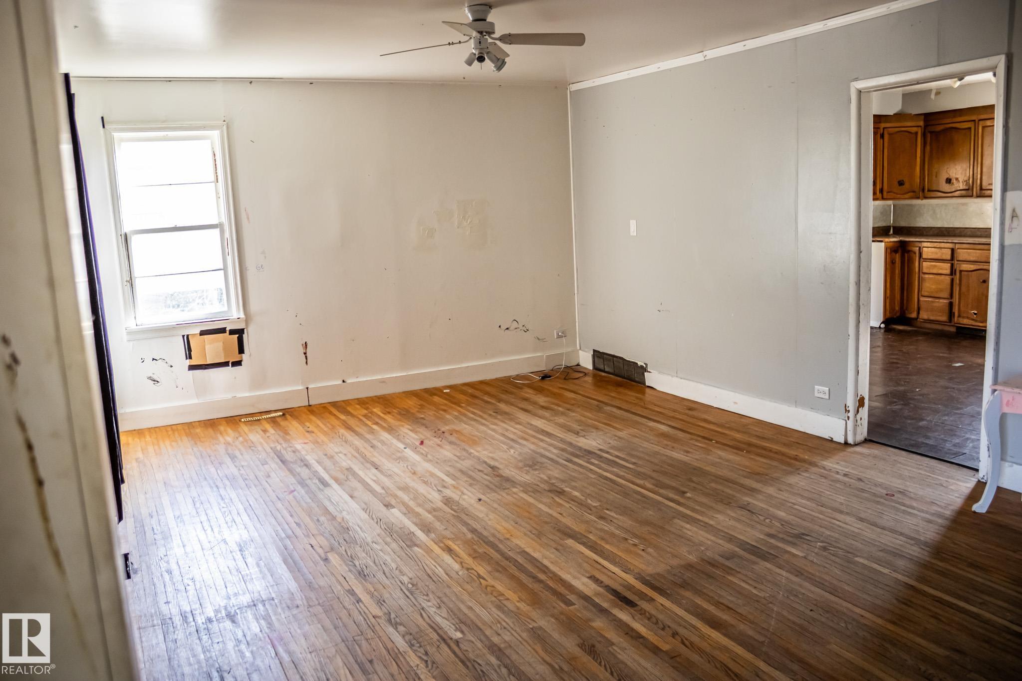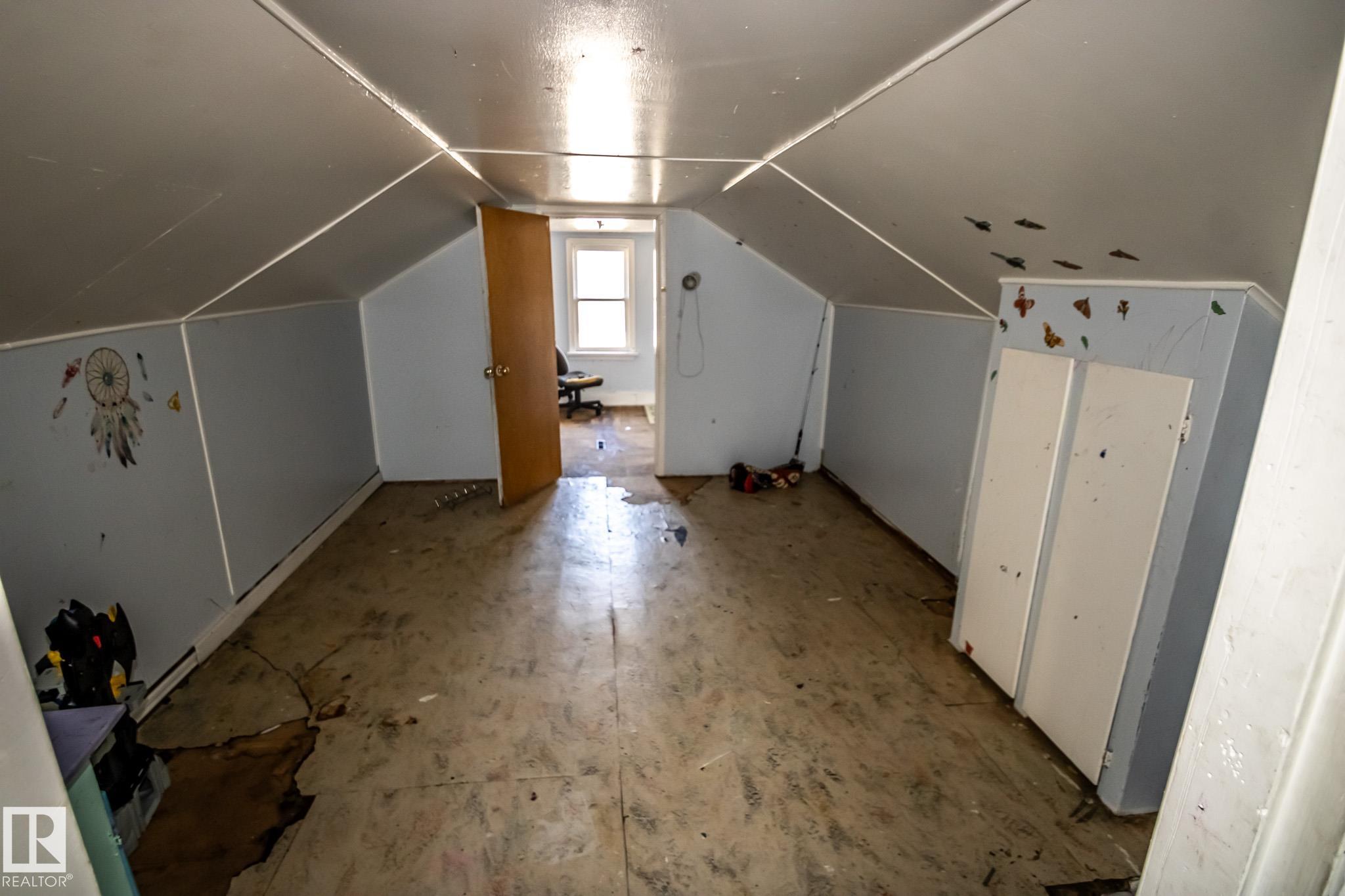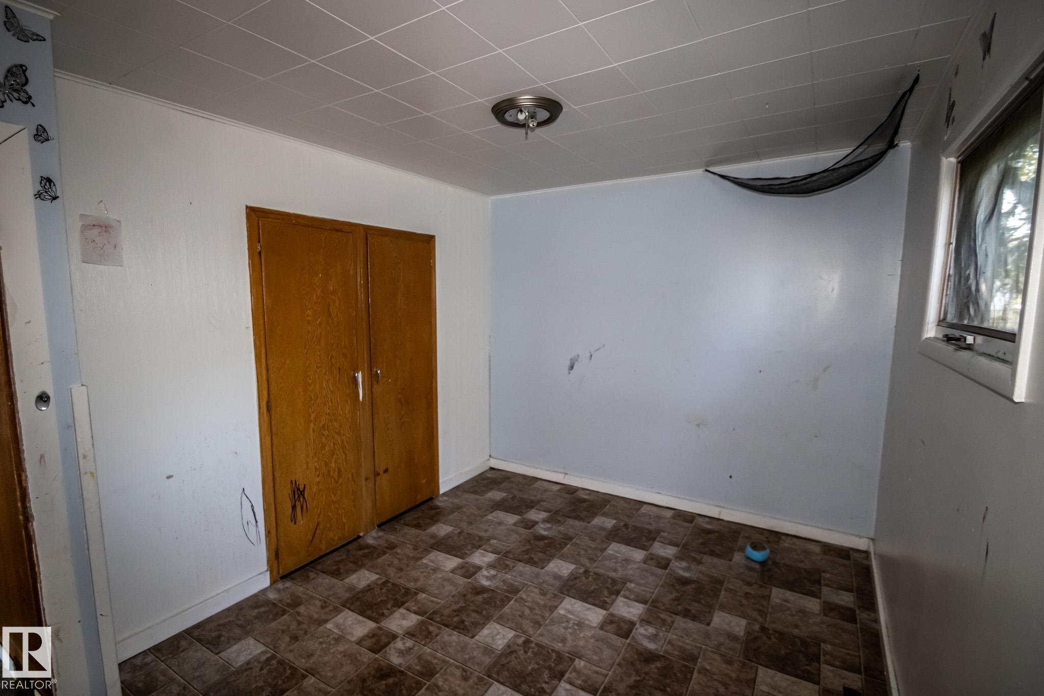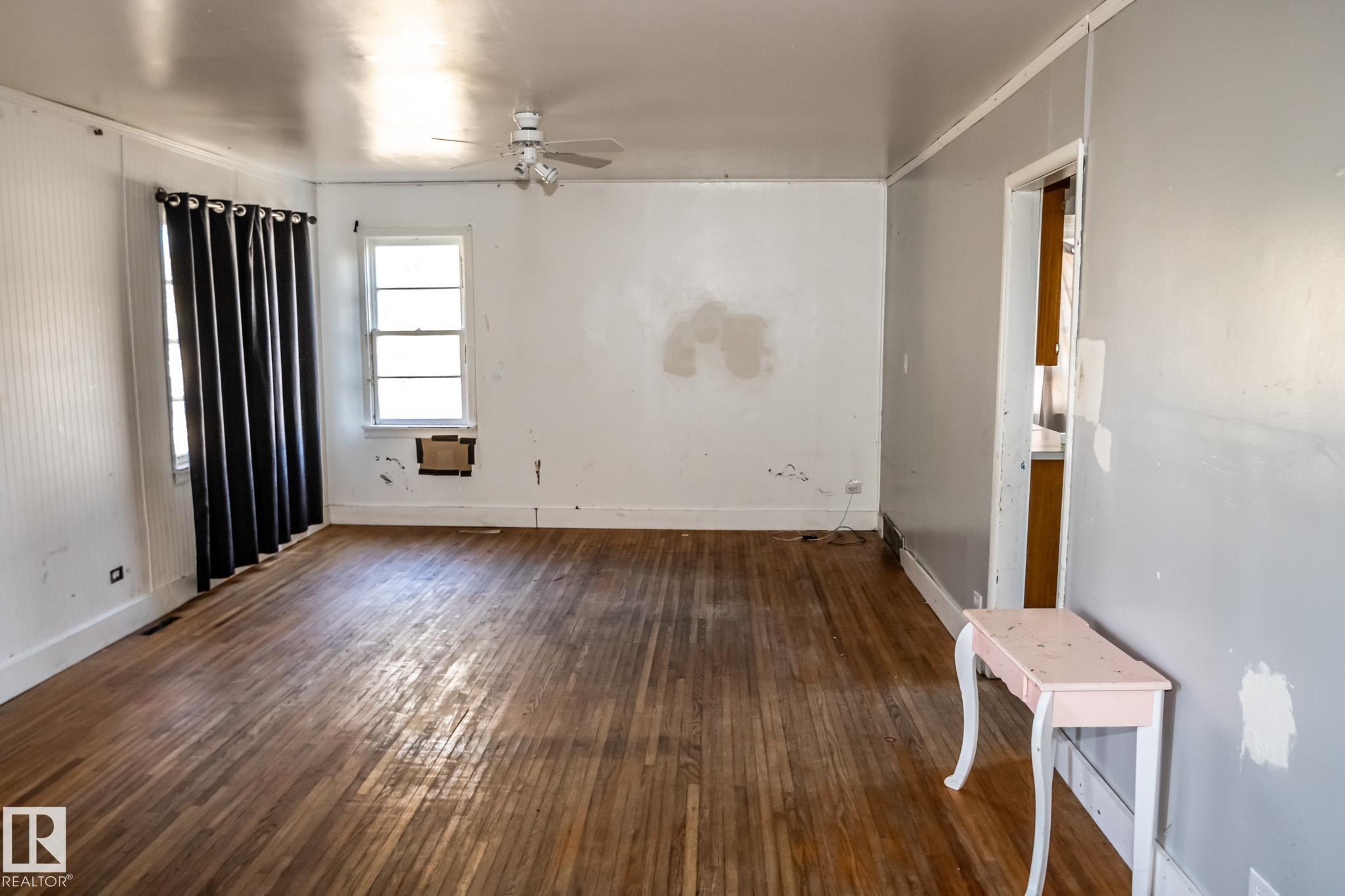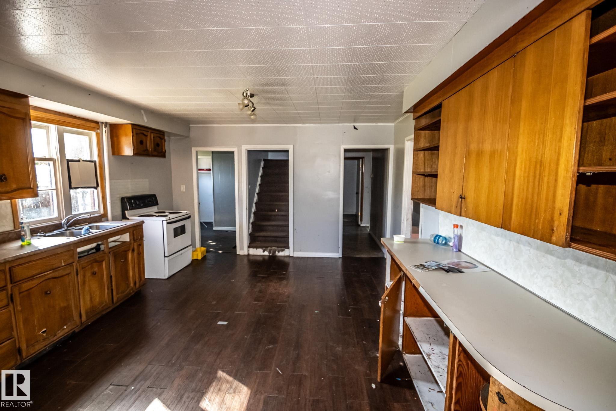 One-and-a-half-story home located in a central area of St. Paul. The main floor includes a living area, kitchen, bathroom, and two bedrooms, with two additional bedrooms located on the upper level. A single detached garage is situated at the back of the property, along with space for additional parking.