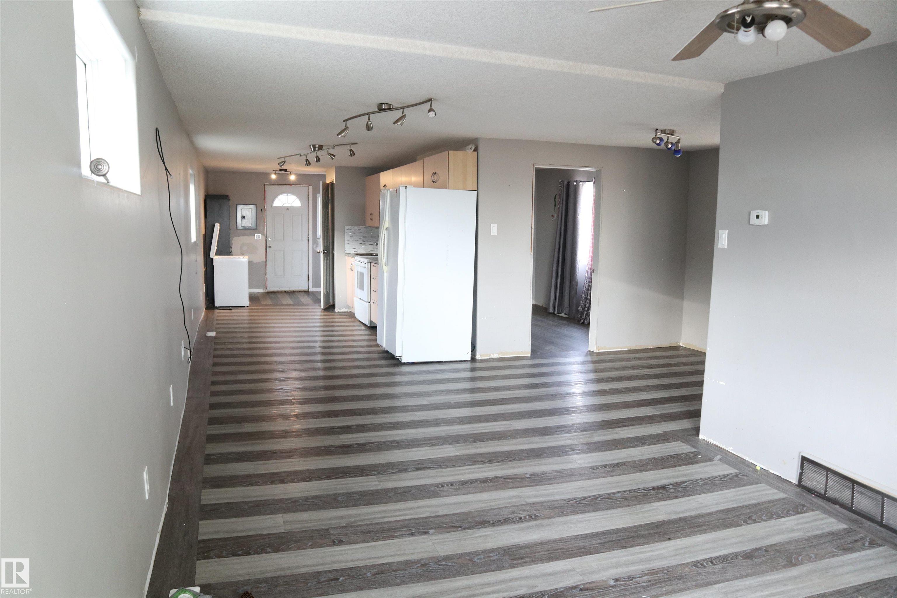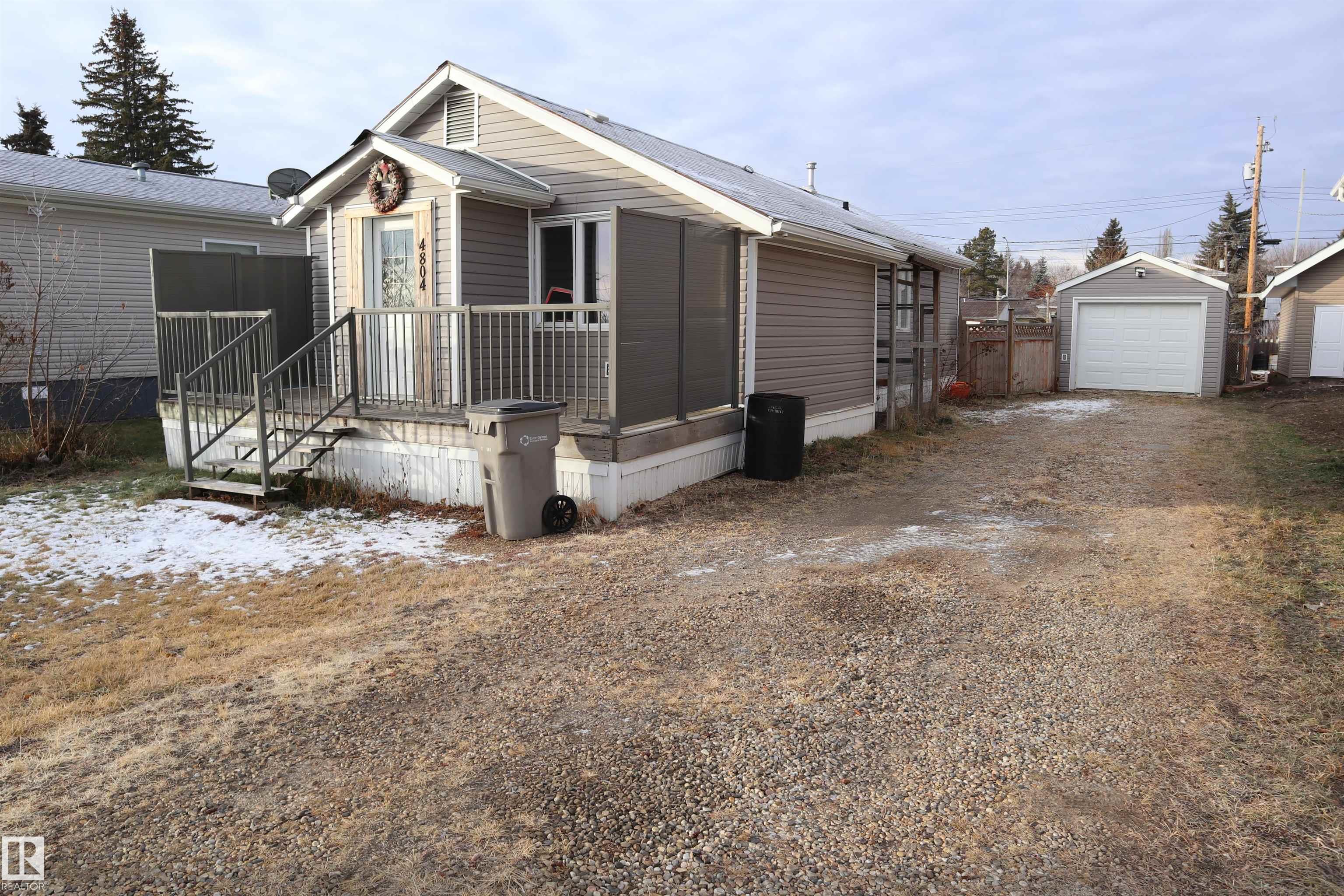 This cozy home has vinyl plank throughout, decks, a large fenced yard, and a Storage garage. Inside the home the main floor welcomes you with the living room that is open to the kitchen and dining. The home has two bedrooms, laundry, and a 4 piece bathroom to conclude the floor plan. The home has a front deck, and large deck off the back leading to the spacious fenced backyard with a storage shed. The 20'x12' storage garage has power and an overhead door. This cute property welcomes you to Calmar!