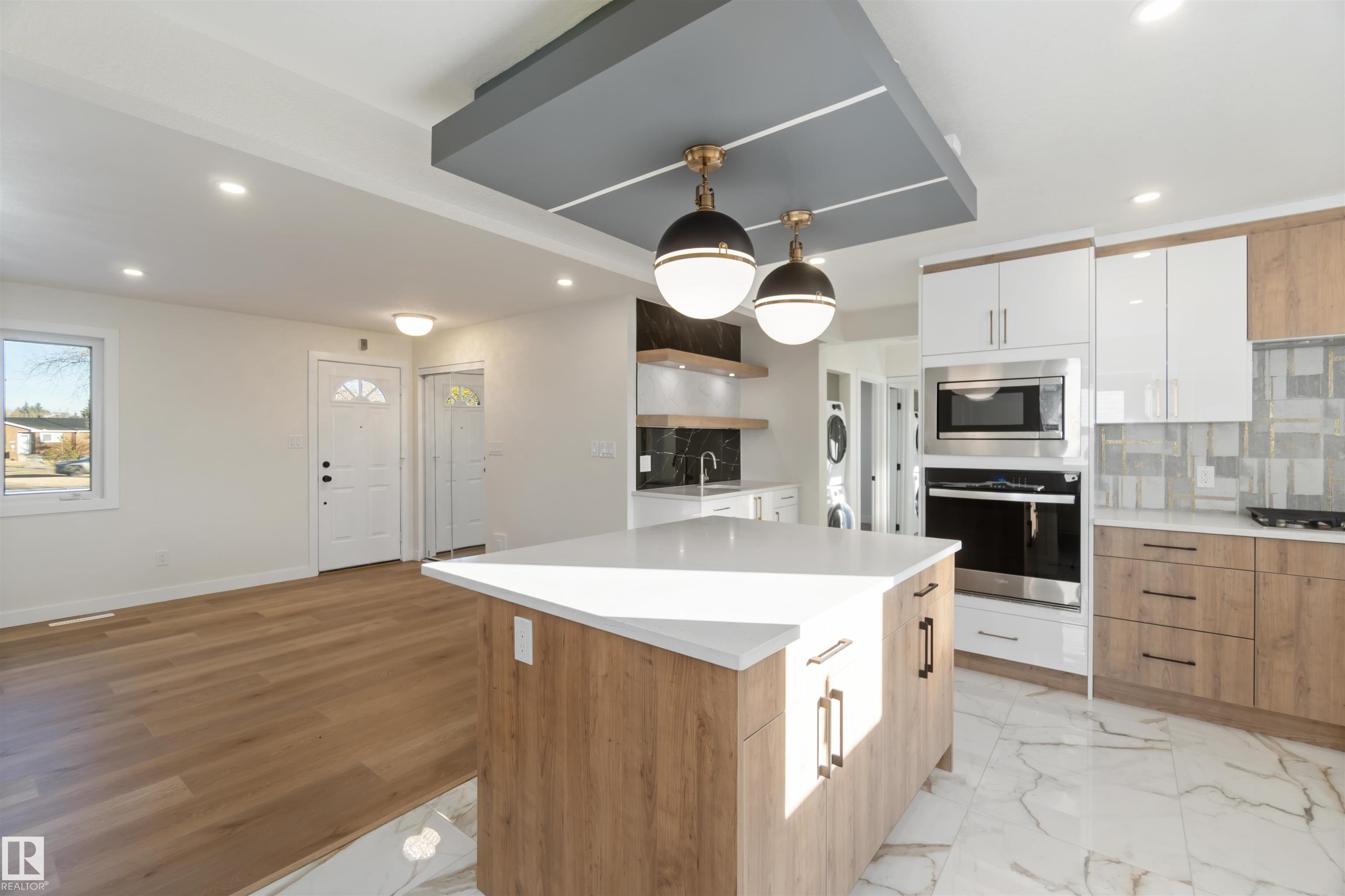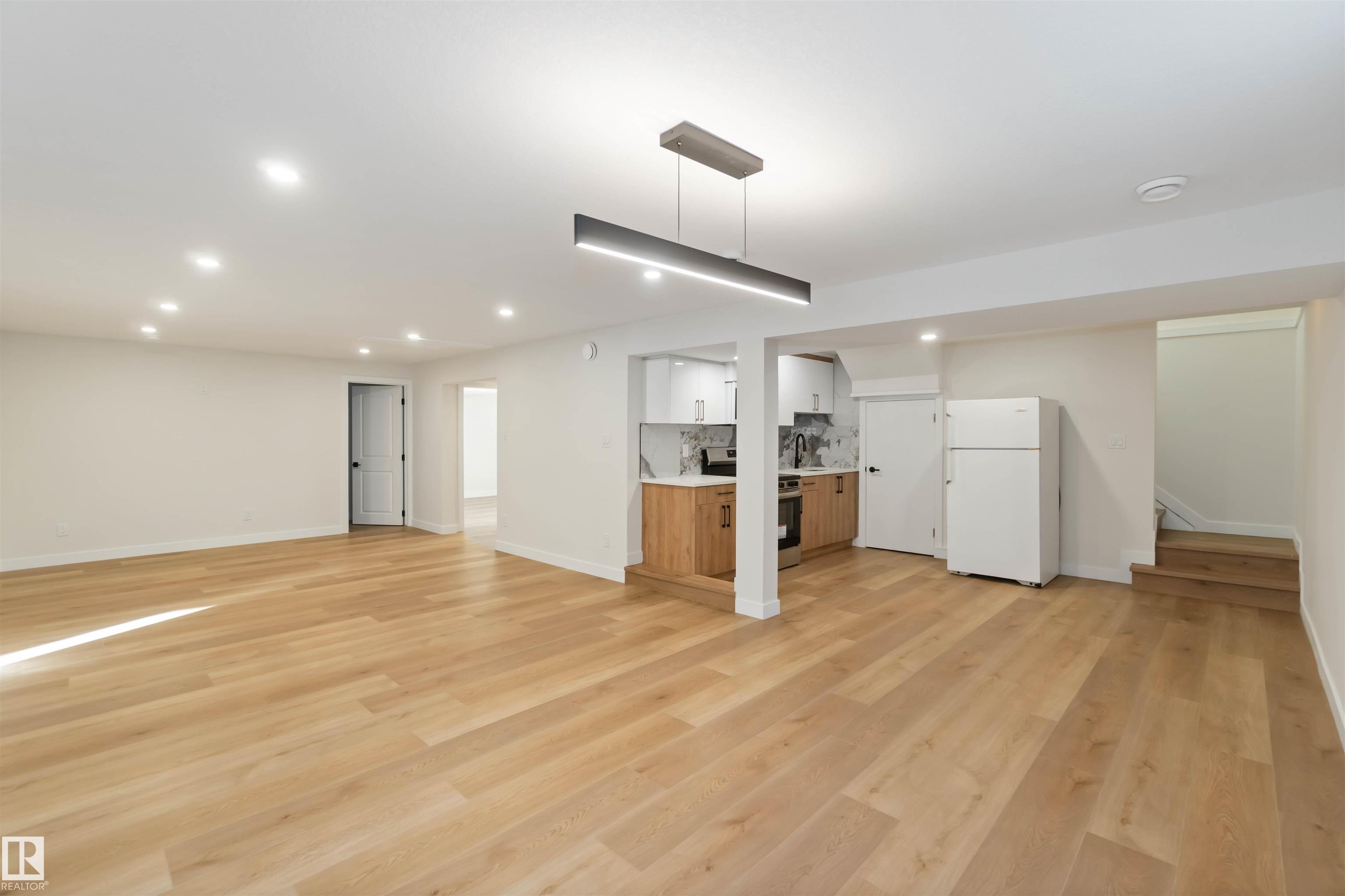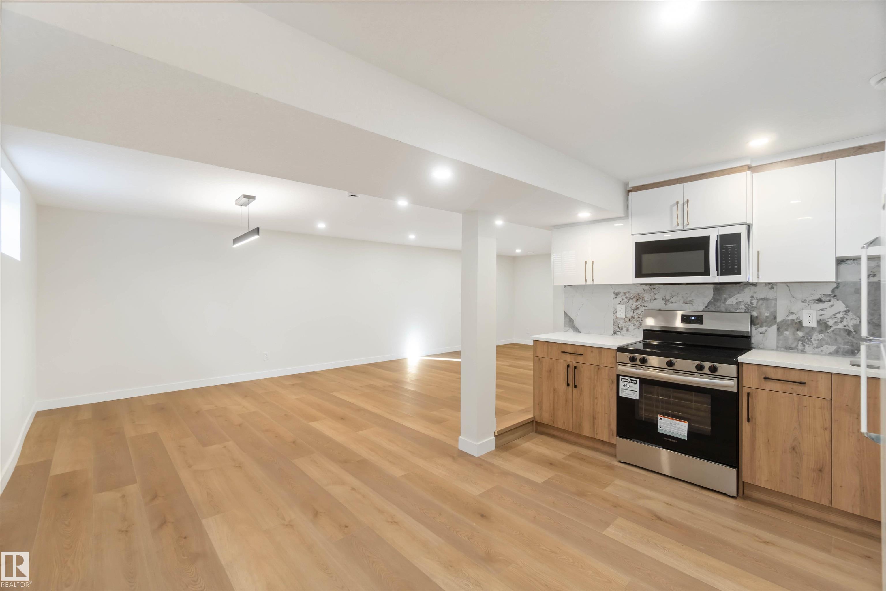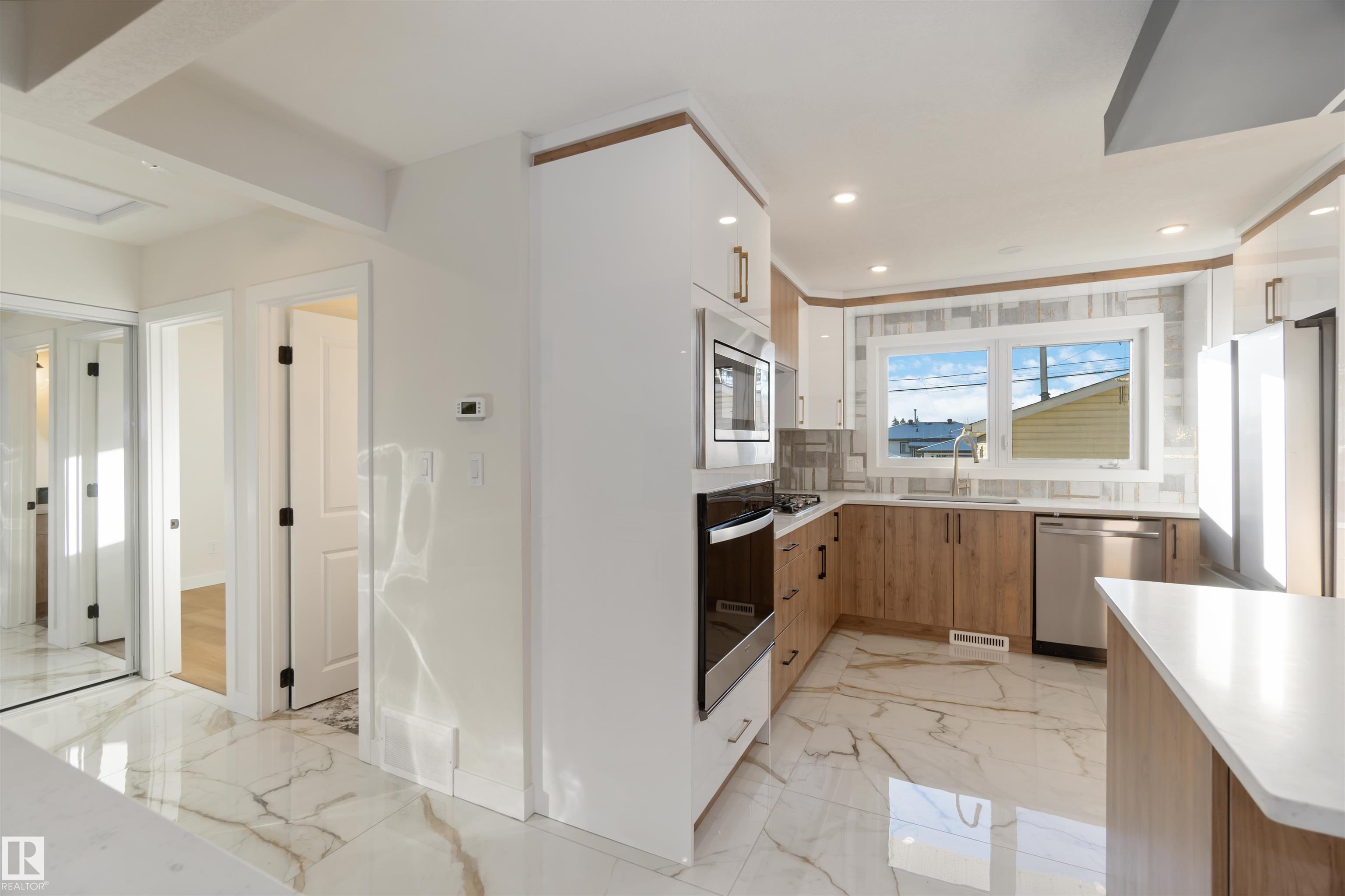 Discover this beautiful 5-bedroom bungalow in Belvedere, perfectly situated on a huge lot and close to Londonderry Mall, Costco, the LRT, and the Anthony Henday. This FULLY RENOVATED, turn key home offers exceptional convenience with NEW ROOF, NEW WINDOWS, NEW FURNACE, NEW ON DEMAND HOT WATER and a separate entrance with basement access. The main floor features an inviting open-concept design with brand NEW APPLIANCES, a kitchen island, cozy fireplace, laundry, wet bar, and three bedrooms. The primary bedroom comes complete with a walk-in closet and 4-piece ensuite. The fully finished basement adds incredible versatility with two additional bedrooms, a SECOND KITCHEN, laundry, and a large living/family room area. Outside, enjoy a FULLY FENCED, landscaped yard with an OVERSIZED, HEATED double detached garage that comfortably accommodates two vehicles with extra storage space. Close to amenities, shopping, schools, and major roadways, this property combines comfort, functionality, and a prime location.