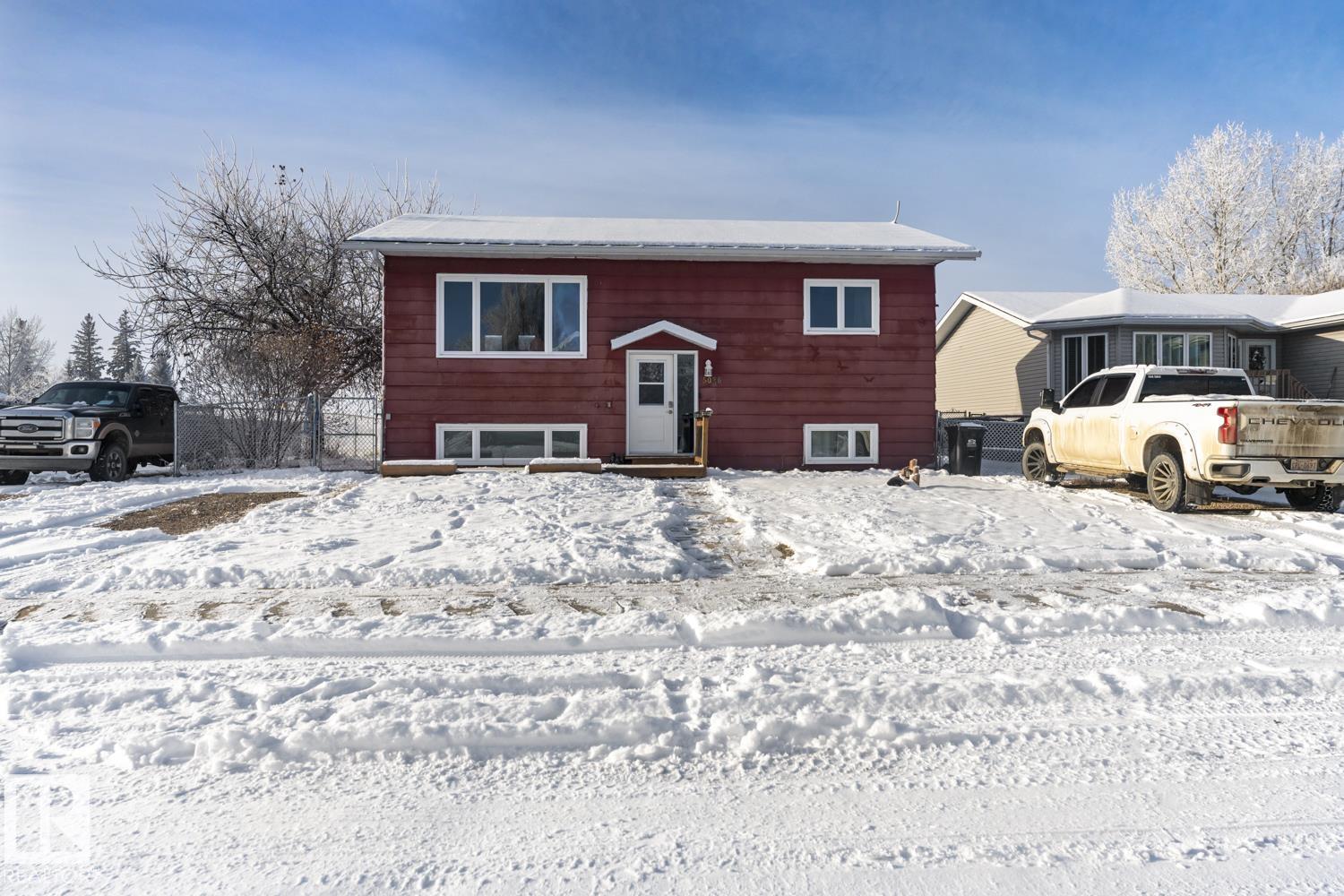 Ideal low cost home with garage in Fort Kent! Perfect family location backing onto park with covered picnic area, soccer pitch & outdoor hockey rink! Enjoy small town living with this move in ready HOME! Tons of gravel parking in front + along side. Fully fenced! Home with updates over the years! Windows, some flooring, new carpet in an upstairs bedroom, light fixtures, trim, interior doors etc. Bathrooms have been updated! Main level livingroom with hardwood floors. Open dining and kitchen with refinished cabinets and new countertops! Dining area with access to the back deck. Down the hall is the main full bathroom and 2 bedrooms. Fully developed basement with a family room space (currently used as a bedroom) and bonus room (currently used as a walk in closet). There is also an additional den room in the basement (currently used as a bedroom but window style does not meet bedroom egress). PLUS an impressive 2nd bathroom with huge walk-in tiled shower! Laundry+storage room too. Ready for a new family!