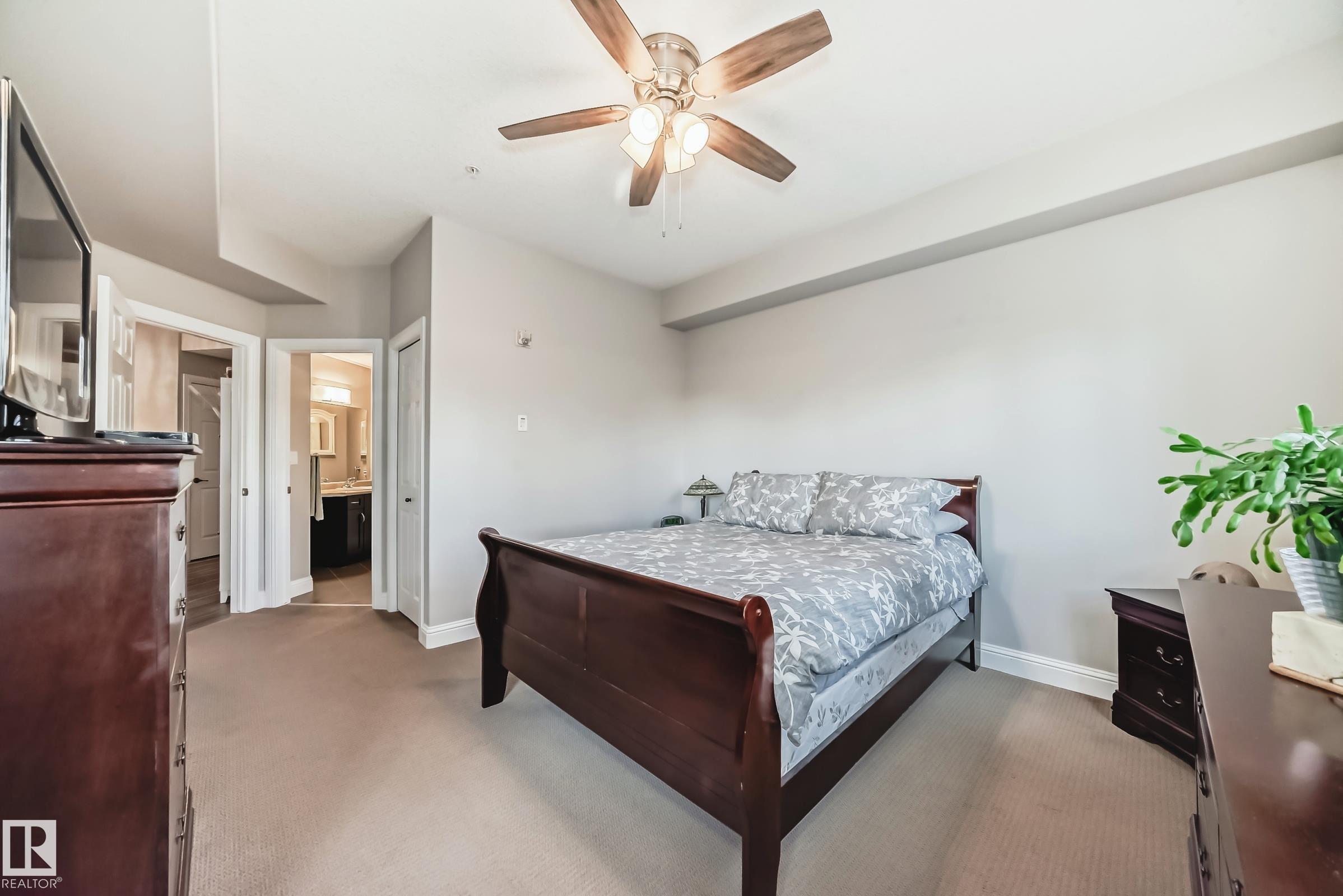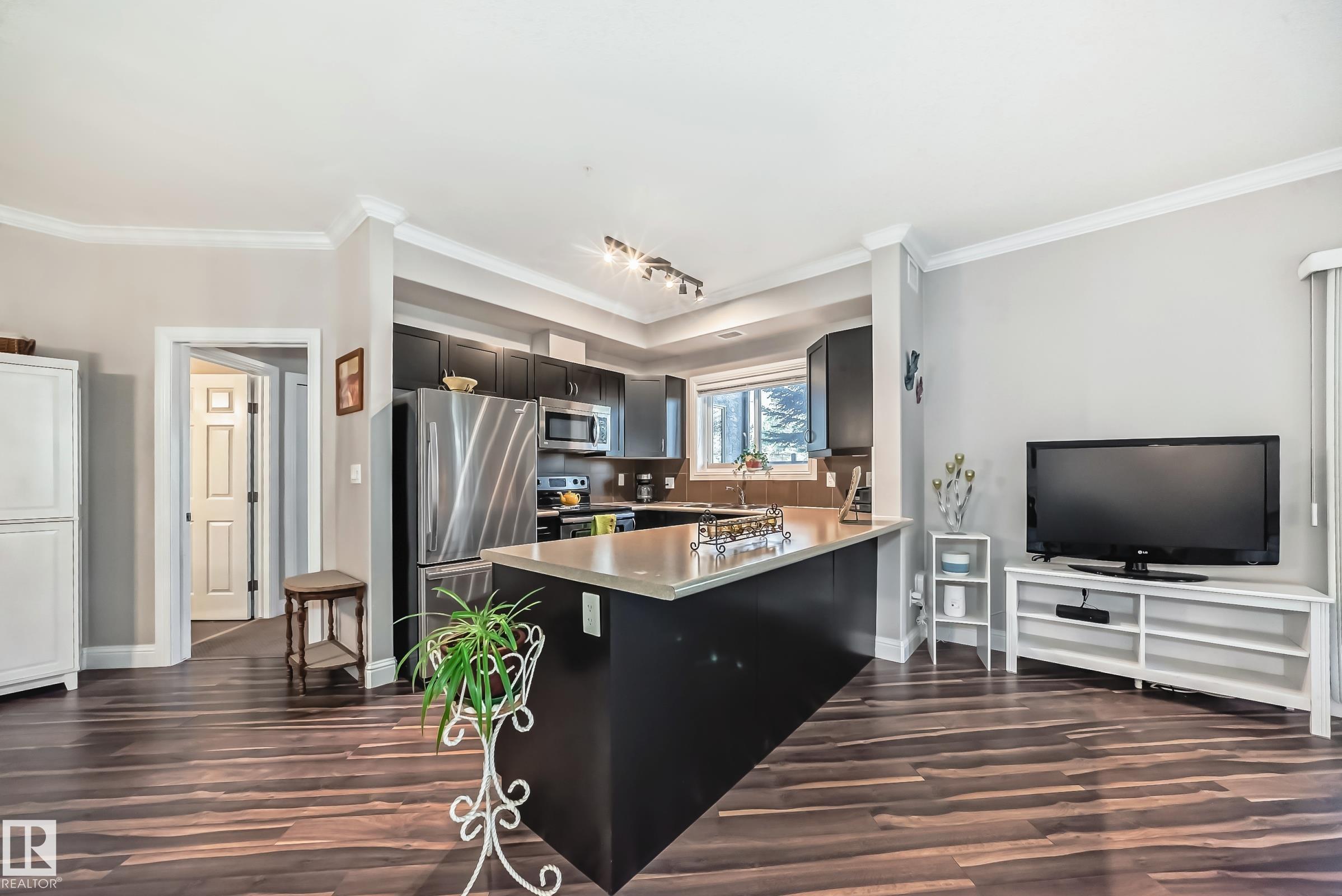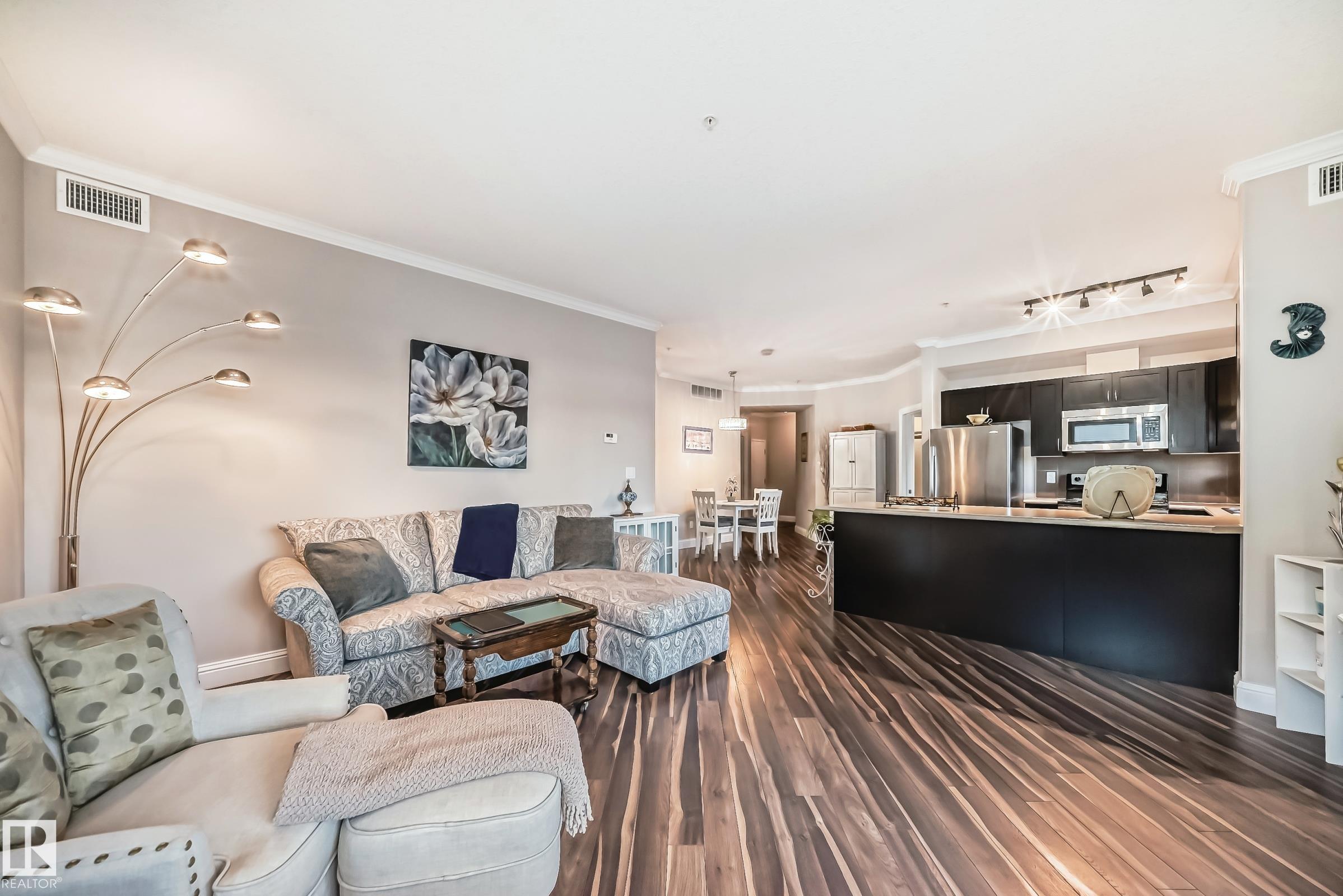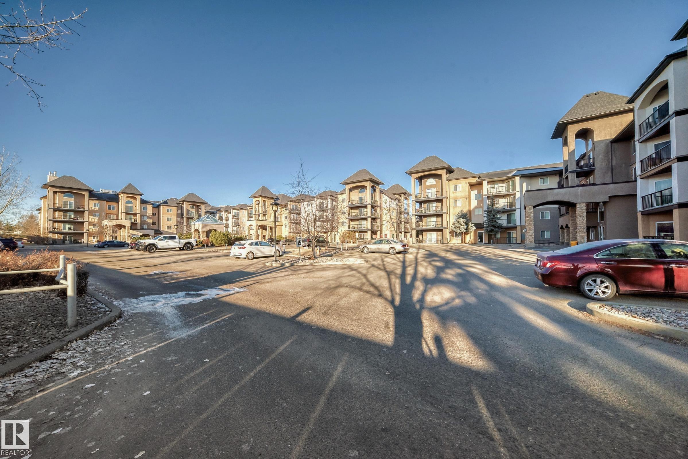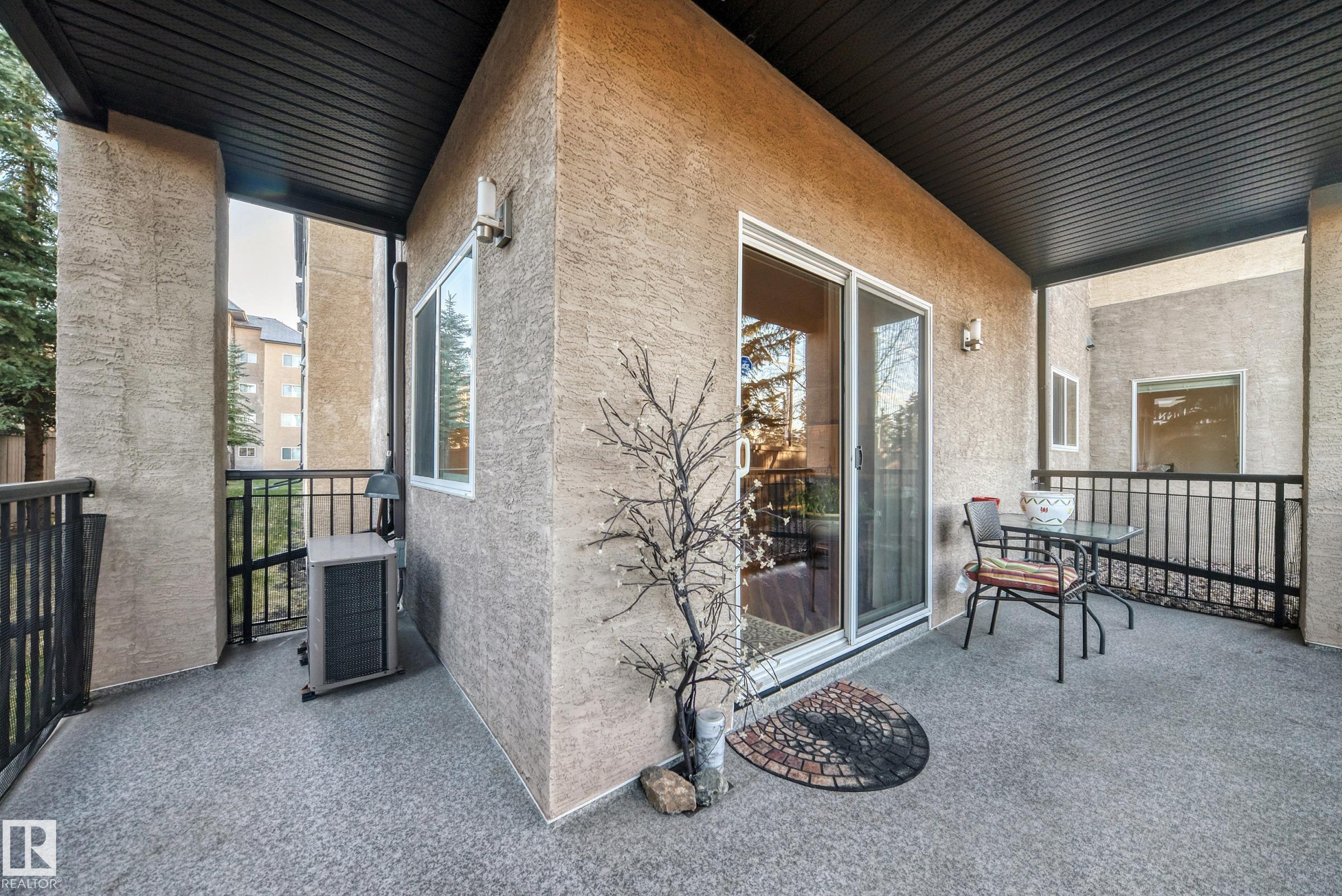 Condo living at its finest ! This beautiful, well-maintained corner unit is located in the heart of Baranow featuring , air conditioning, over 1000 sq. ft. with 2 bedrooms and 2 bathrooms. Open concept living with plenty of natural sunlight. Spacious living area with laminate flooring, large windows and a west facing patio. Kitchen is designed for convenience, offering abundant cabinetry and a fantastic island-perfect for entertaining. The primary bedroom features a spacious walk in closet and a private 4 piece ensuite. A generous second bedroom sits adjacent to the shared 3 piece guest bathroom. This unit also includes in-suite laundry with additional storage. Large wrap around private patio is complete with a gas line- for those special barbecue evenings with family and friends. This unit includes titled parking, underground as well a storage cage. Ideally located close to Anthony Henday, dining, shopping, schools and much more. This home truly offers comfort, convenience and exceptional value !!