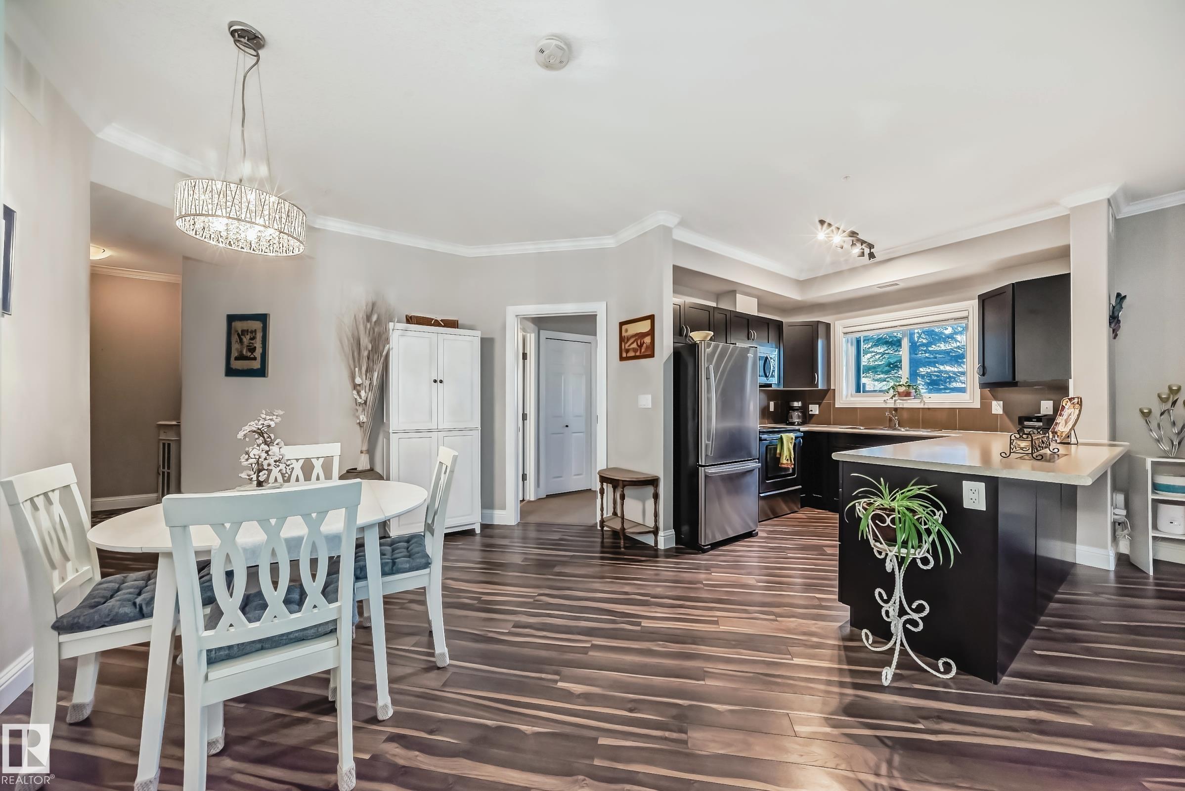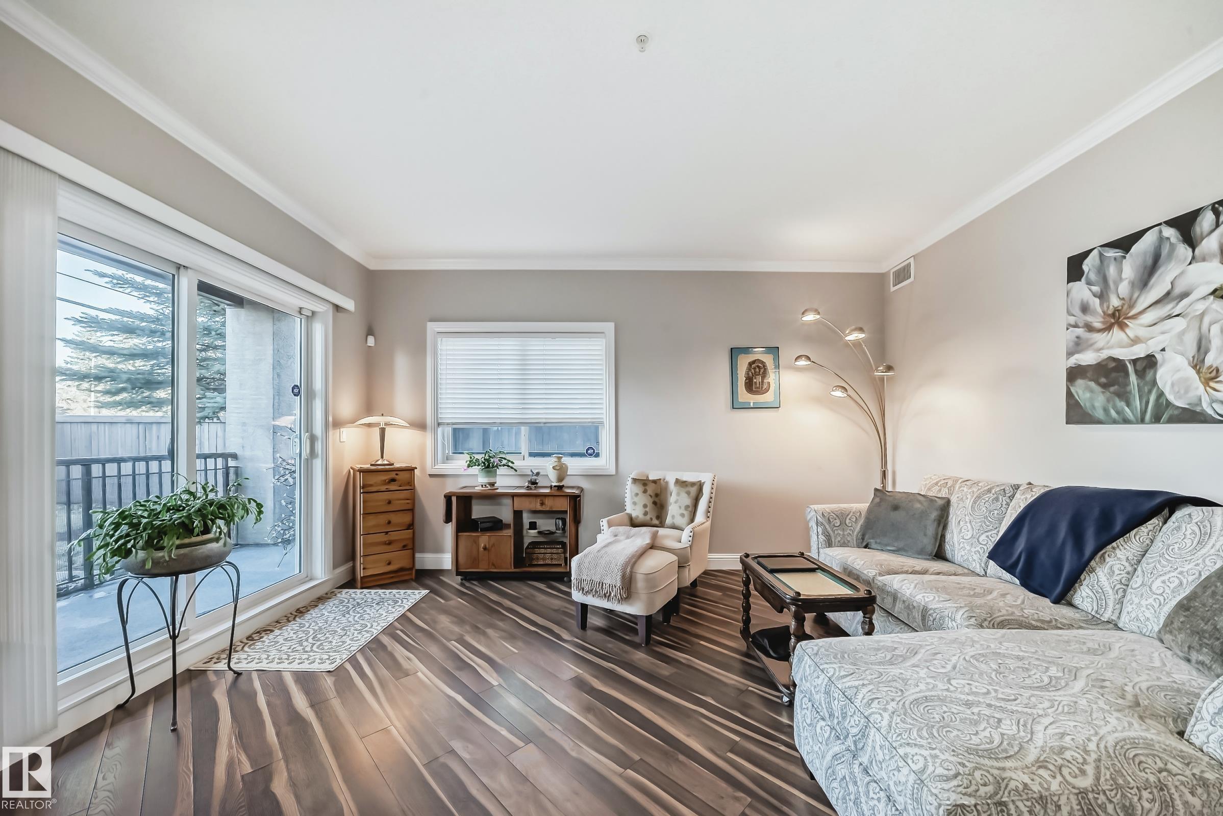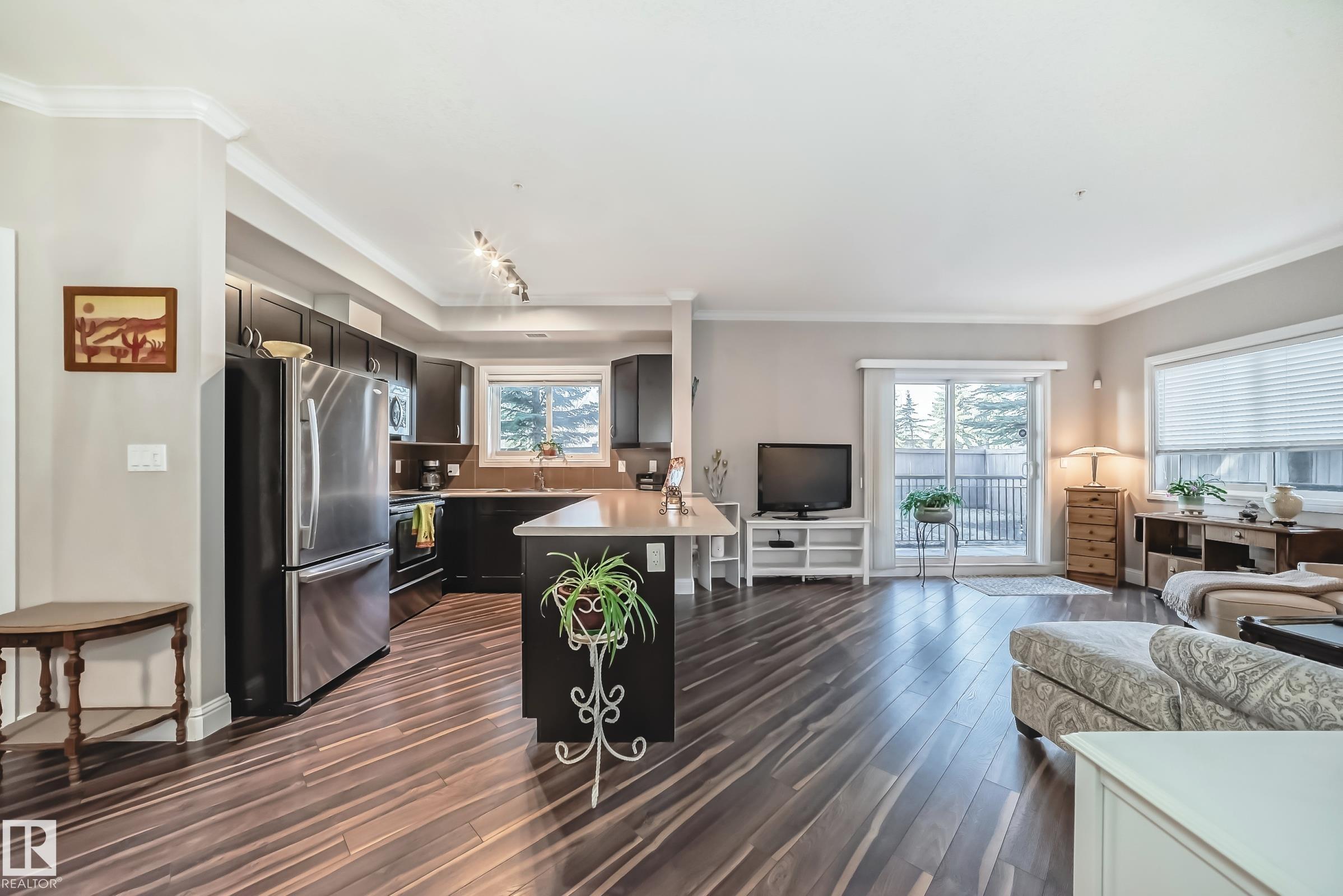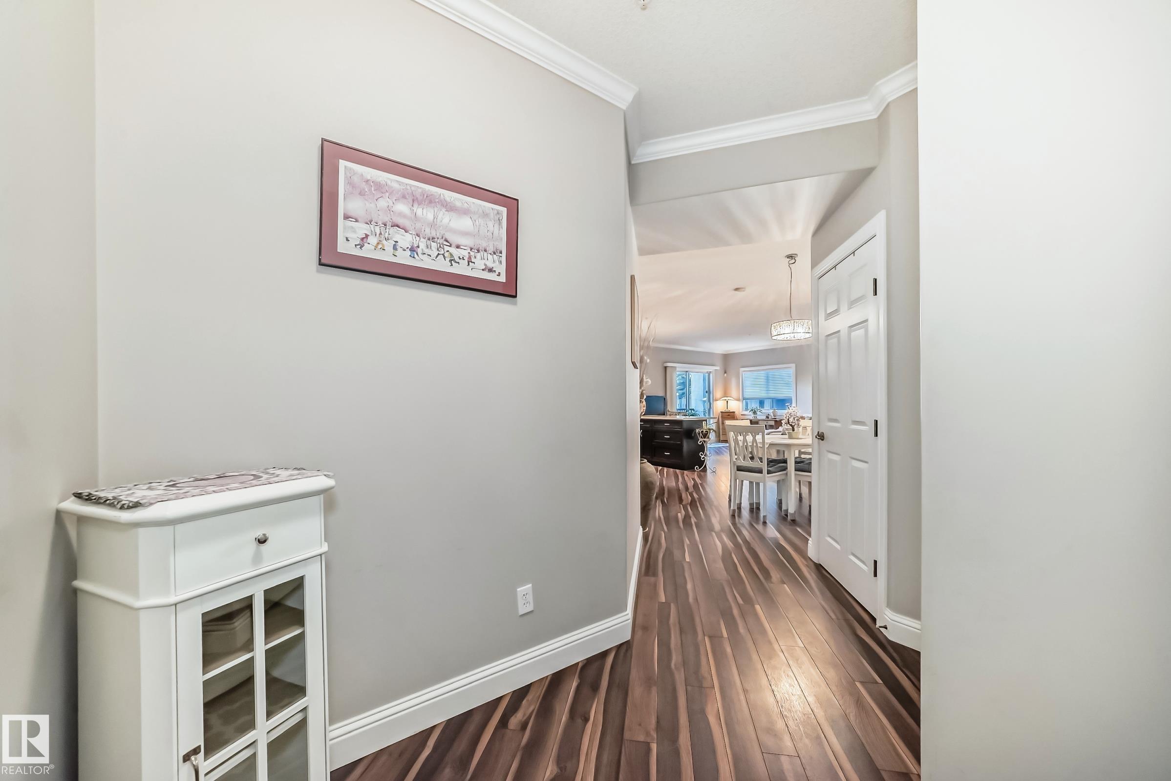 Condo living at its finest ! This beautiful, well-maintained corner unit is located in the heart of Baranow featuring , air conditioning, over 1000 sq. ft. with 2 bedrooms and 2 bathrooms. Open concept living with plenty of natural sunlight. Spacious living area with laminate flooring, large windows and a west facing patio. Kitchen is designed for convenience, offering abundant cabinetry and a fantastic island-perfect for entertaining. The primary bedroom features a spacious walk in closet and a private 4 piece ensuite. A generous second bedroom sits adjacent to the shared 3 piece guest bathroom. This unit also includes in-suite laundry with additional storage. Large wrap around private patio is complete with a gas line- for those special barbecue evenings with family and friends. This unit includes titled parking, underground as well a storage cage. Ideally located close to Anthony Henday, dining, shopping, schools and much more. This home truly offers comfort, convenience and exceptional value !!