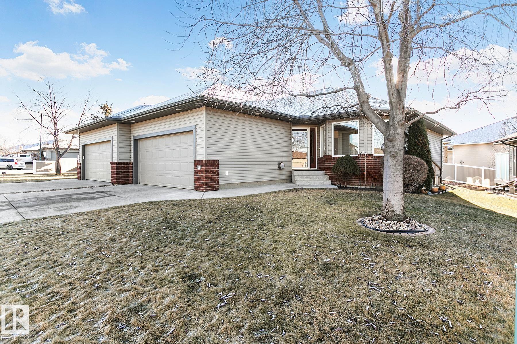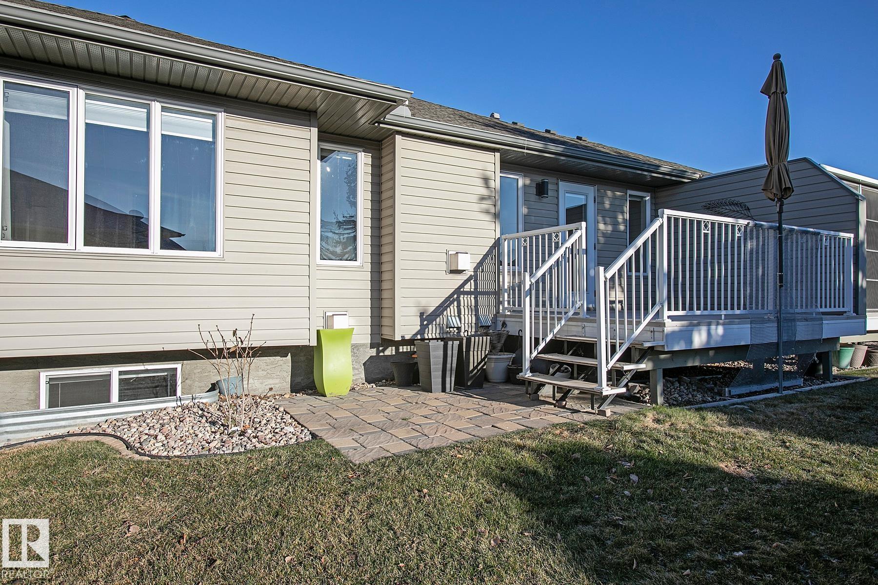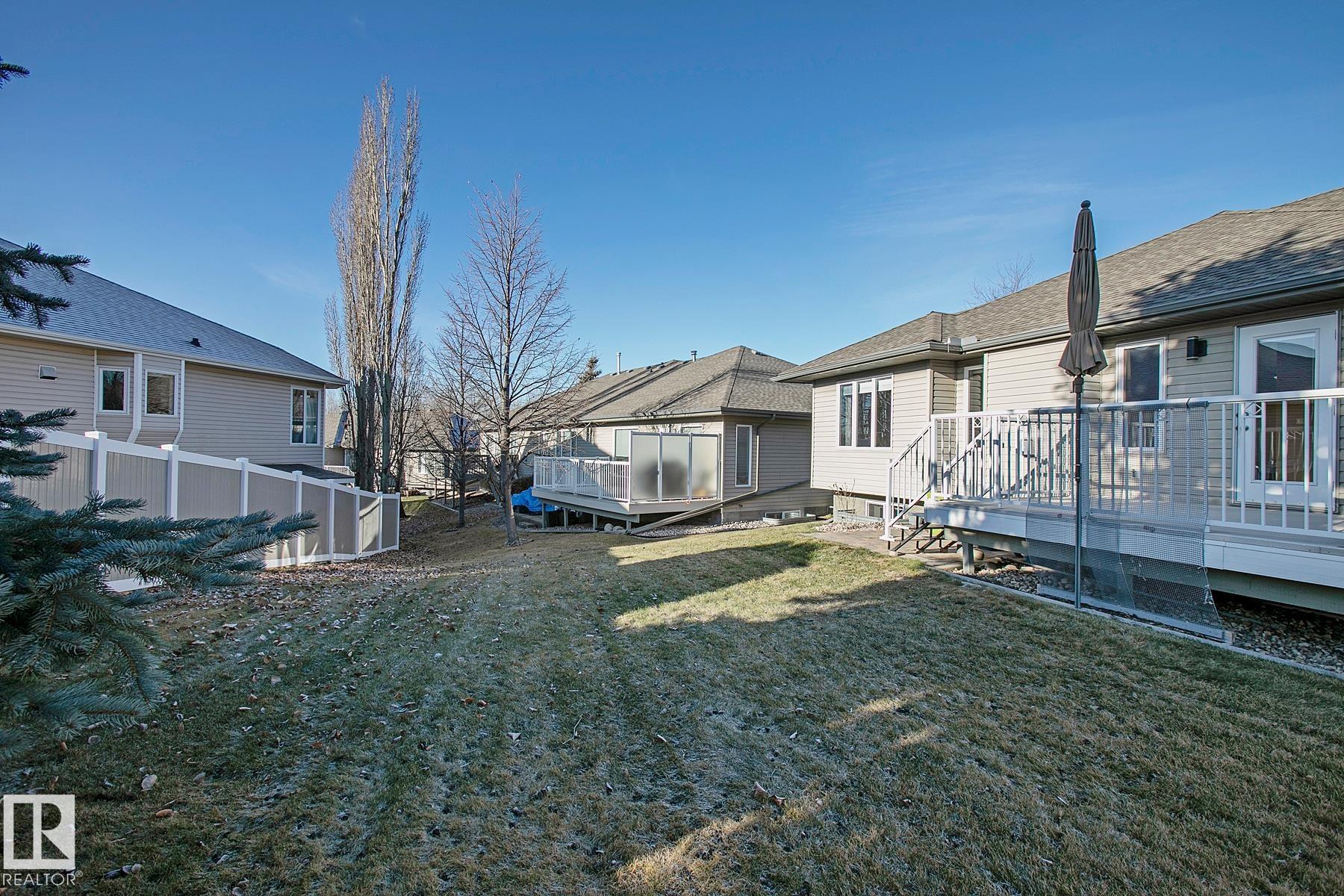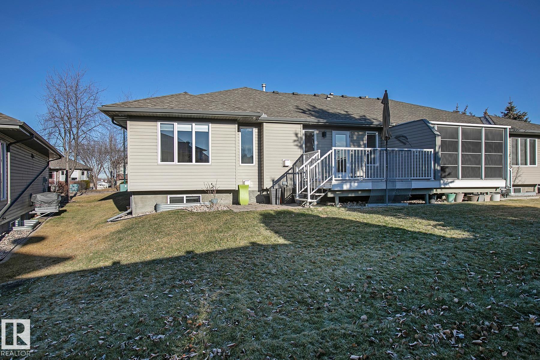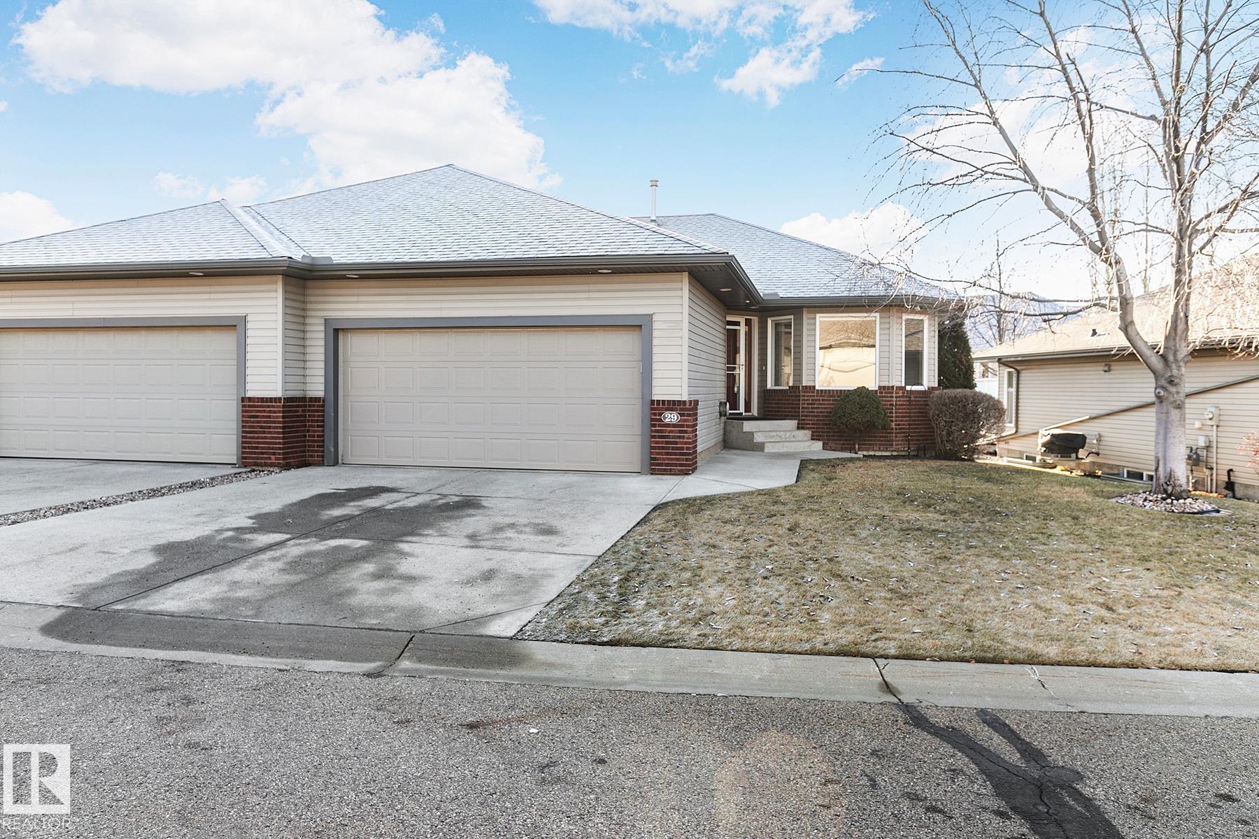 RARE FIND! Executive Adult (45+) living in Charlton Greens. Don't miss out on viewing this well maintained original owner 1,162 sq.ft 1/2 duplex bungalow design. Main floor features include vaulted ceilings & birch hardwood flooring; hickory kitchen cabinets, quartz countertops & glass tiled backsplash, corner pantry, stainless appliances, and an adjoining dinette area; spacious den/ office; 3pc. bath; main floor laundry closet; and primary bedroom w/ laminate flooring, walk-in closet and full 4pc. bath. The fully developed lower level is complete with family room & gas fireplace; 2 additional bedrooms; full 4pc. bath; optional laundry room and an extra storage area. Exterior amenities offer a double attached garage w/ heat & water; maintenance free south exposure deck w/ gas BBQ outlet; lawn & flower bed sprinkler system...and the list goes on. All this is conveniently located in a quiet residential neighbourhood adjacent to Clover Bar Ranch Park, and within a short commute to all local amenities.