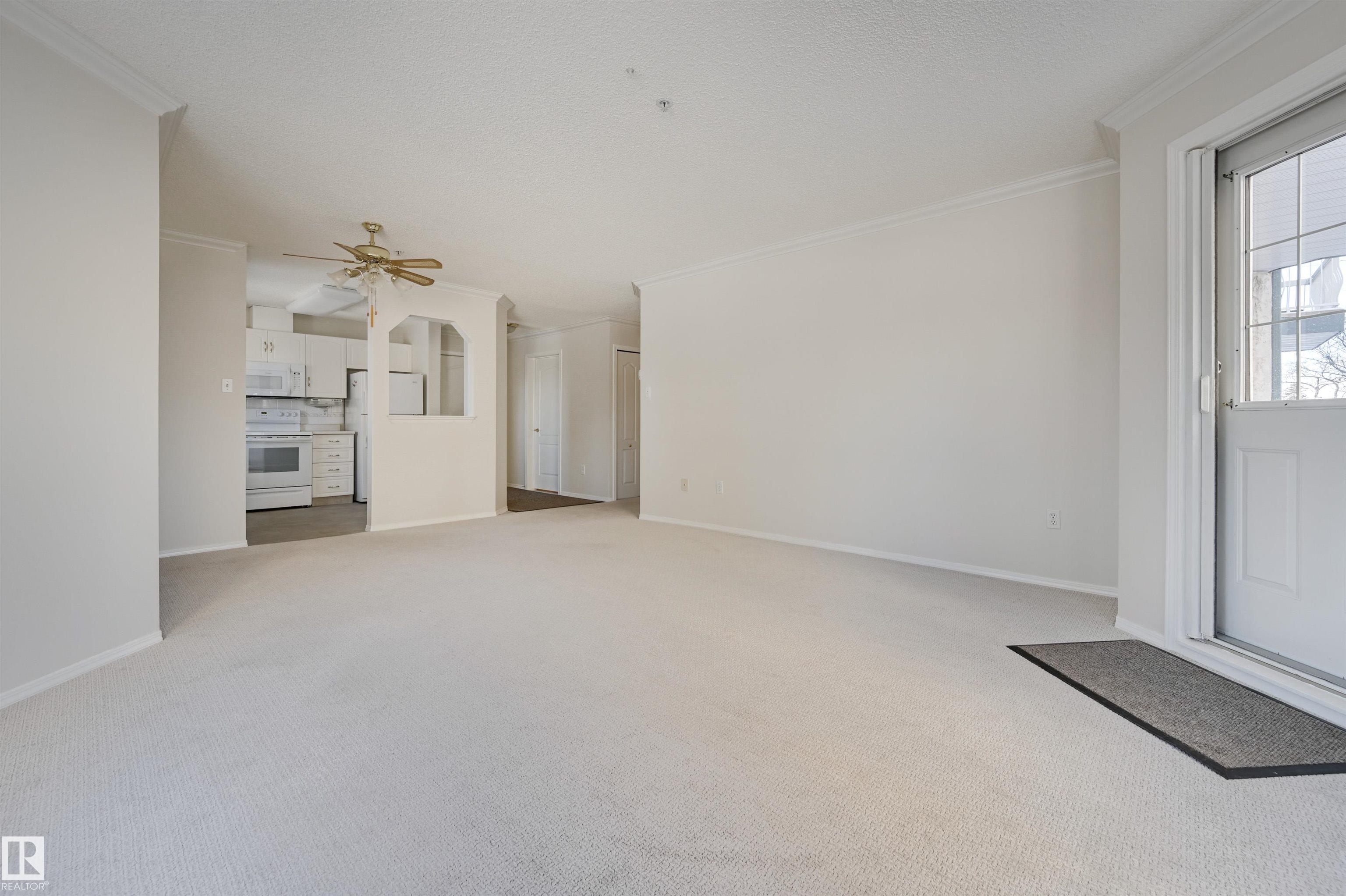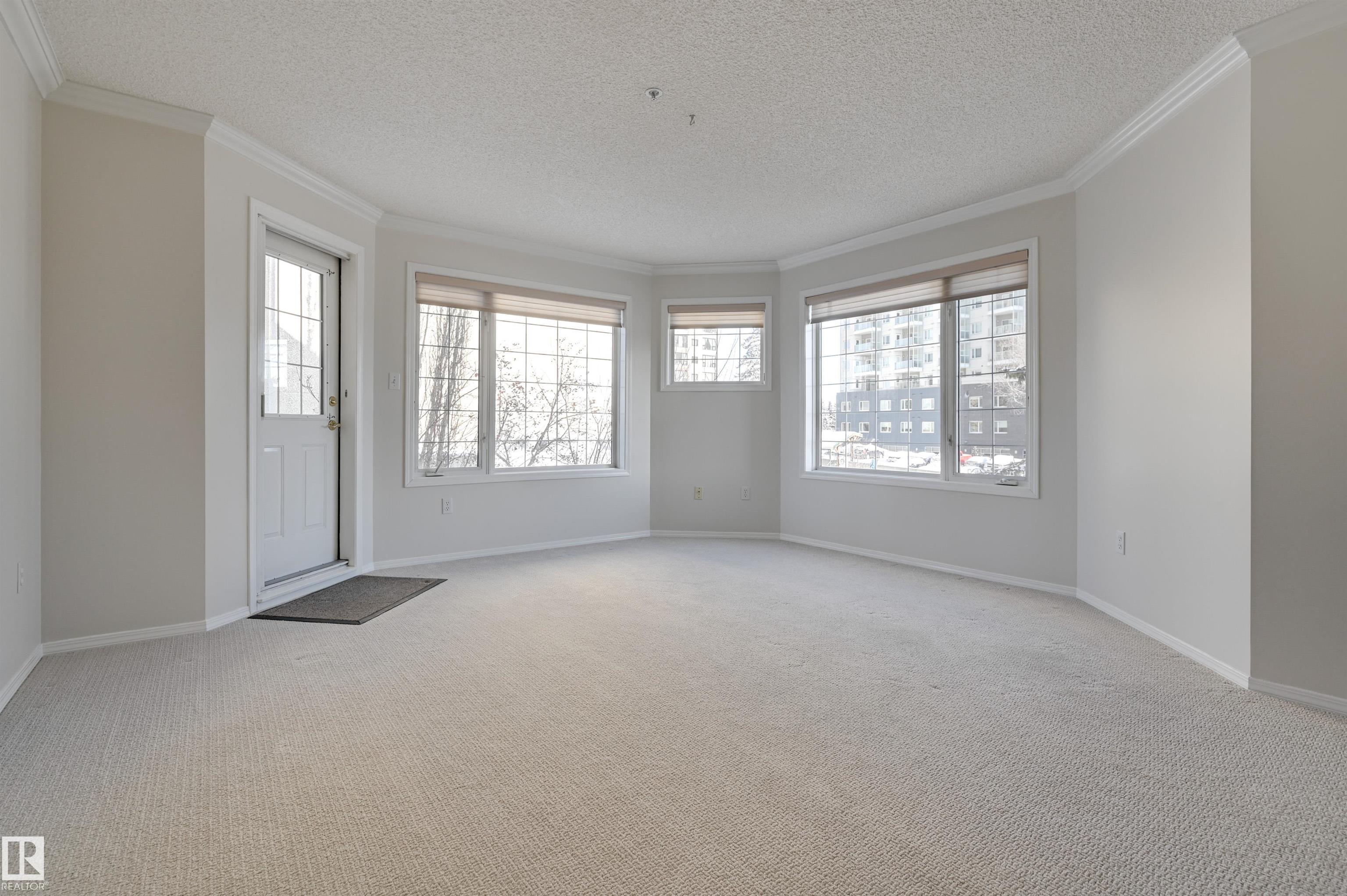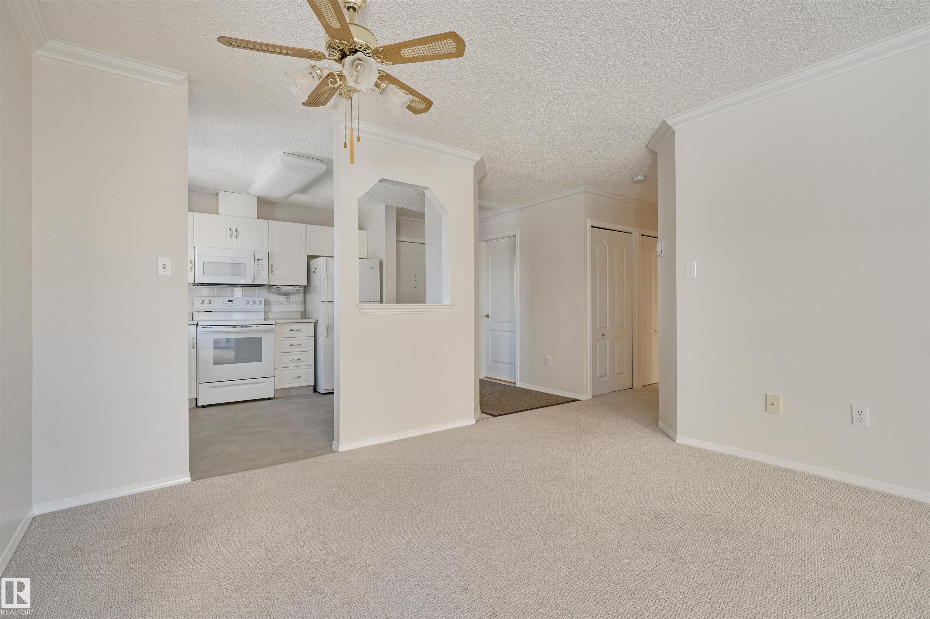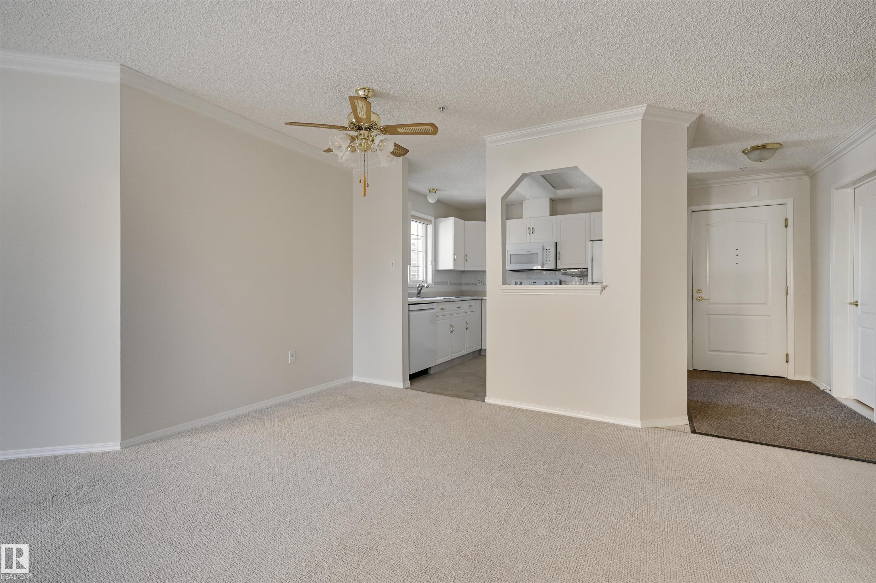 Welcome to Californian Manor, a welcoming 50+ community known for its friendly atmosphere and unbeatable walkability to everyday amenities. This well-maintained corner suite is filled with natural light from its ample windows. Two generously sized bedrooms and two full bathrooms. The bright, open living area features dual bay windows, open to the dining room, and access to the large balcony. The kitchen is functional with white cabinetry, white appliances including a newer stove and dishwasher, a breakfast bar, and a picture window over the sink. Enjoy the in-suite laundry and storage, plus a storage locker at the parking stall #63 underground. Recent upgrades include newer flooring and fresh paint, leaving the condo in exceptional, move-in-ready condition. Amenities include a fitness room, party room, library/craft room, and car wash bay. With bus service at the door, the library next door, and Westmount Shopping Centre with Safeway just across the street, this is an ideal place to move in and enjoy!