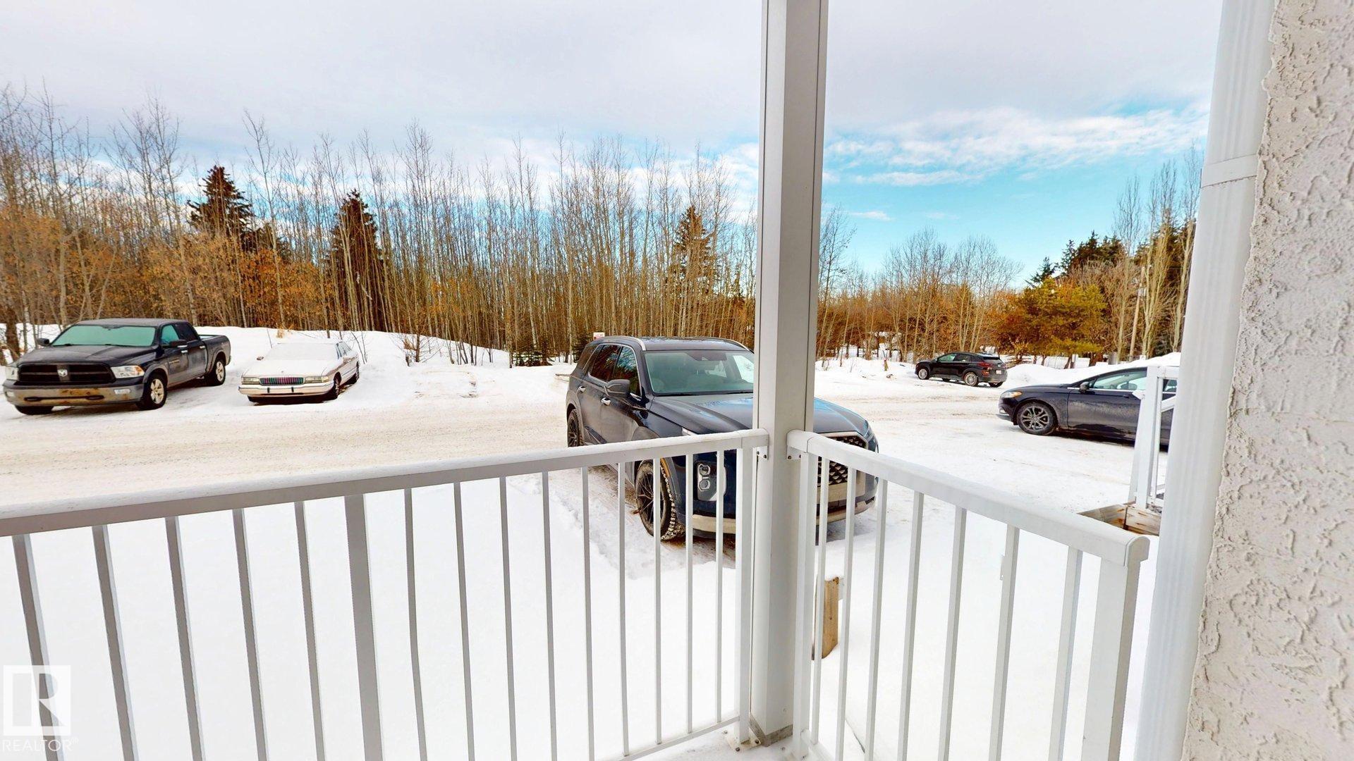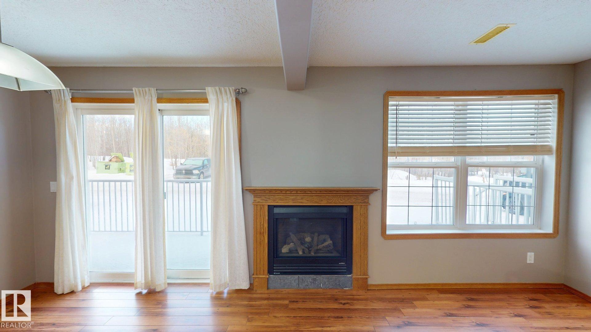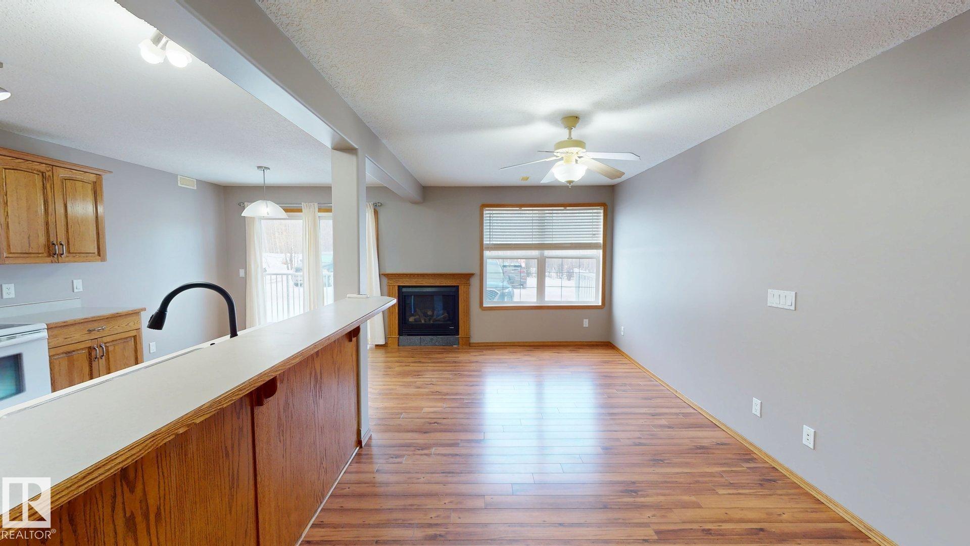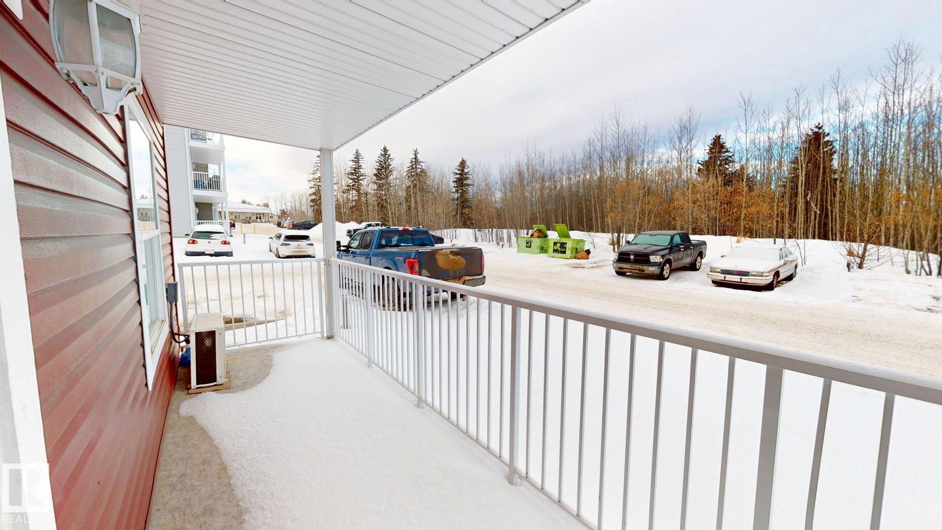 Main floor unit in Rivers condo! Looking for a low maintenance lifestyle with easy access? This is a fantastic opportunity with no stairs and an energized parking stall right outside the door! Inside has been freshly painted and features a bright and spacious floor plan, with 2 bedrooms and a 4 piece bathroom. The kitchen provides an abundance of cabinetry and counter space and over looks the living room that has a natural gas fireplace to keep you warm in the winter. Also off the kitchen are the patio doors leading to the covered deck. Rivers condo is in a great location right across from St. Anthony's school, and just a short walk to Frank Maddock and Powerhouse campus. There are miles of walking trails and is a short drive to all of Drayton Valley's amenities. Monthly condo fee of $559.57 includes exterior Maintenance, heat, parking, professional management, reserve fund contribution, utilities/janitorial/insurance for common areas, water/sewer, land/snow removal.