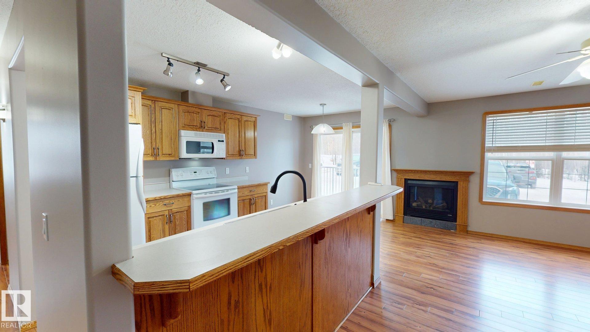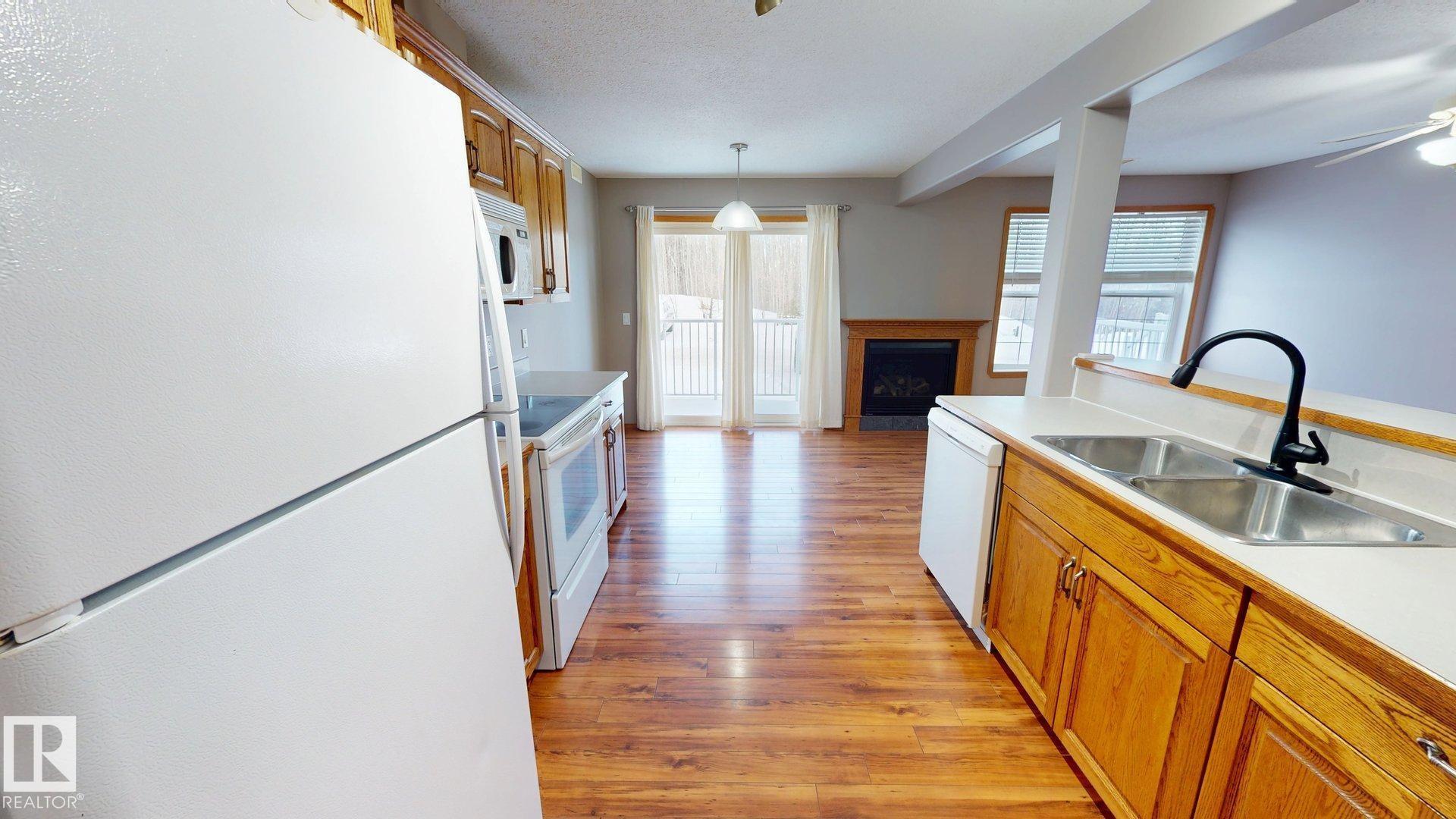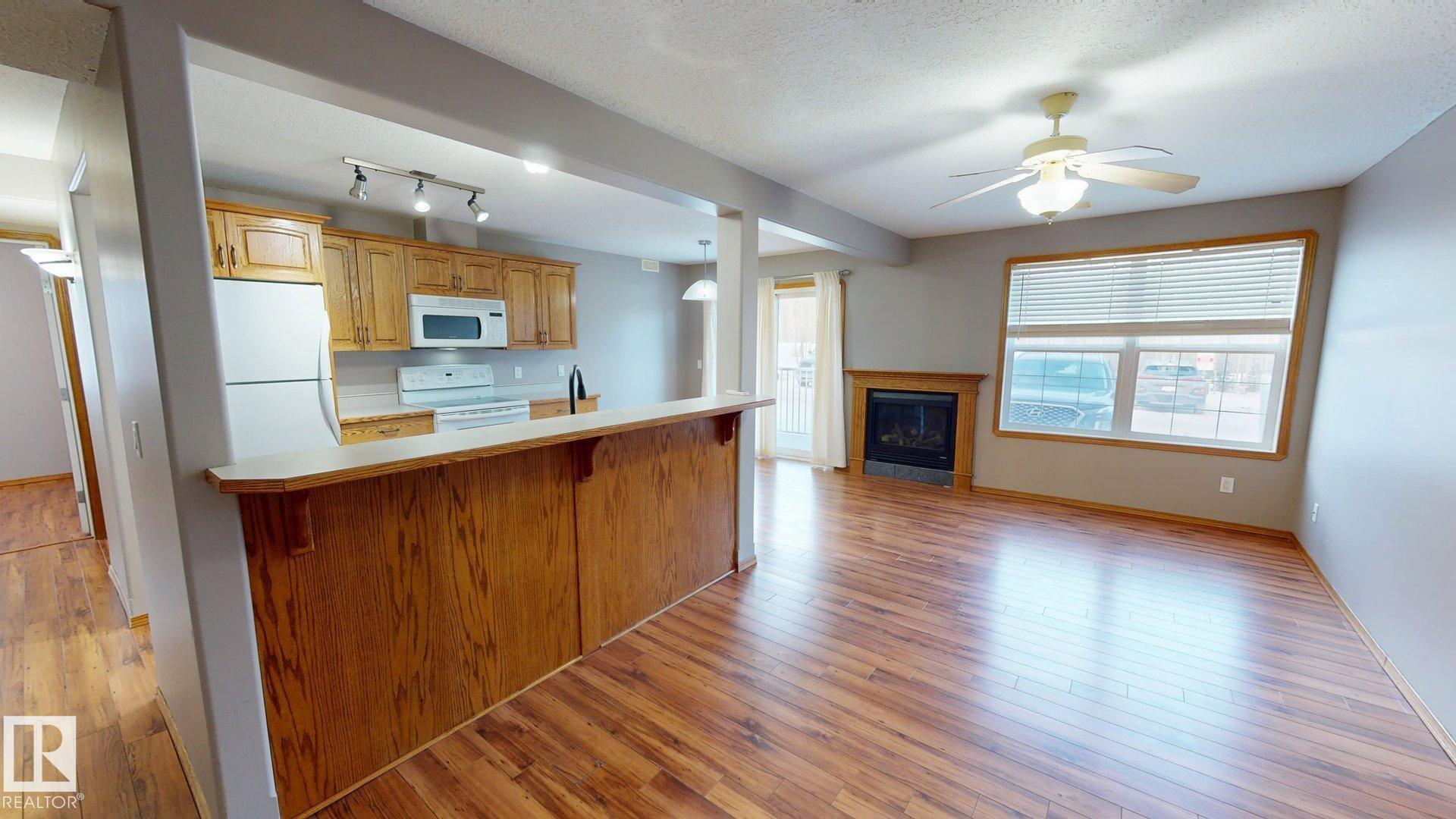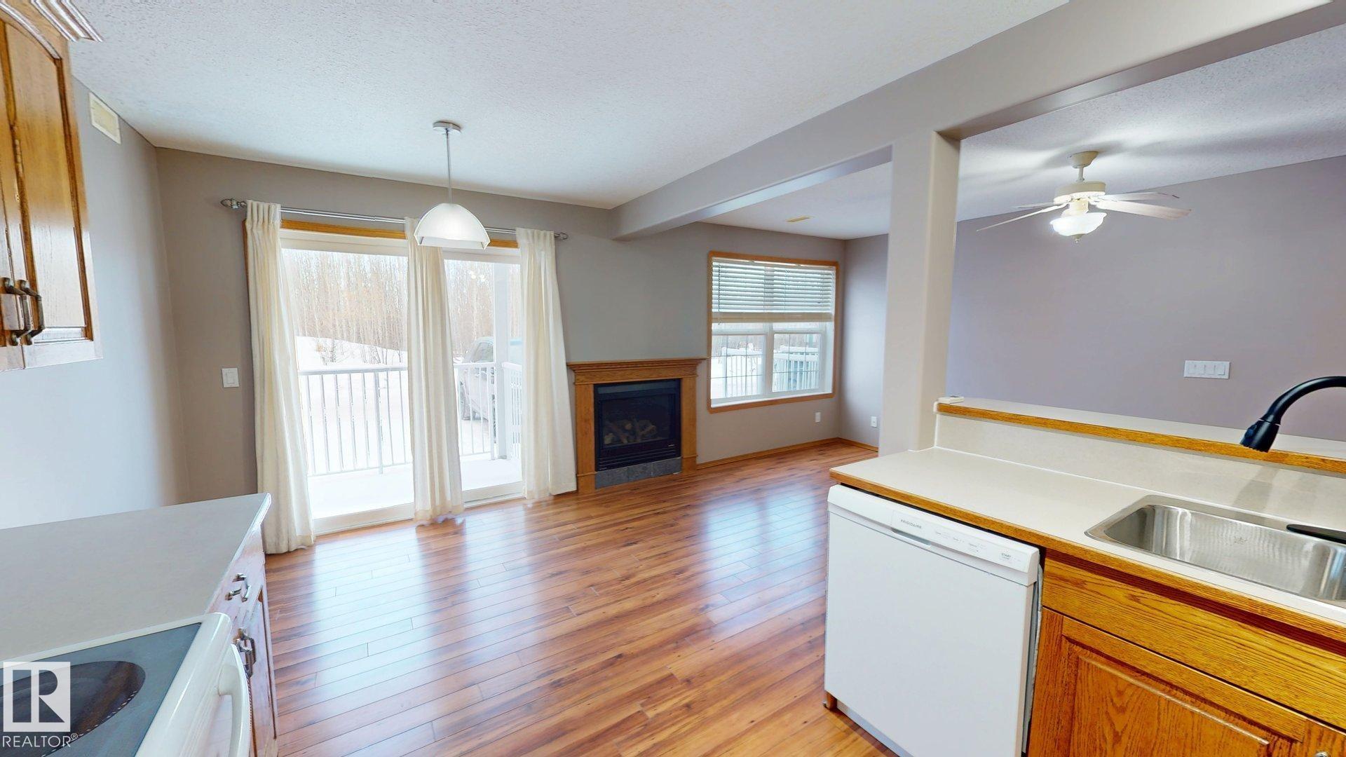 Main floor unit in Rivers condo! Looking for a low maintenance lifestyle with easy access? This is a fantastic opportunity with no stairs and an energized parking stall right outside the door! Inside has been freshly painted and features a bright and spacious floor plan, with 2 bedrooms and a 4 piece bathroom. The kitchen provides an abundance of cabinetry and counter space and over looks the living room that has a natural gas fireplace to keep you warm in the winter. Also off the kitchen are the patio doors leading to the covered deck. Rivers condo is in a great location right across from St. Anthony's school, and just a short walk to Frank Maddock and Powerhouse campus. There are miles of walking trails and is a short drive to all of Drayton Valley's amenities. Monthly condo fee of $559.57 includes exterior Maintenance, heat, parking, professional management, reserve fund contribution, utilities/janitorial/insurance for common areas, water/sewer, land/snow removal.