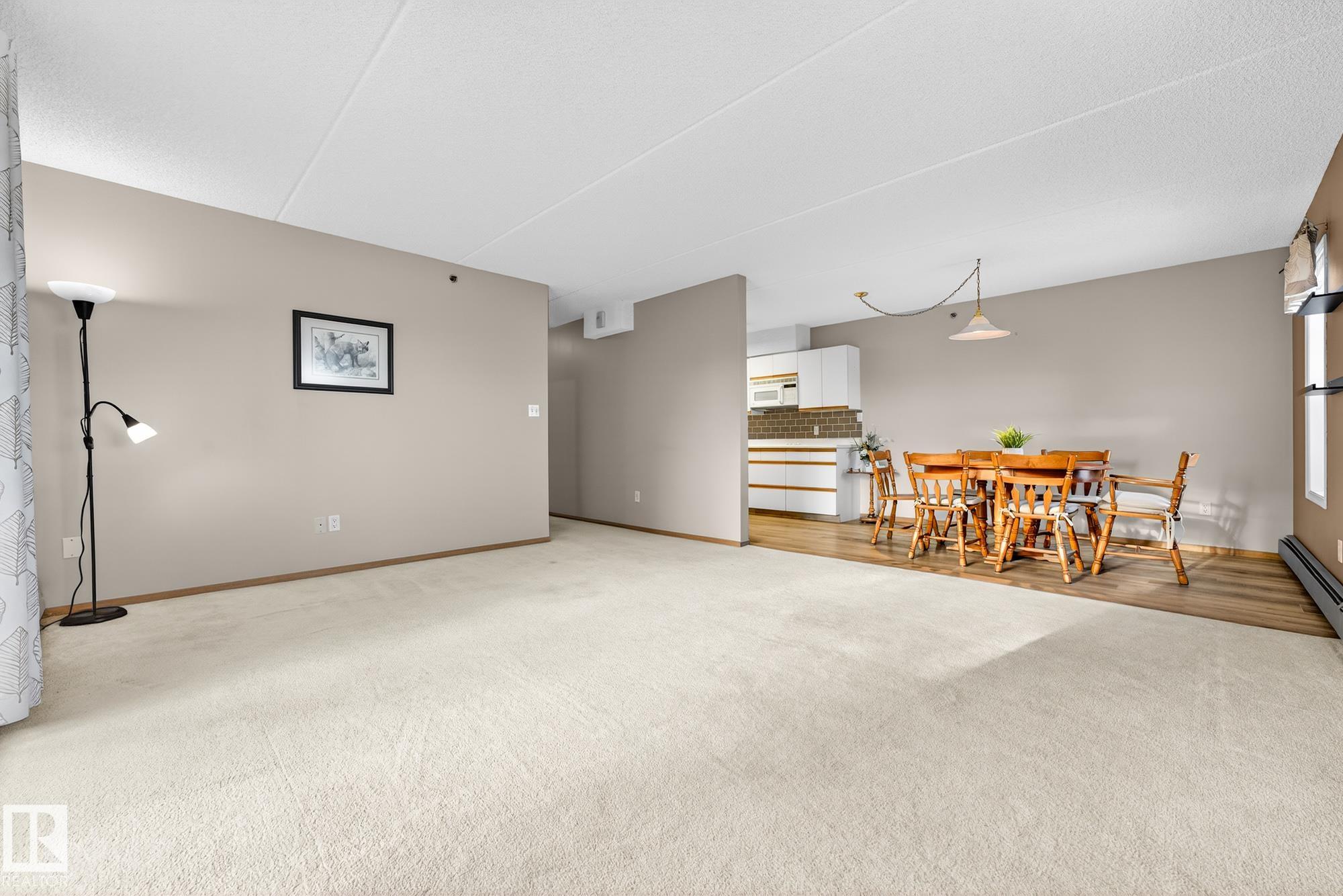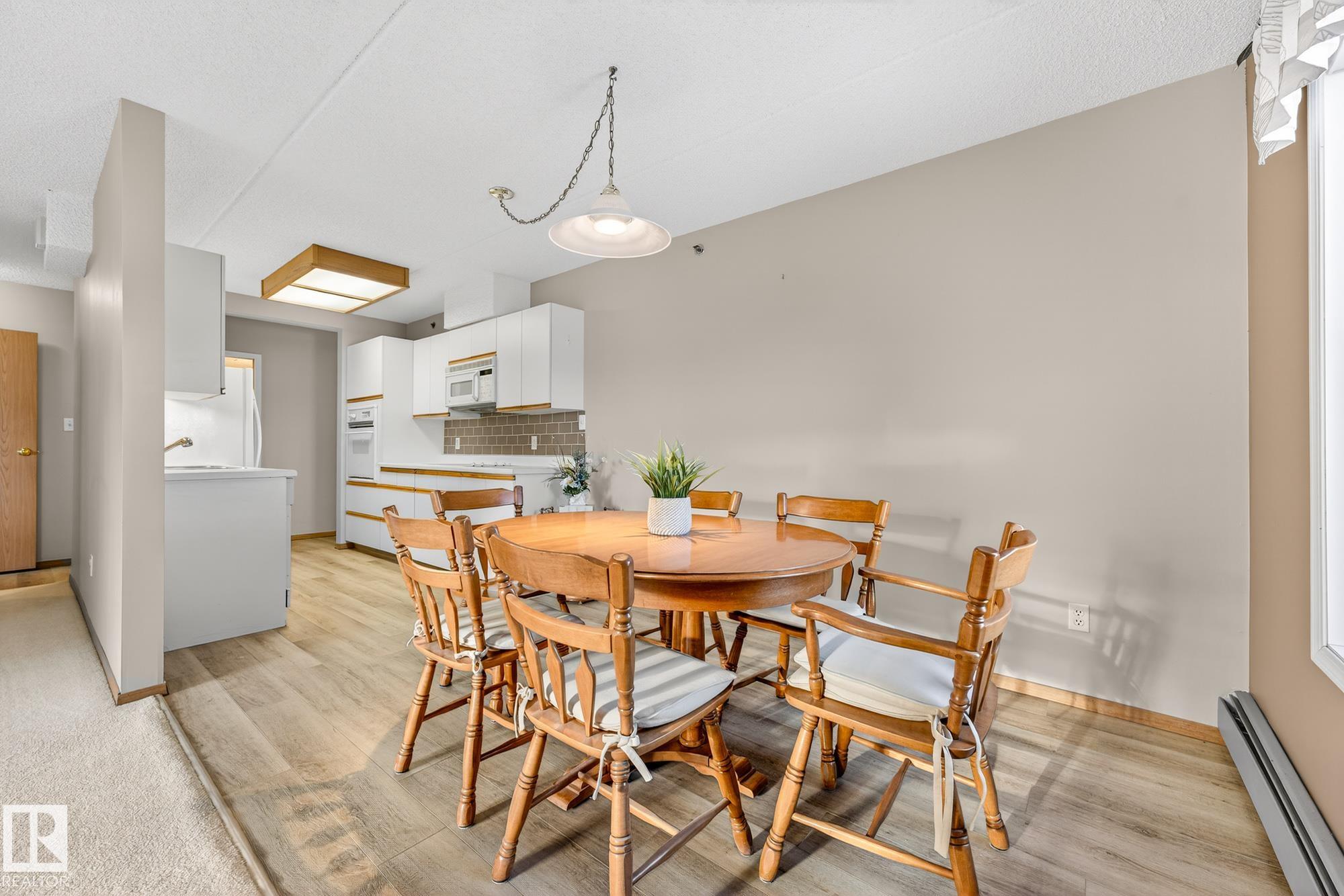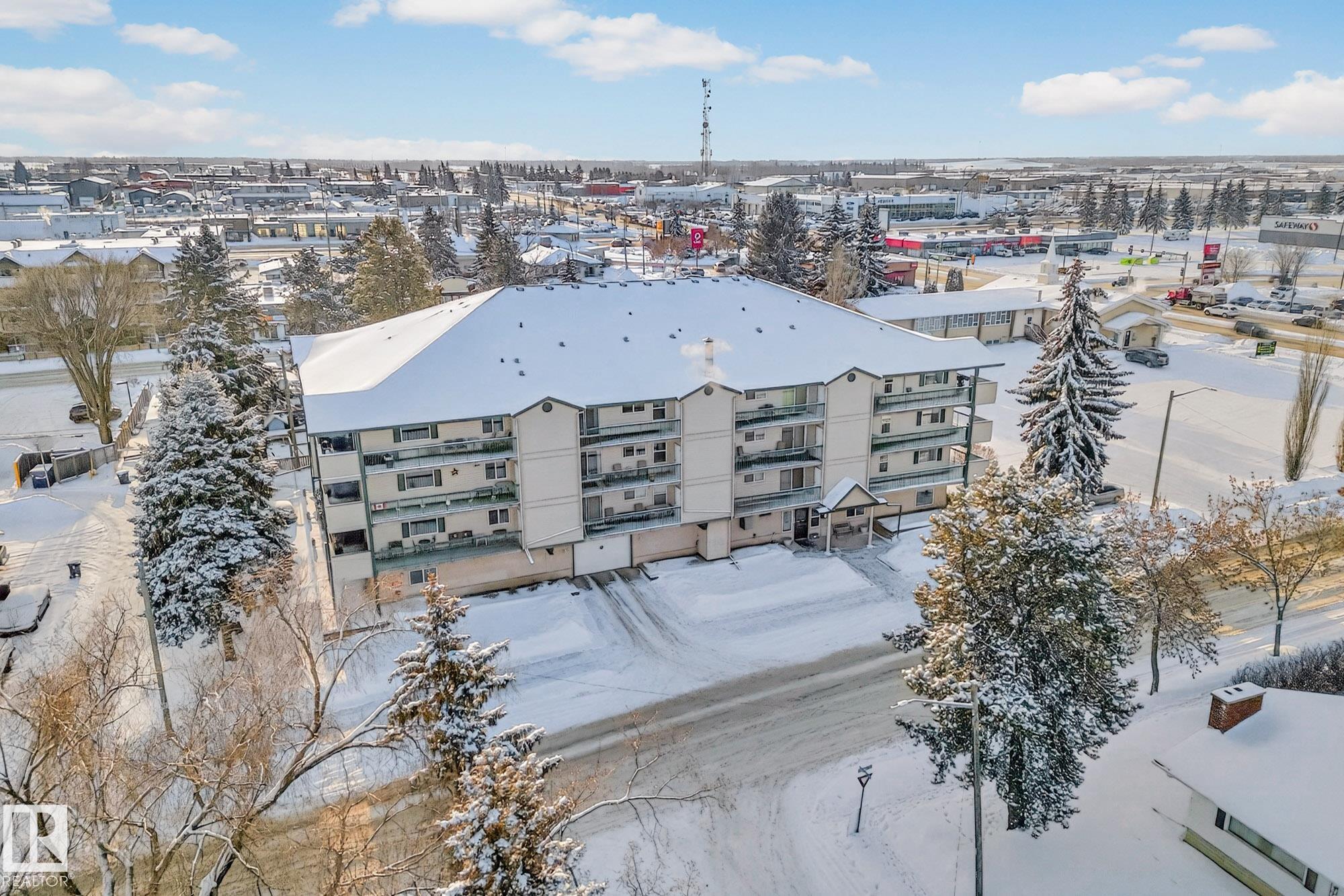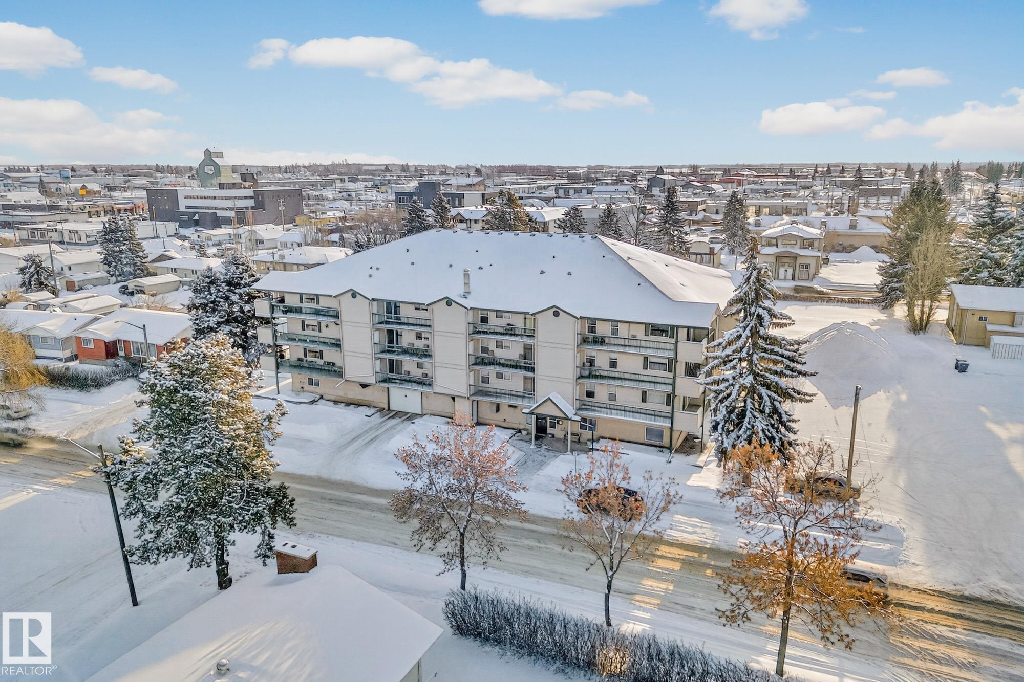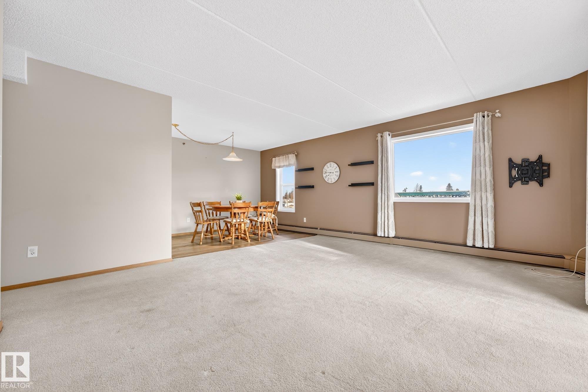 Spacious and well-appointed **corner unit** in a **55+ building (no pets allowed)**. Located on the **third floor**, this **largest suite in the building** features a **large wrap-around balcony** plus an additional **storage room**. Enjoy the comfort of a **steel and concrete construction** with **elevator access**, **wider hallways for wheelchair accessibility**, and a quiet, well-maintained community. The suite offers **newer vinyl plank flooring**, **window coverings included**, **in-suite laundry with storage**, and **A/C**. The functional layout includes a **4-piece main bath** and a **3-piece ensuite with stand-up walk-in shower**. One **assigned parking stall** is included. Within walking distance of all amenities **Condo fees cover cable, heat, water, and sewer**, providing excellent value. The **self-regulated condo board** is made up of resident owners with a strong vested interest in the building. A rare opportunity to own a bright, accessible, and move-in-ready home in a well-run community.