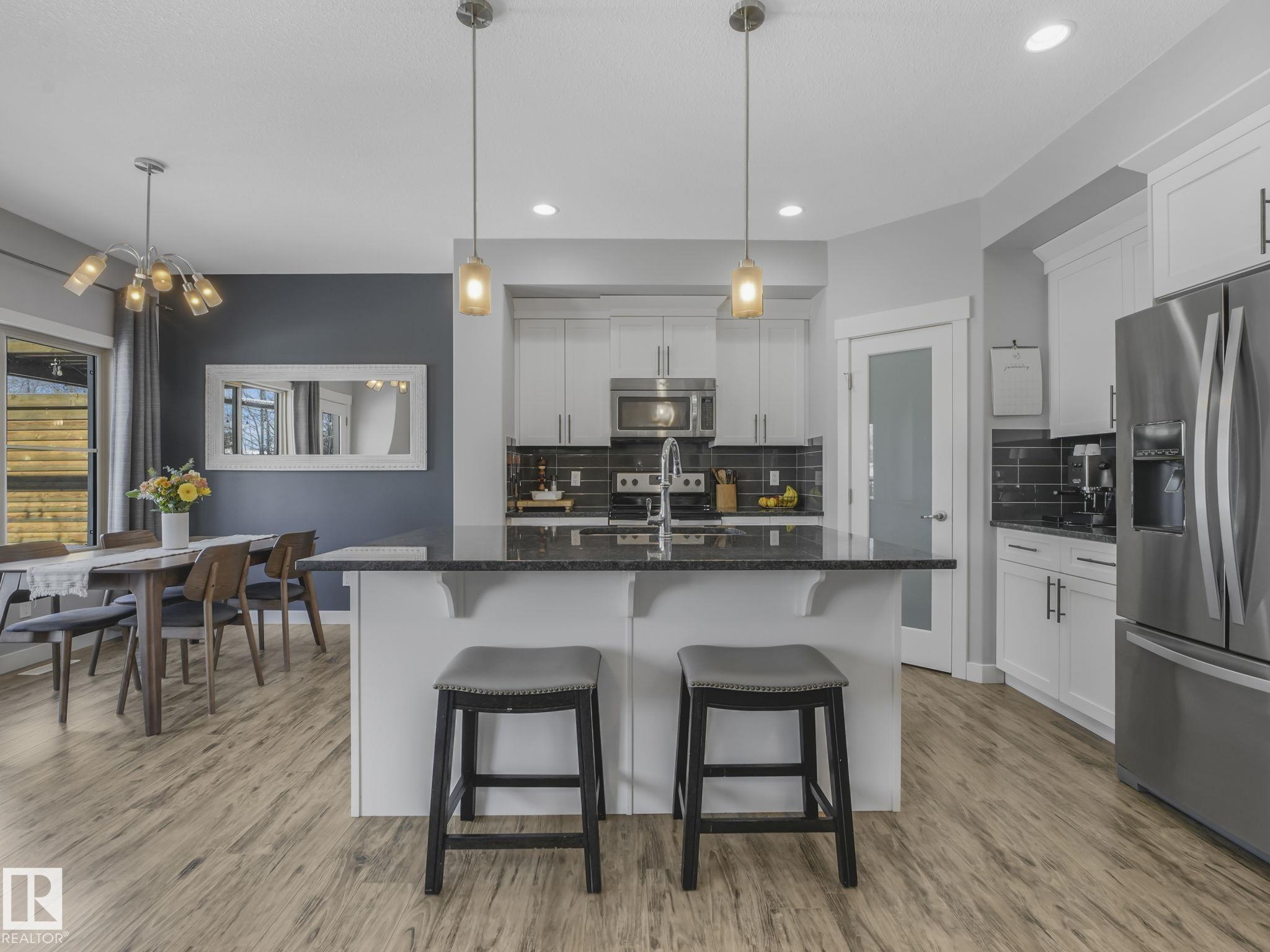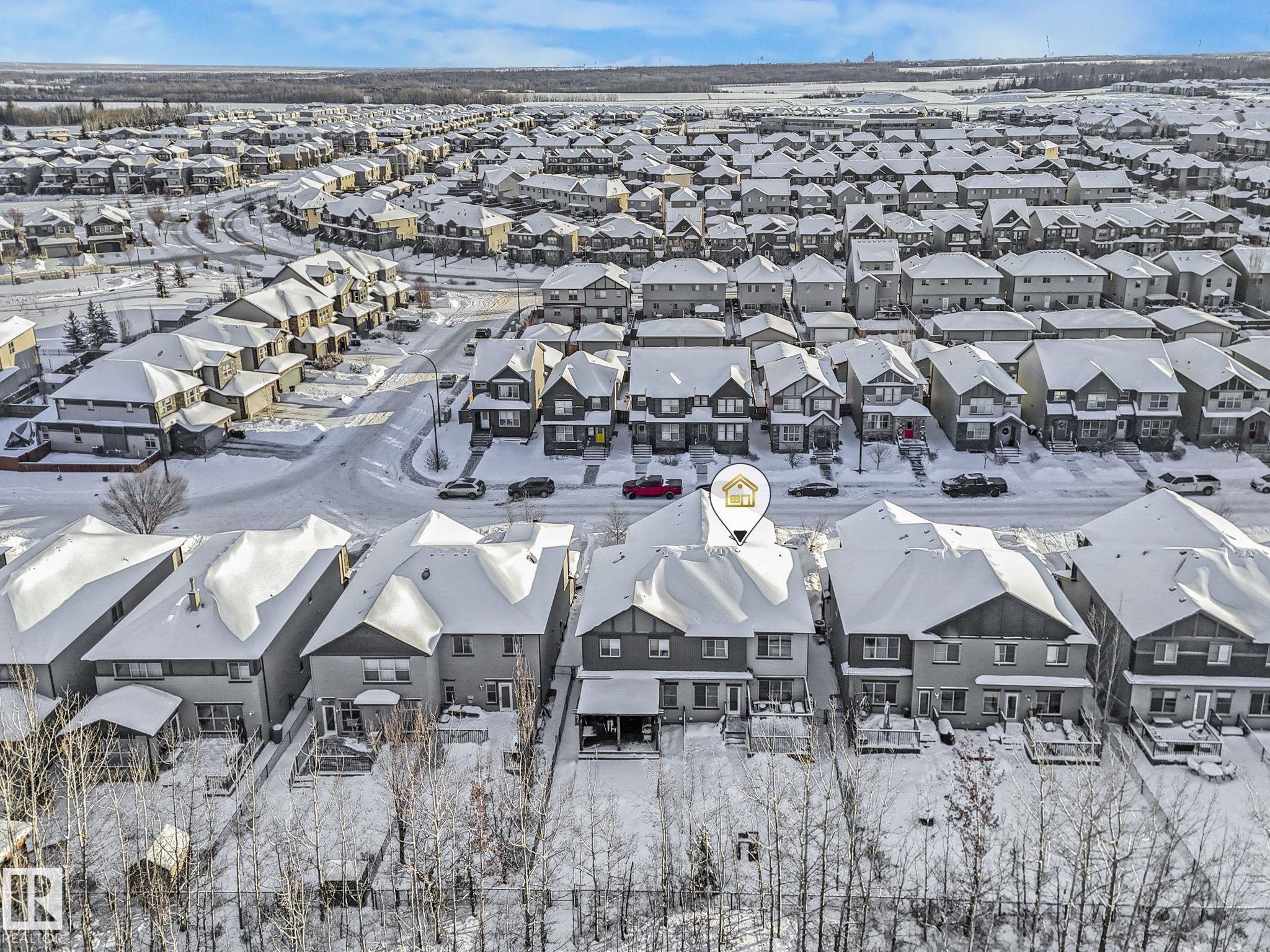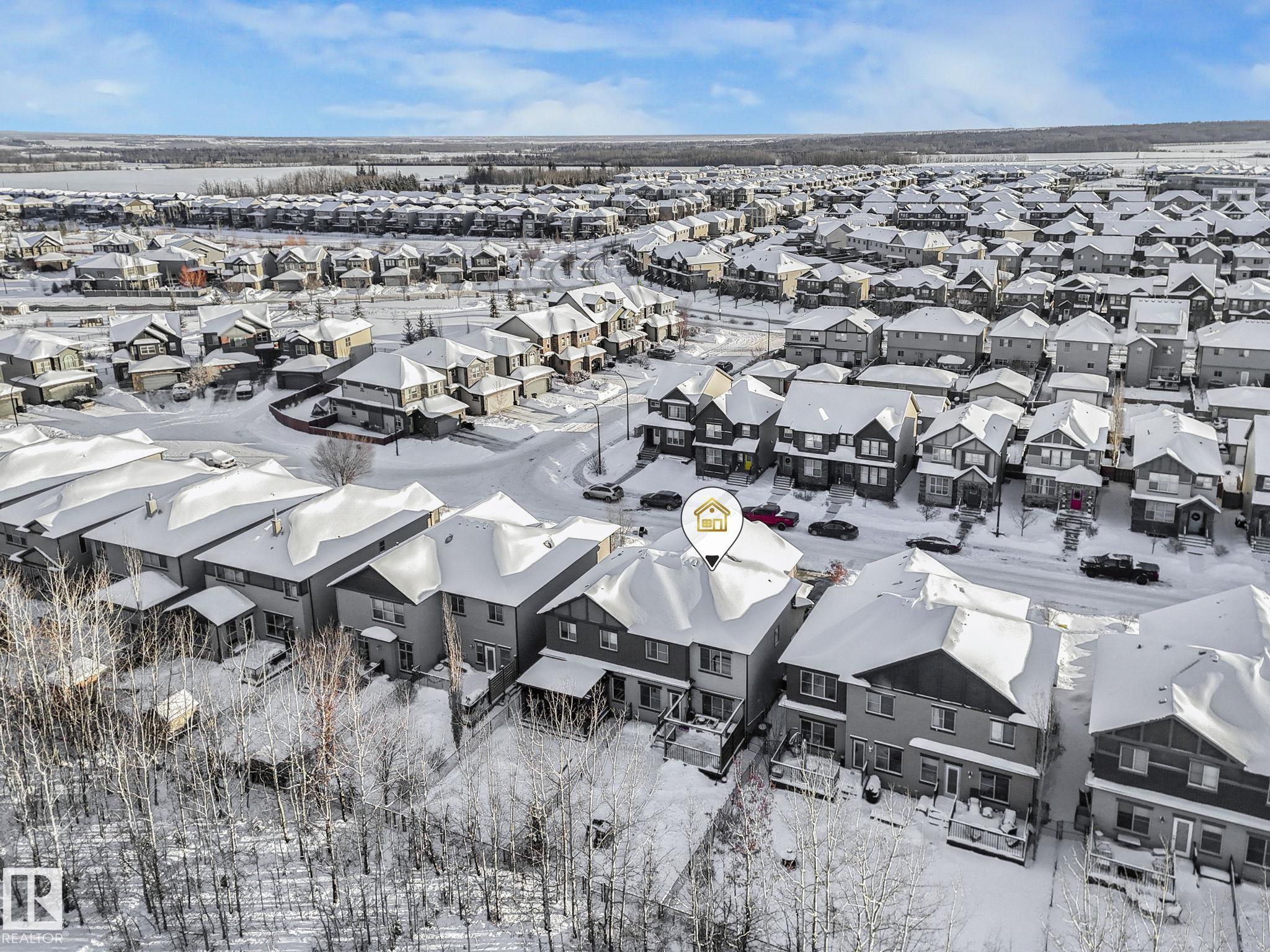 This lovely 1834 sq. ft. home is backing onto the 60 acre Jubilee Park with walking trails, playground and spray park right out your gate and all tucked into a quiet side street. The large west facing deck with a pergola and a fenced yard is enhanced by mature trees along the back fence ensuring your privacy. The open concept design on the main floor features quartz countertops in the kitchen, a dining space and a lovely gas fireplace in the living room all enhanced by beautiful triple pane west facing windows and air conditioned comfort. Upstairs features a generous primary suite with 3 pc. ensuite and large walk in closet, a large loft/bonus room 2 additional bedrooms and laundry. You are within easy walking distance to the Prescott k-9 school and a child care center. The attached double garage has parking for 2 extra vehicles on the parking pad. The partly finished basement offers an extra living area and is roughed in for plumbing. This great location is with easy access to Highways 16 and 16a.