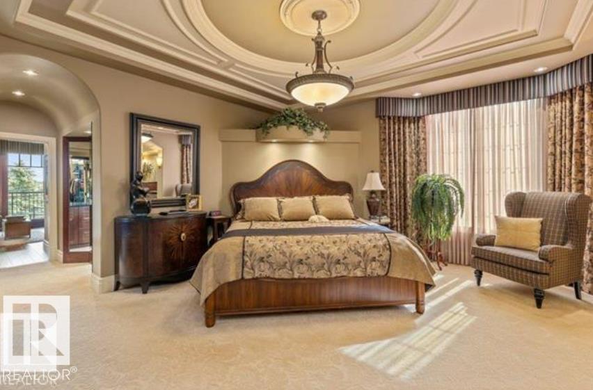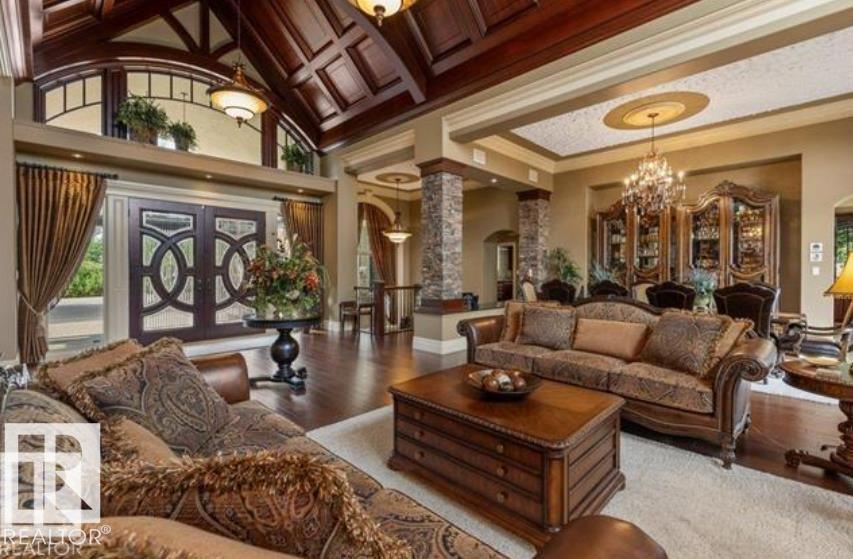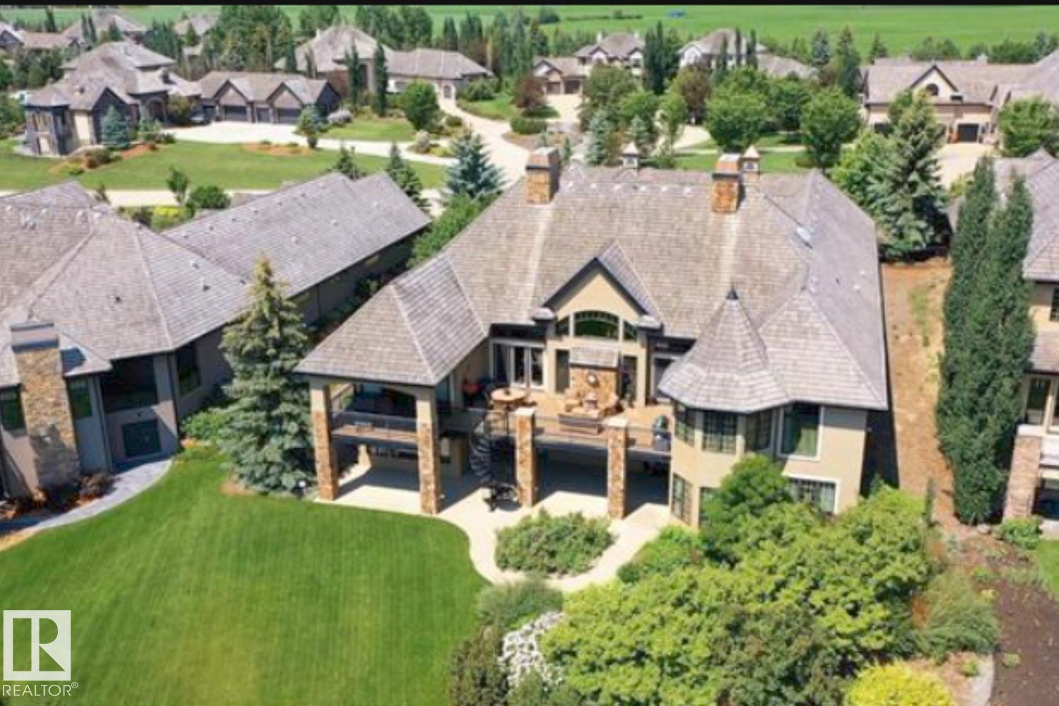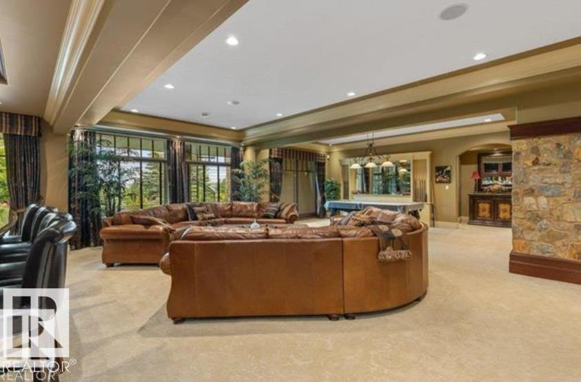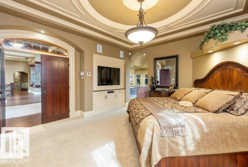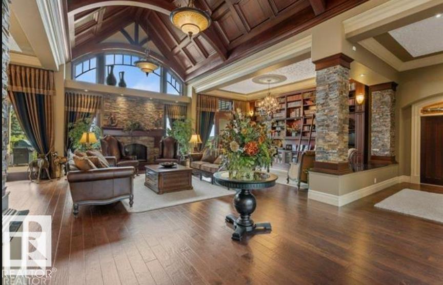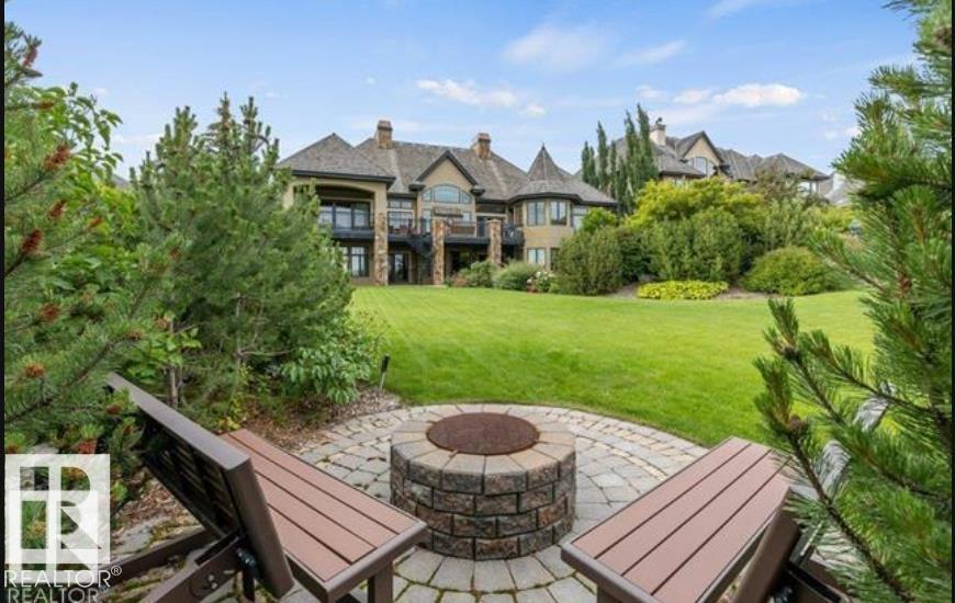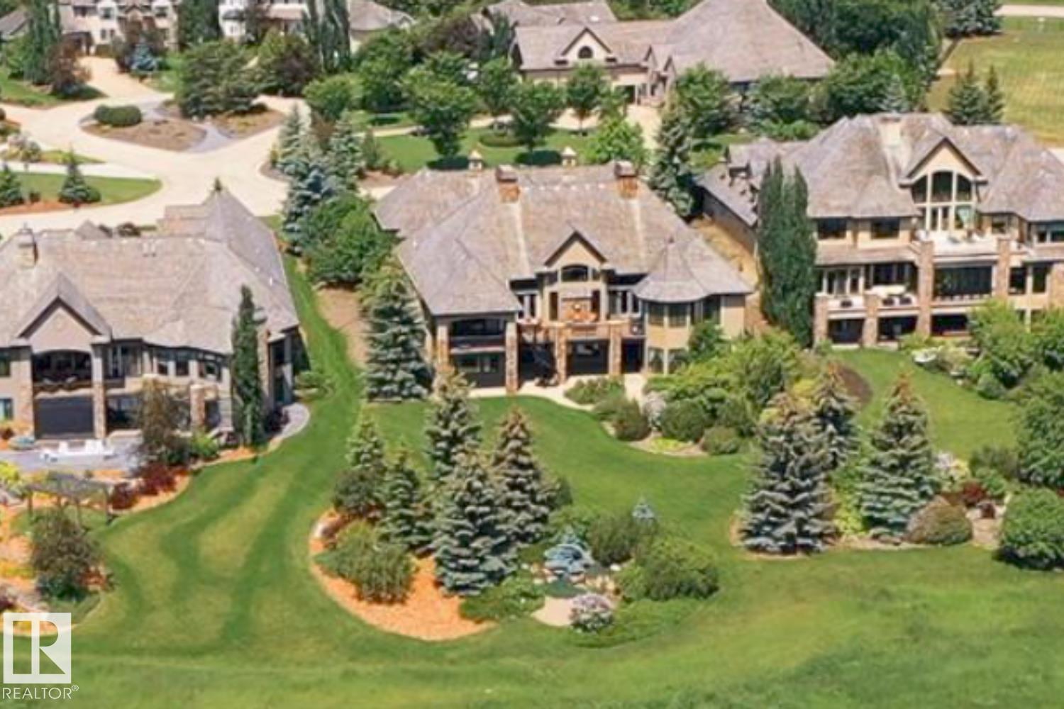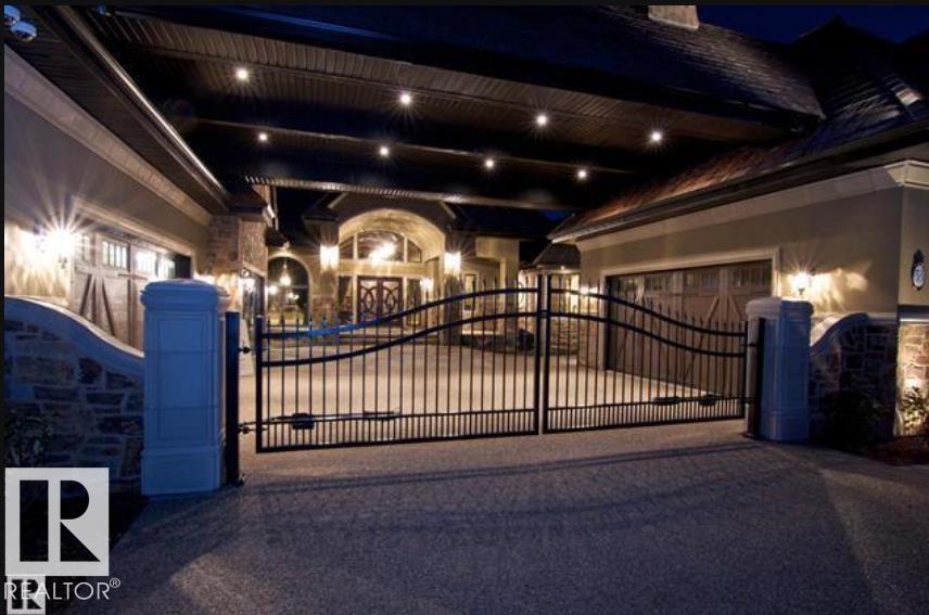 Wow! Wow! Wow! This Audie Benson Estate Homes showhome is the grandest of the grand! 7100 sq ft of luxury living on .72 acres of gorgeous river valley views in prestigious Riverstone Pointe, minutes out of St. Albert & to the Anthony Henday. The curb appeal is unsurpassed with drive through portico, natural iron stone, copper chimneys & capolas & iron security gate. Step across the threshold into an elegant foyer w/views of the Great Room, boasting 20' open vaulted cherry ceilings, an exquisite formal dining room & music room, wall-to-wall & floor to ceiling library complete with sliding ladder. The den is perfectly situated off the luxurious master suite & library. This magnificent walkout bungalow boasts awards for best kitchen & best ensuite in North America. Main floor access to the south backing upper patio, with views of double waterfalls, bridges & rose gardens. The lower level includes a gathering room, games room, theatre, old world wine cellar, fitness room w/massage area. 53-25015 TWP ROAD 544A