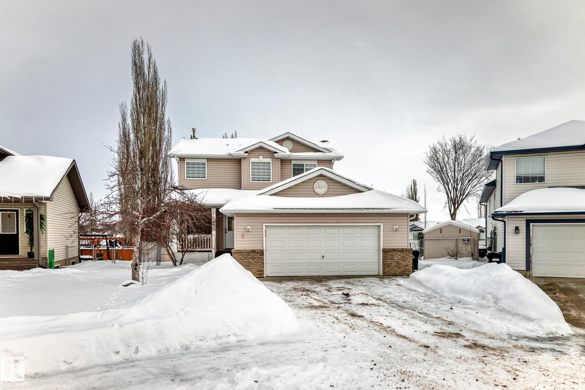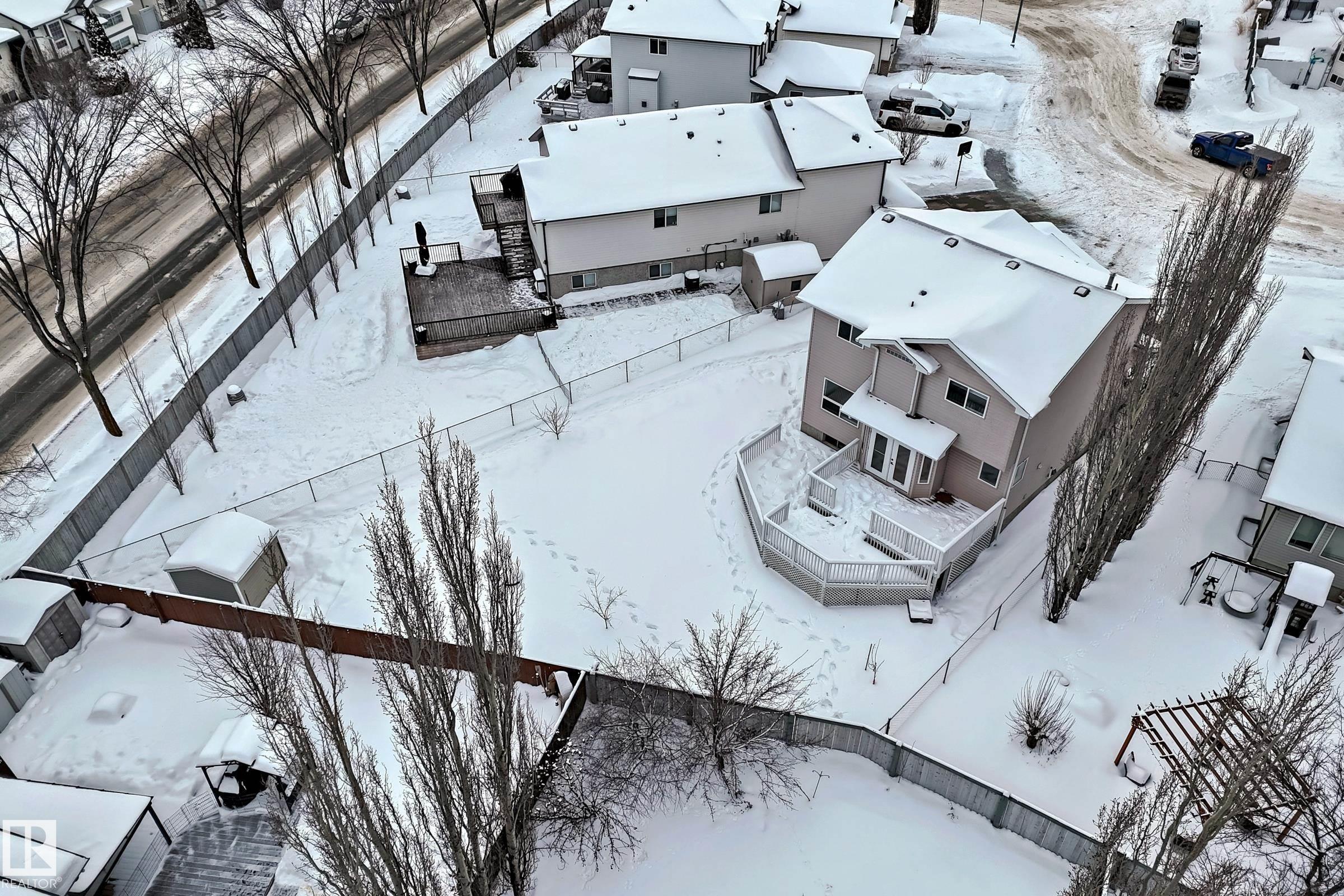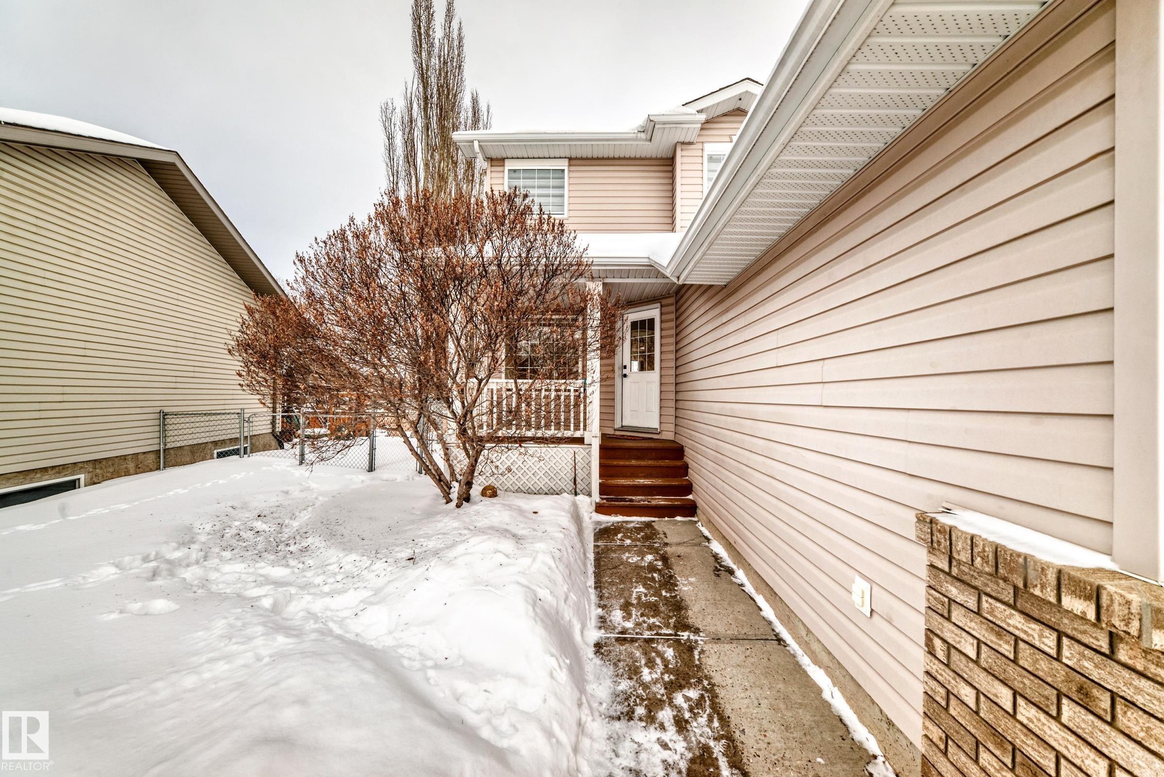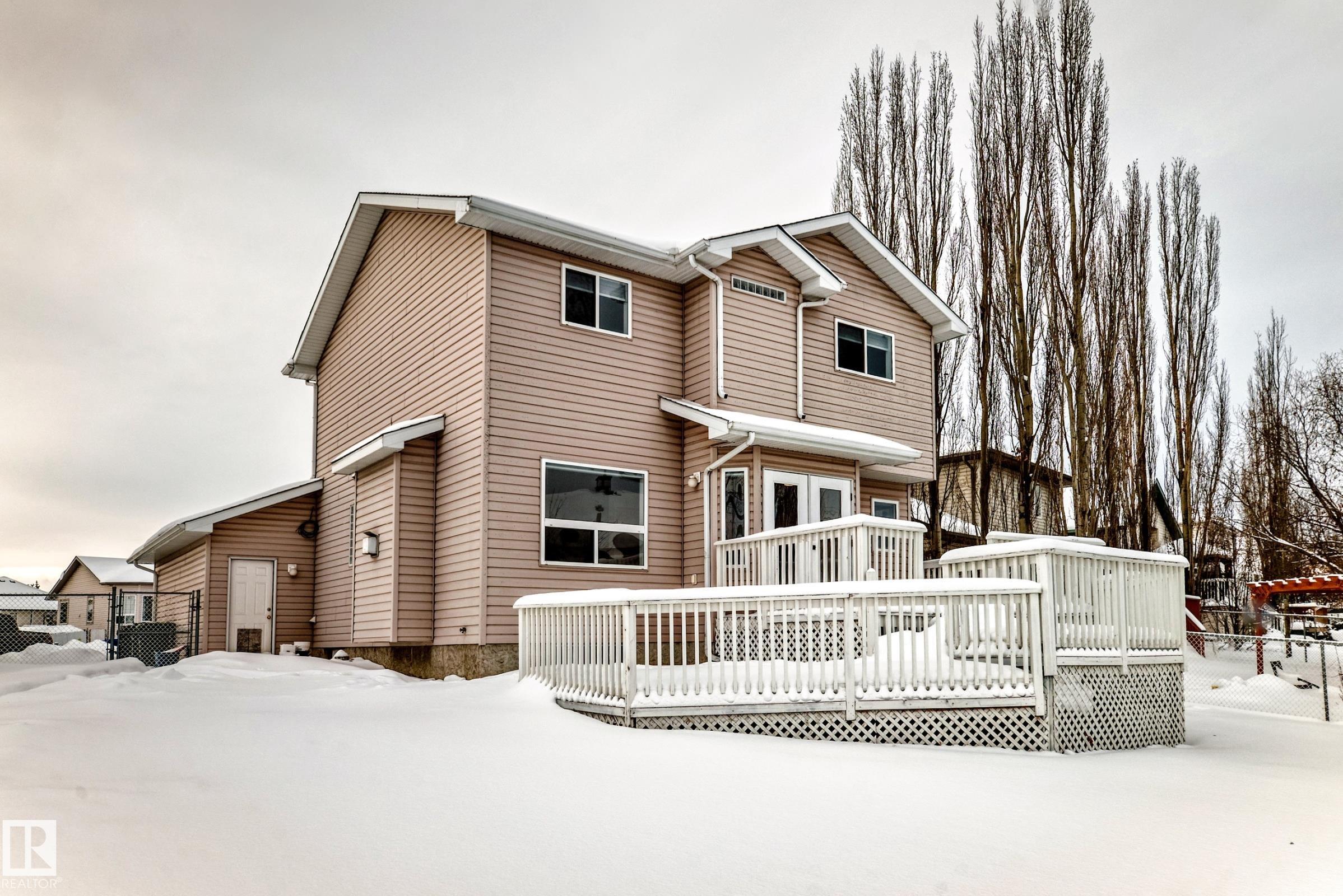 This move-in-ready property features refinished hardwood floors, fresh paint, two-tone custom cabinetry with quartz countertops, s/s appliances, and an open-concept main floor. Offering 4 bedrooms & 4 bathrooms, main floor laundry, there is plenty of space for the whole family. Upstairs boasts a spacious primary retreat with walk-in closet & 4-pc ensuite, 2 additional bedrooms & updated 4-pc bath. The fully developed basement offers a large rec room, 4th bedroom, and renovated 4-piece bathroom?ideal for guests or growing families. Additional highlights include an o/s attached insulated garage, updated furnace, venting, humidifier, and hot water tank Dec 24, and shingles replaced in 2022. Situated on a massive pie lot on a quiet street w/ backyard oasis - multi-tier deck, fruit trees, fire pit, and plenty of space for kids or pets. Located near Spruce Groves largest forested trail system, parks, ice rink, schools and all amenities, with quick access to commuting highways, this home truly has it all!