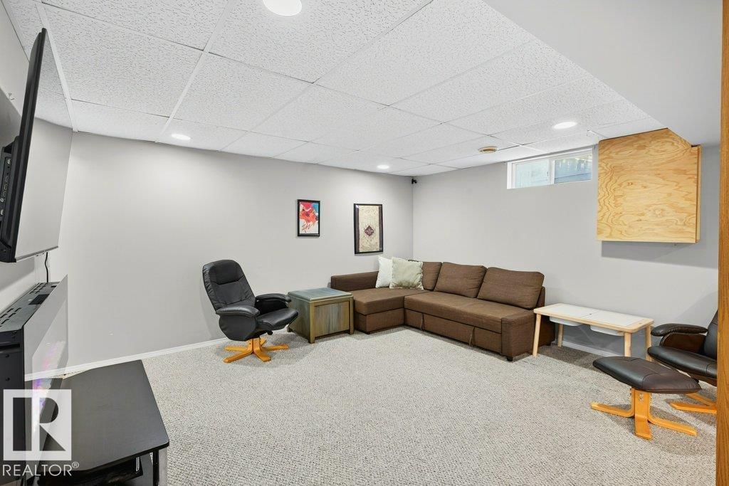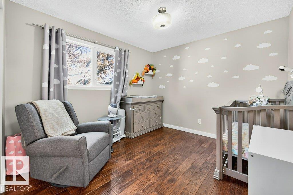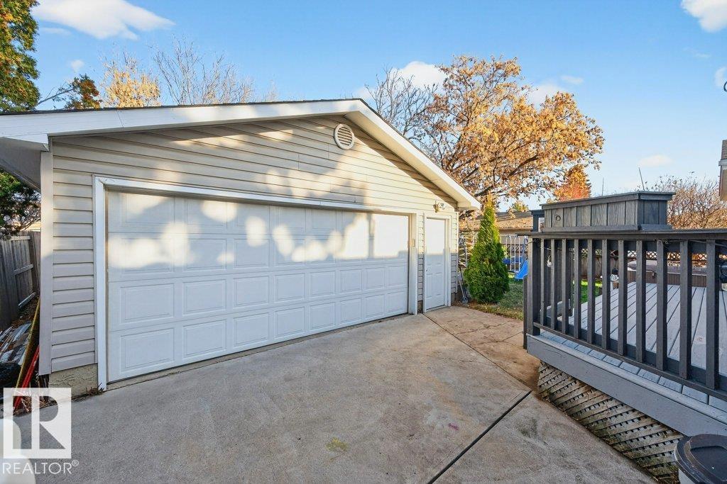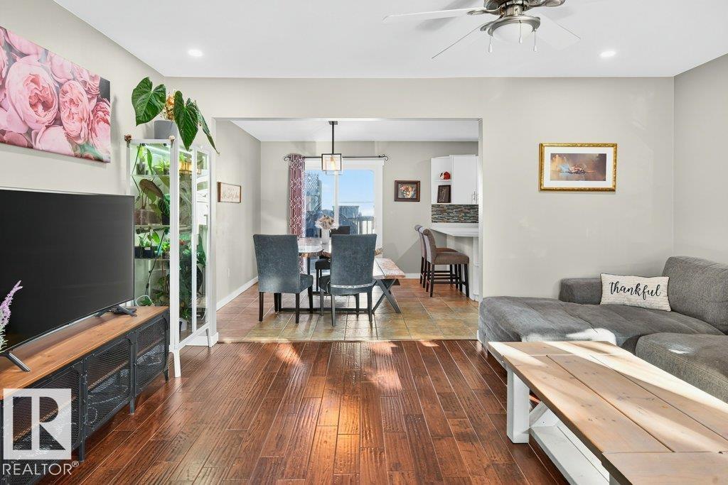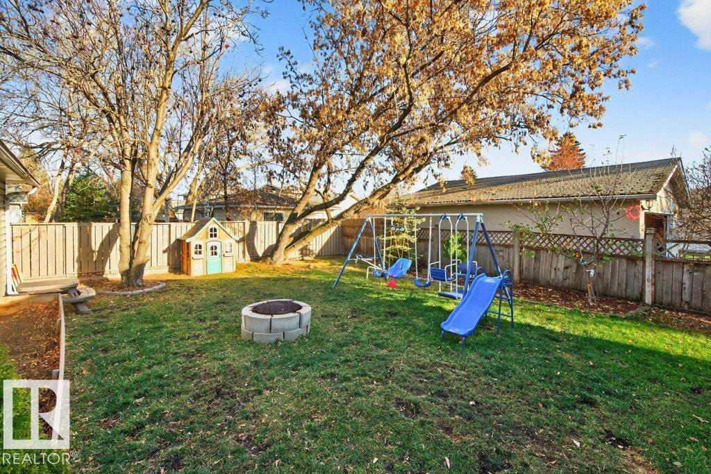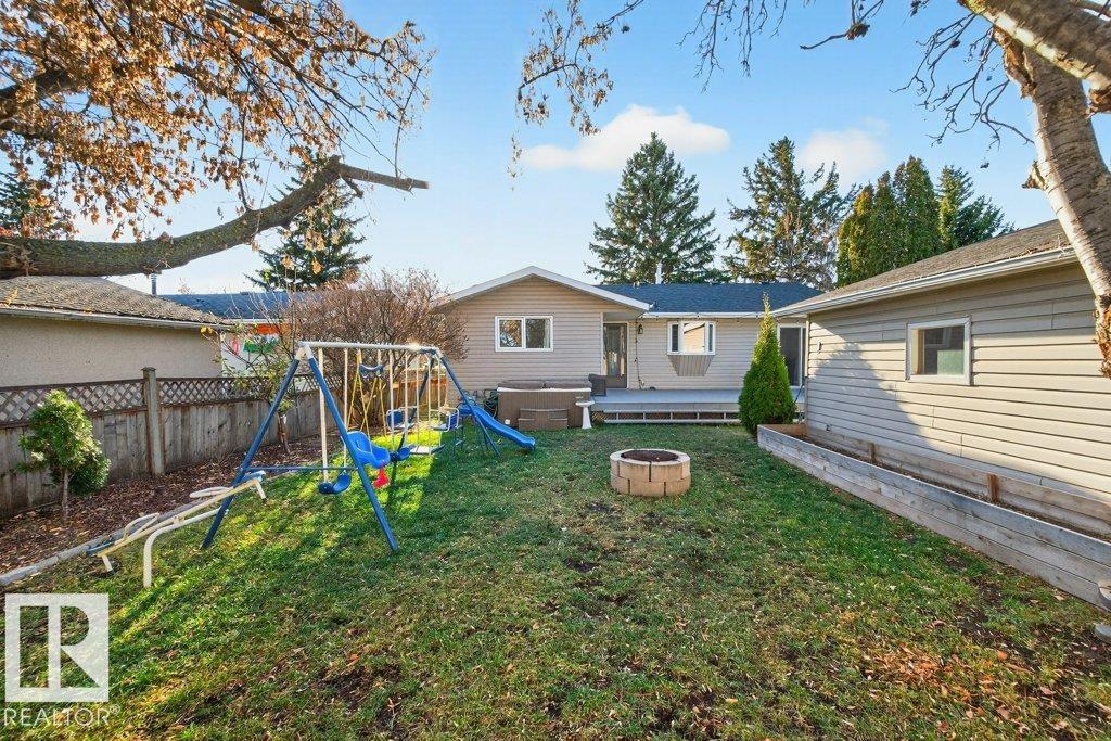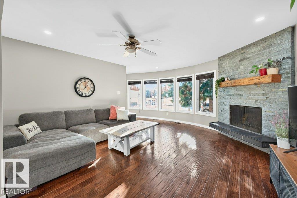 The kind of home families wait for?warm, updated, and close to schools in the heart of Callingwood. A fully finished, 1305 Sq Ft bungalow welcomes you with an open main floor, engineered wood plank flooring, pot lights, and updated vinyl windows. A sun-filled bay window frames the rustic stone-faced wood fireplace, creating the perfect cozy hub for everyday living. Modern kitchen is designed for real life with S/S appliances, ample storage, and space to gather. Generous bedrooms include a primary with its own 2-piece ensuite, plus a beautifully updated 4-piece bath with durable concrete counters. Downstairs offers a large rec room with WET BAR and mini fridge, a 3-piece bath, extra bedroom, and flexible space for work or play. Outside, enjoy a PRIVATE fenced yard, large deck with hot tub, and an OVERSIZED insulated double garage with new opener. New A/C, furnace (2019) screened eaves, spray foam insulation, and permanent GOVEE LIGHTS! Easy access to transit, YMCA, Twin Arenas, the Whitemud and Henday!