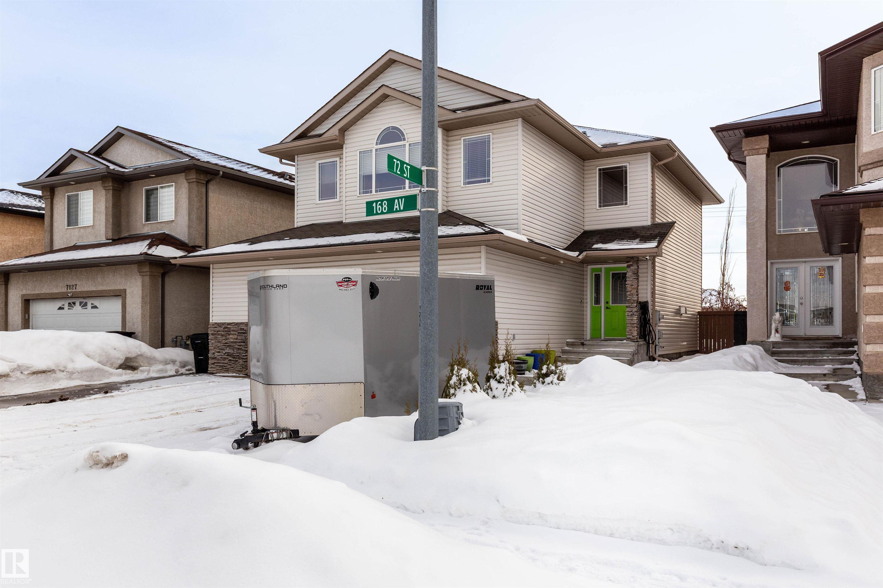 Welcome to this stunning 2-storey with fully finished basement, located in the desirable Schonsee area. Main floor features hardwood flooring and ceramic tile, a bright living room with a corner gas fireplace w/ stone mantle, and an Open-concept kitchen with Quartz countertops, huge pantry, and all new Stainless Steel appliances. Patio doors lead to a large deck with Gazebo perfect for entertaining. Convenient main-floor laundry with new washer/dryer. Upstairs offers 3 spacious bedrooms, including a Primary suite with French doors, 4-piece remodeled ensuite, and large walk-in closet. Massive bonus room over the garage features vaulted ceilings and built-in entertainment unit. Basement includes a family room, 3-piece bathroom, and additional bedroom. Additional highlights include massive OVERSIZE Double Garage with heater, 3 car driveway, fully maintenance free landscaped yard, Newer HWT and New Furnace. Amenities include Daycares, Schools, Shopping, Restaurants, and The Anthony Henday A MUST SEE!