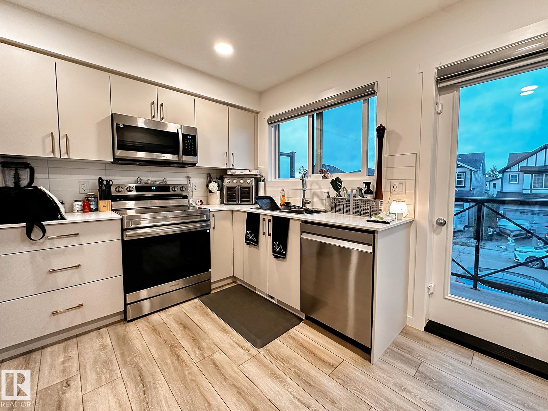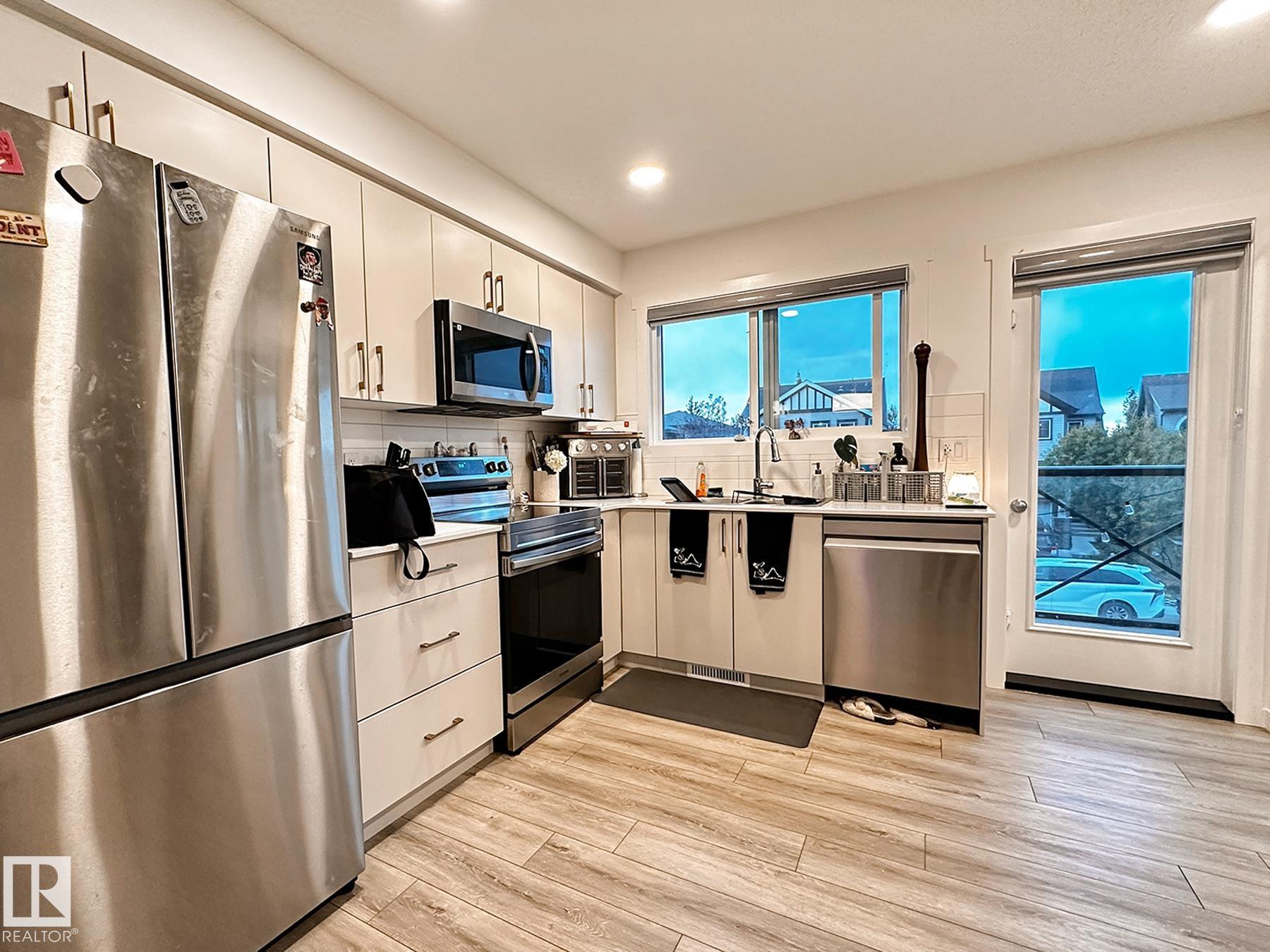 Rare find! Take over $1,875/rent lease until August 2026, or Option to move in. To own this low condo fee, new built townhome in one of Edmonton's newest premier WEST END communities of Secord. With 1098 sqft, this home offers 2 bedrooms + den + 2.5 bathrooms. This home provides an innovative design with a good size Den/Bedroom at the ground level potential for a home business. Main floor is completed with upgraded luxury Vinyl flooring throughout the great room and open concept kitchen equipped with modern cabinets, trendy tiled backsplash, and quartz countertops. The bright and spacious living room contains a big window that brings in lots of natural light to the house. Not to mention this beautiful patio, perfect size for BBQ setup. Upstairs, there are 2 Primary bedrooms, each with its own bathroom. The home is completed with a single attached garage and landscaping. Once again, the low condo fee of just $60/month, this is an exceptional value, with the low interest rate to generate cash flow.