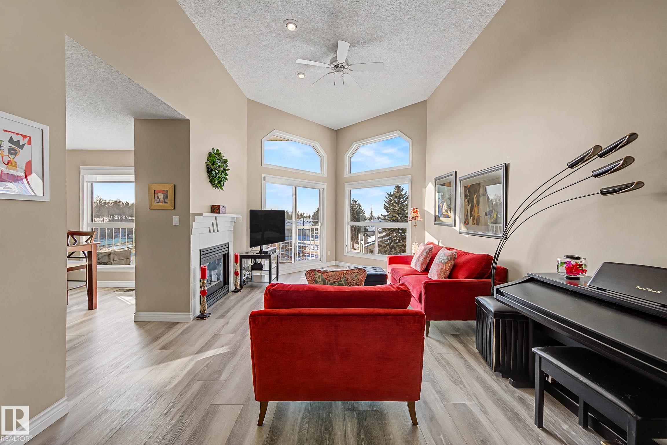 Wow! Top floor (4th) upgraded condo with soaring vaulted ceilings. The south exposure and large windows (including upper clerestory windows) combine to fill this home with light all day. Add this interior to the large south exposure deck and sunshine reigns supreme! Gas BBQ line to deck. This 1 bedroom plus den unit is immaculately kept exuding gracious living. Newer Luxury vinyl plank floor floor & fresh paint makes this home feel like new. Large living room with gas fireplace enjoys the spacious beauty of the windows and vaulted ceiling. Warm winter nights with cozy fireplace and cool summer days with the central air conditioning make this home a year round pleasure. Well planned kitchen and spacious dining room adjoin the living room. Great functional floorplan for entertaining and everyday living. Primary bedroom also enjoys the south view and light. Your personal den/office space is great flexible space Single car GARAGE plus one assigned energized outdoor stall complete this fantastic package.