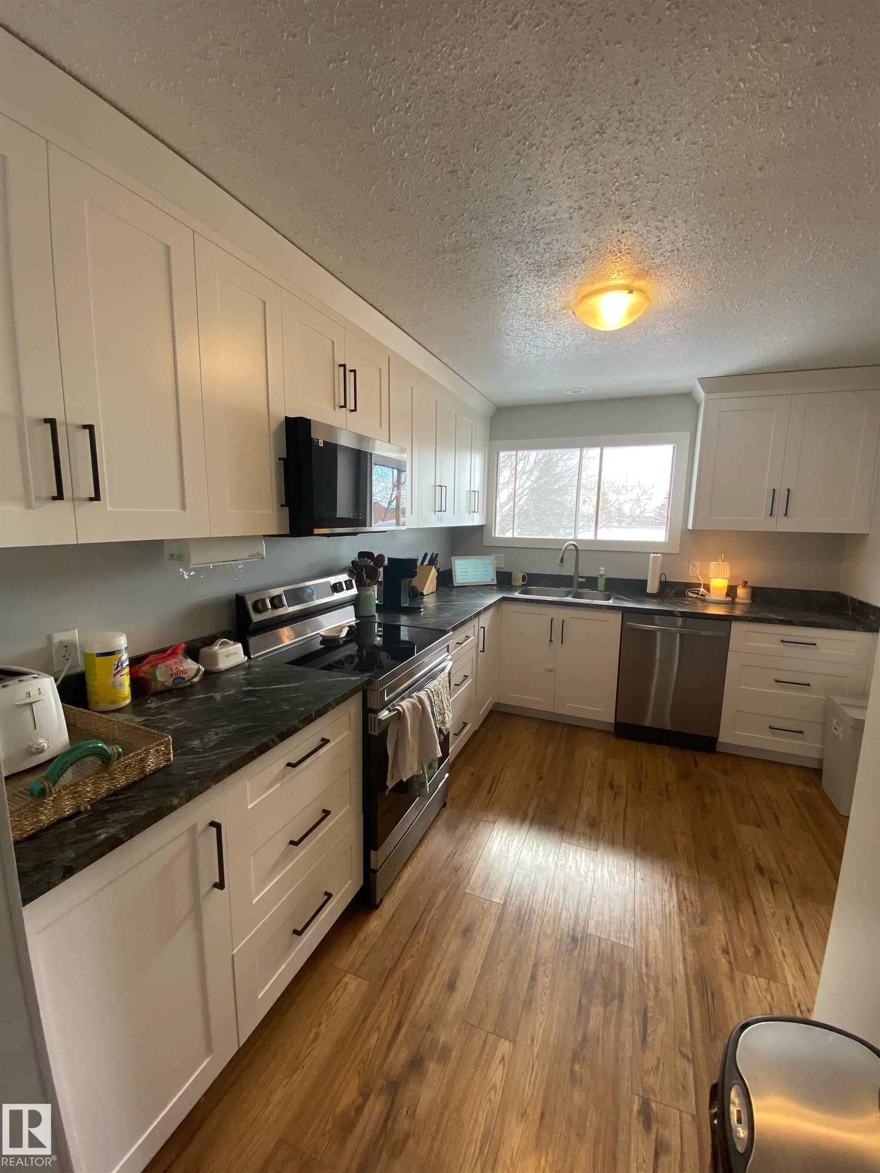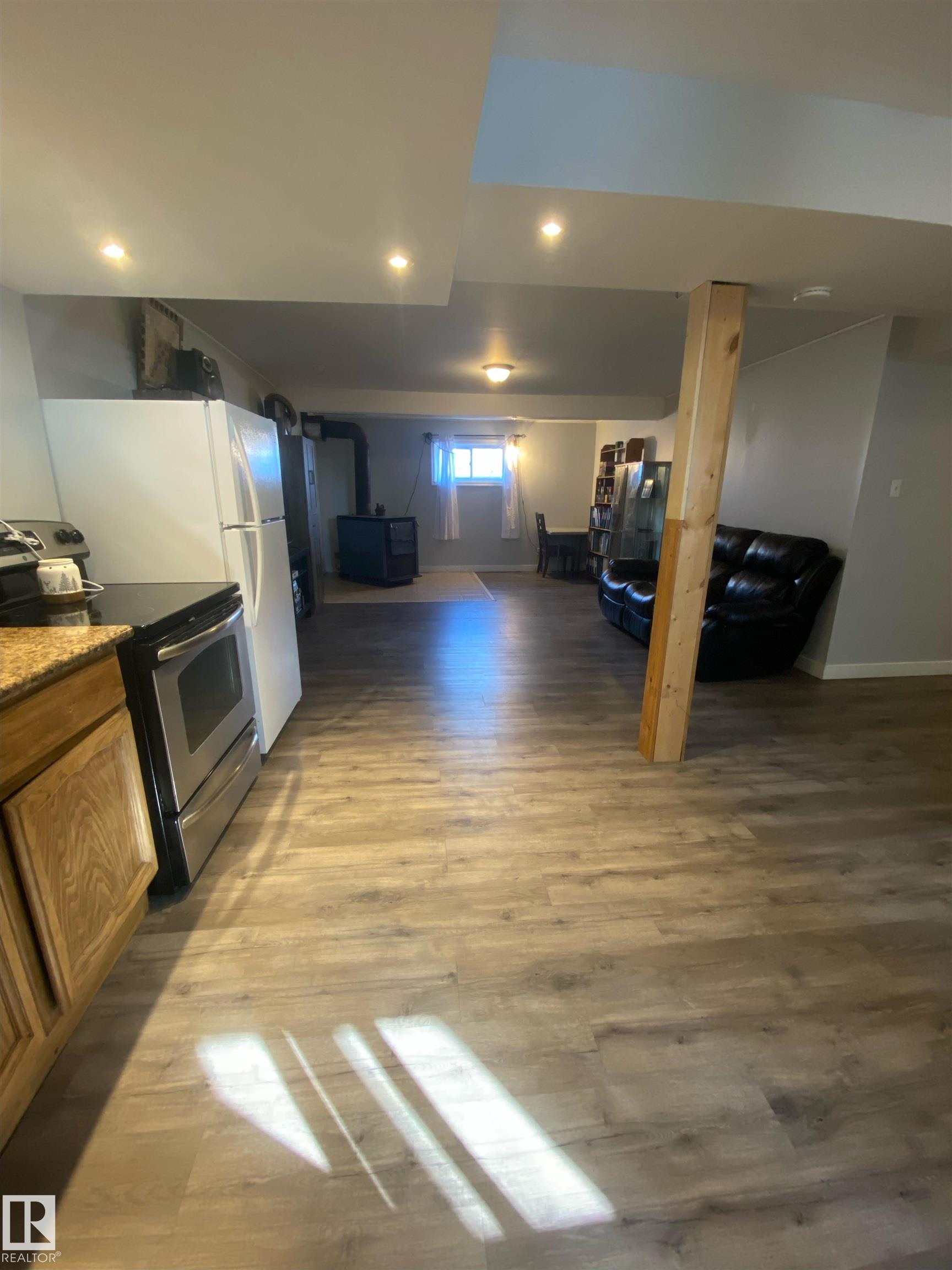 This home has ample room for your family. This 6 bedroom 3 up and 3 down bungalow has had many updates including New Kitchen 2024, Flooring 2022 - 2025 (No Carpet) new laminet up and new vynal down, new Furnace 2022, shingles on house and garage replaced with 35 year shingles approx 2015. The basement has a huge wood stove, which provides plenty of warmth in those cold winter months. single over sized garage 18 ft x 22 3/4 ft with 16ft wide overhead door. New Fence july 2025 and deck has been redone in 2025 as well. All 3 bathrooms have new toilets,vanities, fixtures. Interior has been painted last couple years and exterrior has been painted in 2025. New trim on doors and floors 2022 - 2025 paking pad at front with garage and pad off back alley.