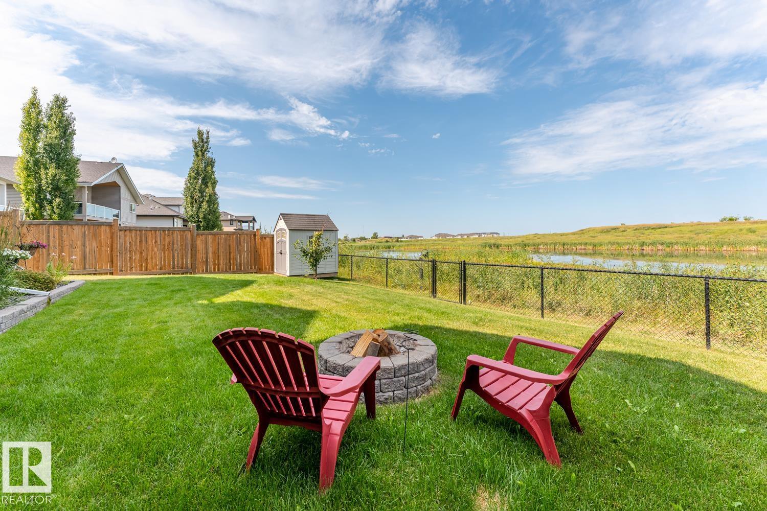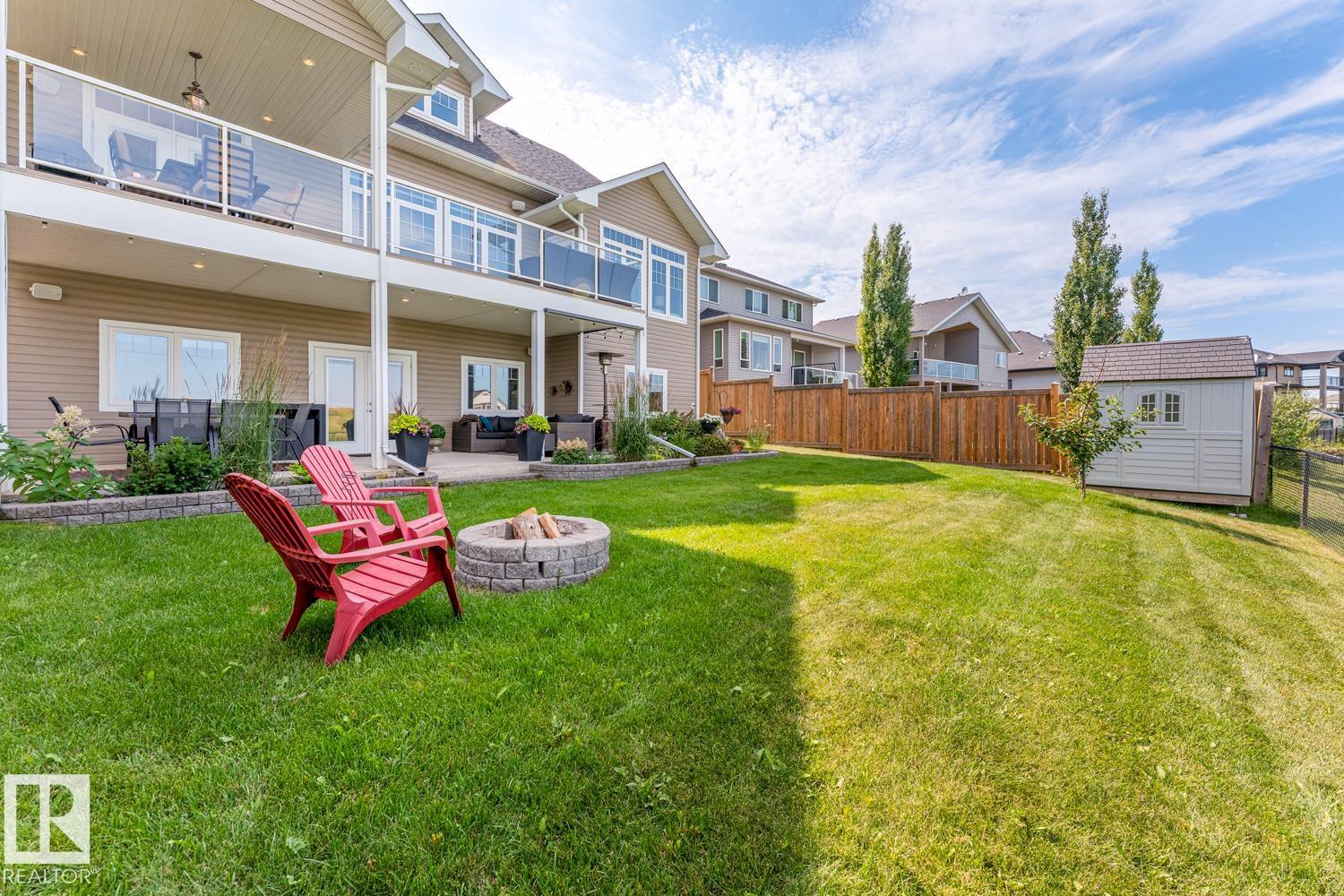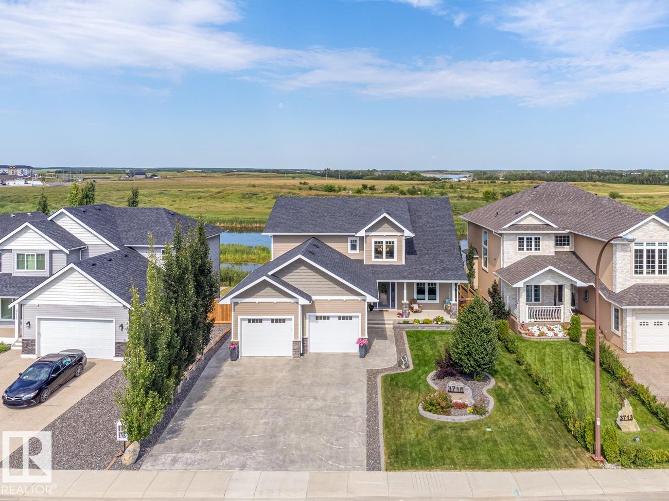 Custom crafted 2750 sqft. 1-1/2 Story with double attached heated garage located in Beau Vista. Welcoming covered veranda opens up to a spacious foyer, Kitchen has custom white cabinetry, w/under cabinet lighting, gas stove, Stainless steel appliances, pantry, quartz tops. Island w/sink & seating. Living room ceiling is open to the second floor with dormer and has built in cabinetry on either side of a gas fireplace. Big bright triple pane windows & luxurious hardwood floors throughout. 7 bdrms & 4 bath, Master suite w/ coffered ceilings walk-in closet, huge ensuite w/ tiled shower, heated floor, huge soaker tub & 2 sinks. Main floor laundry, Upper floor with open office/reading area, Fully developed walk out basement incl. large Rec room w/ wet bar, BI speakers in/out door, underslab heating & A/C, Central Vac and R/O, H/W on demand. Enjoy the views from the covered deck or lower walk out patio w/ RI for Hot tub, overlooking the ponds and beautifully landscaped fenced yard w/ firepit. Home of a LIFETIME!
