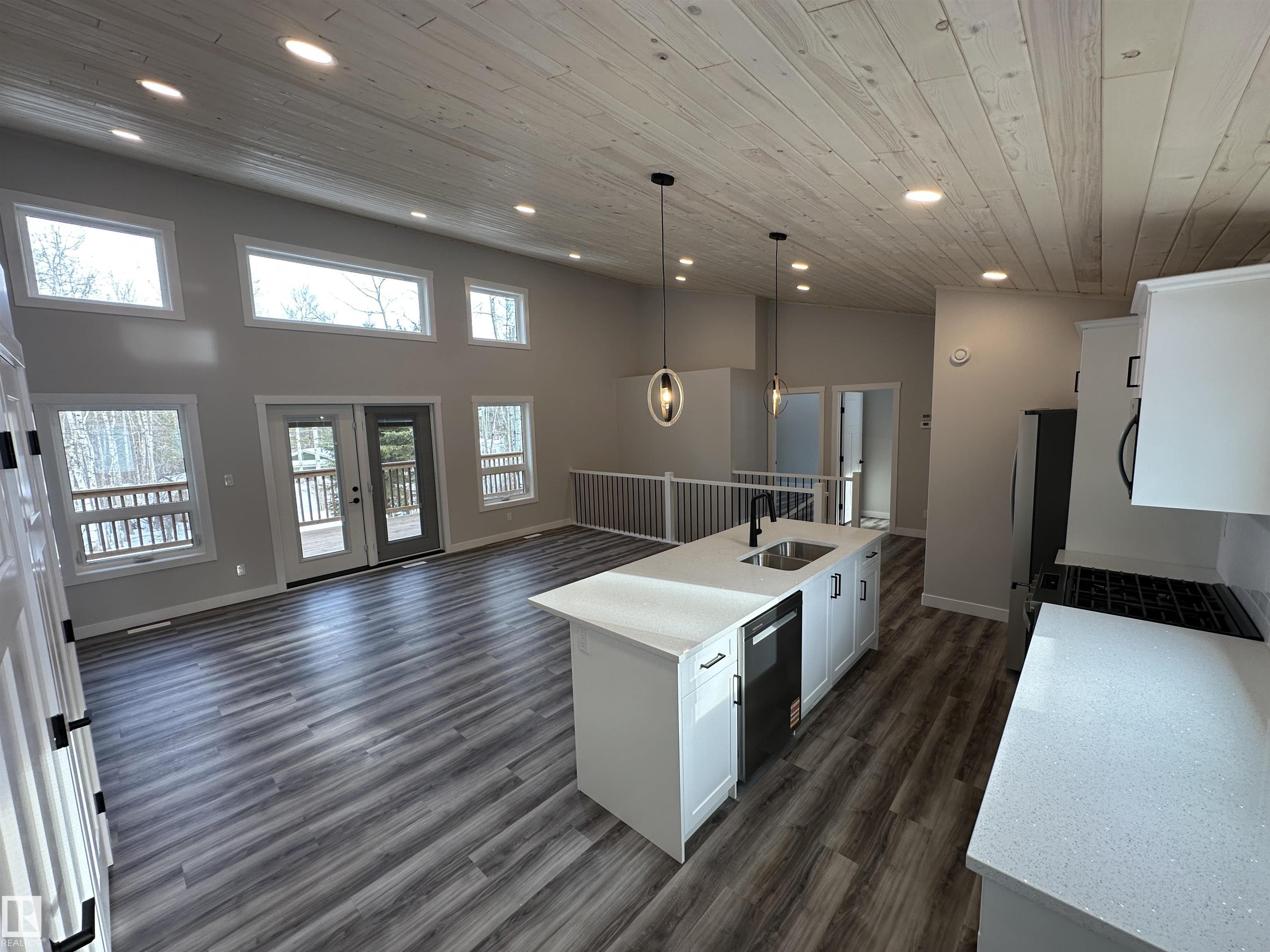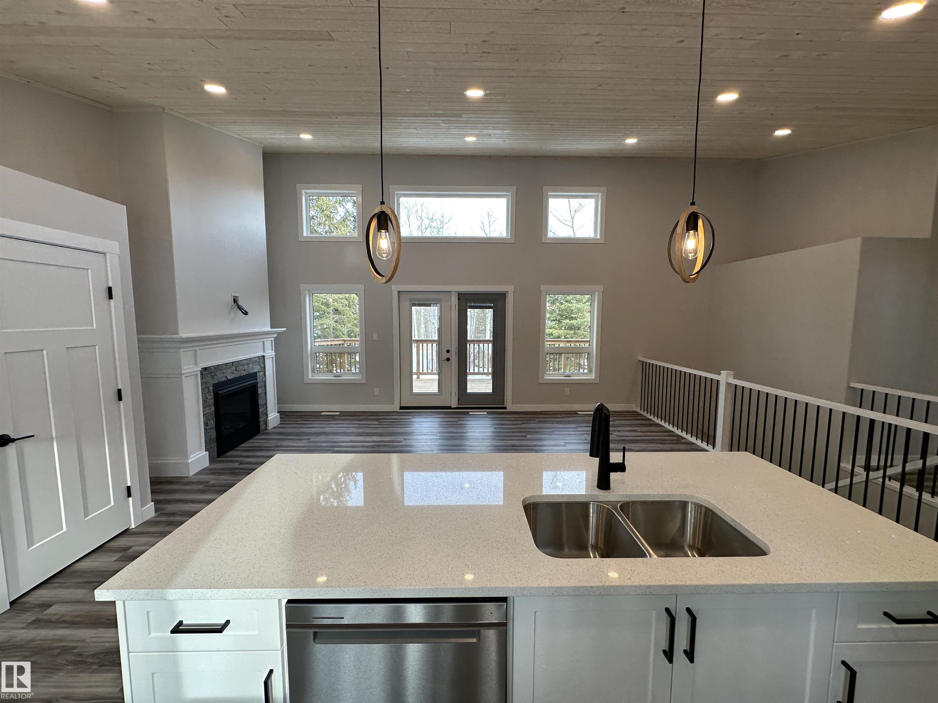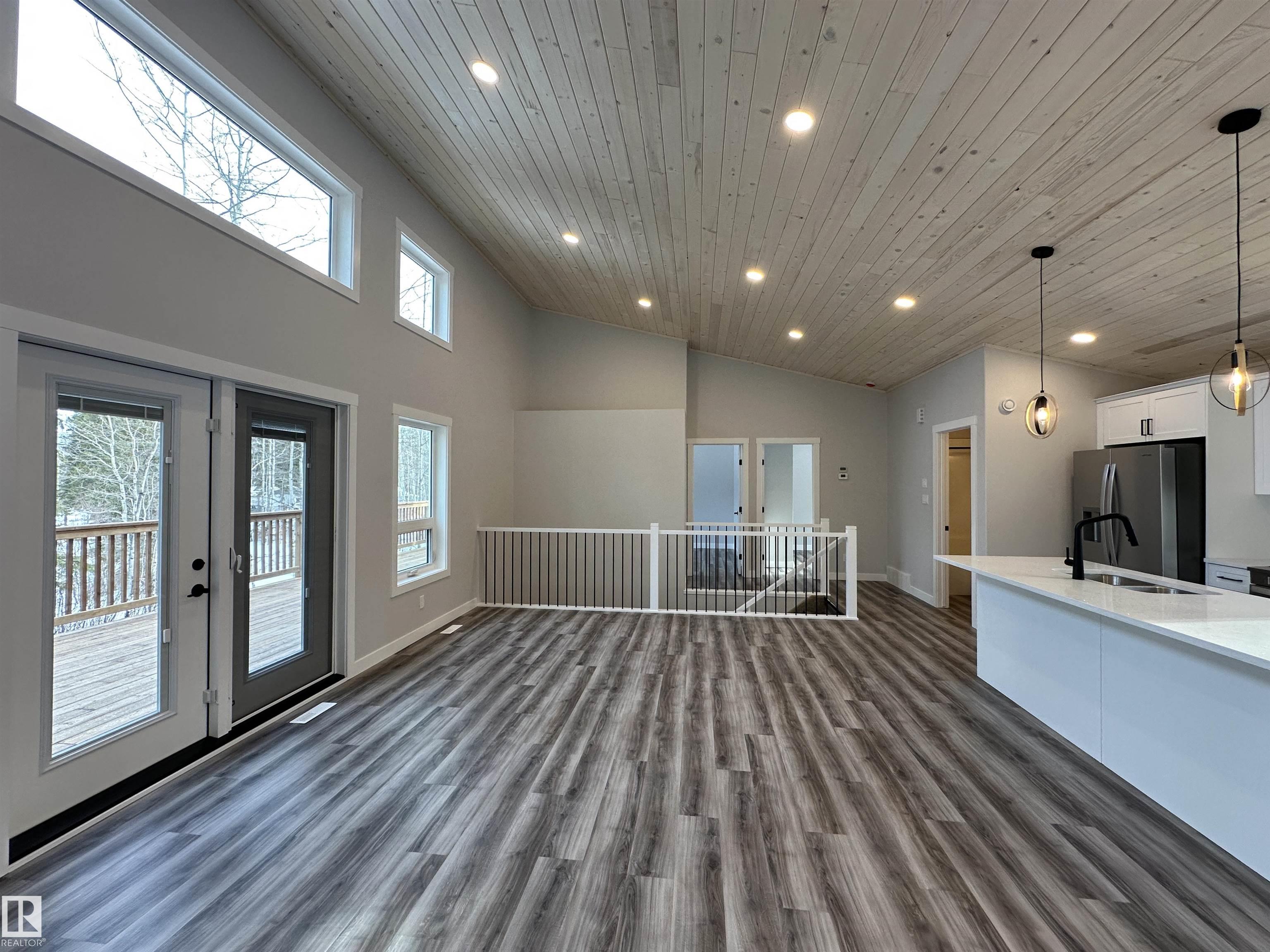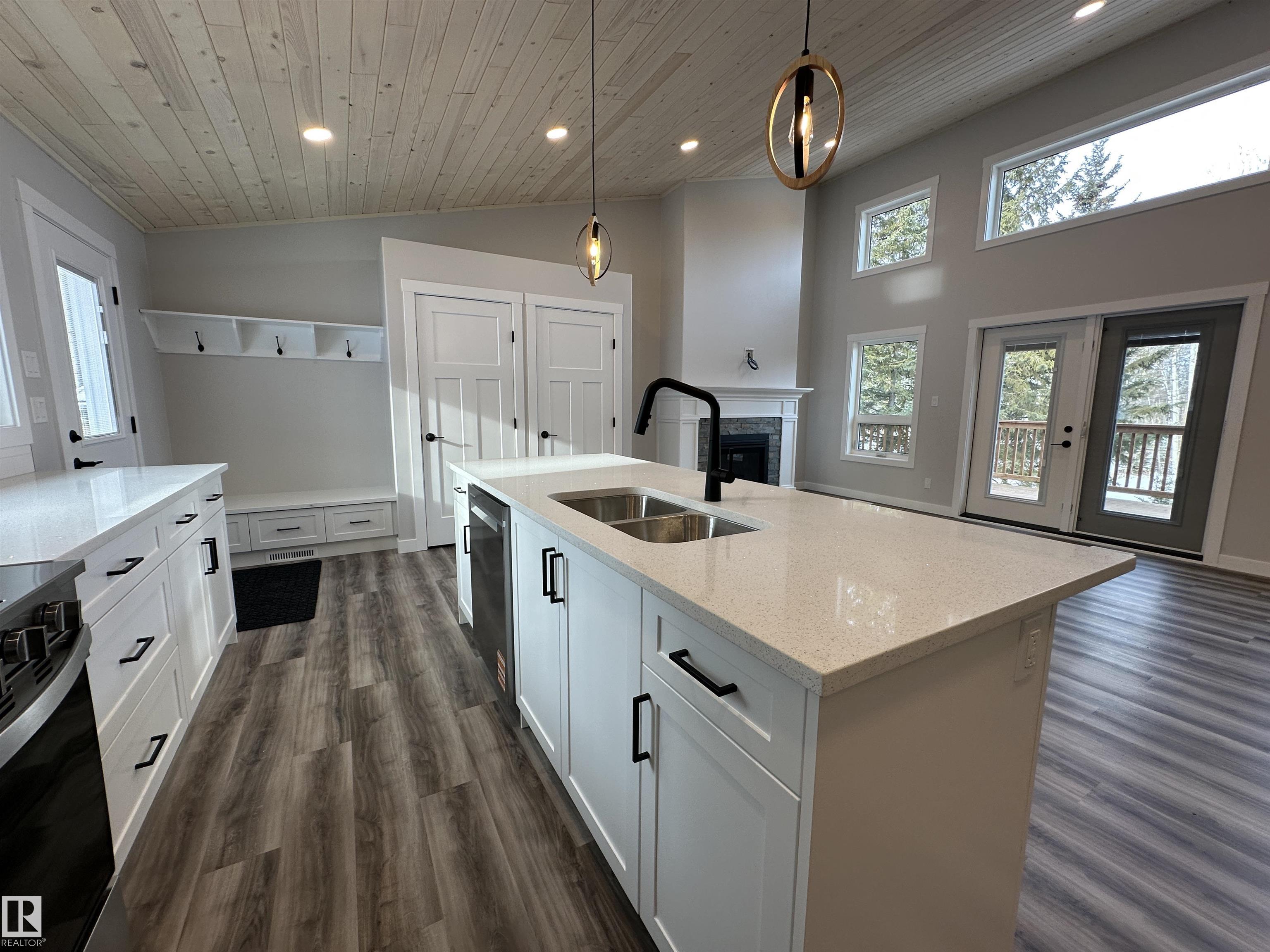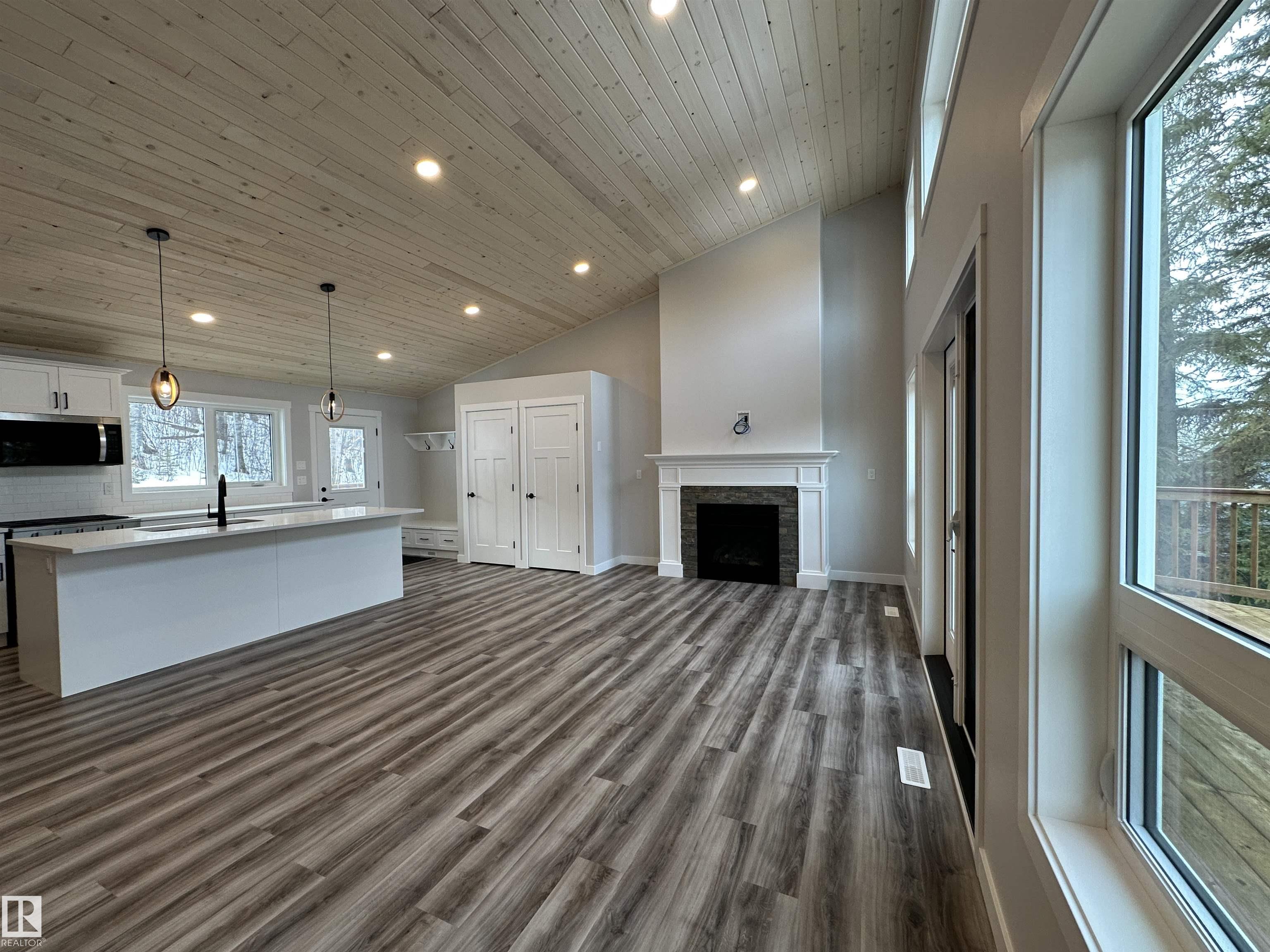 Under Construction and move in ready by Jan 31/26 ... Custom built 960 sqft raised bungalow with walkout basement garage. Wide open design, 14' vaulted pine tongue & groove ceiling, fireplace, luxury vinyl plank flooring, big windows w loads of natural light, 8' quartz topped peninsula island, shaker style kitchen cabinets, 4 piece stainless steel appliance package, walk-in pantry, 2 bedrooms up and 4 piece main bath. Stepping out of the vaulted great room, you're immersed in the peaceful sights and sounds of nature off your huge wrap around deck. The finished walkout basement has in-floor heat, 9' ceilings, primary suite with a 4 piece ensuite, laundry room, utility room and a 21 x 24 drywalled, taped and painted garage. 100 AMP power service, drilled well and a 2800 gallon septic holding tank. Tucked on a private, pie shaped lot surrounded by mature trees. Close to the shores of Isle Lake, the beach, boat launch and only 45 min west of Edm. Price includes GST, with rebate assigned back to the builder.