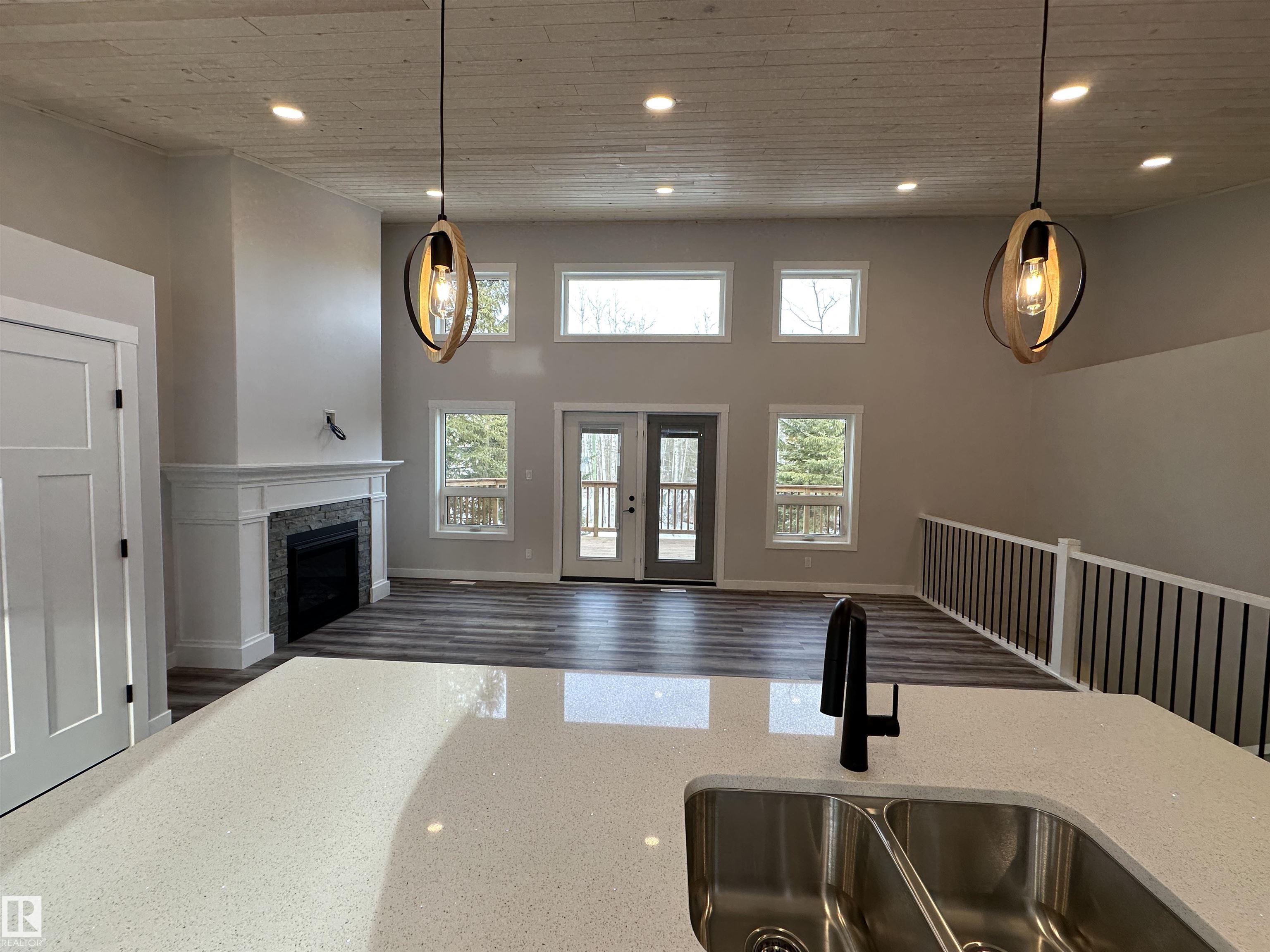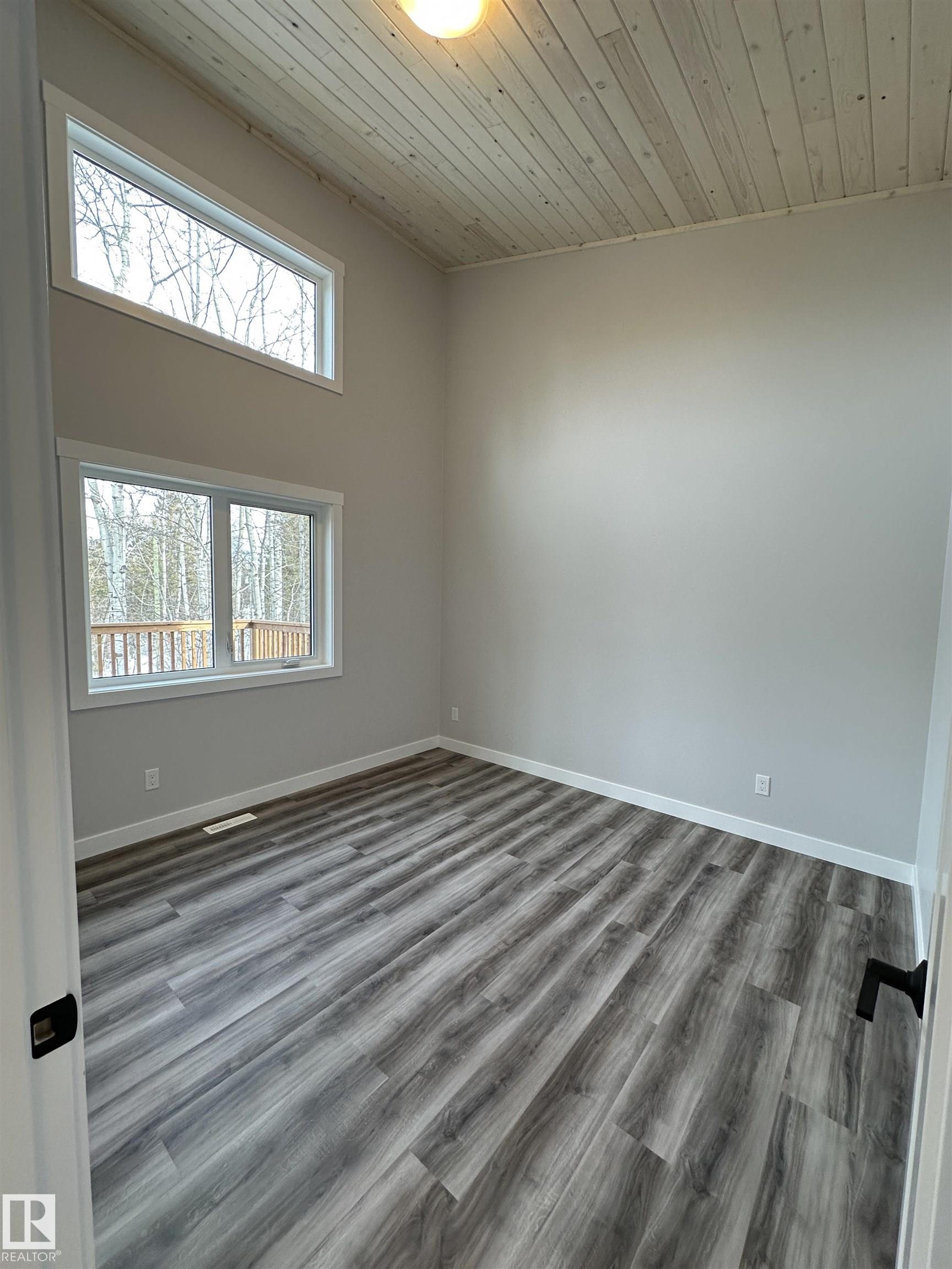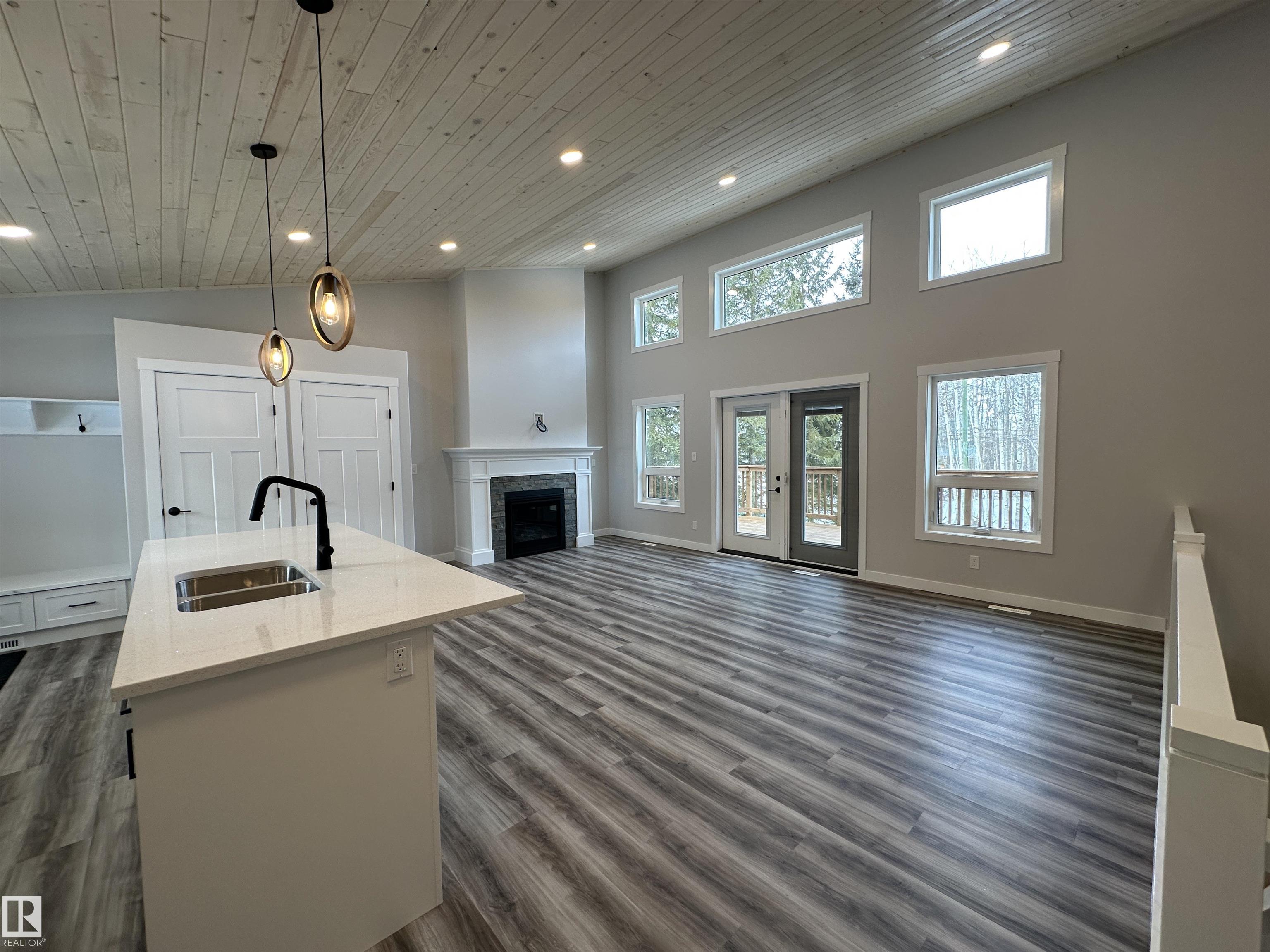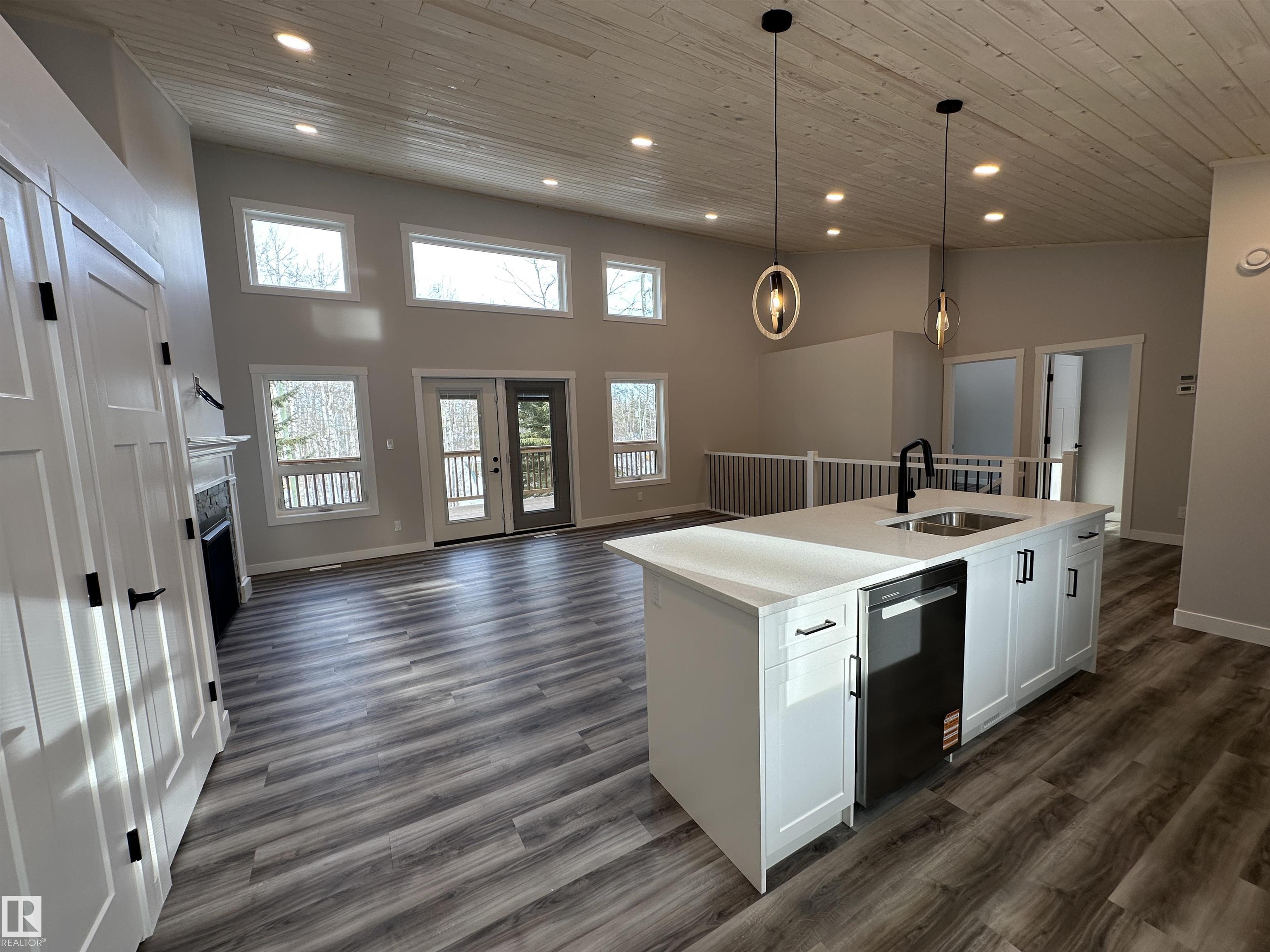 Under Construction and move in ready by Jan 31/26 ... Custom built 960 sqft raised bungalow with walkout basement garage. Wide open design, 14' vaulted pine tongue & groove ceiling, fireplace, luxury vinyl plank flooring, big windows w loads of natural light, 8' quartz topped peninsula island, shaker style kitchen cabinets, 4 piece stainless steel appliance package, walk-in pantry, 2 bedrooms up and 4 piece main bath. Stepping out of the vaulted great room, you're immersed in the peaceful sights and sounds of nature off your huge wrap around deck. The finished walkout basement has in-floor heat, 9' ceilings, primary suite with a 4 piece ensuite, laundry room, utility room and a 21 x 24 drywalled, taped and painted garage. 100 AMP power service, drilled well and a 2800 gallon septic holding tank. Tucked on a private, pie shaped lot surrounded by mature trees. Close to the shores of Isle Lake, the beach, boat launch and only 45 min west of Edm. Price includes GST, with rebate assigned back to the builder.