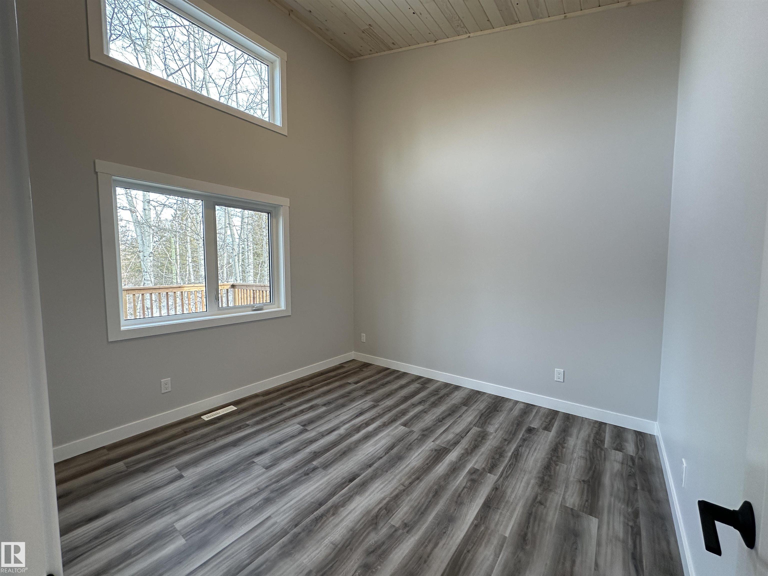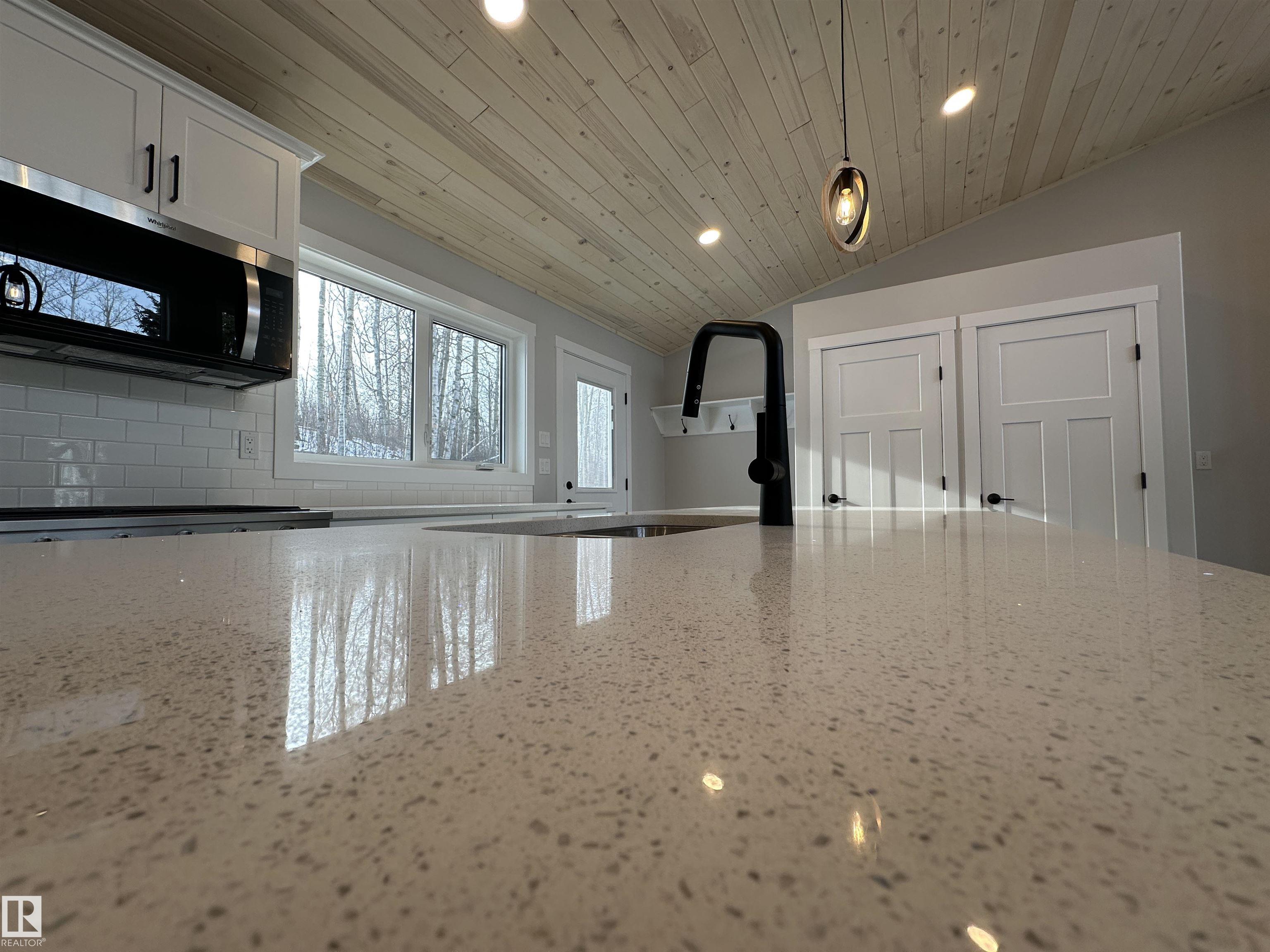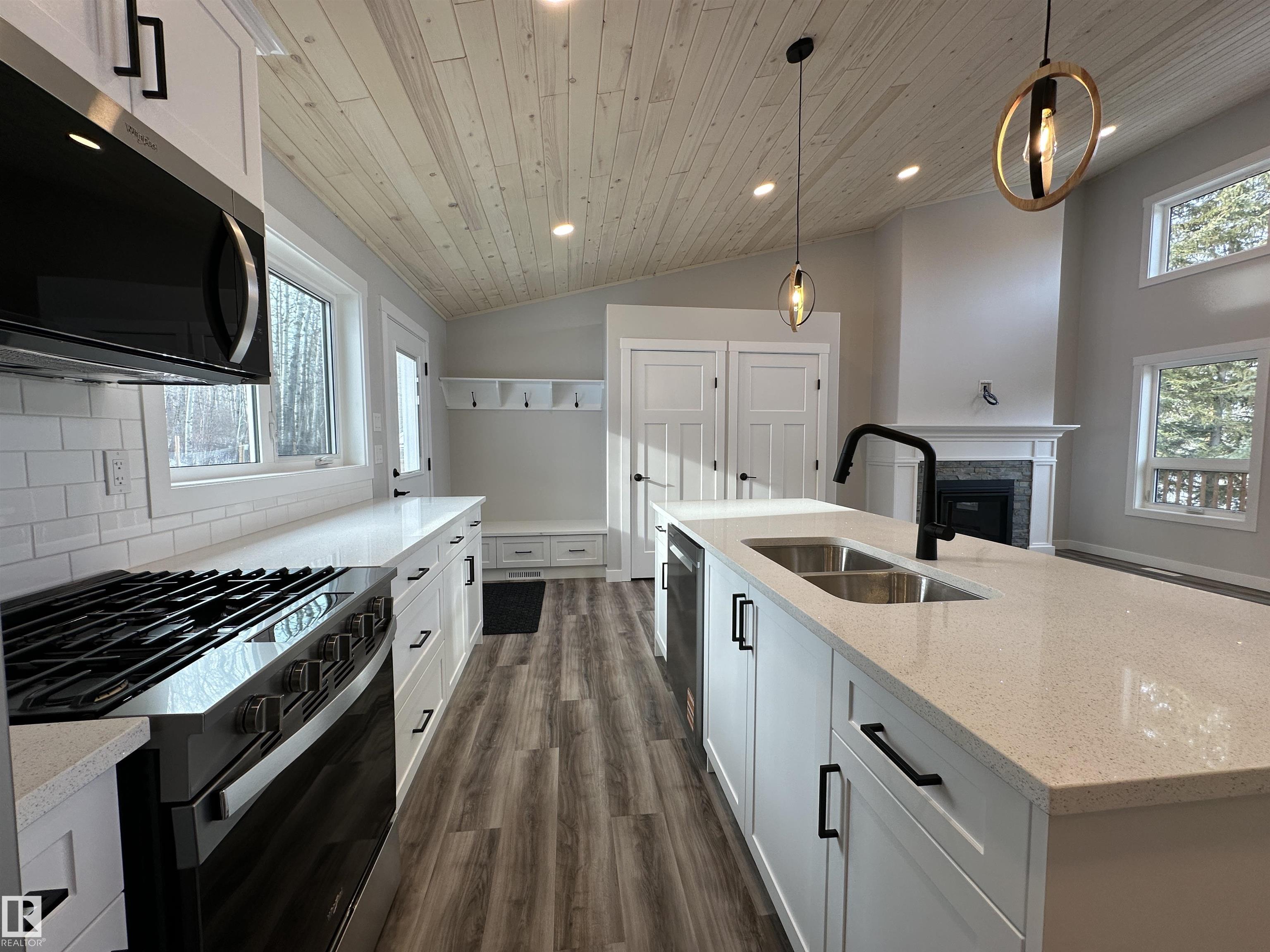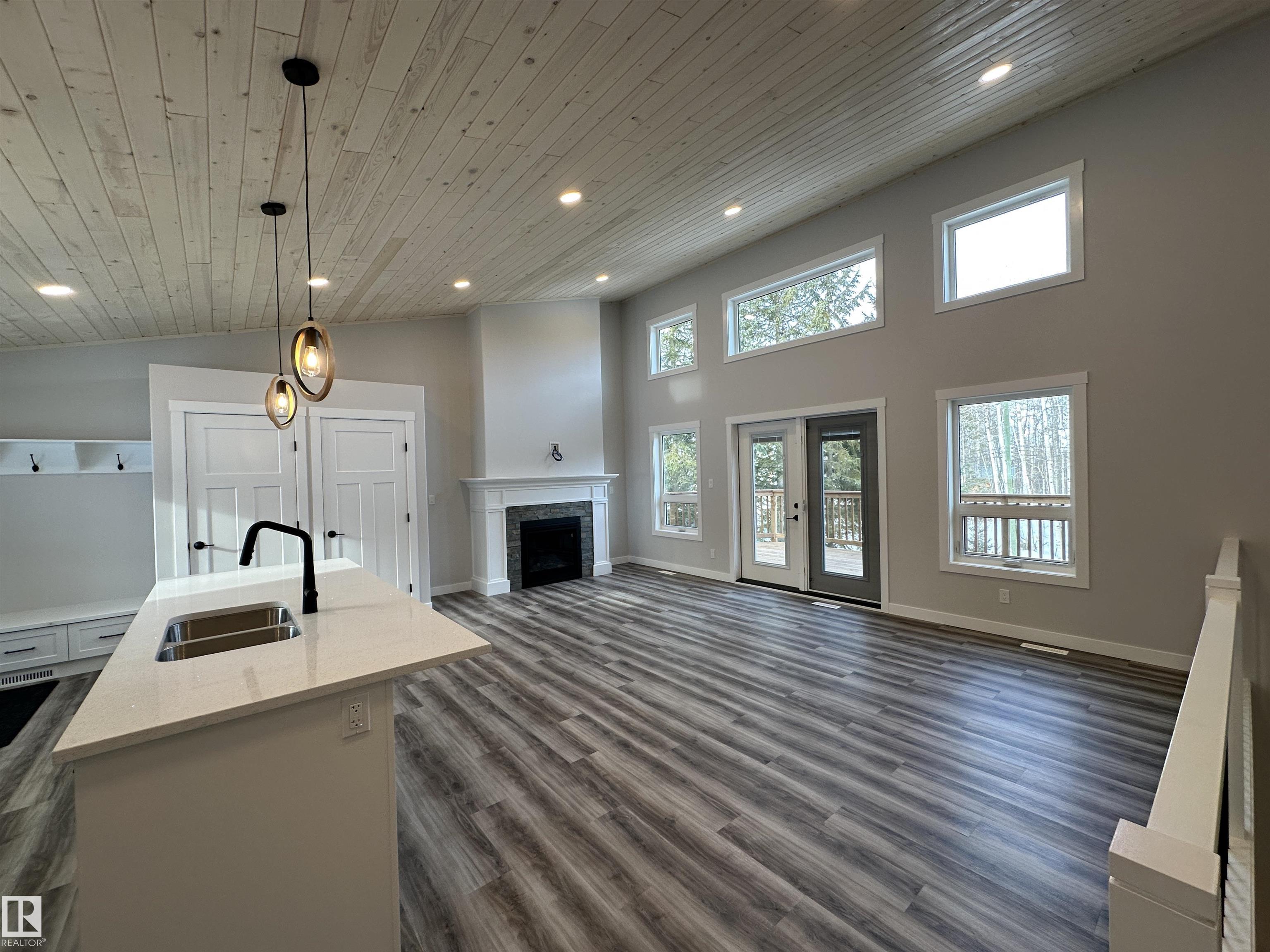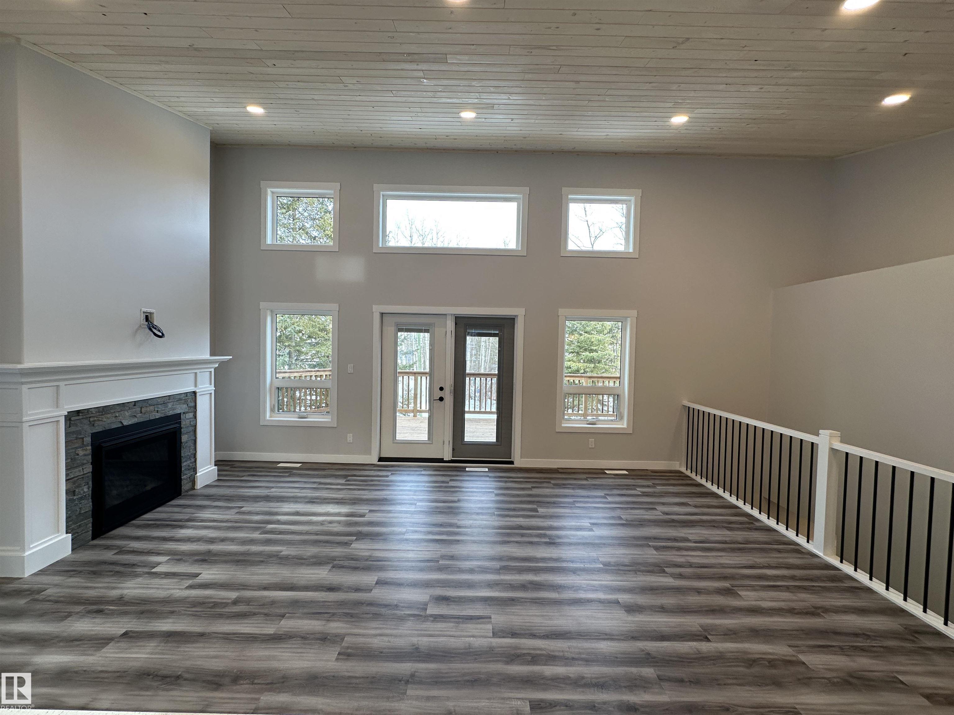 Under Construction and move in ready by Jan 31/26 ... Custom built 960 sqft raised bungalow with walkout basement garage. Wide open design, 14' vaulted pine tongue & groove ceiling, fireplace, luxury vinyl plank flooring, big windows w loads of natural light, 8' quartz topped peninsula island, shaker style kitchen cabinets, 4 piece stainless steel appliance package, walk-in pantry, 2 bedrooms up and 4 piece main bath. Stepping out of the vaulted great room, you're immersed in the peaceful sights and sounds of nature off your huge wrap around deck. The finished walkout basement has in-floor heat, 9' ceilings, primary suite with a 4 piece ensuite, laundry room, utility room and a 21 x 24 drywalled, taped and painted garage. 100 AMP power service, drilled well and a 2800 gallon septic holding tank. Tucked on a private, pie shaped lot surrounded by mature trees. Close to the shores of Isle Lake, the beach, boat launch and only 45 min west of Edm. Price includes GST, with rebate assigned back to the builder.