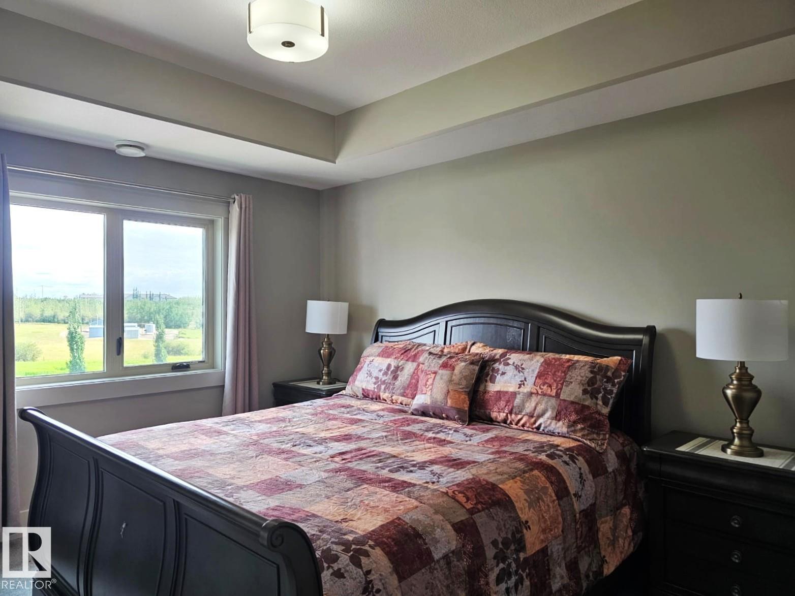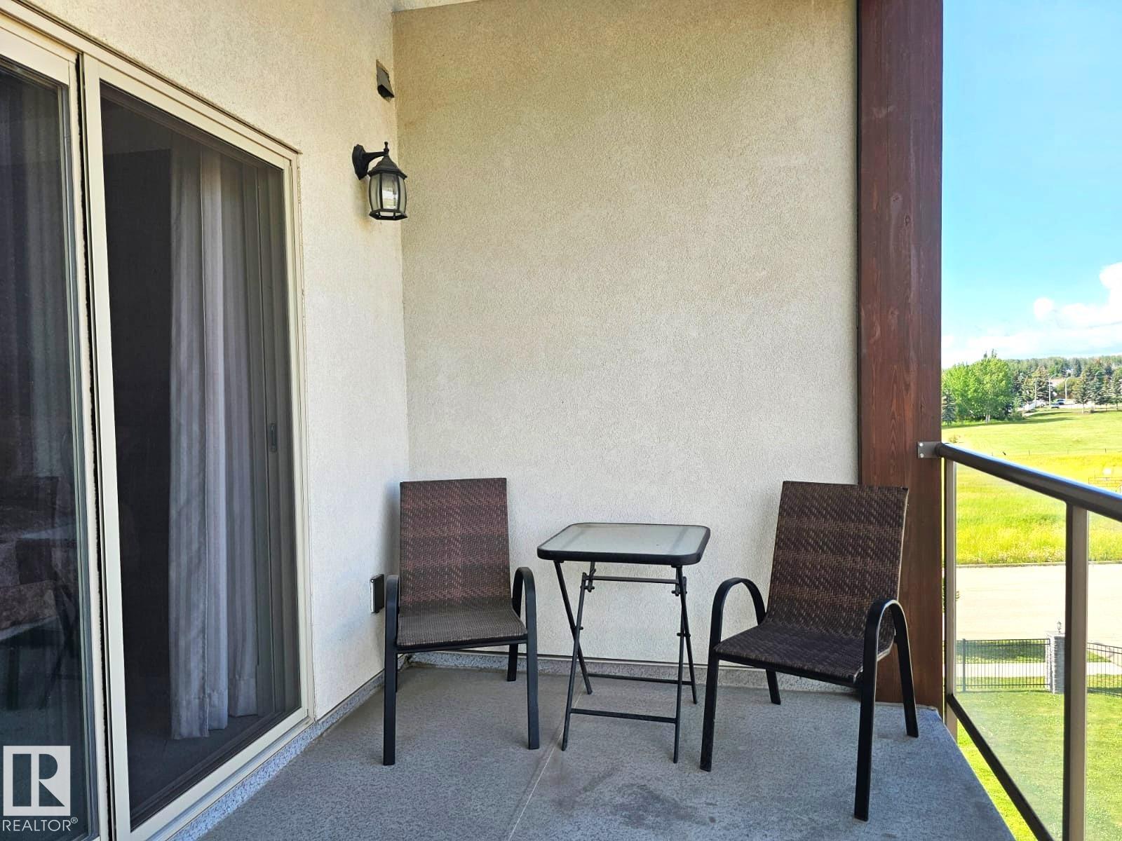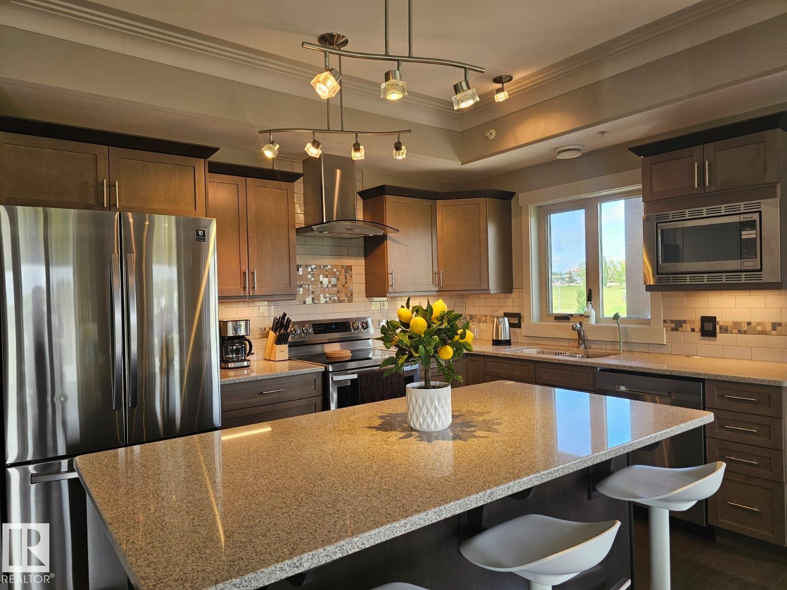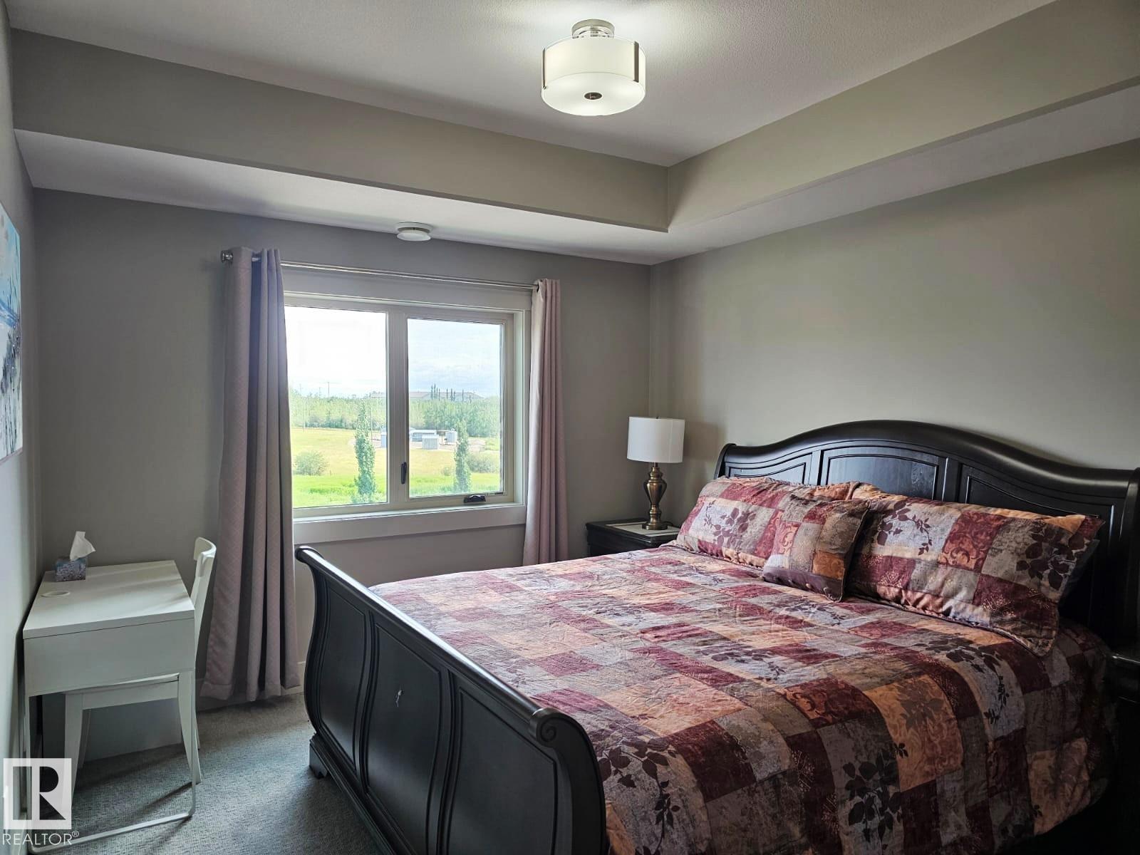 PENTHOUSE top floor unit in Ironwood Gates with southeast exposure and two spacious balconies! This large 3-bedroom, 1544 sq ft condo offers upscale living in one of Drayton Valley?s most desirable buildings. Featuring 9 ft ceilings, granite countertops, maple cabinetry, a cozy gas fireplace and crown mouldings, this home is both elegant and functional. The primary suite includes a functional ensuite with a frameless glass shower and dual body jets. Enjoy central A/C, triple-pane windows, and superior soundproofing throughout. Comes with 2 parking stalls (1 heated underground) and a 55 sq ft private storage unit. Building amenities include a fitness room, party/meeting space and outdoor terrace. Security is top-notch with gated entry and perimeter fencing. Condo fees include heat, water/sewer, reserve fund, exterior maintenance, and janitorial. A rare opportunity for space, comfort, and peace of mind in a well-managed building! EVERYTHING you see in this condo, stays!