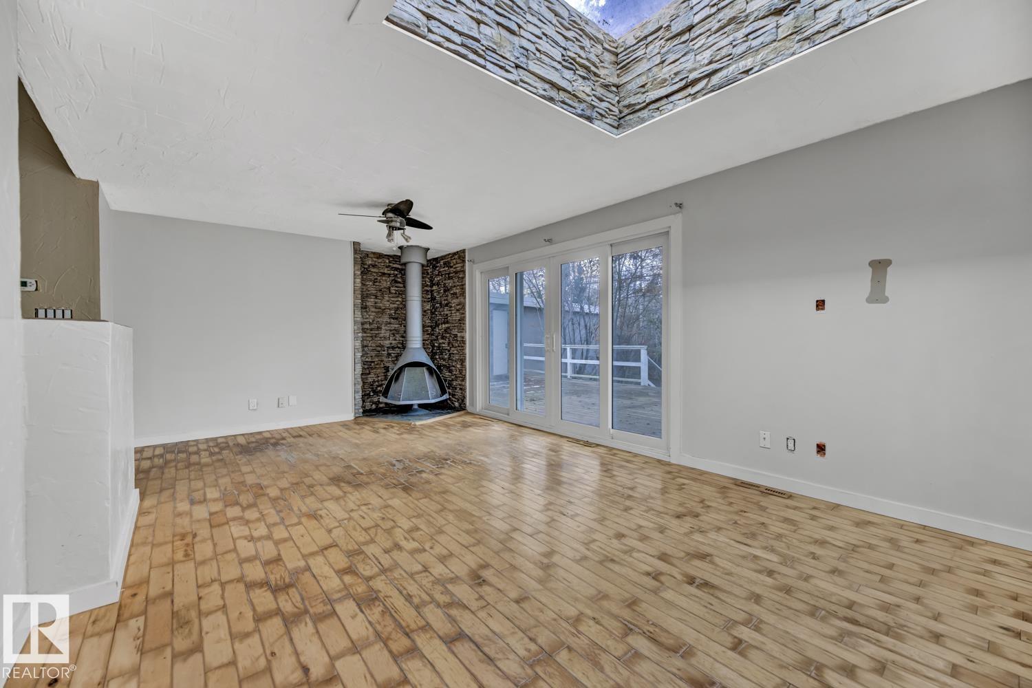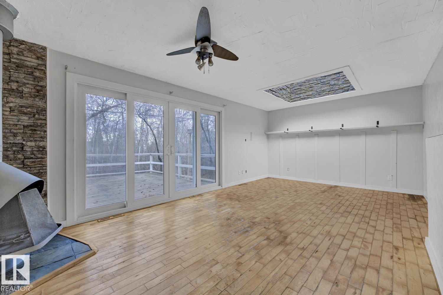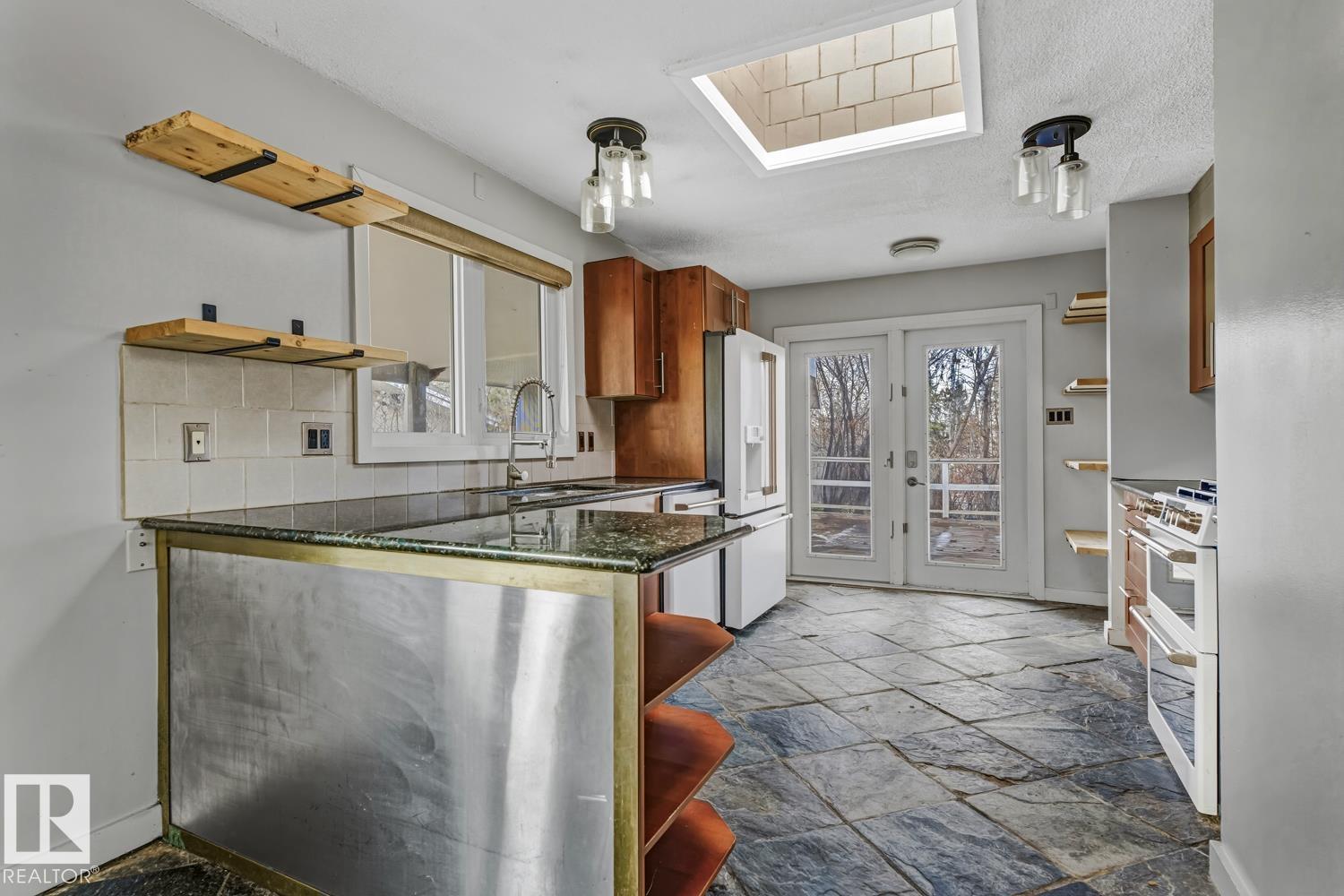 WELL SITUATED & BACKING ONTO GREEN SPACE! This 3 bed + 2 full baths 4 level-split home is located in mature Grandin on a quiet, tree-lined street! Main floor offers: spacious living room with hardwood floor, sky-light, wood burning fireplace and sliding door access to a huge outdoor deck. Efficient kitchen includes granite counter tops, slate tiles and deck access. Upstairs you will find 2 ample bedrooms and 4 pc bath. Lower level contains a huge bedroom with 3pc ensuite. Basement is partially finished with potential for additional bedroom. Upgrades include: newer roof on the house, windows, hot water tank and furnace. Fully fenced yard with single garage and car port. Walking distance to elementary school, playground, baseball and soccer fields. Quick access to amenities, St. Albert Trail and Anthony Henday Drive. QUICK POSSESSION!