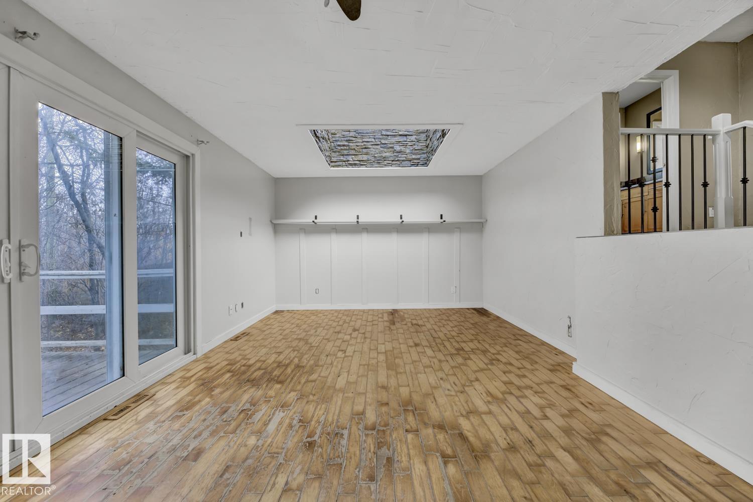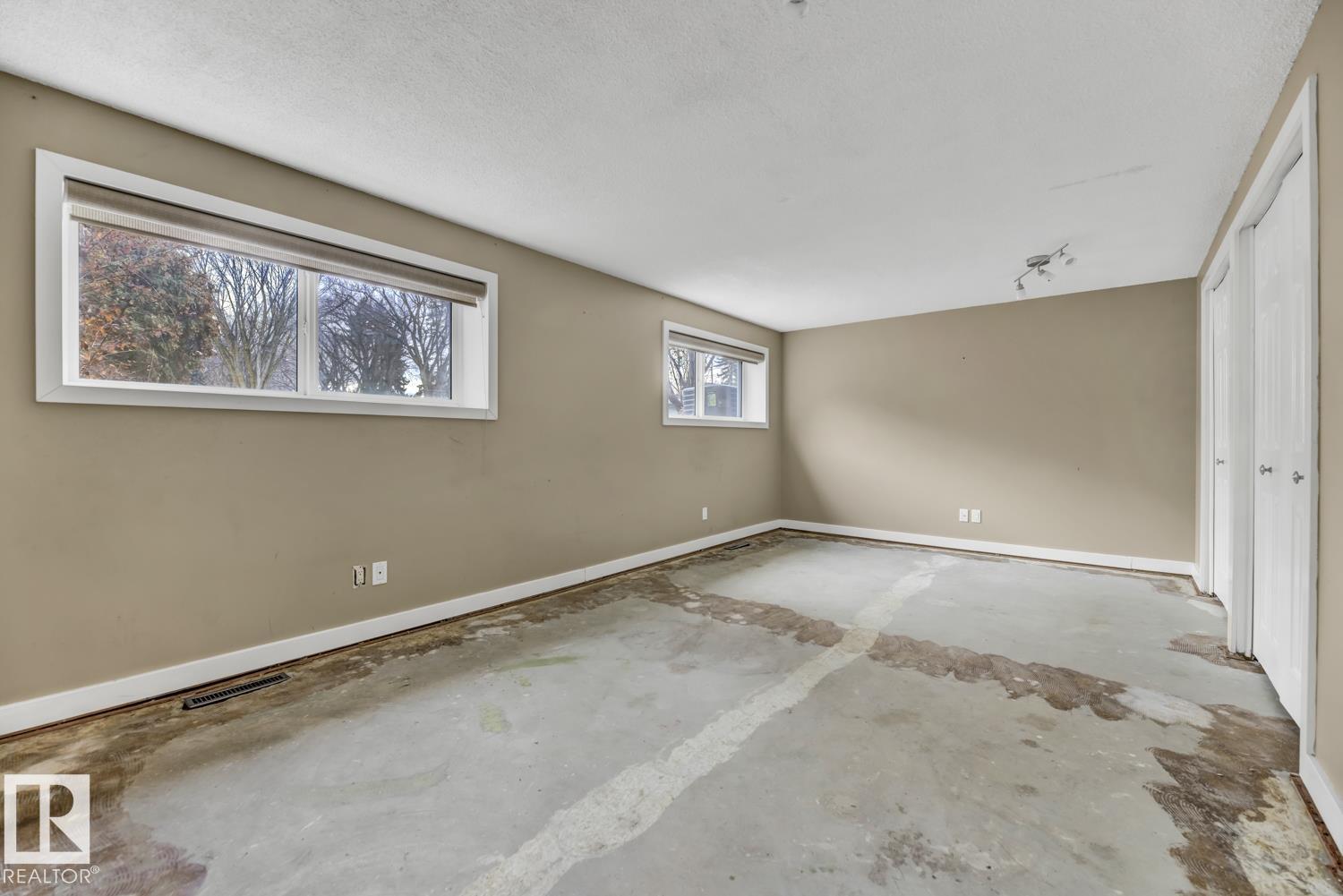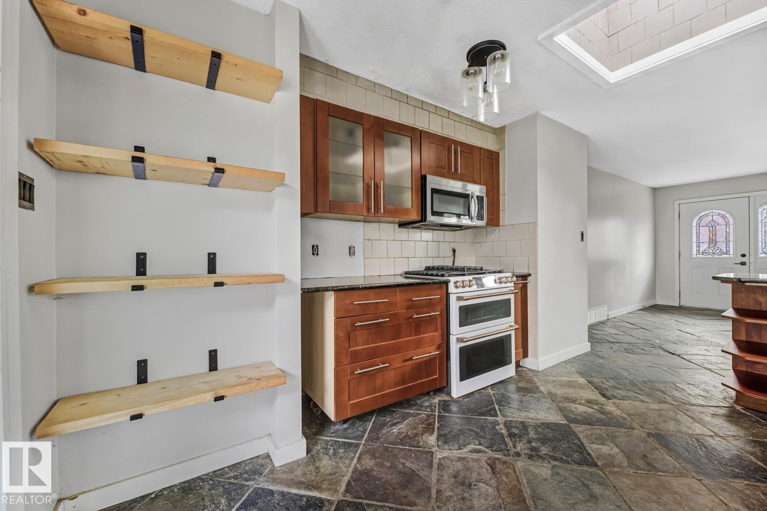 WELL SITUATED & BACKING ONTO GREEN SPACE! This 3 bed + 2 full baths 4 level-split home is located in mature Grandin on a quiet, tree-lined street! Main floor offers: spacious living room with hardwood floor, sky-light, wood burning fireplace and sliding door access to a huge outdoor deck. Efficient kitchen includes granite counter tops, slate tiles and deck access. Upstairs you will find 2 ample bedrooms and 4 pc bath. Lower level contains a huge bedroom with 3pc ensuite. Basement is partially finished with potential for additional bedroom. Upgrades include: newer roof on the house, windows, hot water tank and furnace. Fully fenced yard with single garage and car port. Walking distance to elementary school, playground, baseball and soccer fields. Quick access to amenities, St. Albert Trail and Anthony Henday Drive. QUICK POSSESSION!