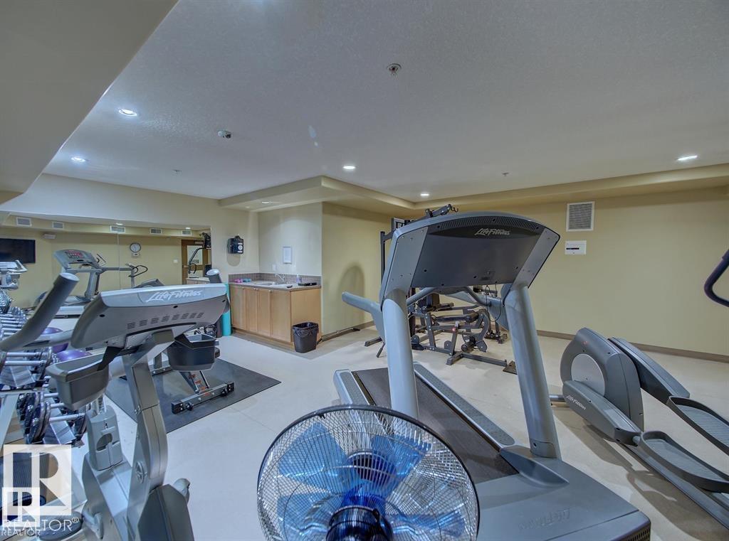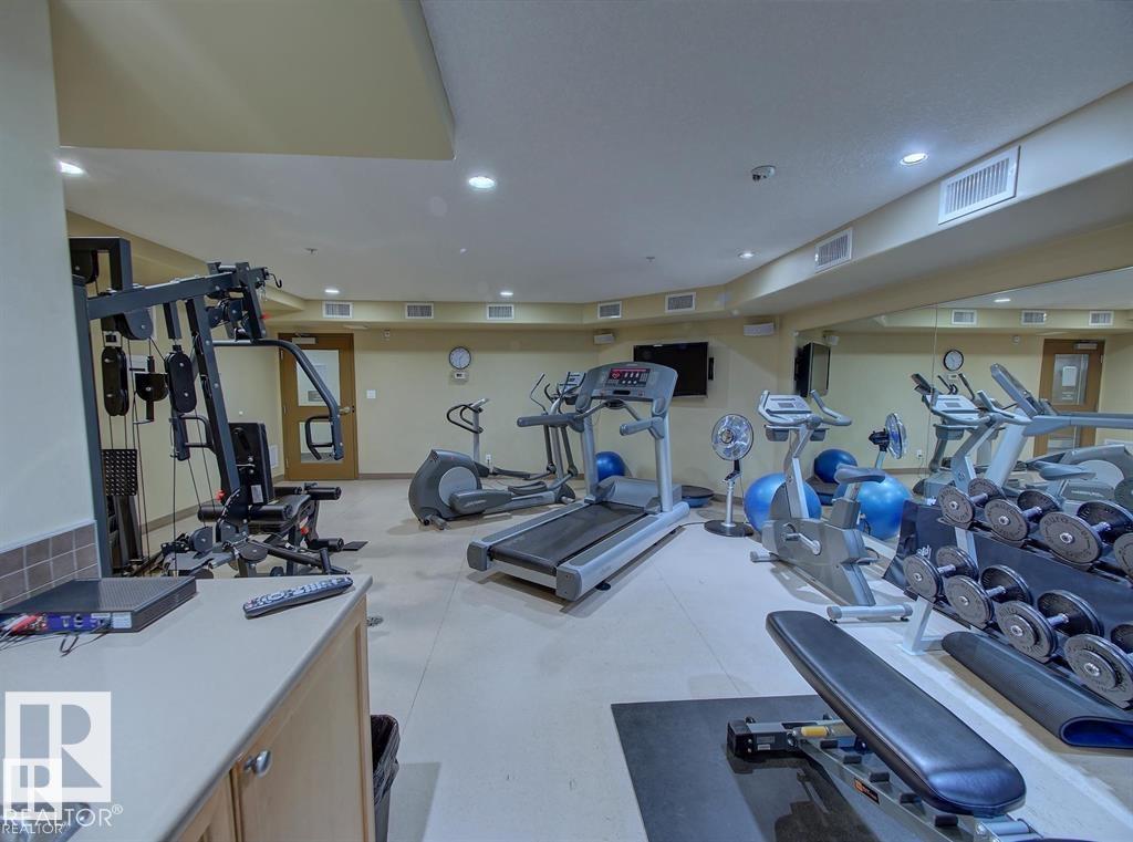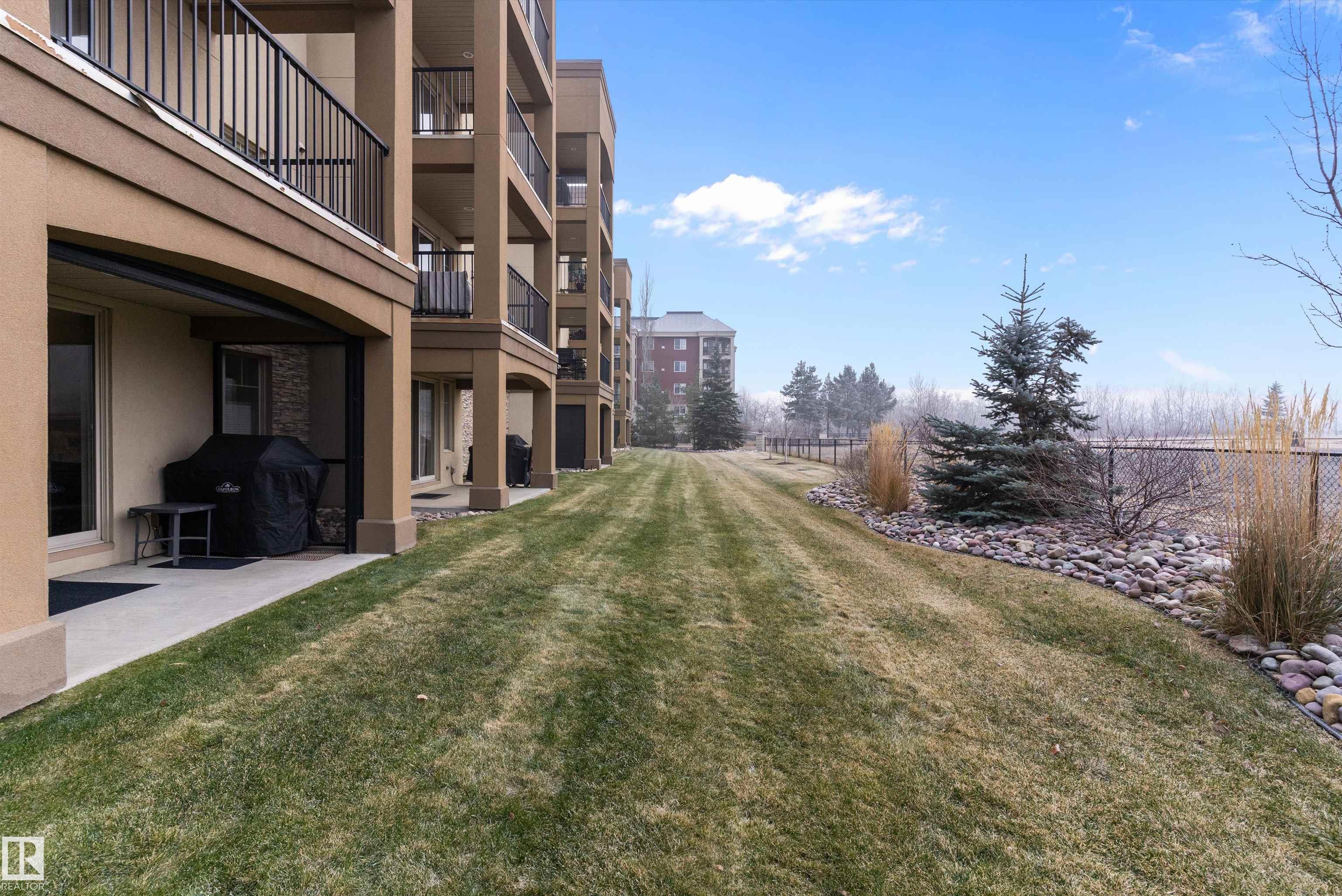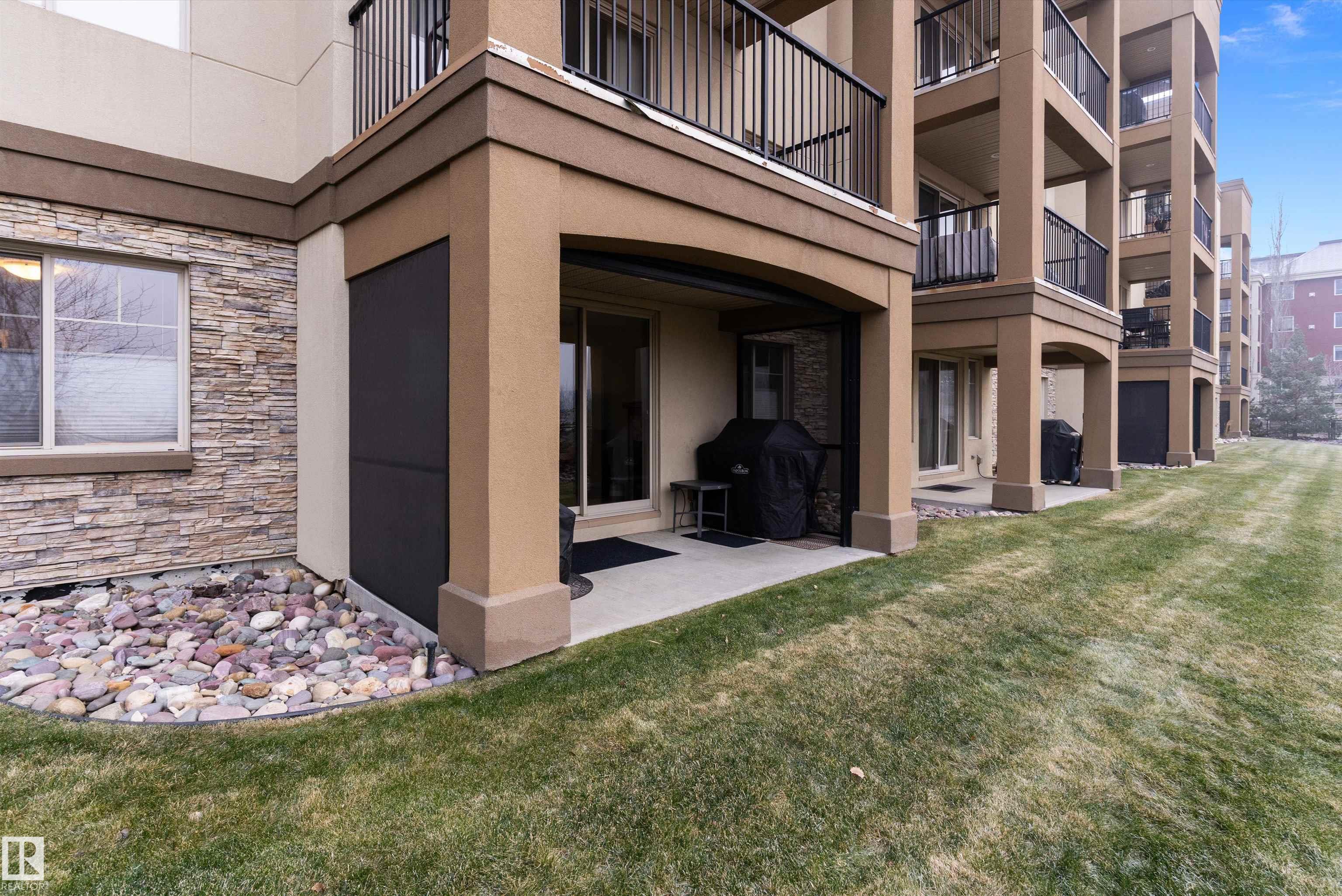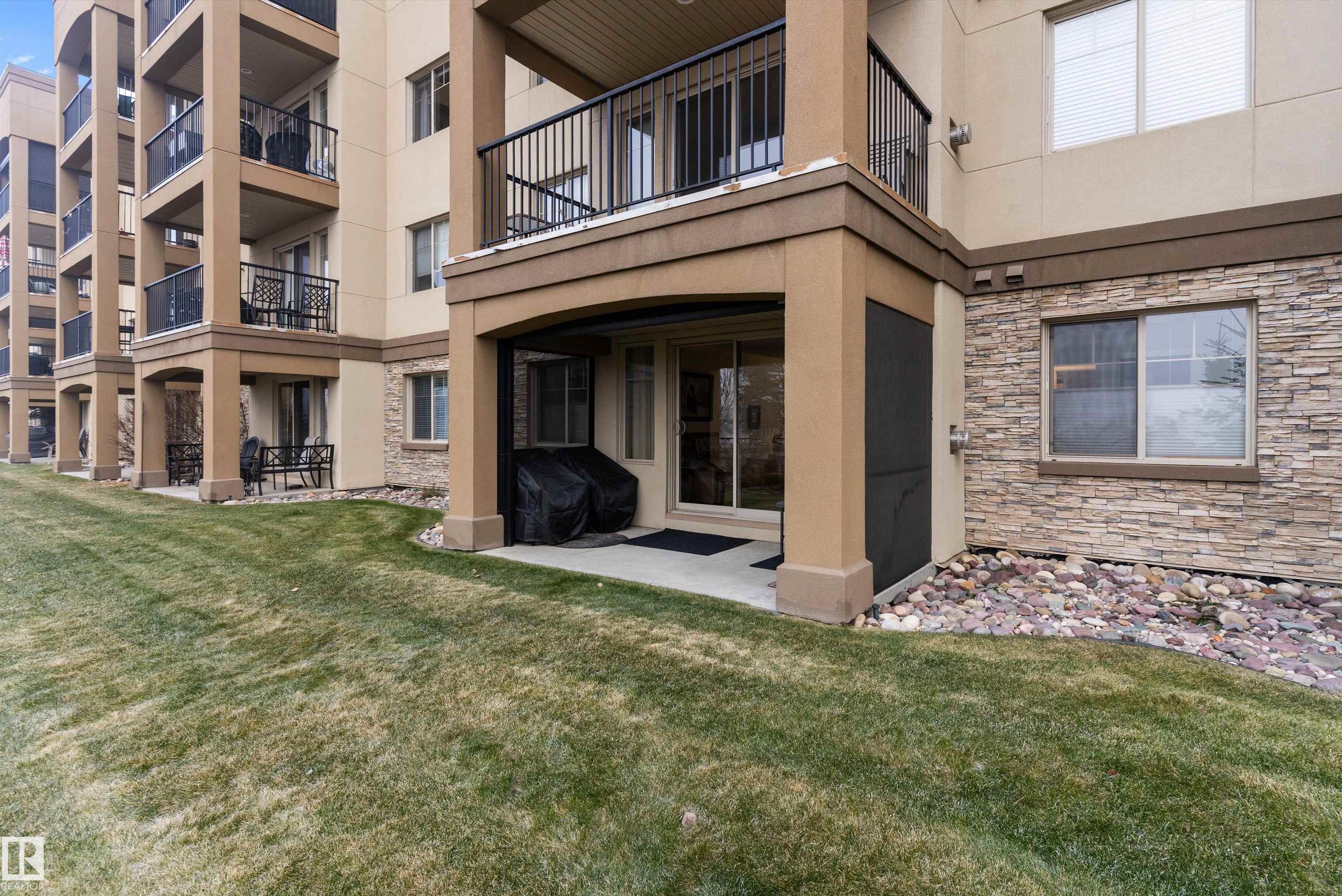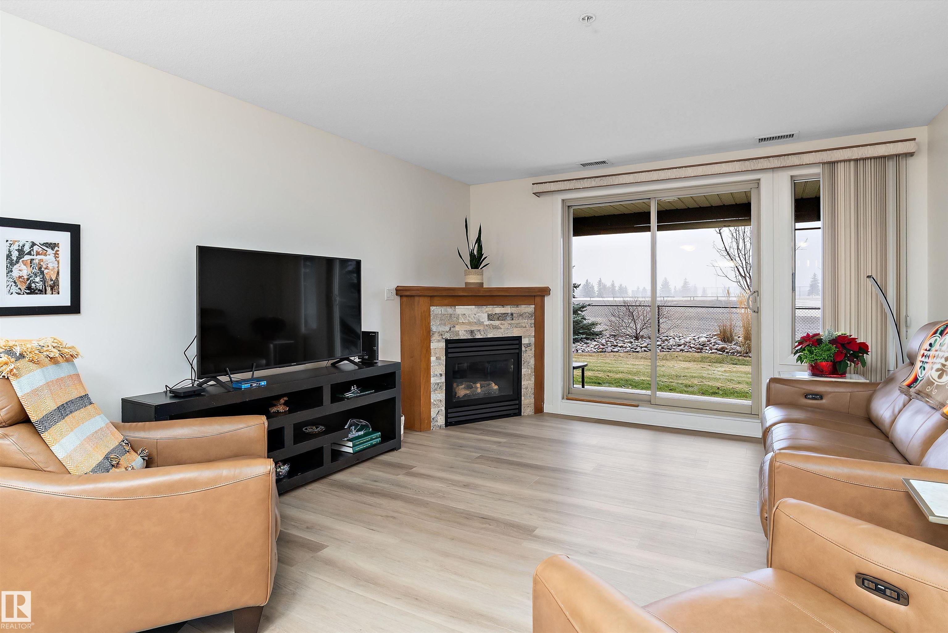 IMMACULATE 2 bedroom + 2 bathroom situated halfway between the north and south entrances which offers VERY QUIET LIVING free of elevator/lobby noise. Along with quick/easy access to the parkade or front entrances. THE OWNERS LIKE: their UNDERGROUND PARKING STALL, not having to wait for elevators, GRANITE COUNTERTOPS, the WEST FACING PATIO w/screens offering privacy that regulate wind and sun exposure. ALSO: Emerald Hills shopping center, easy access to bike / walking trails, cross country skiing, birdwatching, Edmonton, Elk Island National Park, Cooking Lake and Strathcona Wilderness Center. Total upgrades May, 2024-October, 2025 = $24,853. NEW GE appliances July/Aug 2025 ($8700), CUSTOM MADE patio enclosure installed Dec, 2024 ($6700), New luxury vinyl plank flooring (June, 2025 - $6653.00), PROFESSIONAL PAINTING of suite May 2024 ($2000), Natural stone on fireplace Oct 2025($800). Building features: GUEST SUITES, GAMES room, THEATRE room, FITNESS room, SAUNA + STEAM rooms, LIBRARIES, and CAR WASH.