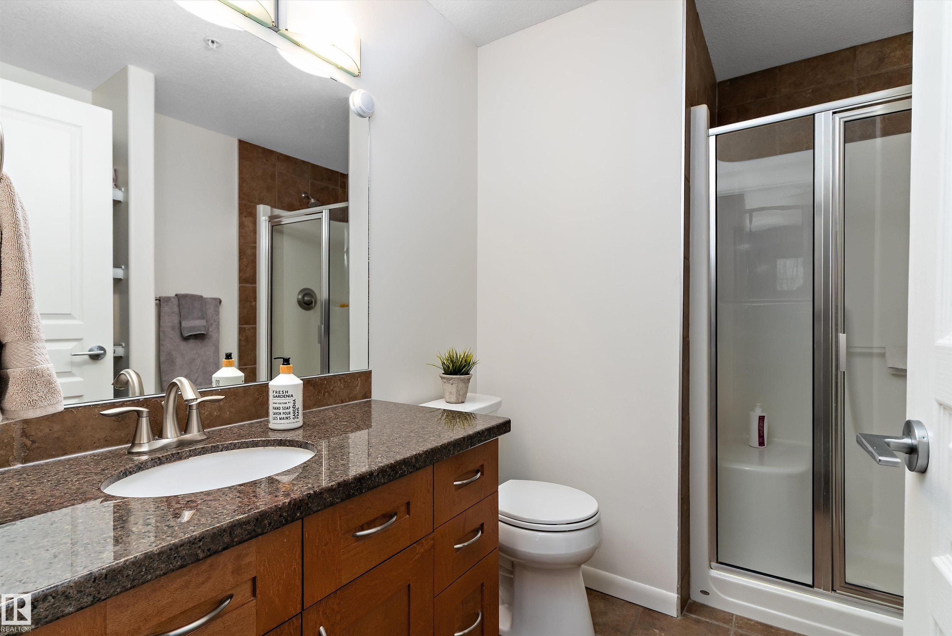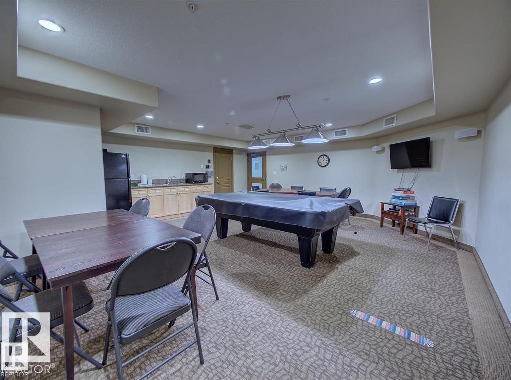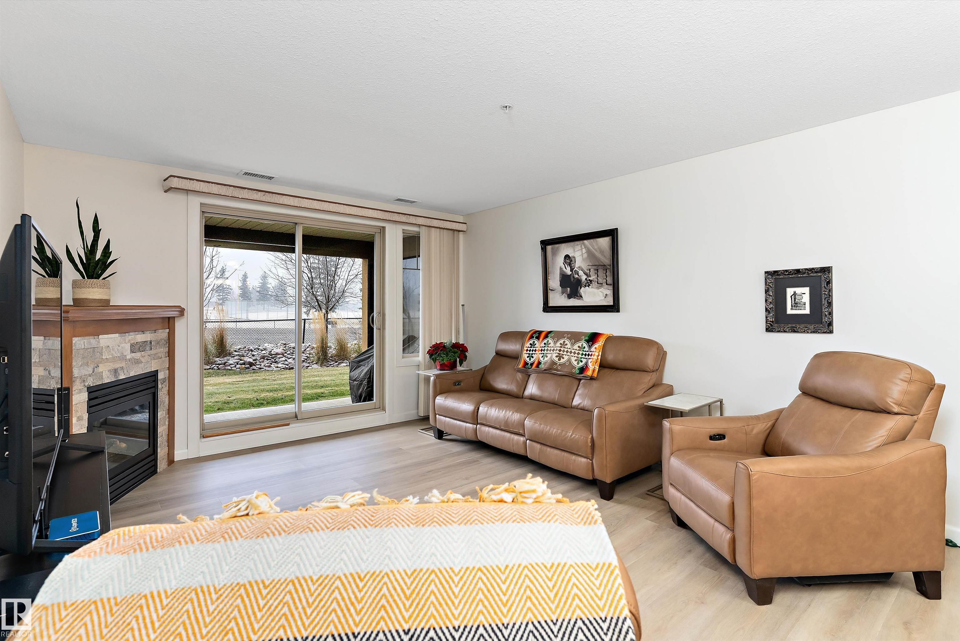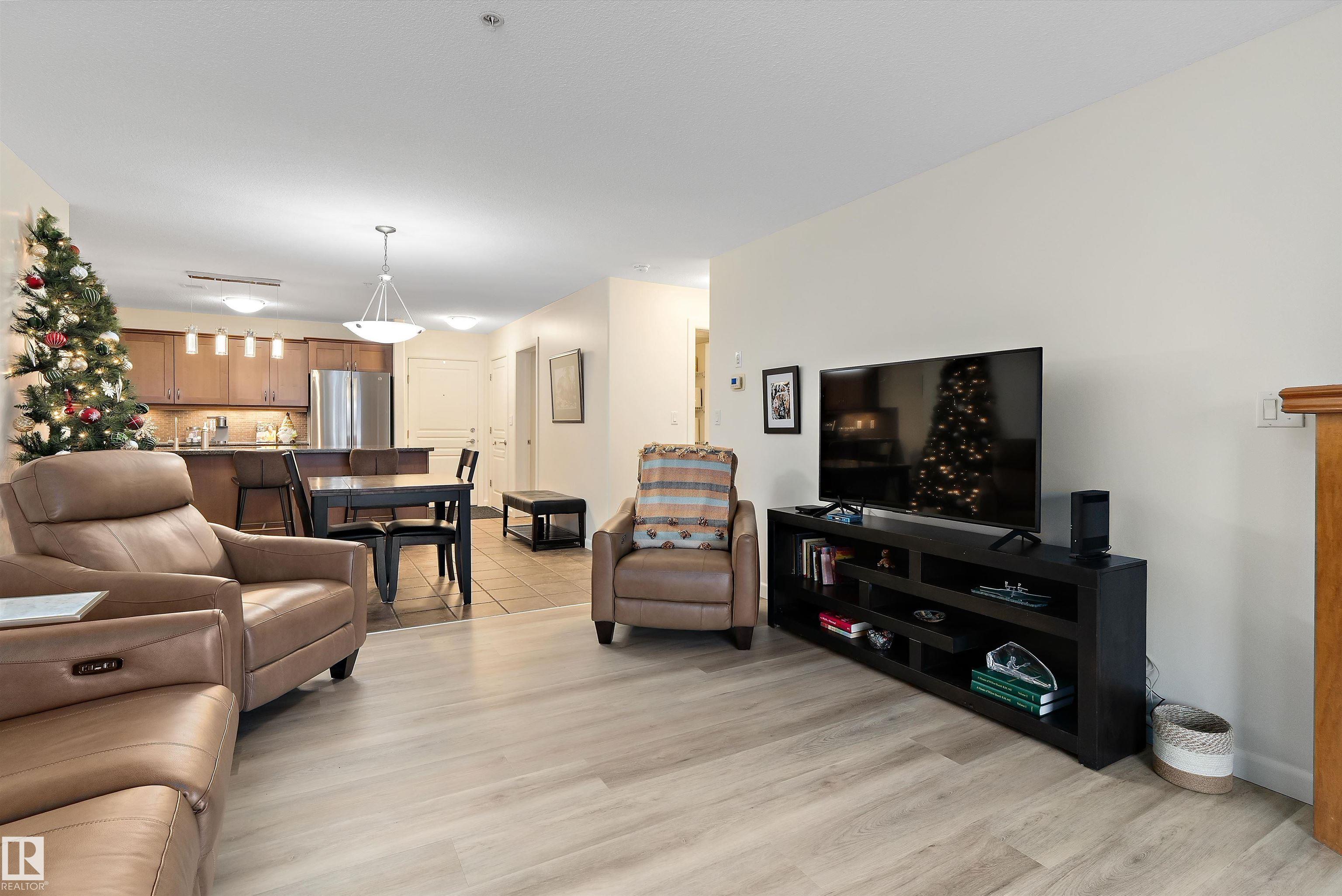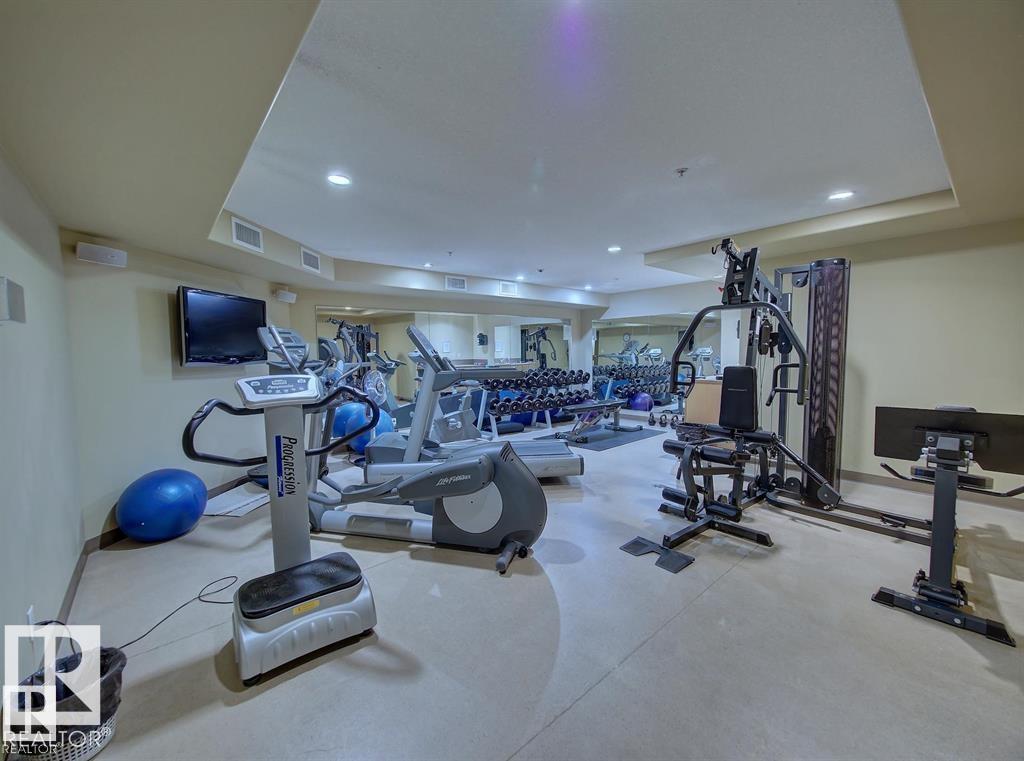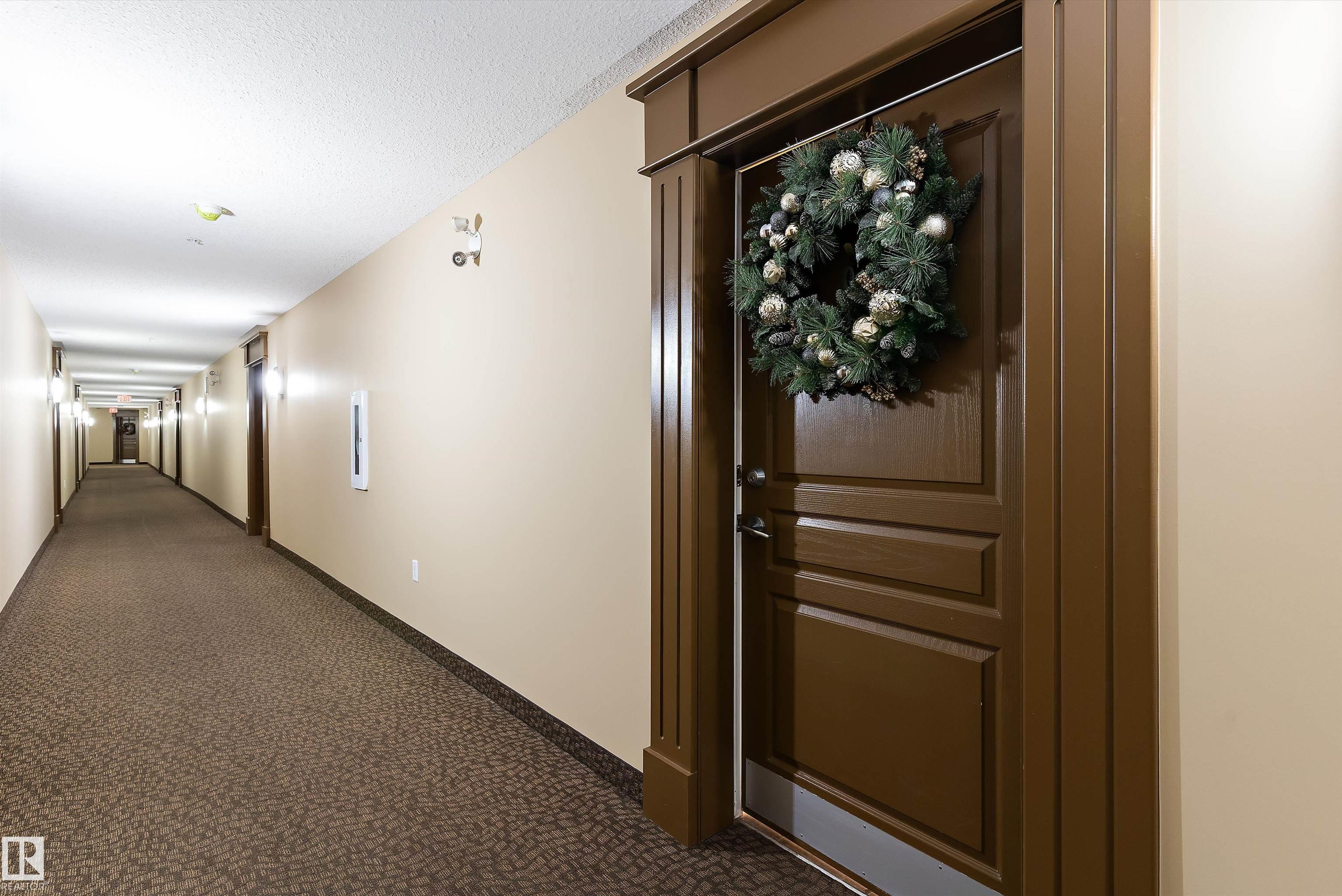 IMMACULATE 2 bedroom + 2 bathroom situated halfway between the north and south entrances which offers VERY QUIET LIVING free of elevator/lobby noise. Along with quick/easy access to the parkade or front entrances. THE OWNERS LIKE: their UNDERGROUND PARKING STALL, not having to wait for elevators, GRANITE COUNTERTOPS, the WEST FACING PATIO w/screens offering privacy that regulate wind and sun exposure. ALSO: Emerald Hills shopping center, easy access to bike / walking trails, cross country skiing, birdwatching, Edmonton, Elk Island National Park, Cooking Lake and Strathcona Wilderness Center. Total upgrades May, 2024-October, 2025 = $24,853. NEW GE appliances July/Aug 2025 ($8700), CUSTOM MADE patio enclosure installed Dec, 2024 ($6700), New luxury vinyl plank flooring (June, 2025 - $6653.00), PROFESSIONAL PAINTING of suite May 2024 ($2000), Natural stone on fireplace Oct 2025($800). Building features: GUEST SUITES, GAMES room, THEATRE room, FITNESS room, SAUNA + STEAM rooms, LIBRARIES, and CAR WASH.