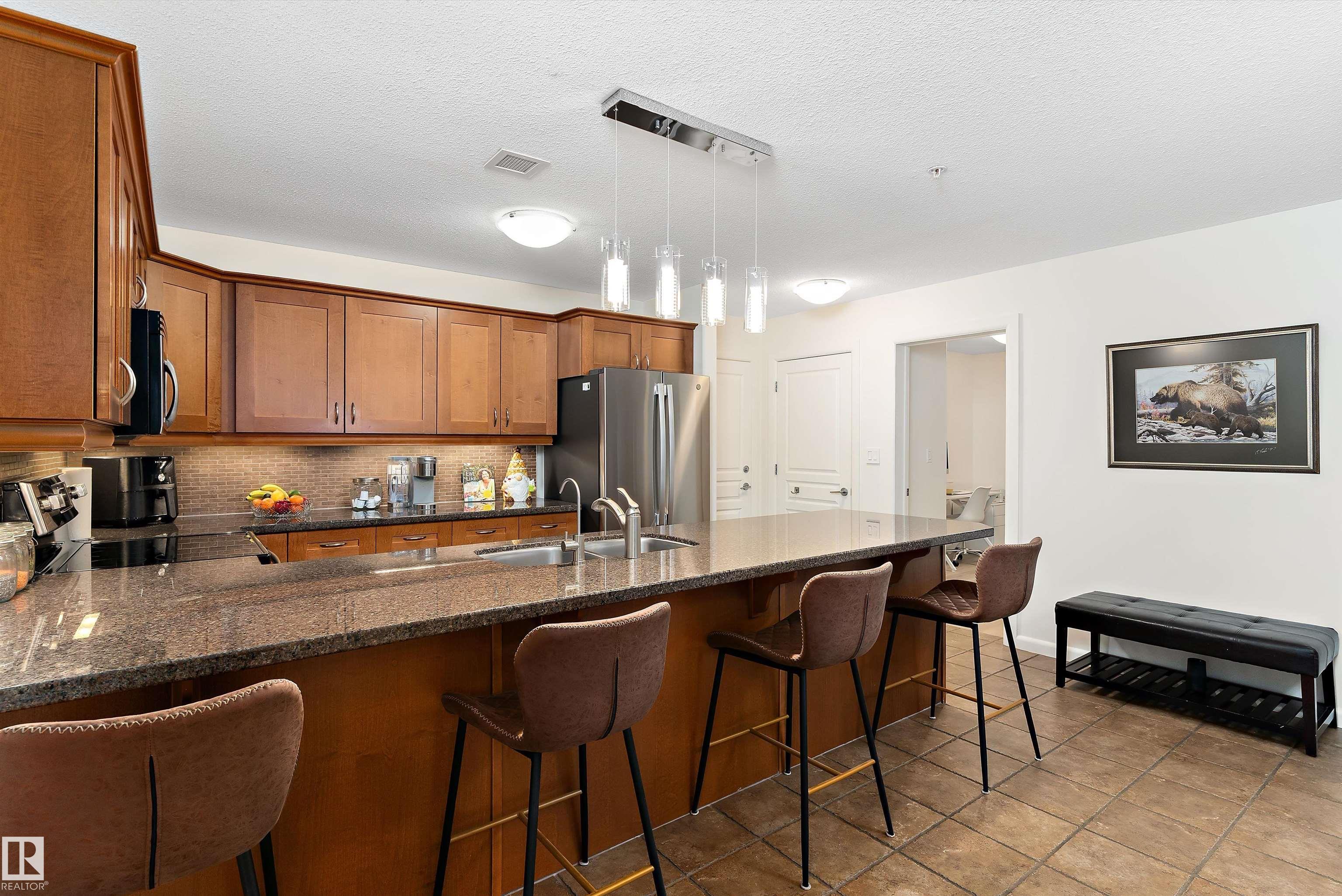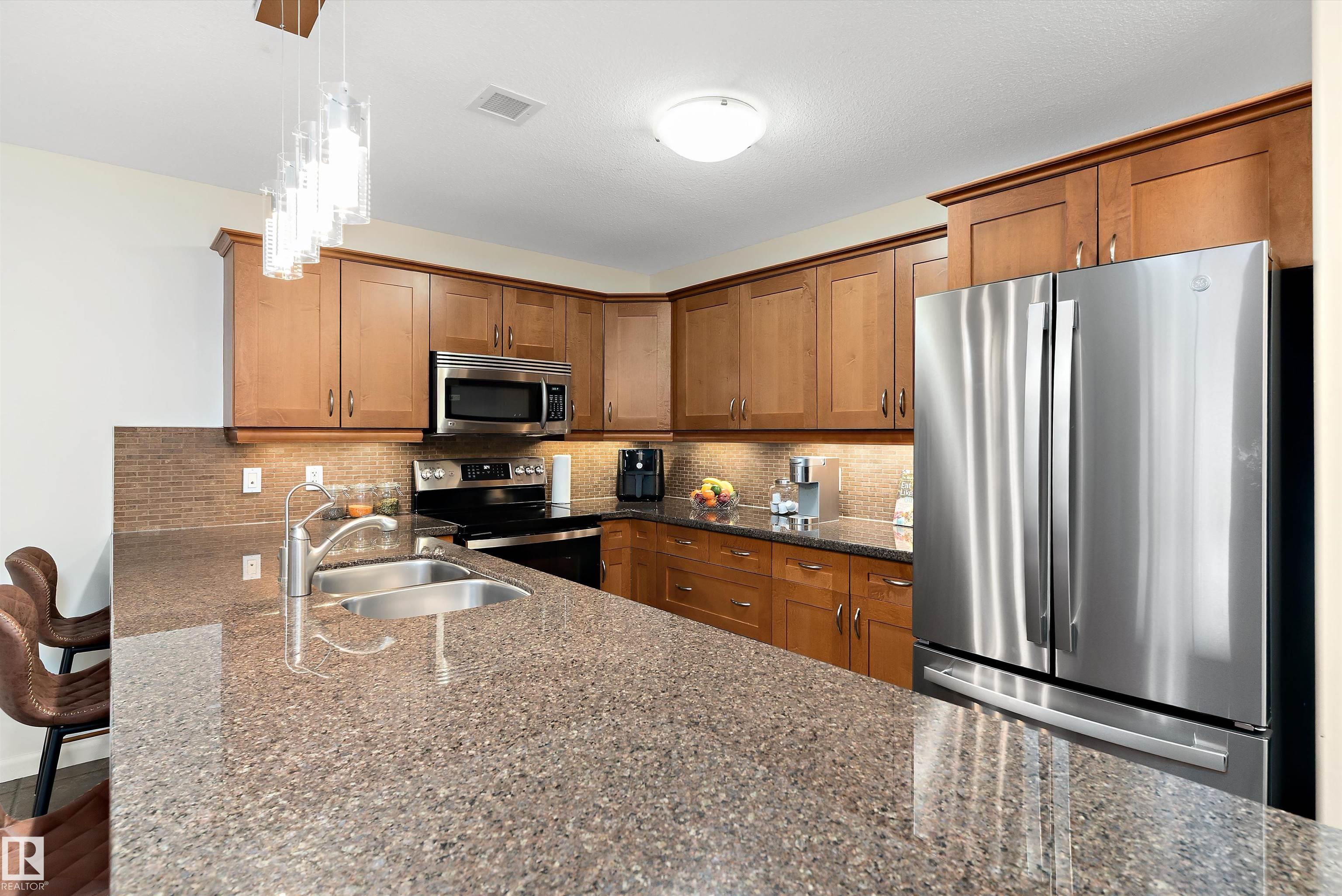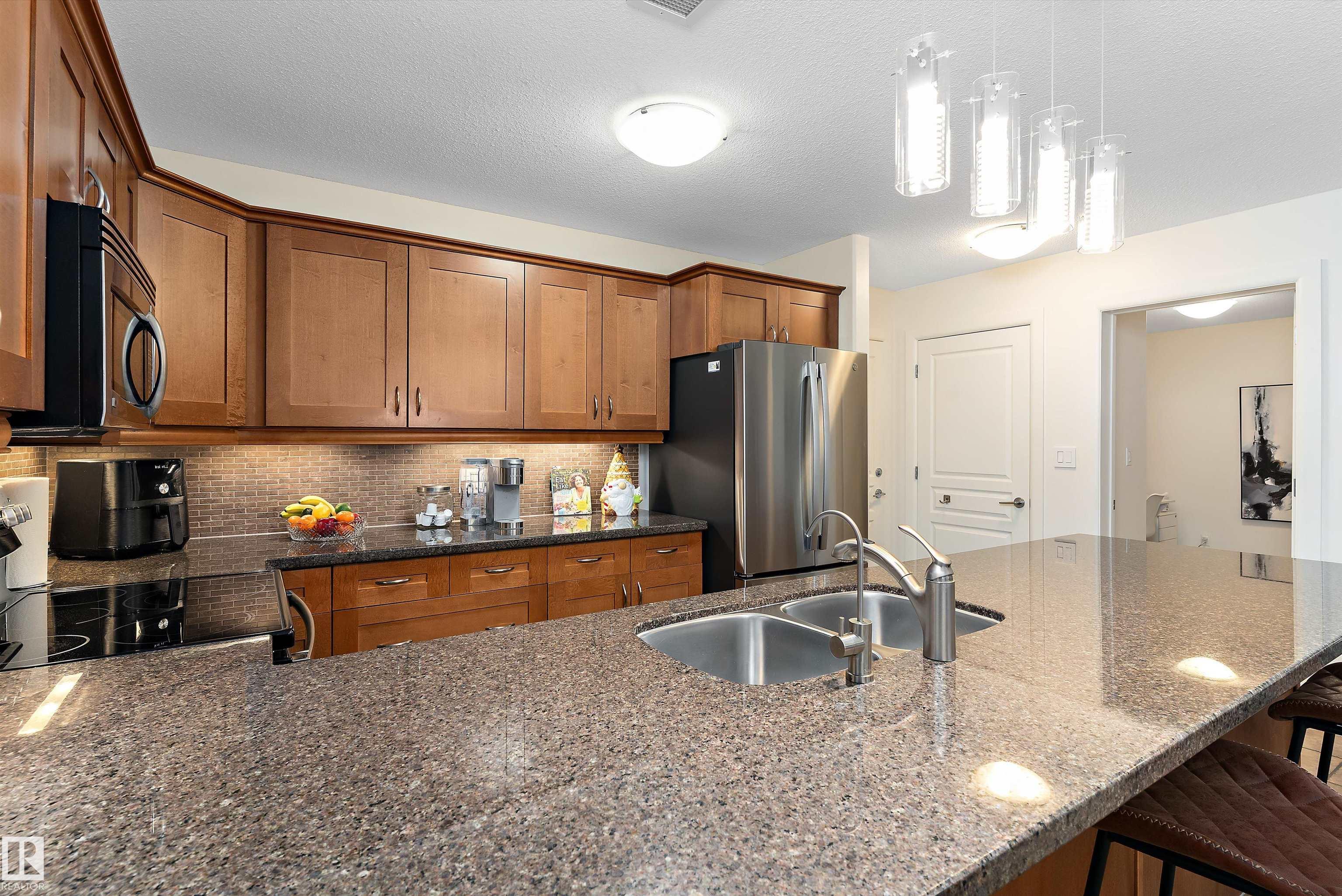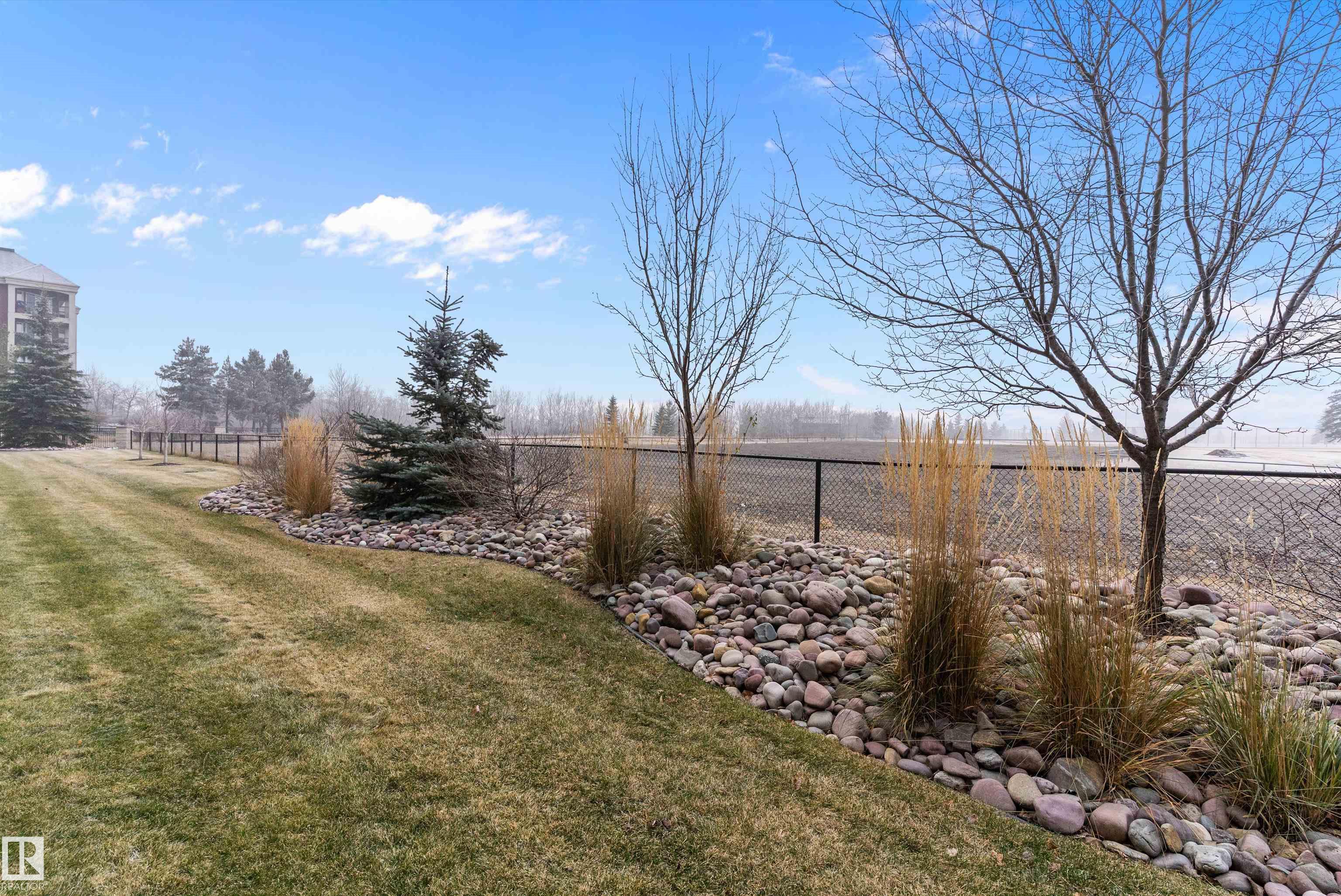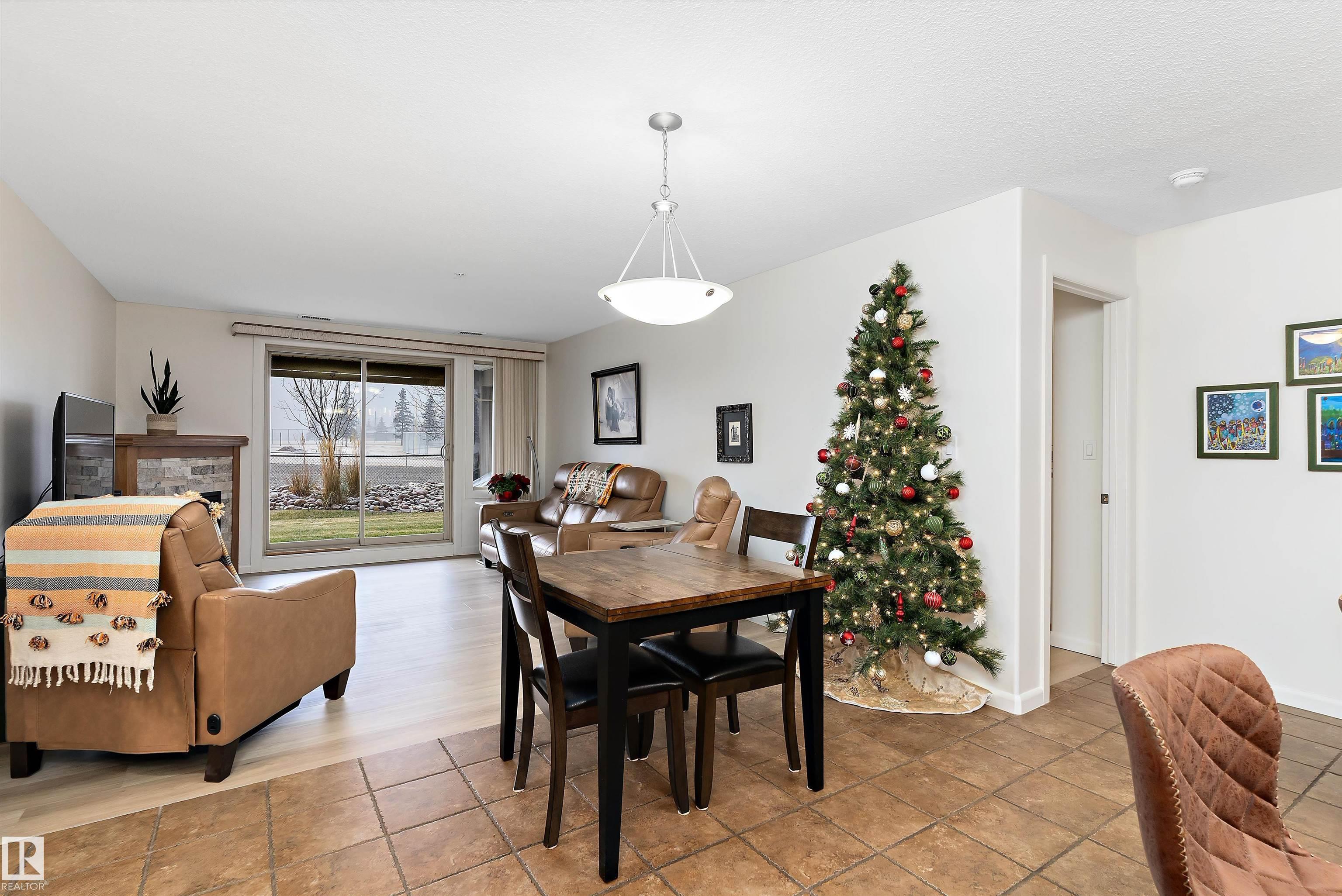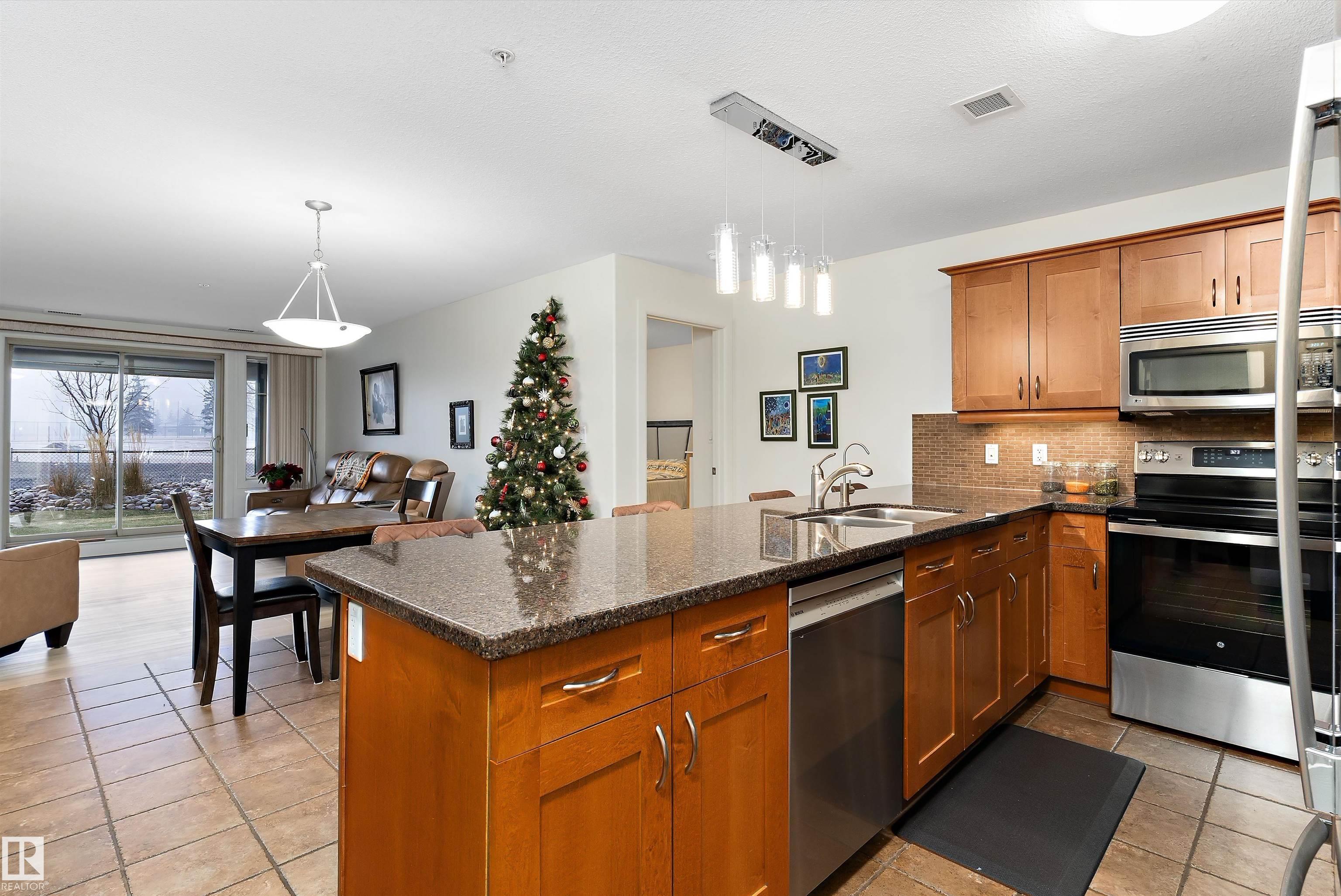 IMMACULATE 2 bedroom + 2 bathroom situated halfway between the north and south entrances which offers VERY QUIET LIVING free of elevator/lobby noise. Along with quick/easy access to the parkade or front entrances. THE OWNERS LIKE: their UNDERGROUND PARKING STALL, not having to wait for elevators, GRANITE COUNTERTOPS, the WEST FACING PATIO w/screens offering privacy that regulate wind and sun exposure. ALSO: Emerald Hills shopping center, easy access to bike / walking trails, cross country skiing, birdwatching, Edmonton, Elk Island National Park, Cooking Lake and Strathcona Wilderness Center. Total upgrades May, 2024-October, 2025 = $24,853. NEW GE appliances July/Aug 2025 ($8700), CUSTOM MADE patio enclosure installed Dec, 2024 ($6700), New luxury vinyl plank flooring (June, 2025 - $6653.00), PROFESSIONAL PAINTING of suite May 2024 ($2000), Natural stone on fireplace Oct 2025($800). Building features: GUEST SUITES, GAMES room, THEATRE room, FITNESS room, SAUNA + STEAM rooms, LIBRARIES, and CAR WASH.