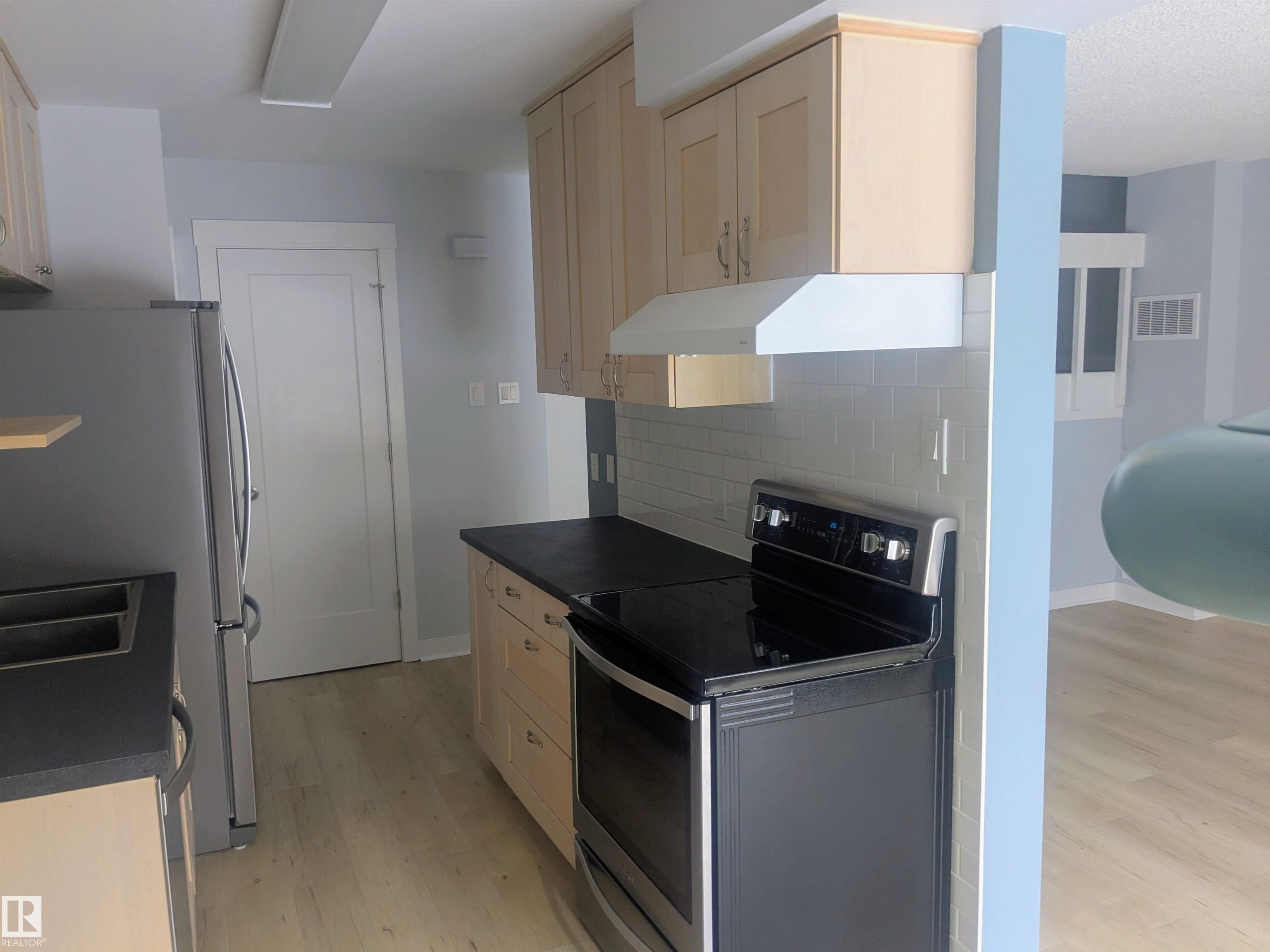 WOW! Fantastic END unit townhome that is move in ready; Perfect for first time home buyers, young couples or even those looking to downsize. Well run complex with reasonable condo fees in a great location close to new LRT, West Edmonton Mall and multiple schools. VERY RARE renovated unit that also comes with a large backyard. New vinyl plank throughout the main floor, fresh paint, trim and light fixtures. Updated kitchen including new countertops, double sink, tiled backsplash, stainless steel appliances and an oversized pantry. Upstairs features renovated bathroom with new tub, tile, vanity and floor. There are also 2 large bedrooms with double closets, including one room with custom closet cabinet and shelving. Basement is mostly finished with L-shaped living room and oversized storage room adding to the total square footage. Beautiful well maintained east facing backyard perfect for entertaining or relaxing in the sun. BONUS air conditioning as well. This is a must see as it wont last long!