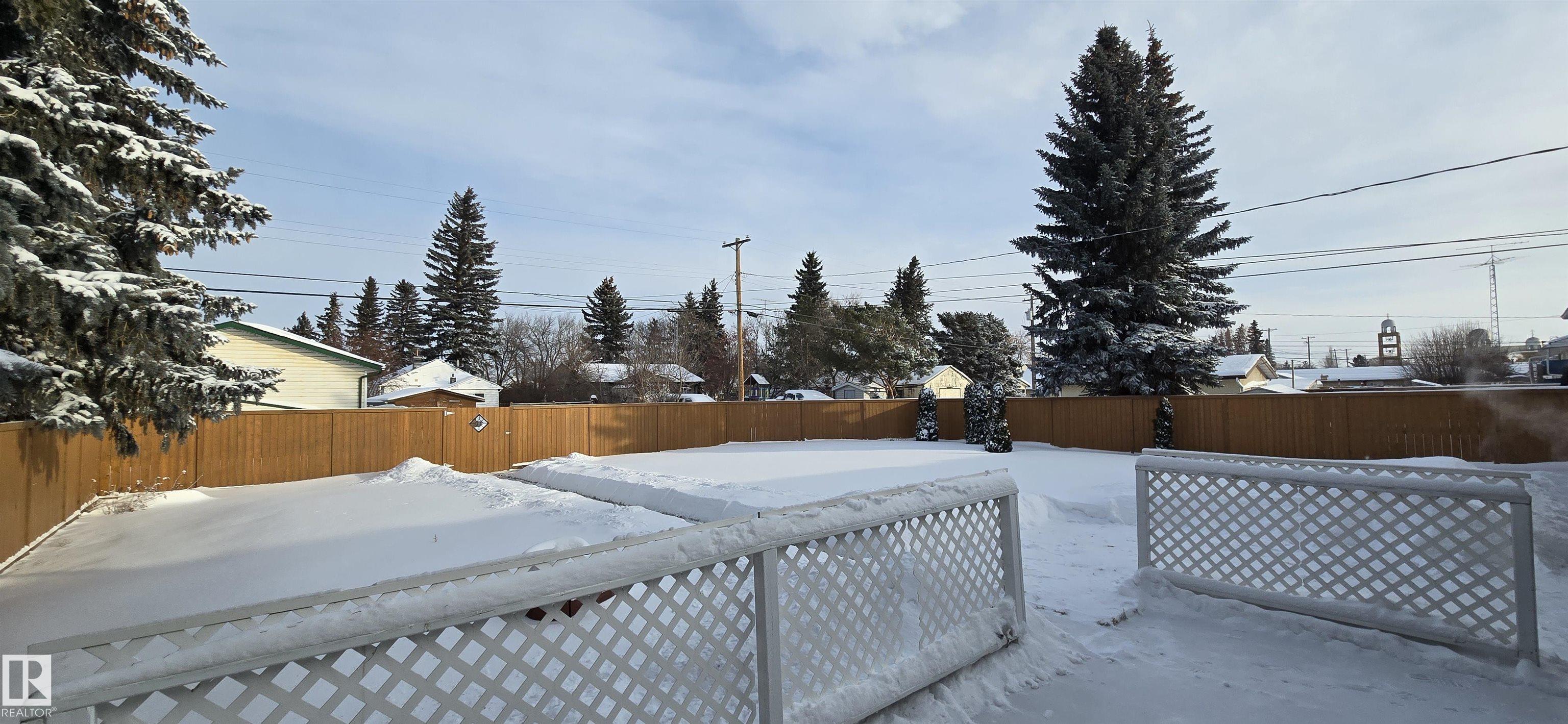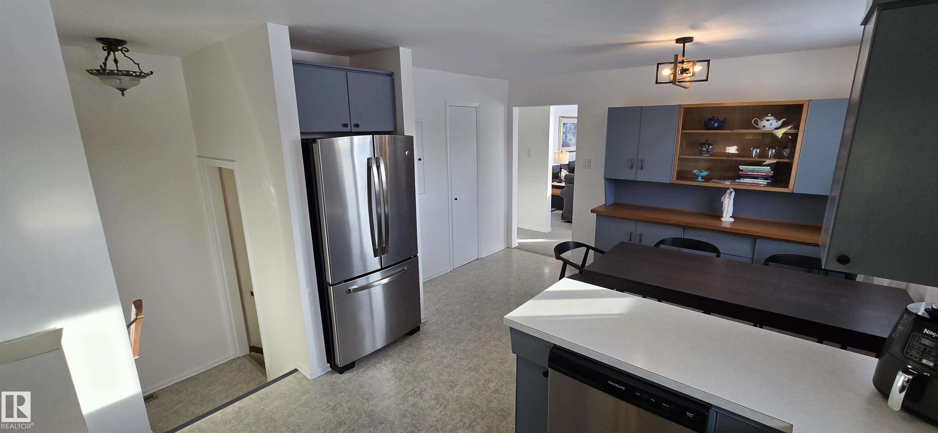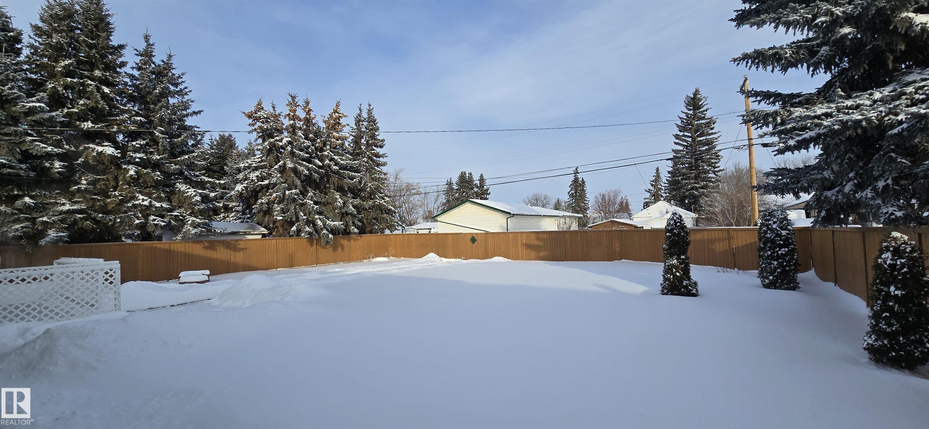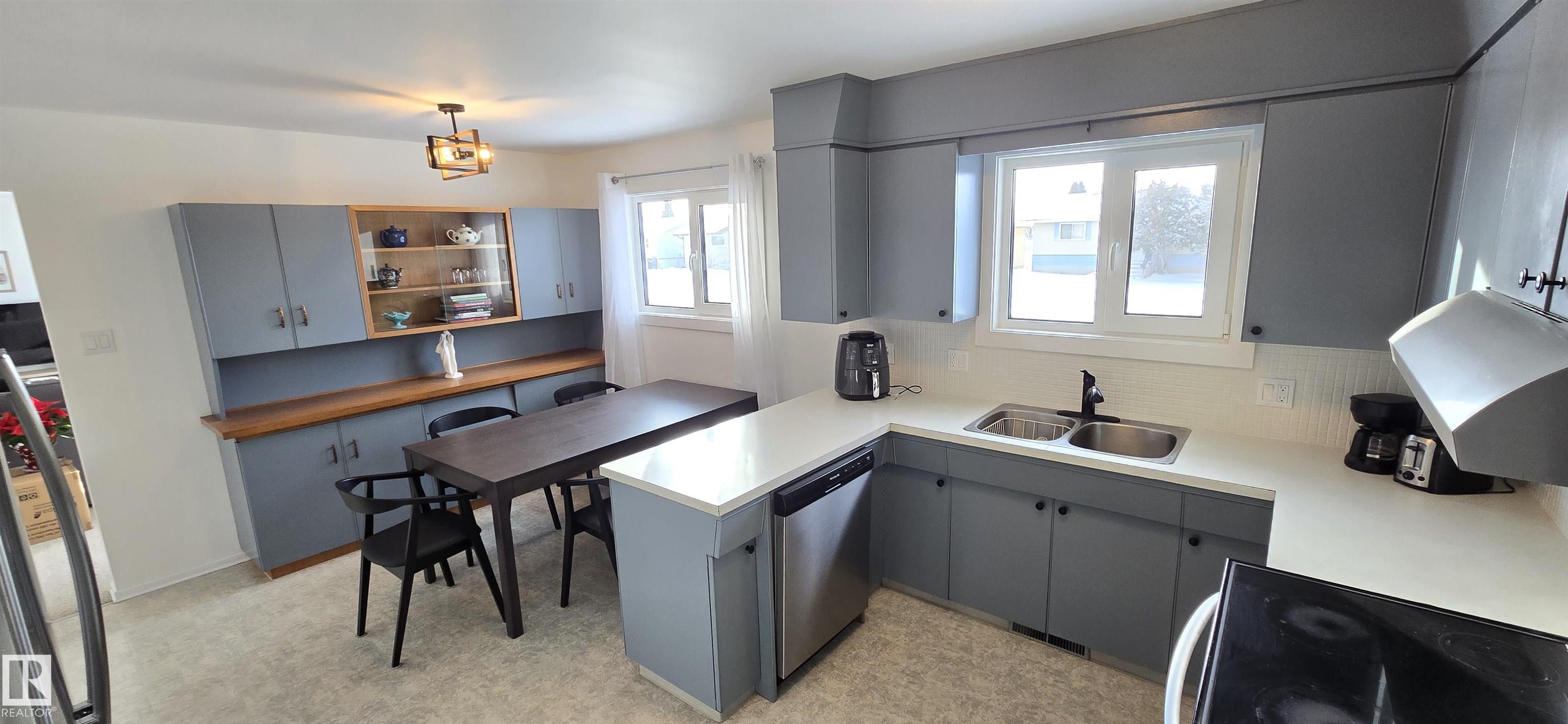 Fresh and clean family bungalow in choice neighborhood! Recent renovations with 5 PERMASOL windows, paint (including kitchen cupboards), stainless appliances, plumbing/electrical fixtures, 2 bathrooms, sump pump, furnace, fence, shingles, vinyl siding garage door and closed in breezeway. Walking distance to 3 schools, playground and amenities. A MASSIVE lot and half with Back alley access, fire pit and a patio area with privacy walls. Single attached garage. Located in Vegreville, 45 minutes east of Sherwood Park.