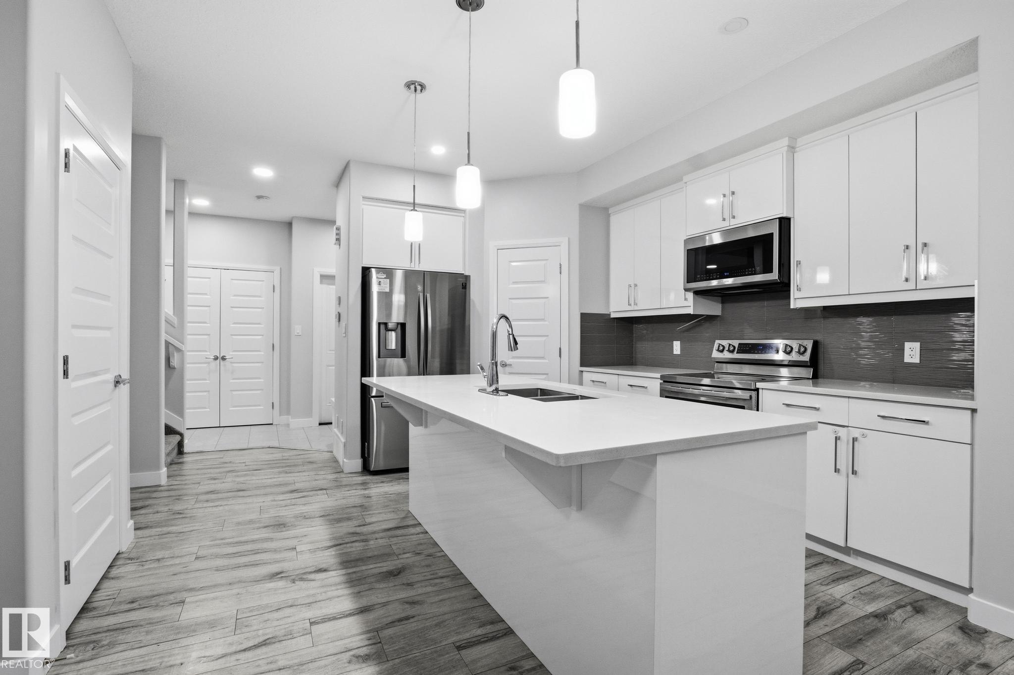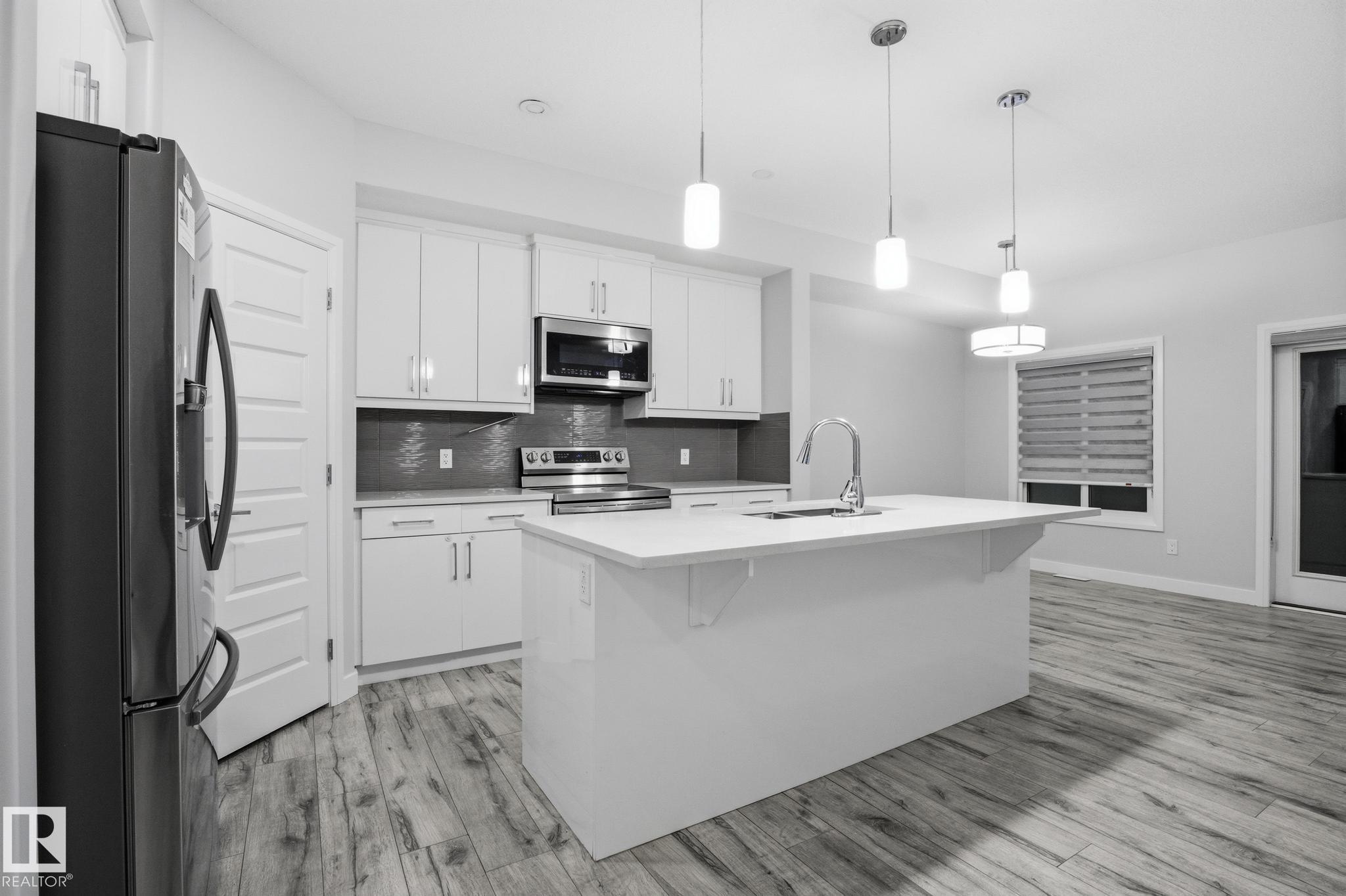 Well-appointed 3-bedroom duplex in the sought-after Chappelle community featuring a side entrance to the basement. This upgraded property offers high-end finishes rarely found in this category, including quartz countertops throughout, solid cabinetry with soft-close drawers, undermount sinks, pot lighting, California knockdown ceilings, and stainless steel appliances. The open-concept main floor is designed for functionality with an eat-up island and corner pantry. The upper level includes a spacious primary suite with full ensuite and walk-in closet, a central bonus room, upper-floor laundry, and two additional bedrooms. Additional features include built-in closet shelving (no wire racks), waterline to fridge, rough-ins for alarm and central vacuum, and a gas line to the backyard for BBQ. The home is fully fenced, freshly repainted, and complete with a double attached garage and fully finished landscaping. A turnkey opportunity ideal for homeowners or investors seeking quality, low-maintenance ownershi