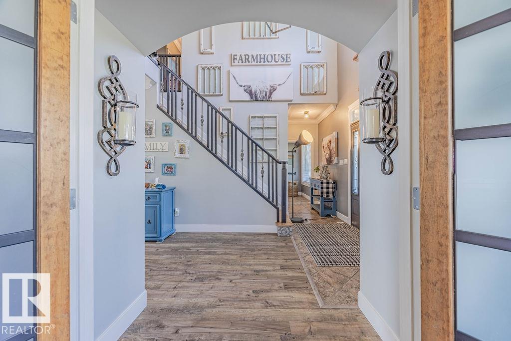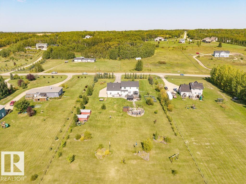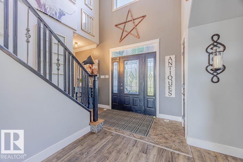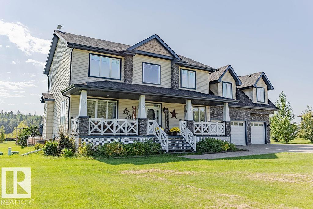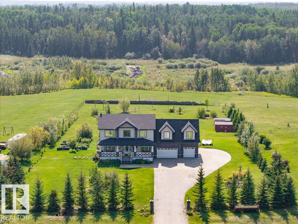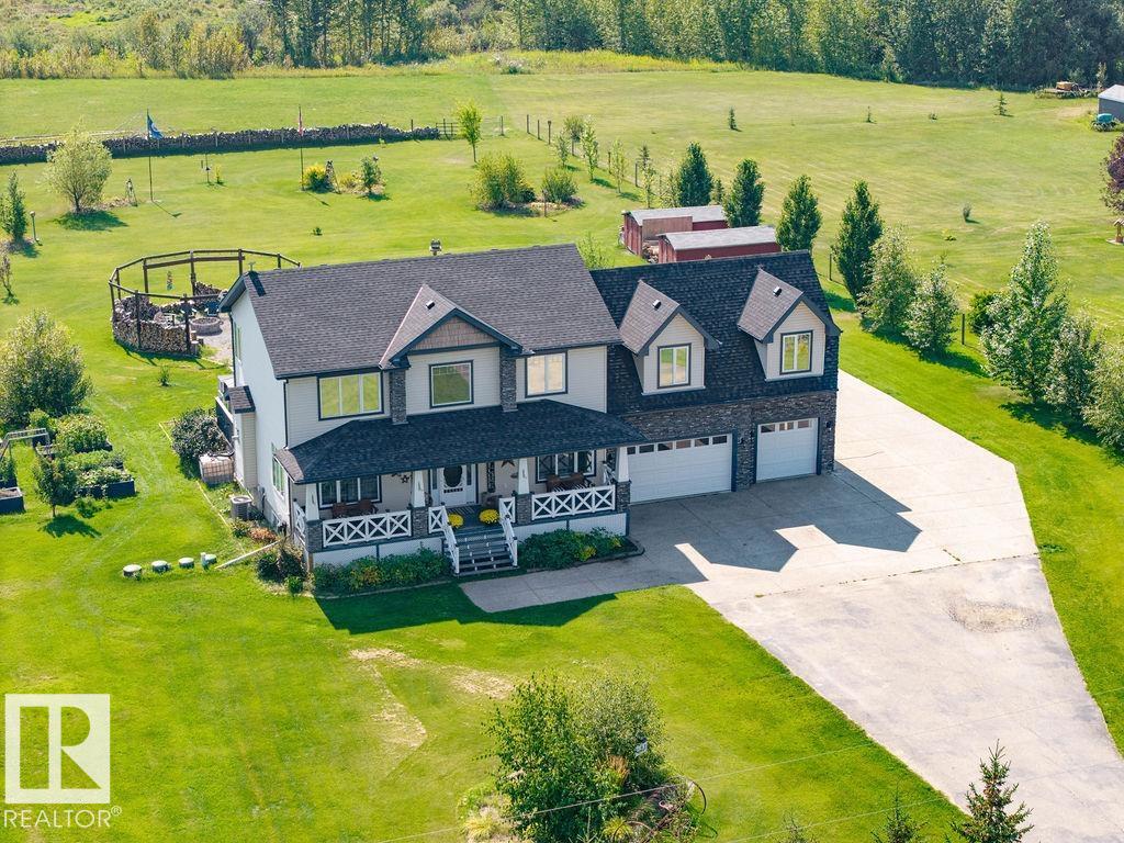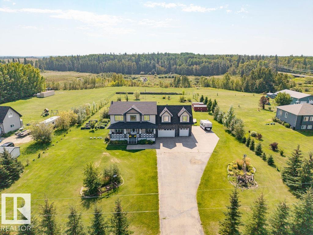 Stunning 5-bedroom acreage on 1.64 acres backing onto nature preserve (Ducks Unlimited). Just a short drive to St. Albert, Spruce Grove or Edmonton. This move-in ready home features 9-ft vaulted ceilings, tile & hardwood flooring, and a designer kitchen with black granite counters, stainless steel appliances & walk-through pantry. A spacious mudroom, main floor laundry & den add convenience. Upstairs, enjoy a large bonus room with gas fireplace, a primary retreat with walk-in closet & 5-pc ensuite, plus 2 more bedrooms & full bath. The fully finished basement offers in-floor heating, 2 bedrooms & 4-pc bath. Outside boasts a covered front porch, back deck, fenced yard, paved driveway & aggregate walkways. Acreage living at its best!
