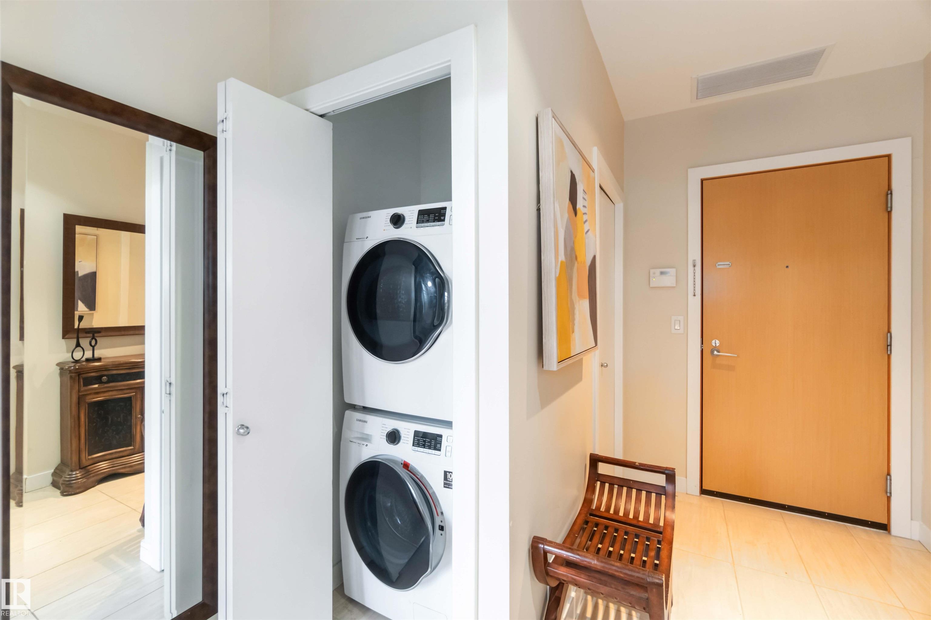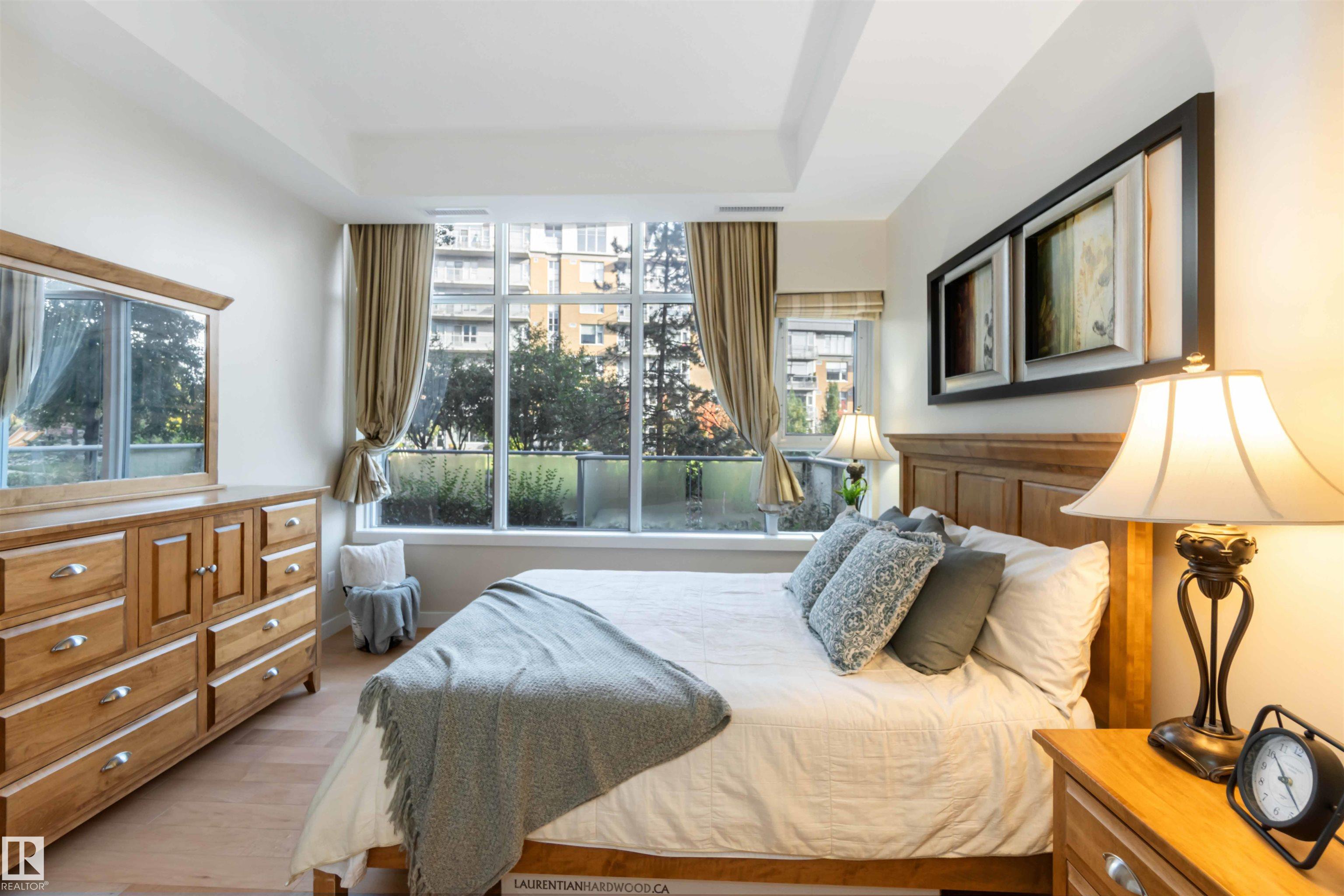 A Stylish and Refreshed 2 Bed, 2 Bath condo in sought-after Ermineskin! This beautiful ground-floor unit showcases serene courtyard views through a wall of windows and features soaring ceilings that create a bright, mini mansion feel. With the ease of taking your pet outside for a walk just by leaving your patio doors. Enjoy elegant hardwood floors, granite countertops, and tile in the kitchen and baths. The chef-inspired kitchen includes a gas cooktop, built-in oven and microwave, and smart pull-out cabinetry. Large Master Retreat with 5pc Ensuite and Second Bedroom with Murphy Bed. Oversized concrete patio surrounded by low-maintenance perennials for summer beauty. With in-suite laundry, titled underground parking & titled storage, this pet-friendly, well-managed complex also offers an exercise room. Condo fees include HEAT and WATER. With a move-in-ready vibe?just steps to grocery shopping, LRT station, and green space!