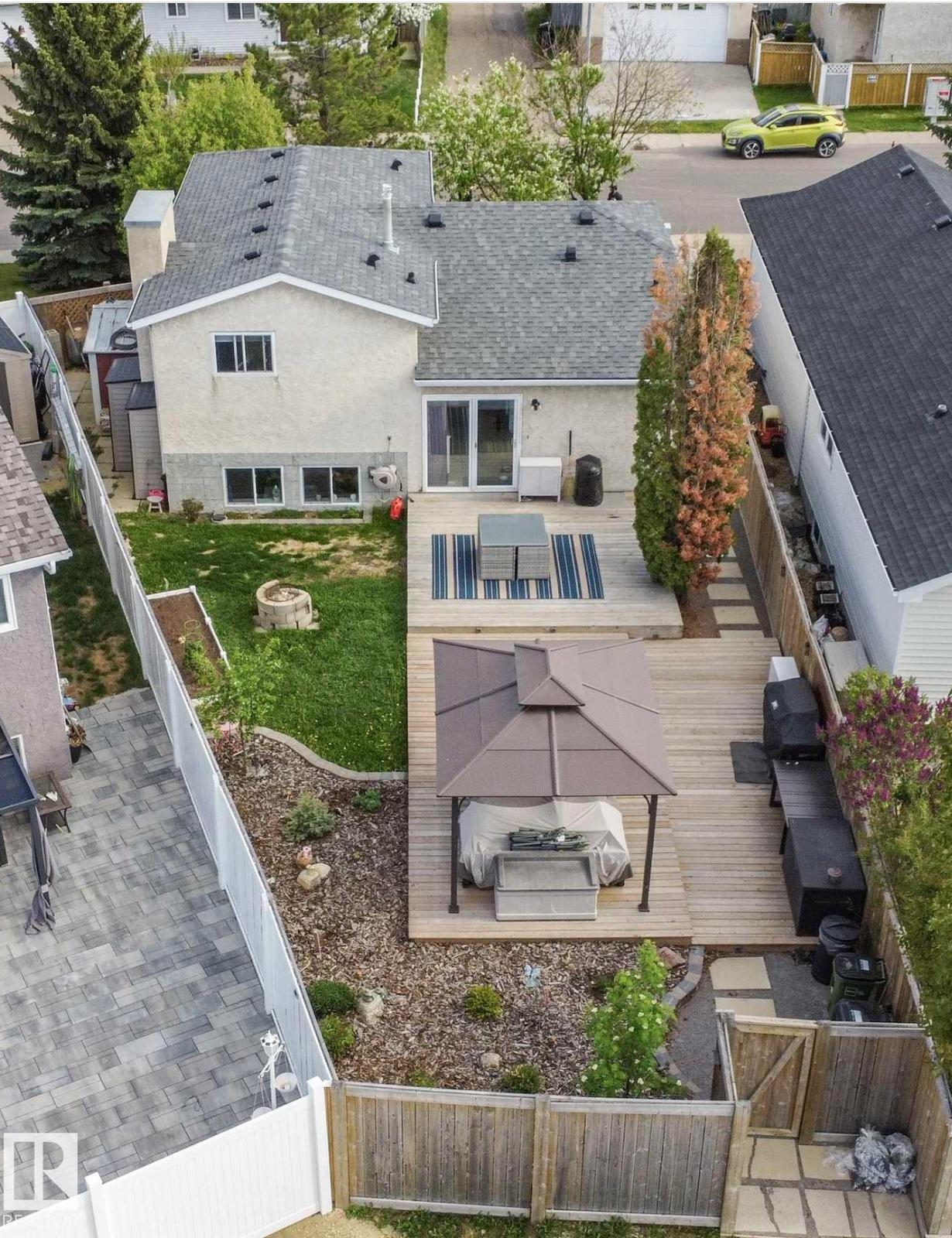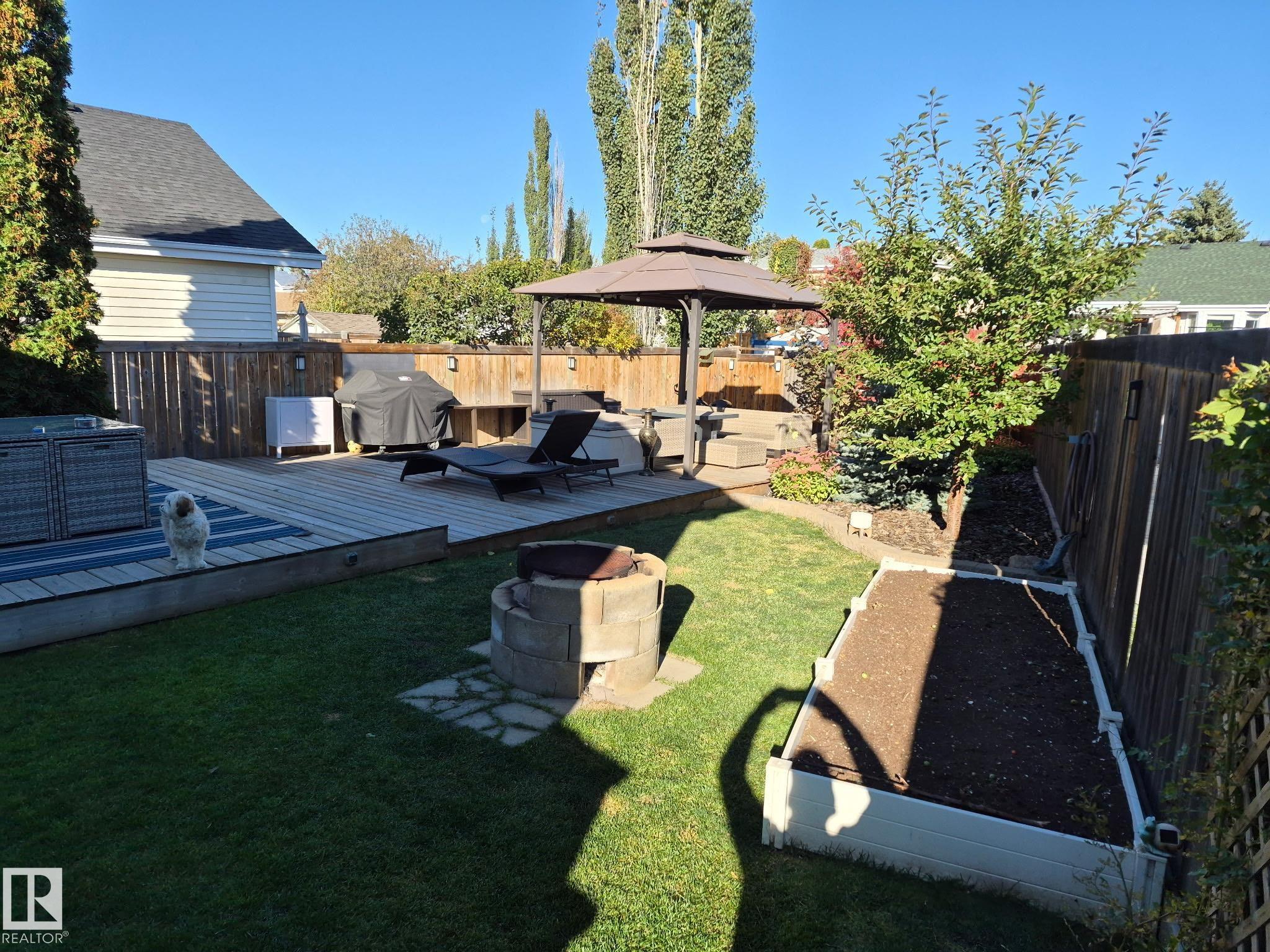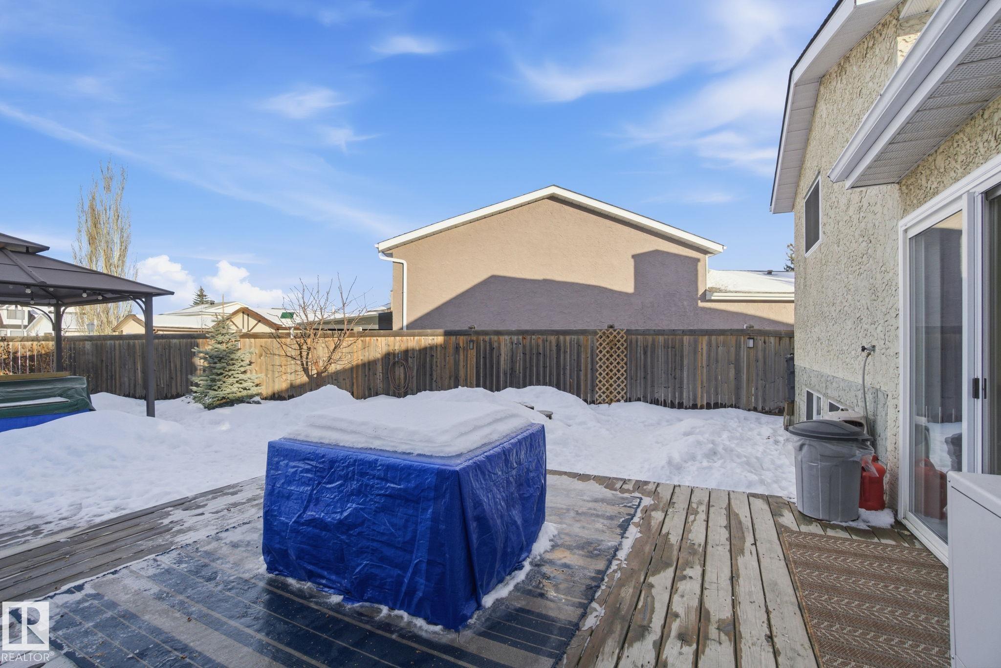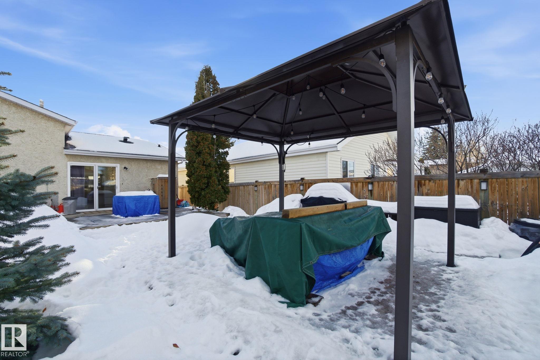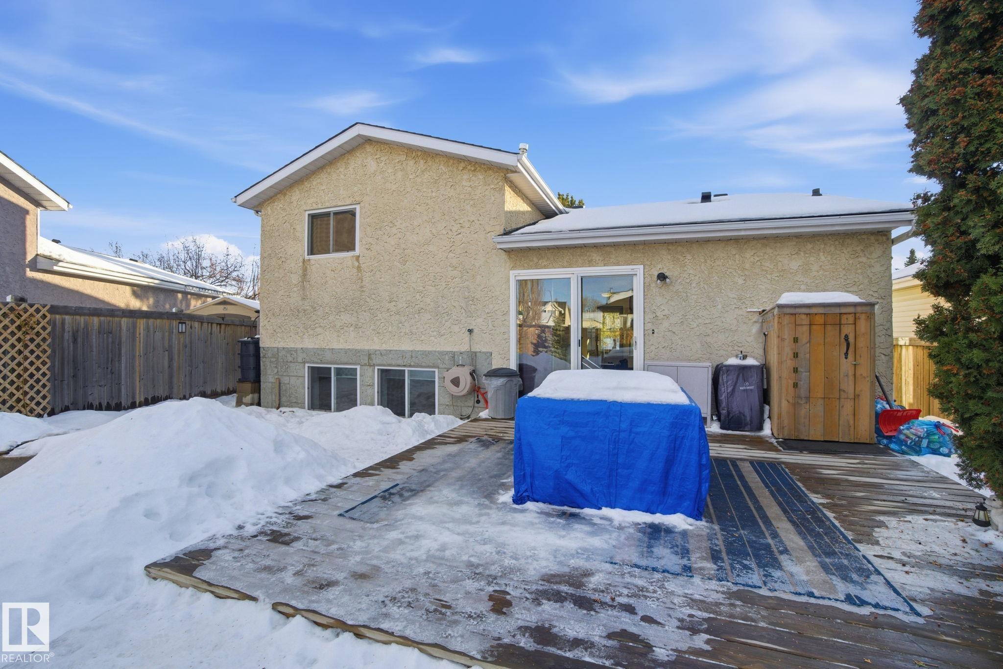 Welcome to this bright and inviting 4-bed, 3-bath home, lovingly maintained with recent updates including a high-efficiency furnace, shingles, fresh appliances, vinyl windows, stylish front door and rear sliding patio doors. Enjoy central A/C, top-down window coverings, and blackout shades in the bedrooms. The kitchen shines with a well-organized pantry (roll-out shelves), built-in prep counter with mini fridge, and glass upper display cabinets. Step outside to your backyard retreat featuring a tiered deck, gazebo with bistro lighting, gas line ready for your BBQ and fire table, multiple sheds, water barrel, raised garden beds, fire pit, and mature trees. Bonus: A 20x20 garage permit was previously approved by the City of Edmonton?ideal for future expansion! Nestled in a peaceful community with unbeatable location?minutes from Lymburn Elementary, quick access to Anthony Henday and Whitemud, 5 min to YMCA, and under 10 min to West Edmonton Mall. Everything you need is right at your fingertips! 10/10!