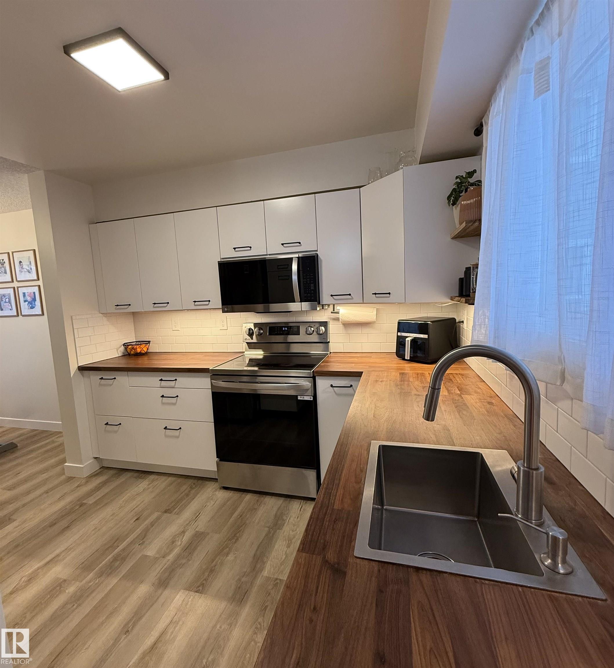 Great Riverbend townhouse in the mature, desirable Ramsay Heights! This is a 3 bedrooms, 2 bathrooms place with fully finished basement. Main floor features sink in living room, large dining room with a patio door to fenced, large backyard. Kitchen is fully renovated with newer kitchen cabinets, countertops, back splash and appliances. Main floor and upper bathroom is nicely renovated with the european touch. Upstairs - there are 3 large bedrooms with 1 yrs old carpet and newer baseboards. Basement is finished with a large family/play room, laundry and a large storage area. The complex is in good condition close to parks, ravine, playgrounds, schools and rec center. Well managed complex with low condo fees.