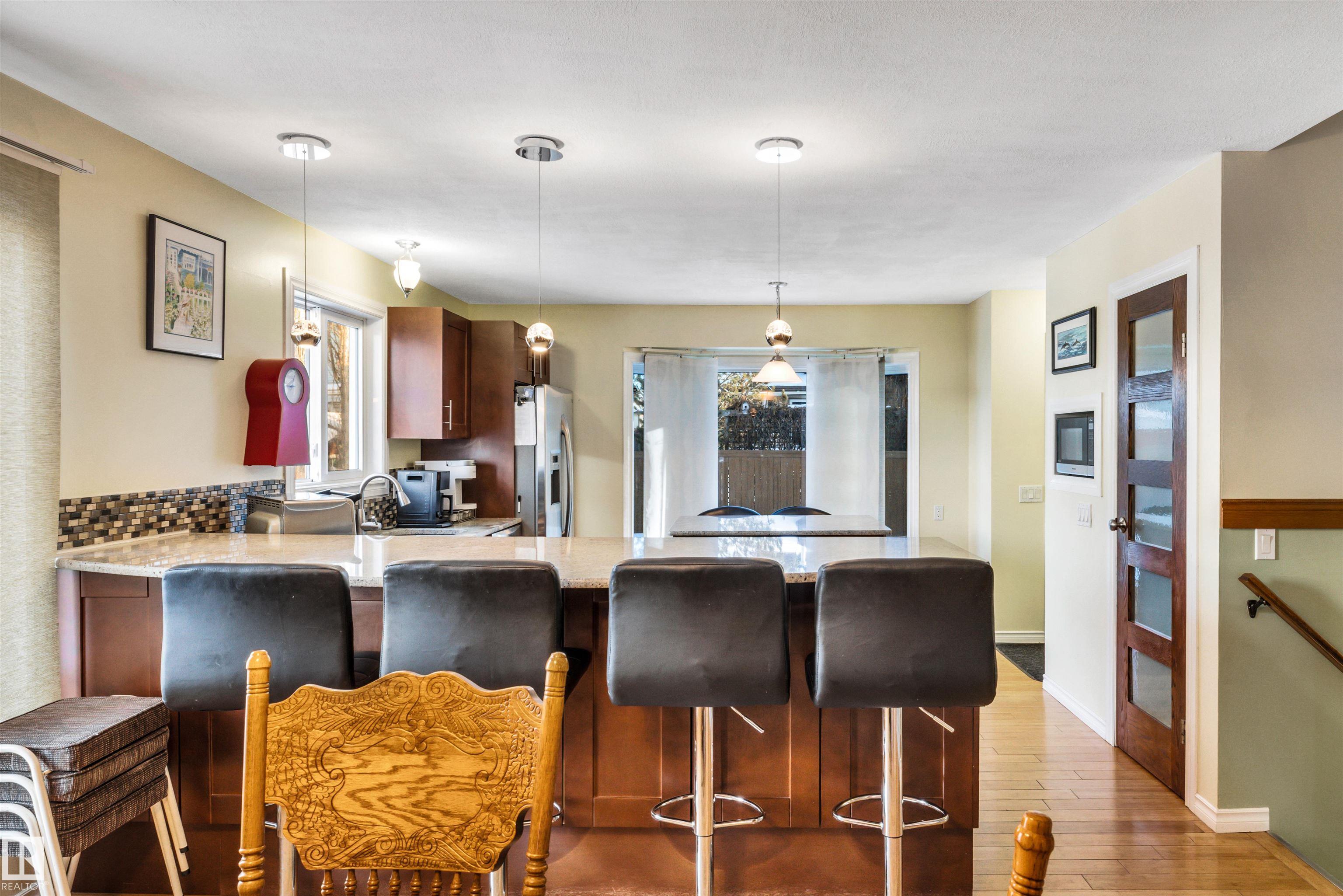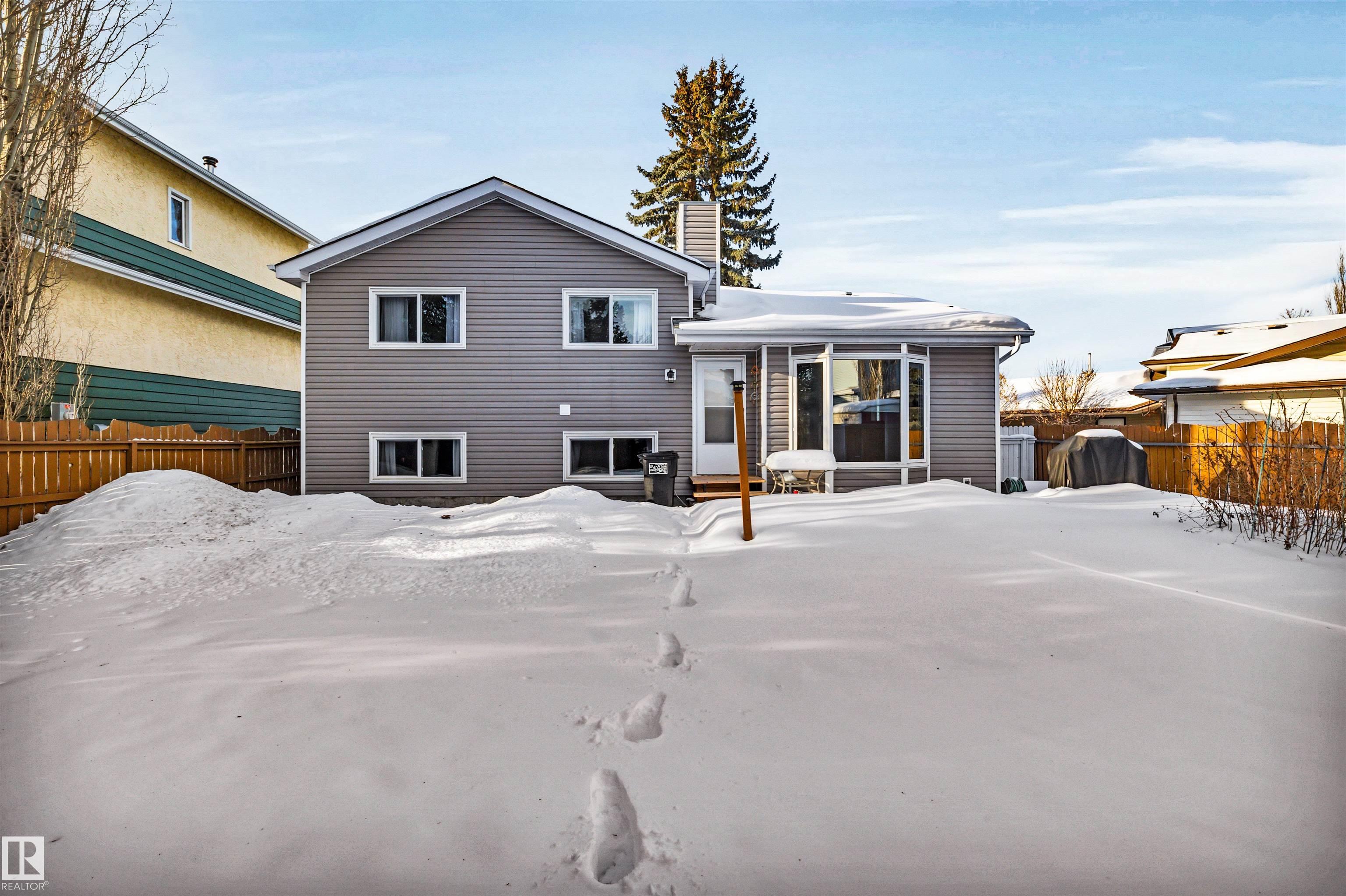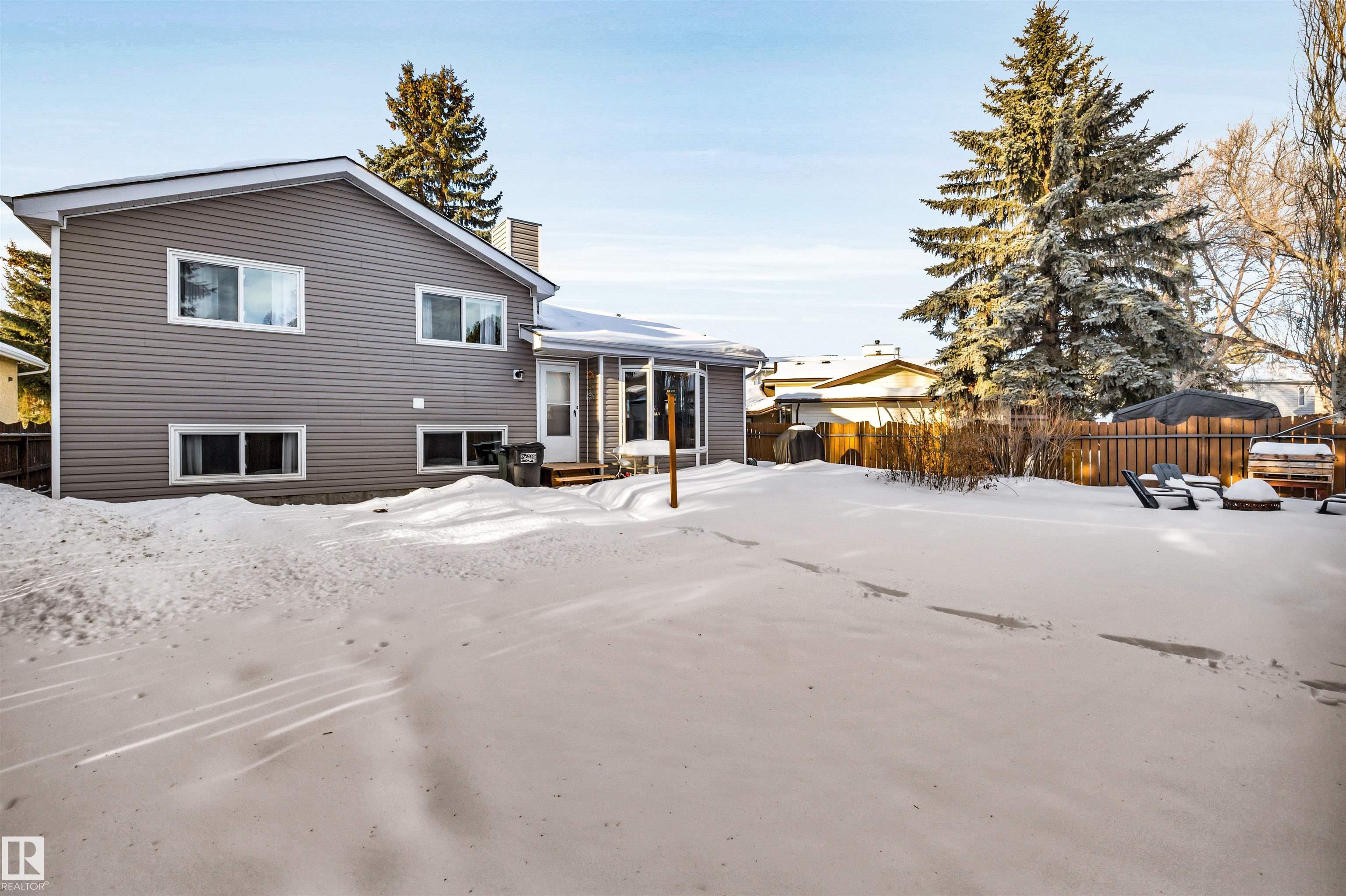 Family Home with 2400sqft of living space! Nestled in a private keyhole crescent this 4 level split boasts 5 Bedrooms, 3 FULL bathrooms and renovations throughout! The open concept main floor boasts a stunning kitchen with warm dark cabinets, GRANITE countertops, an extended eating bar with seating for 4 and island providing plenty of room for preparing family meals, open to the dining area and living room, hardwood flows throughout this level, upper offers 3 very good sized bedrooms, primary with FULL 4 piece bath, 3rd level with additional 2 bedrooms, family room, bathroom and laundry, 4th level nicely developed with den (was used as a bedroom, window not egress) & ANOTHER family room! Updates include full kitchen renovation, 3 updated bathrooms (flooring/granite) siding, vinyl windows, insulation, hot water tank and upper floor laminate. Central A/C, central Vac and water softener complete the package. Close to all major amenities, connecting routes and transit. Shows great!