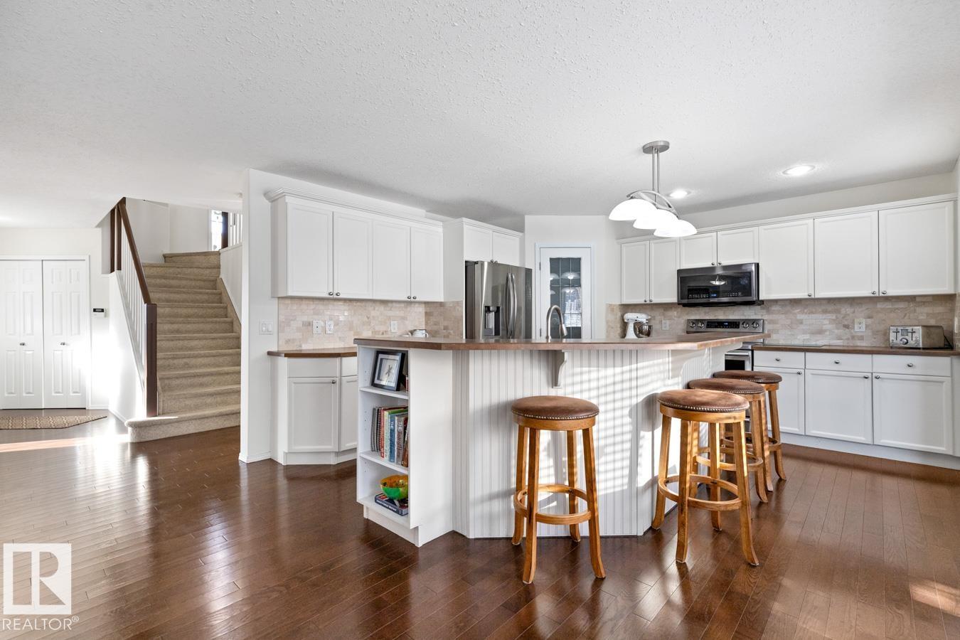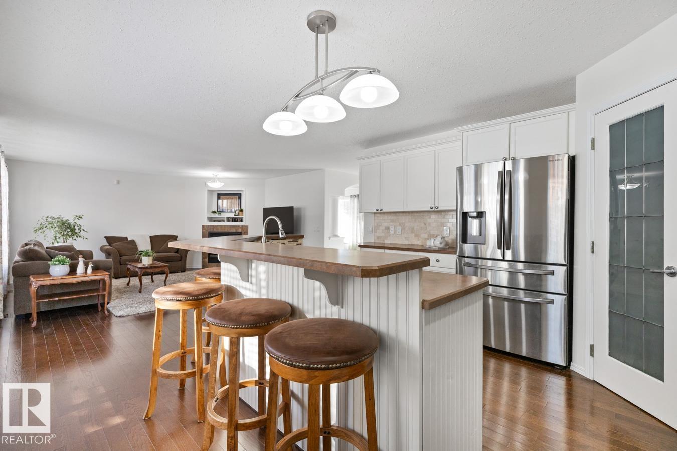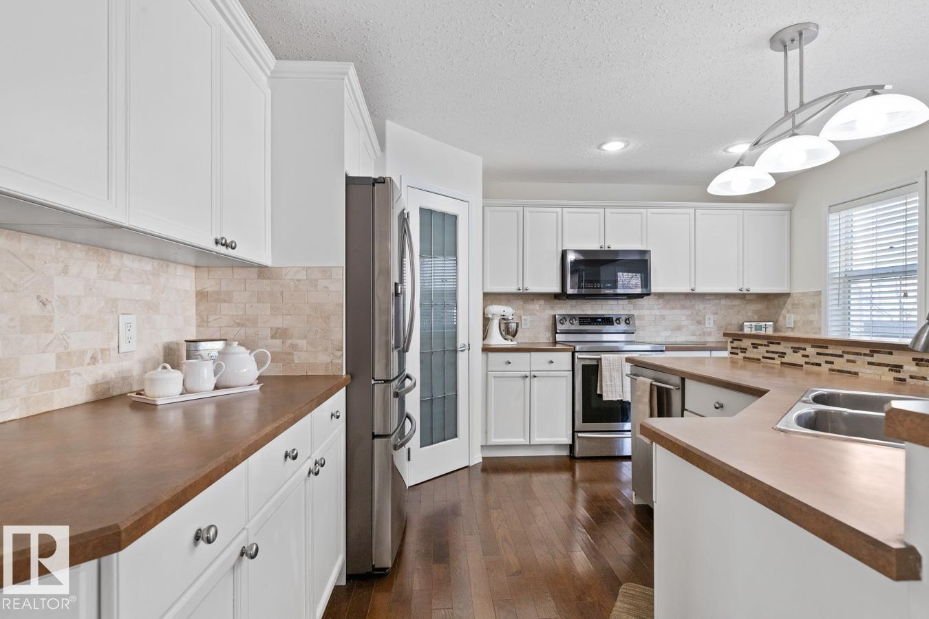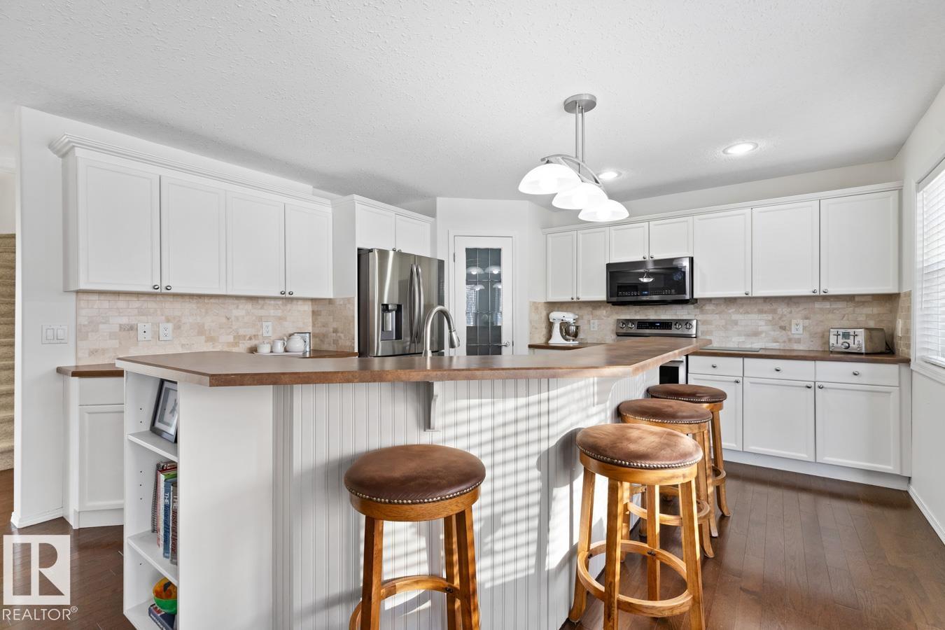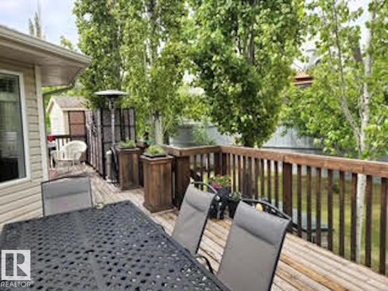 Tucked into a quiet cul-de-sac, this meticulously maintained family home offers A/C, a HEATED garage, 5 bedrooms, and 3.5 baths. A charming front verandah welcomes you into a spacious entry with hardwood flooring that flows into a functional, open layout. The kitchen features ample cabinetry, corner pantry, stainless steel appliances, and an island overlooking the dining area and living room with cozy fireplace. A den, guest bath, and laundry complete the main floor. Upstairs, you?ll find a king-sized primary suite with walk-in closet and 5-pc ensuite, plus three additional bedrooms (one easily converted back to a bonus room) and a 4-pc bath. The fully finished basement is ideal for entertaining, offering a rec room, fifth bedroom, 3-pc bath, and generous storage. Enjoy the fully fenced, beautifully landscaped yard with entertaining-sized deck. Fantastic location close to schools, parks, wetlands trails, and Heritage Dog Park?move-in ready!